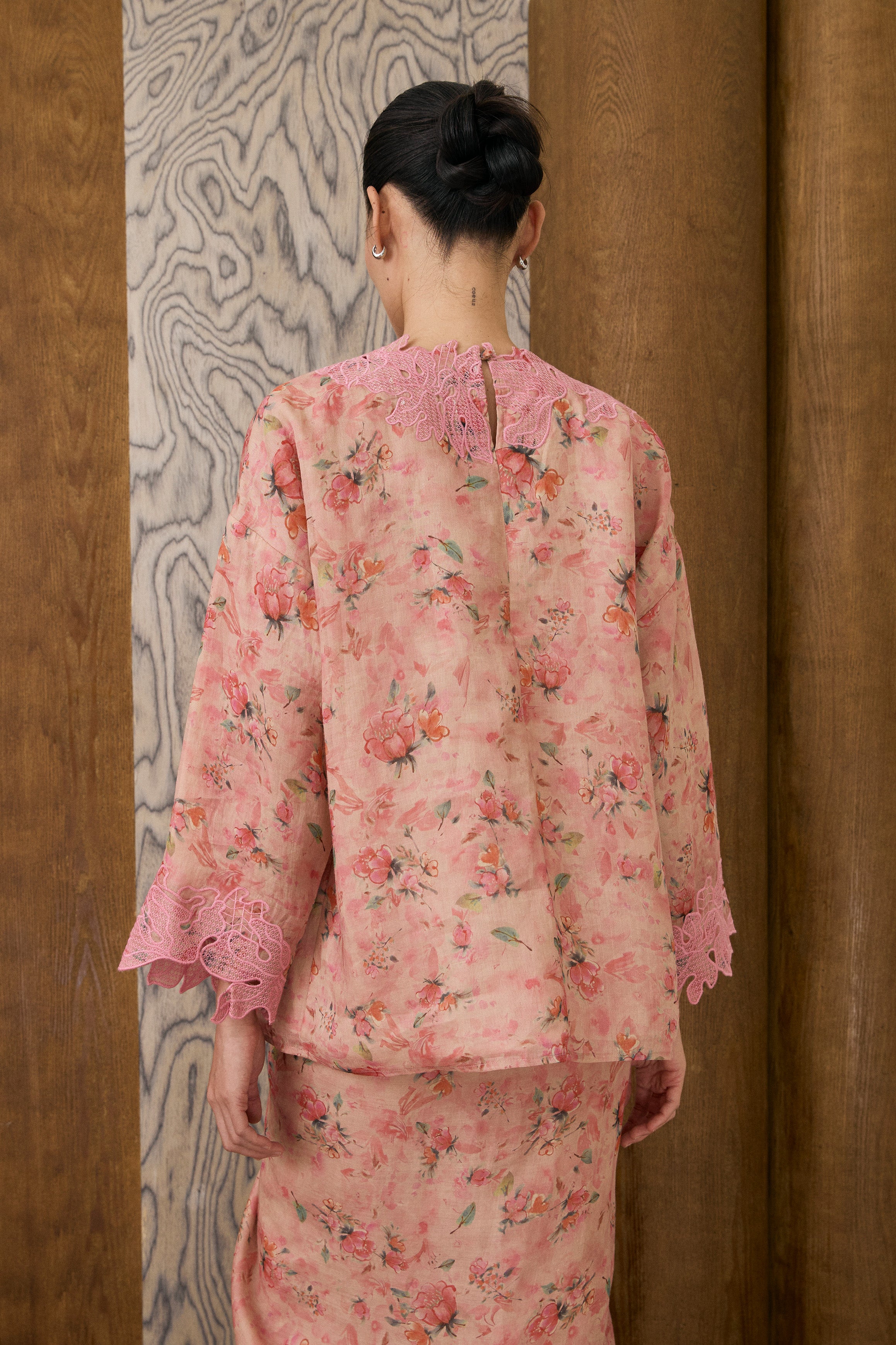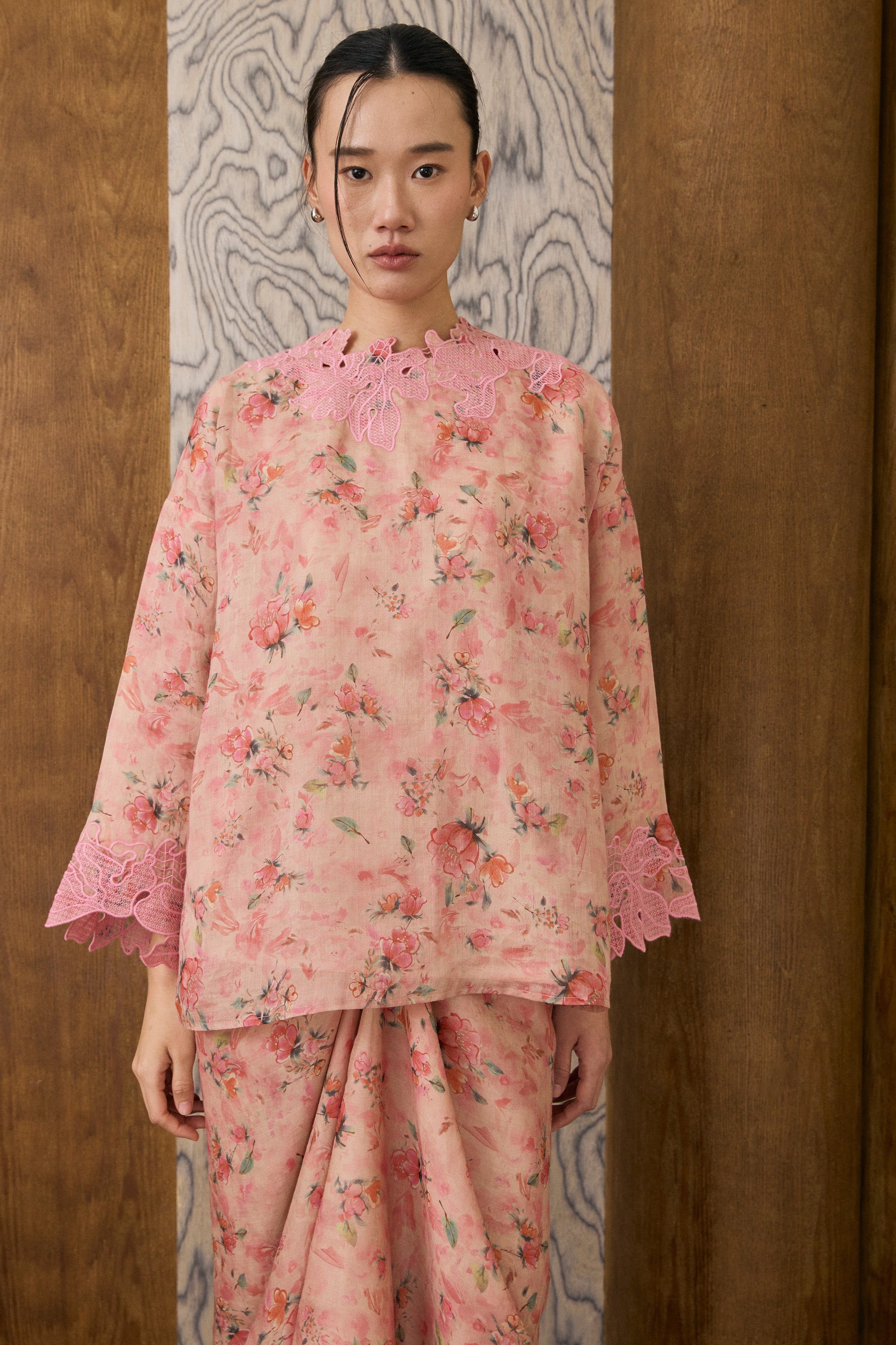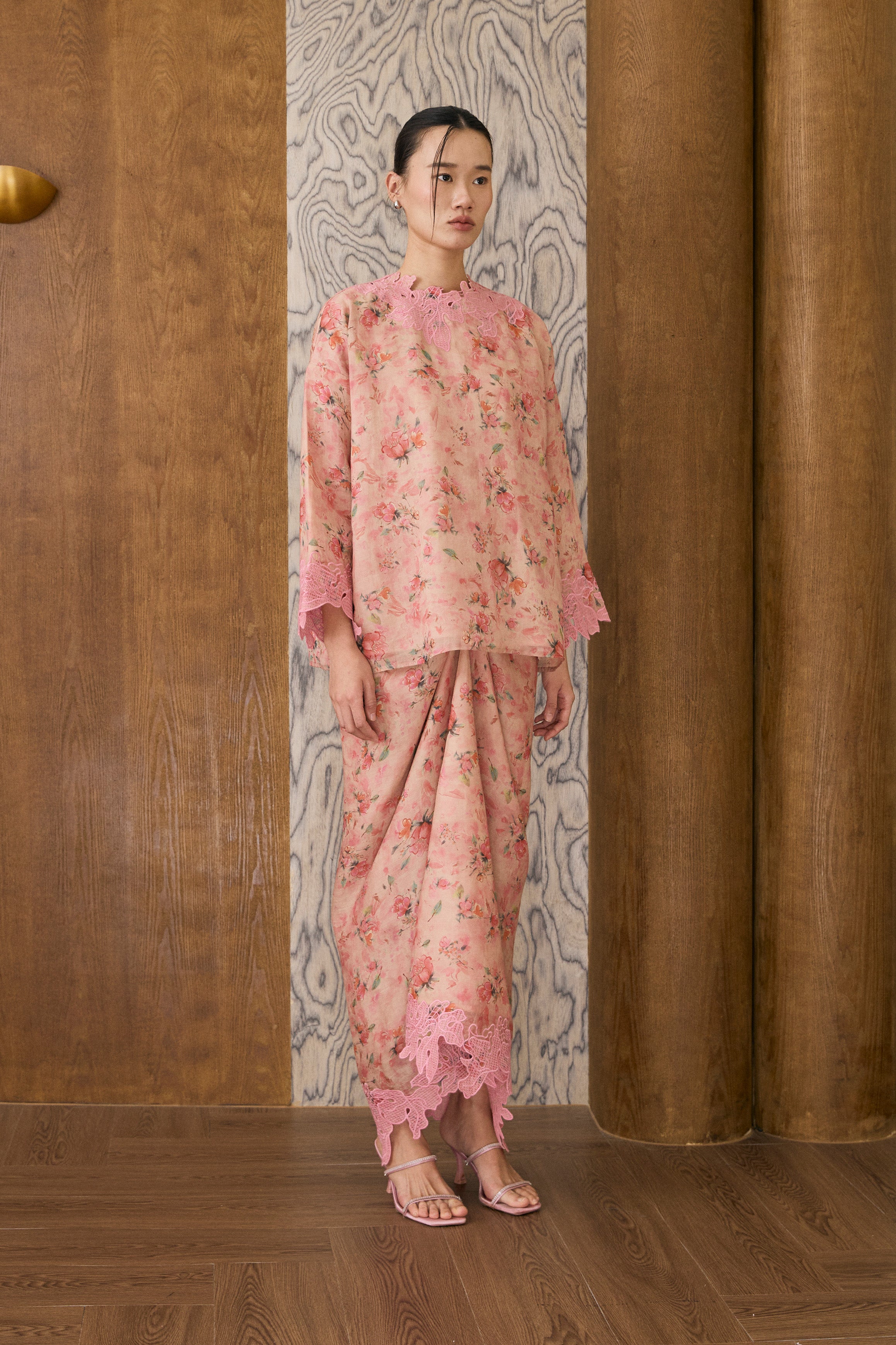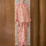 A Kedah top with an oversized, loose silhouette and drop shoulders. Features intricate embroidery along the neckline and sleeves. Paired with a slip-on knot skirt with 'sulam goyang' detailing. Rendered in ramie, and lined in cotton.