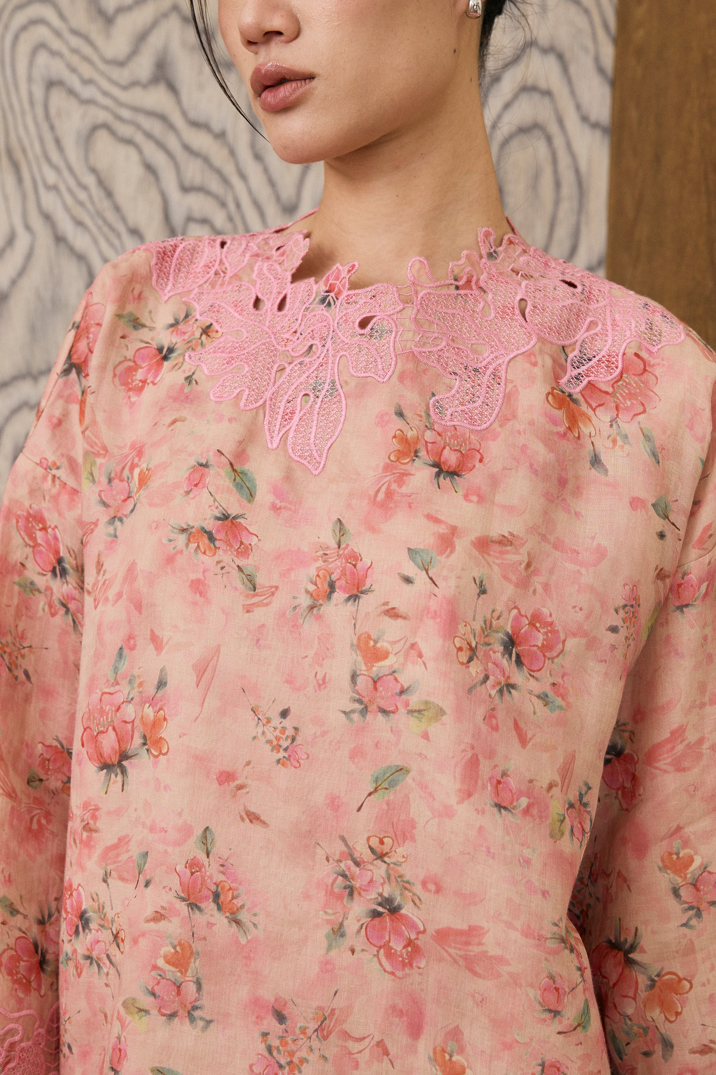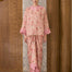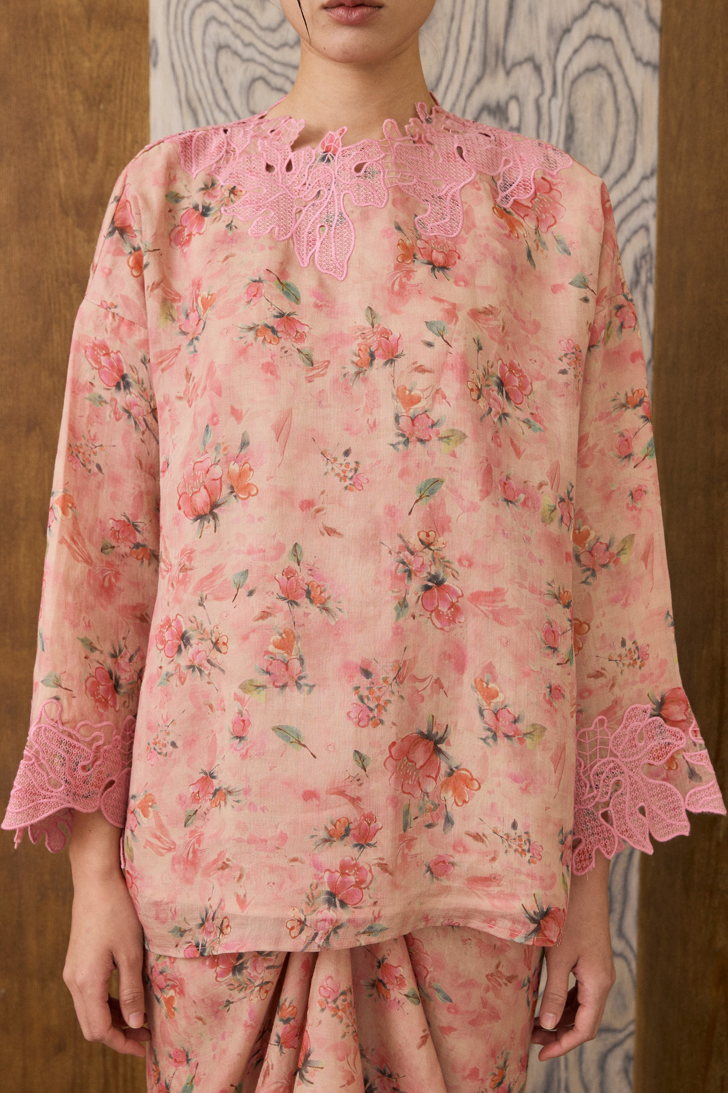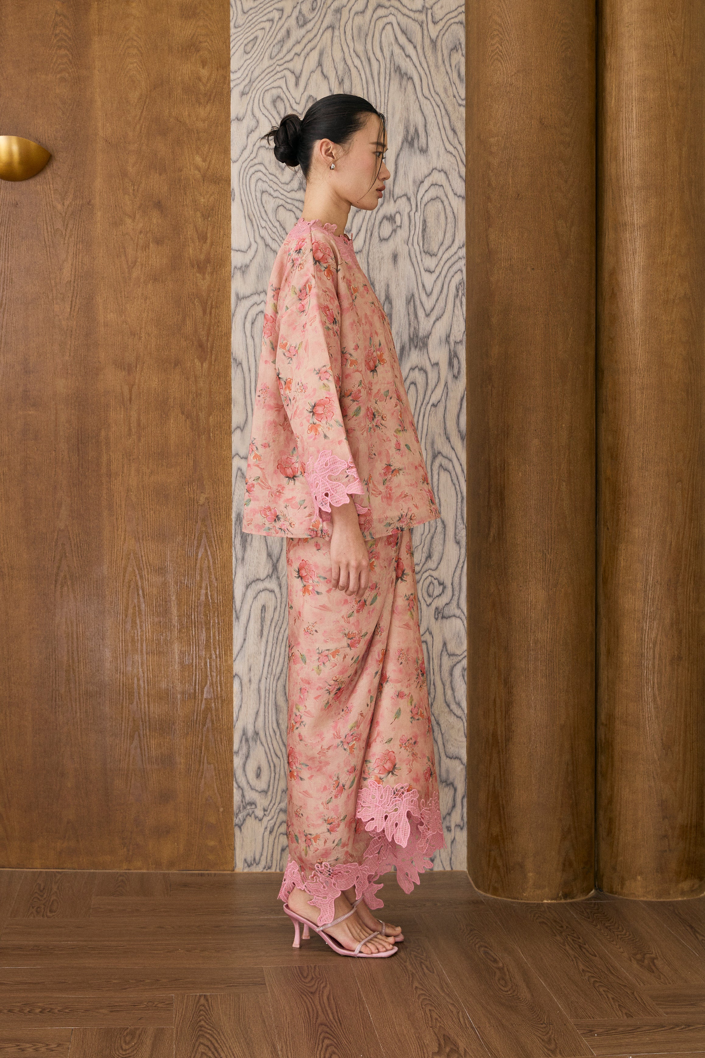A Kedah top with an oversized, loose silhouette and drop shoulders. Features intricate embroidery along the neckline and sleeves. Paired with a slip-on knot skirt with 'sulam goyang' detailing. Rendered in ramie, and lined in cotton.