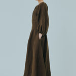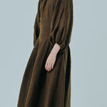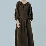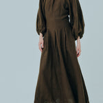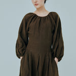 Fitted dress with structured box pleats, rendered in linen. Features a round neckline and bubble sleeves. Finished with side pockets.