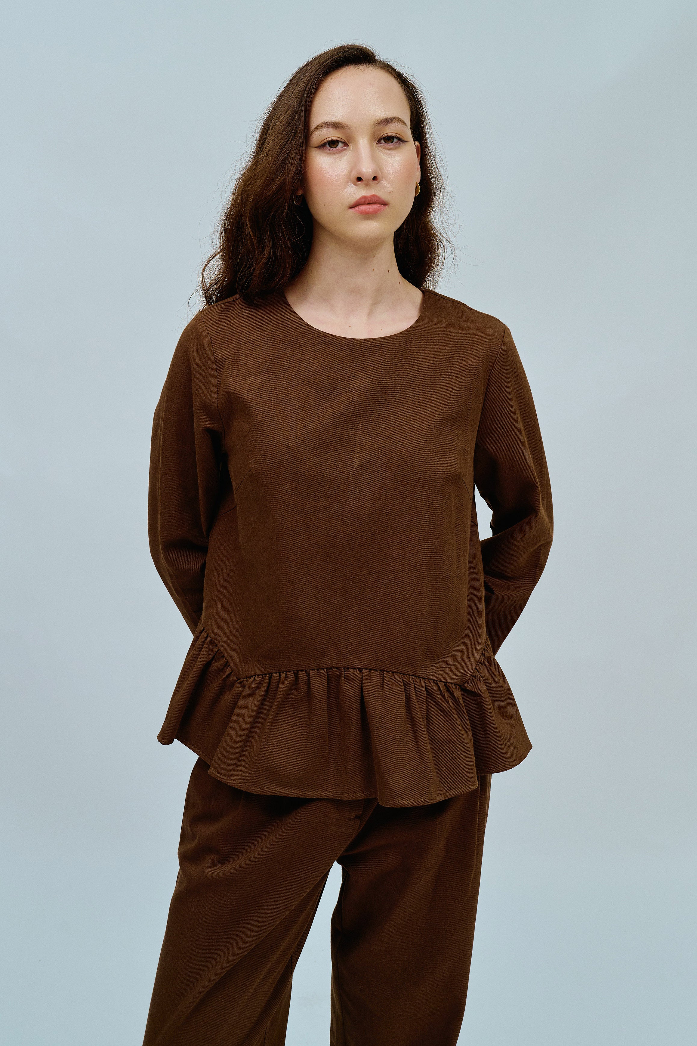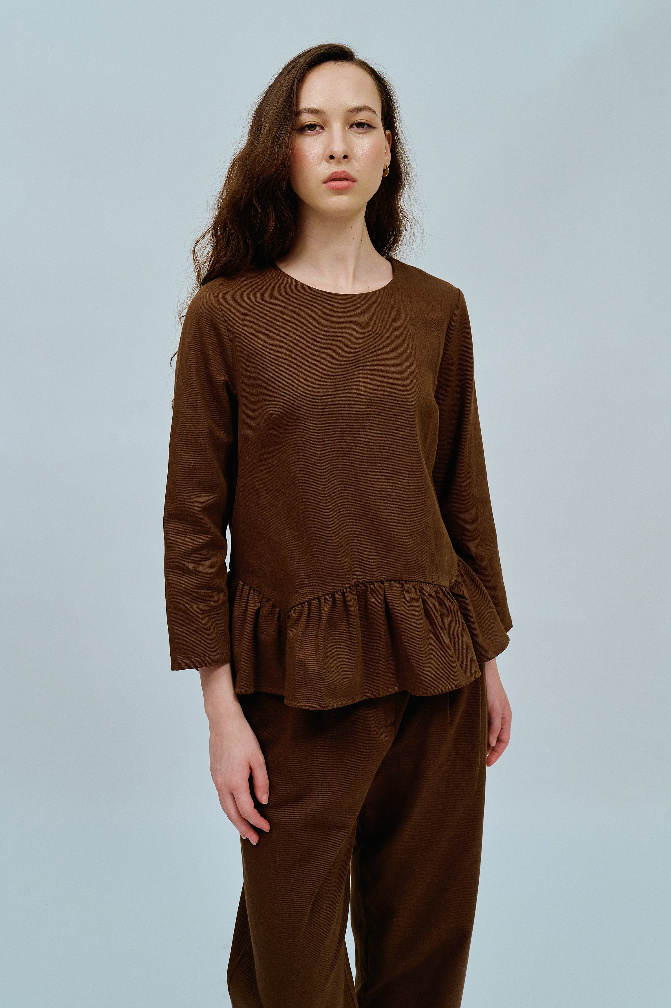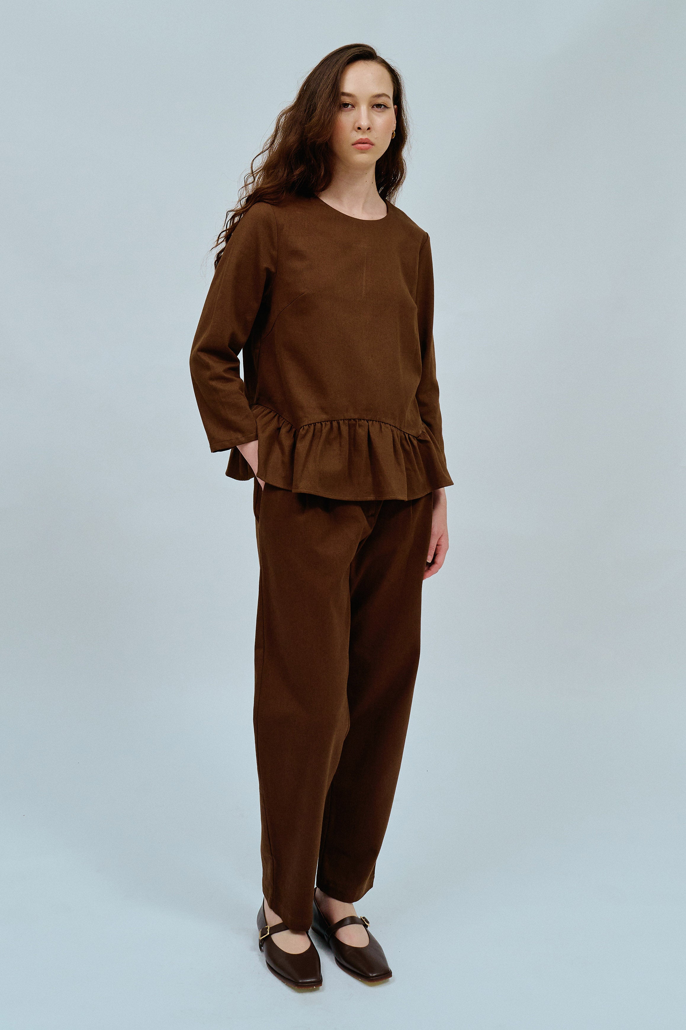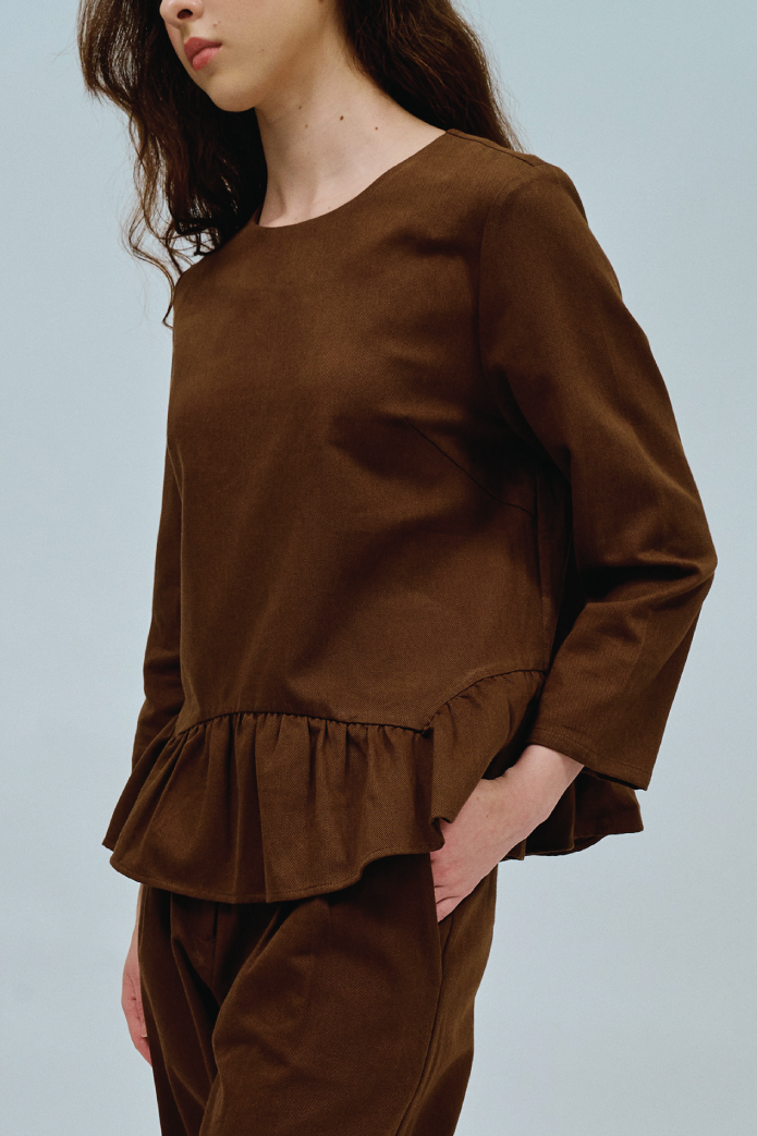 A top with a round collar, long sleeves and a soft flare from the waist. Rendered in crisp cotton. Finished with a discreet zip at the back.