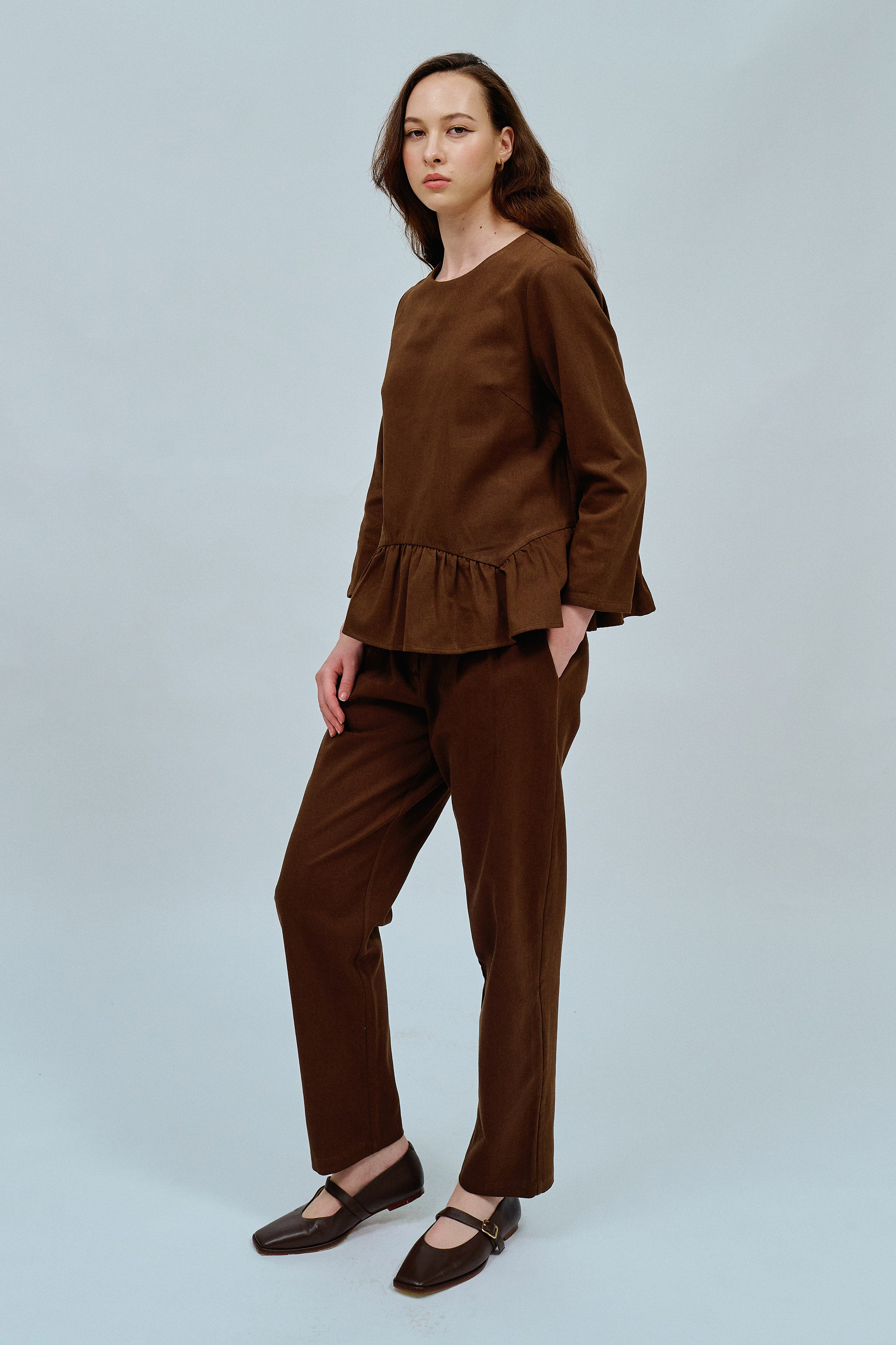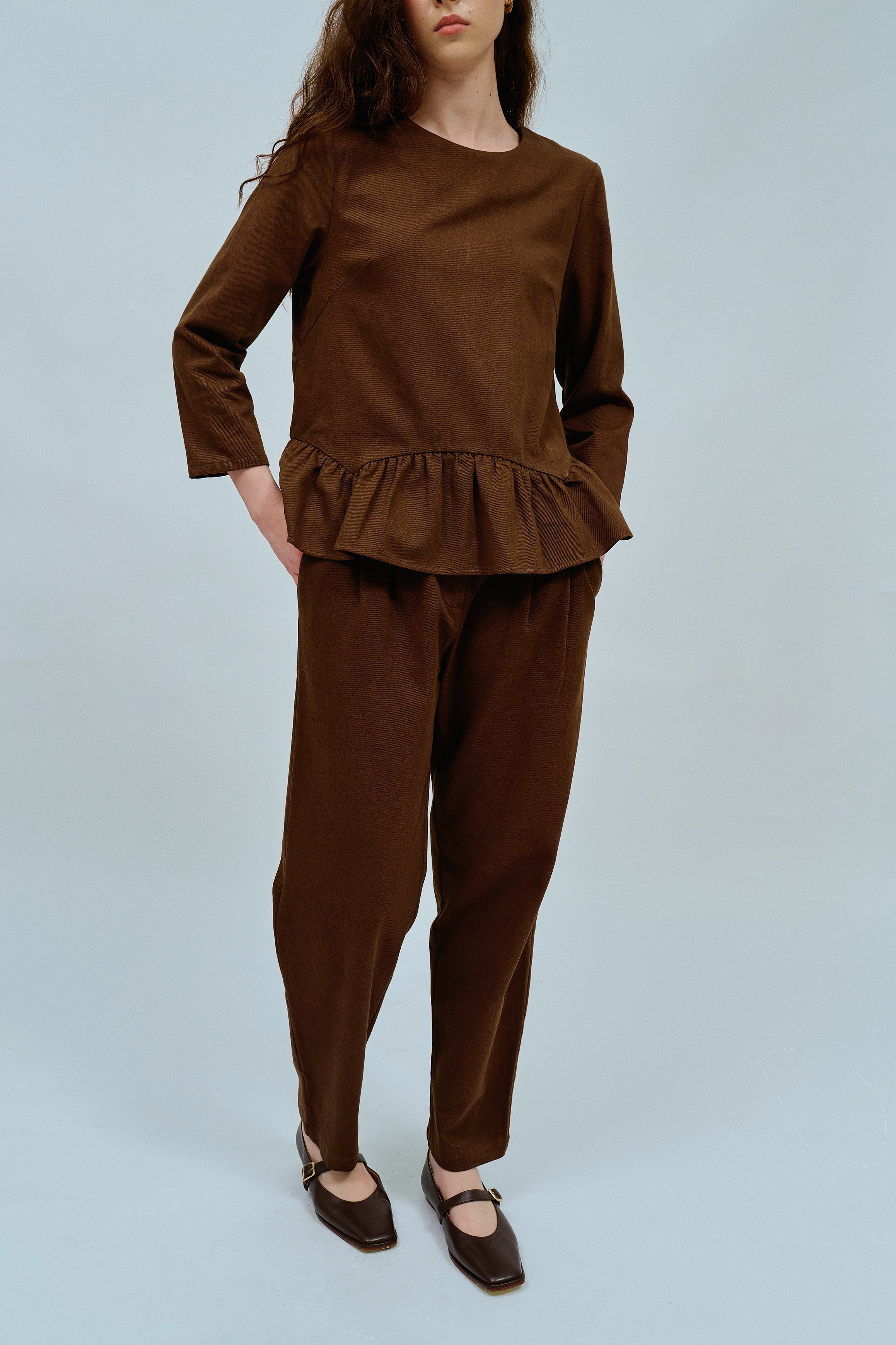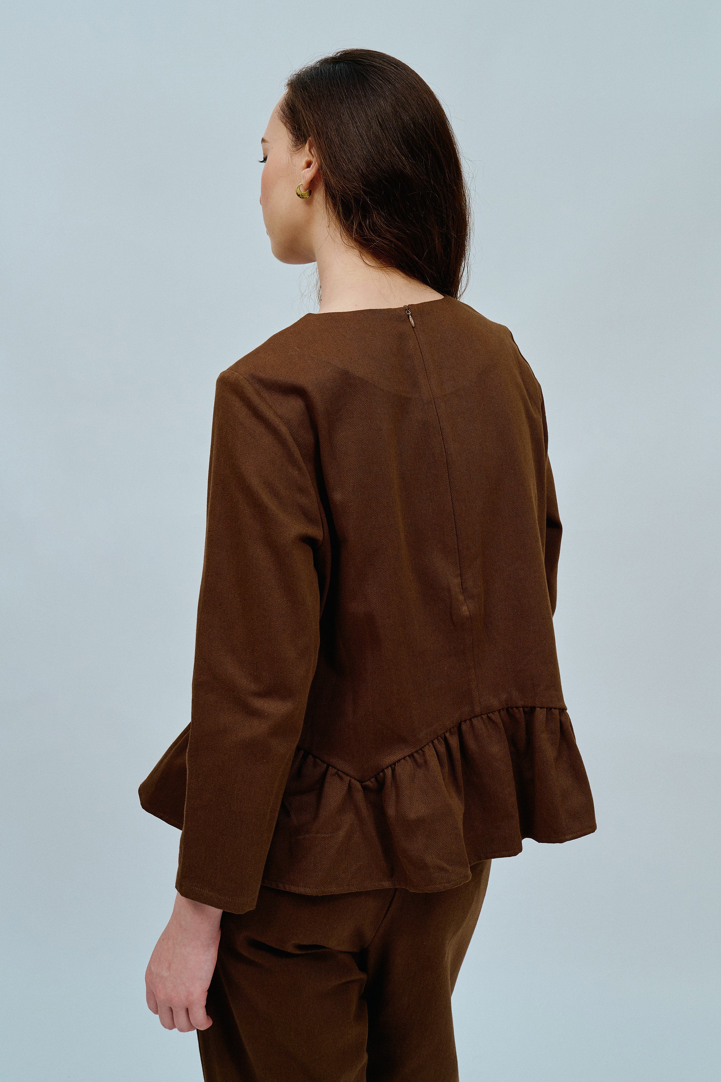 A top with a round collar, long sleeves and a soft flare from the waist. Rendered in crisp cotton. Finished with a discreet zip at the back.