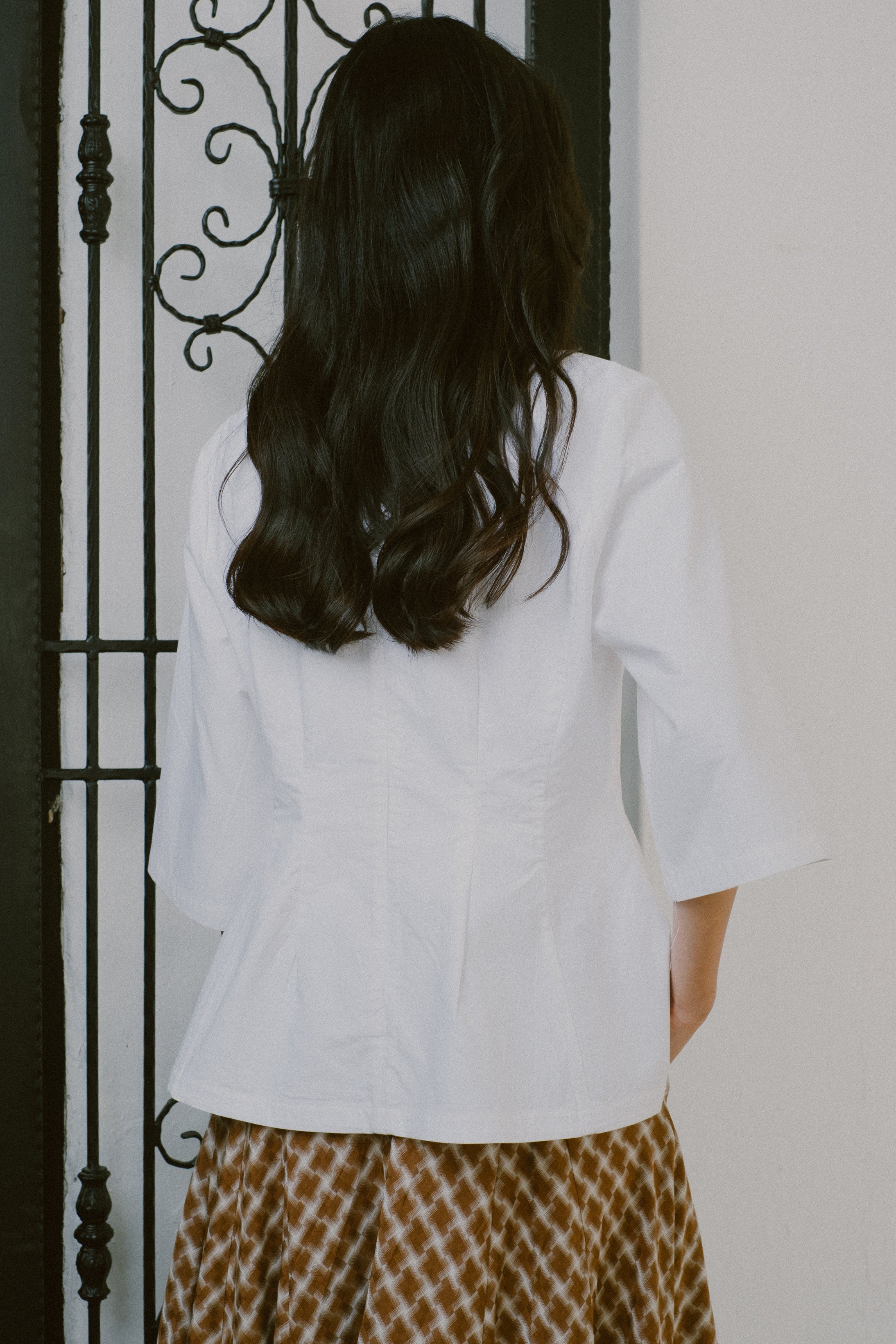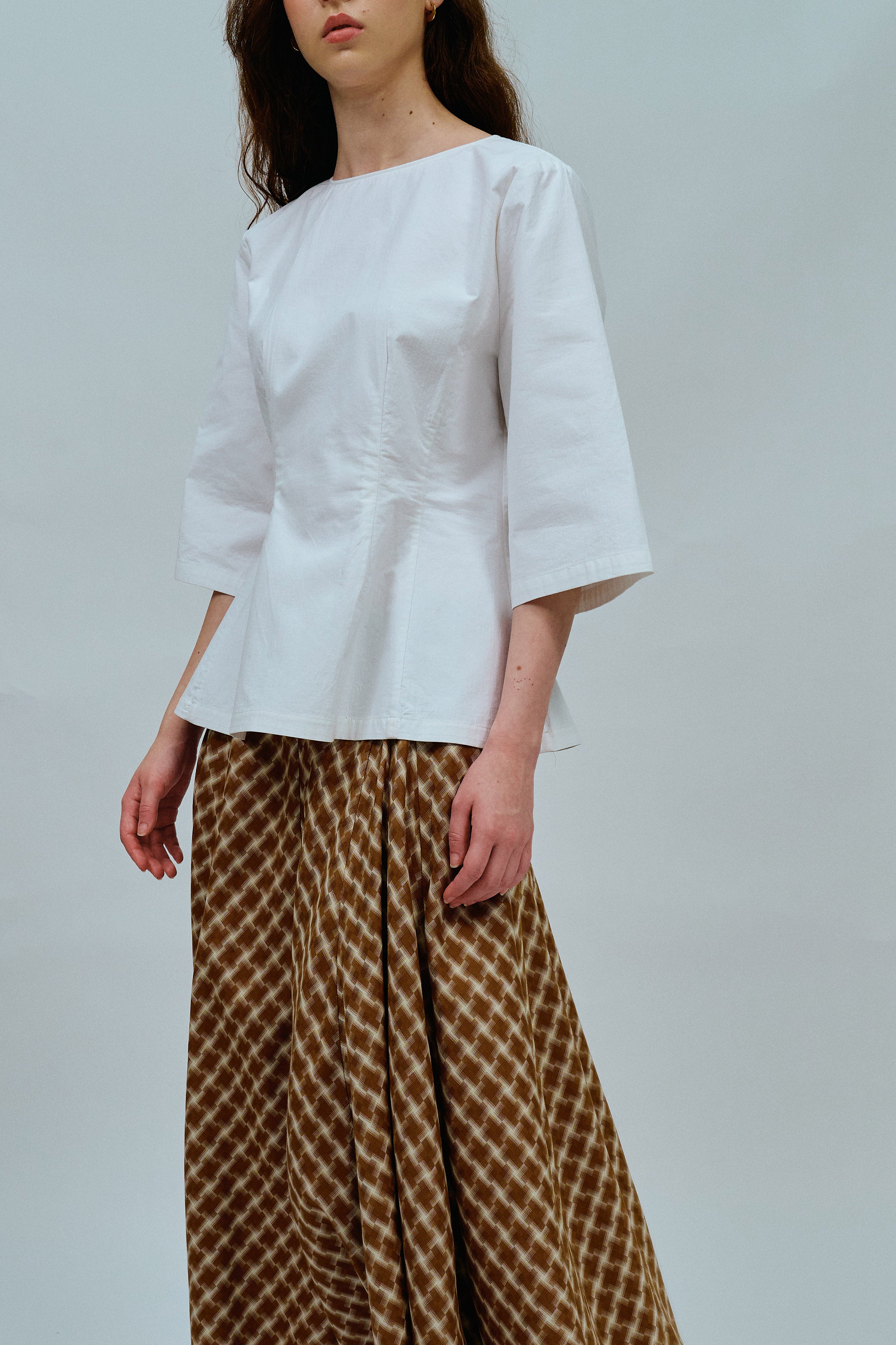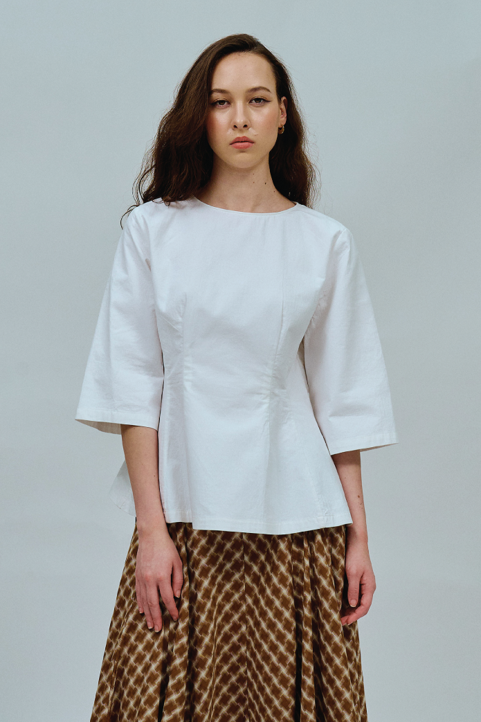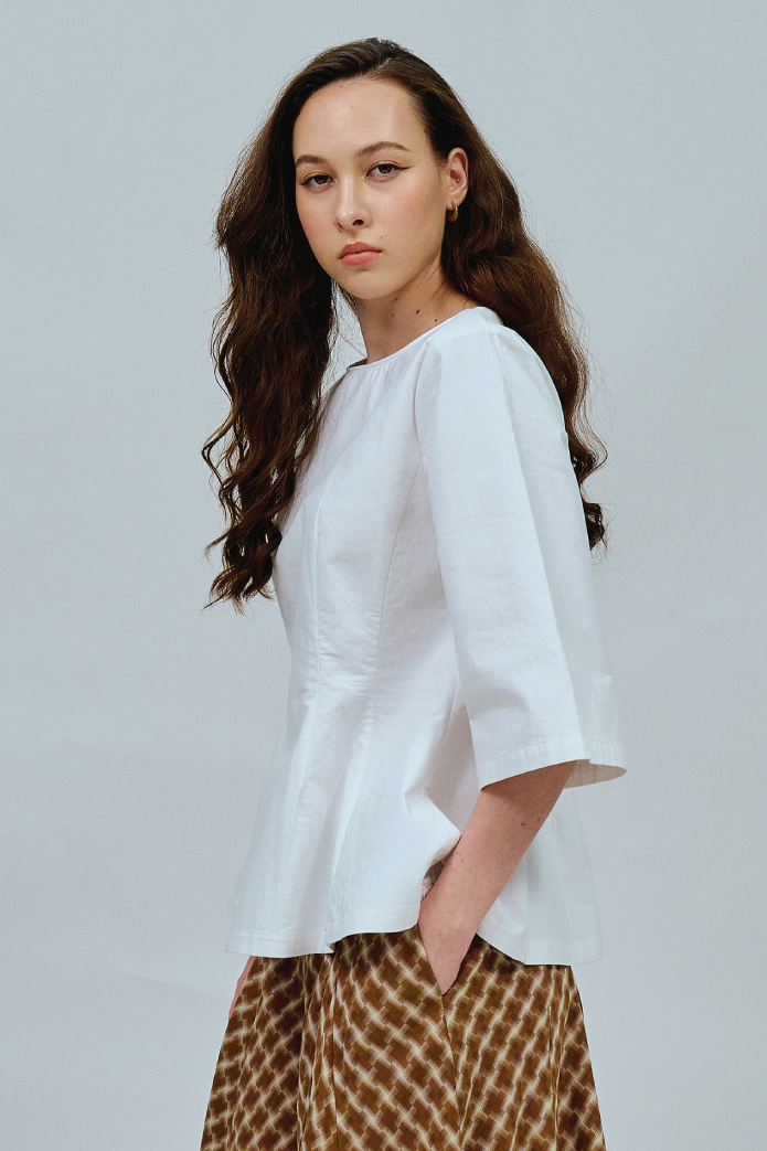 Semi-fitted silhouette with three-quarter sleeves and a subtle peplum hem. Rendered in cotton. Finished with a clean zip at the back.