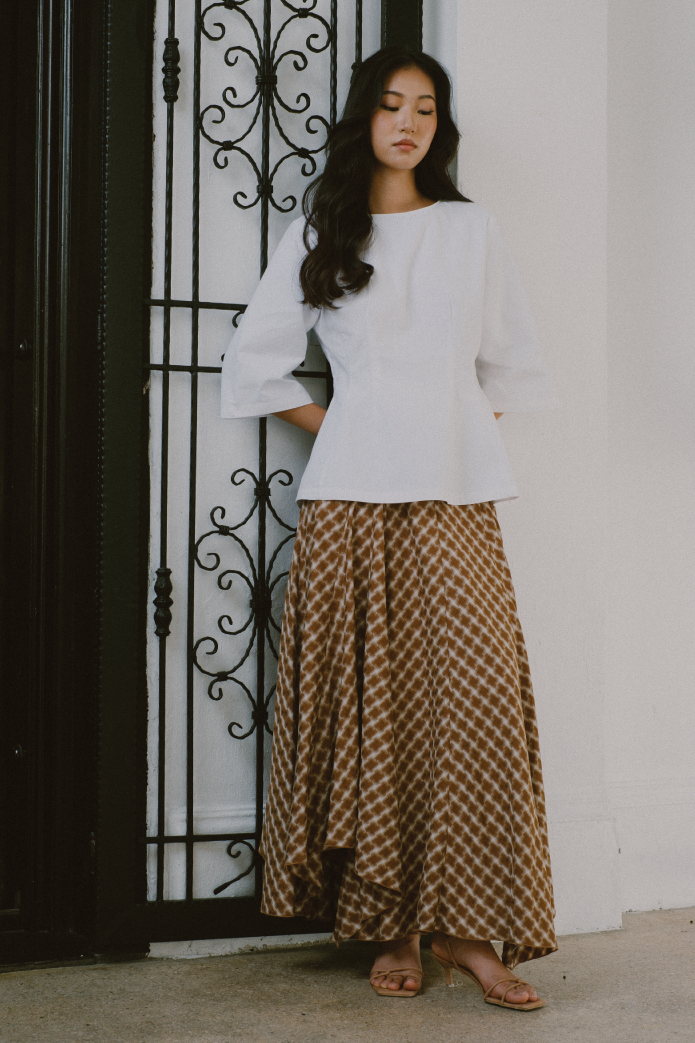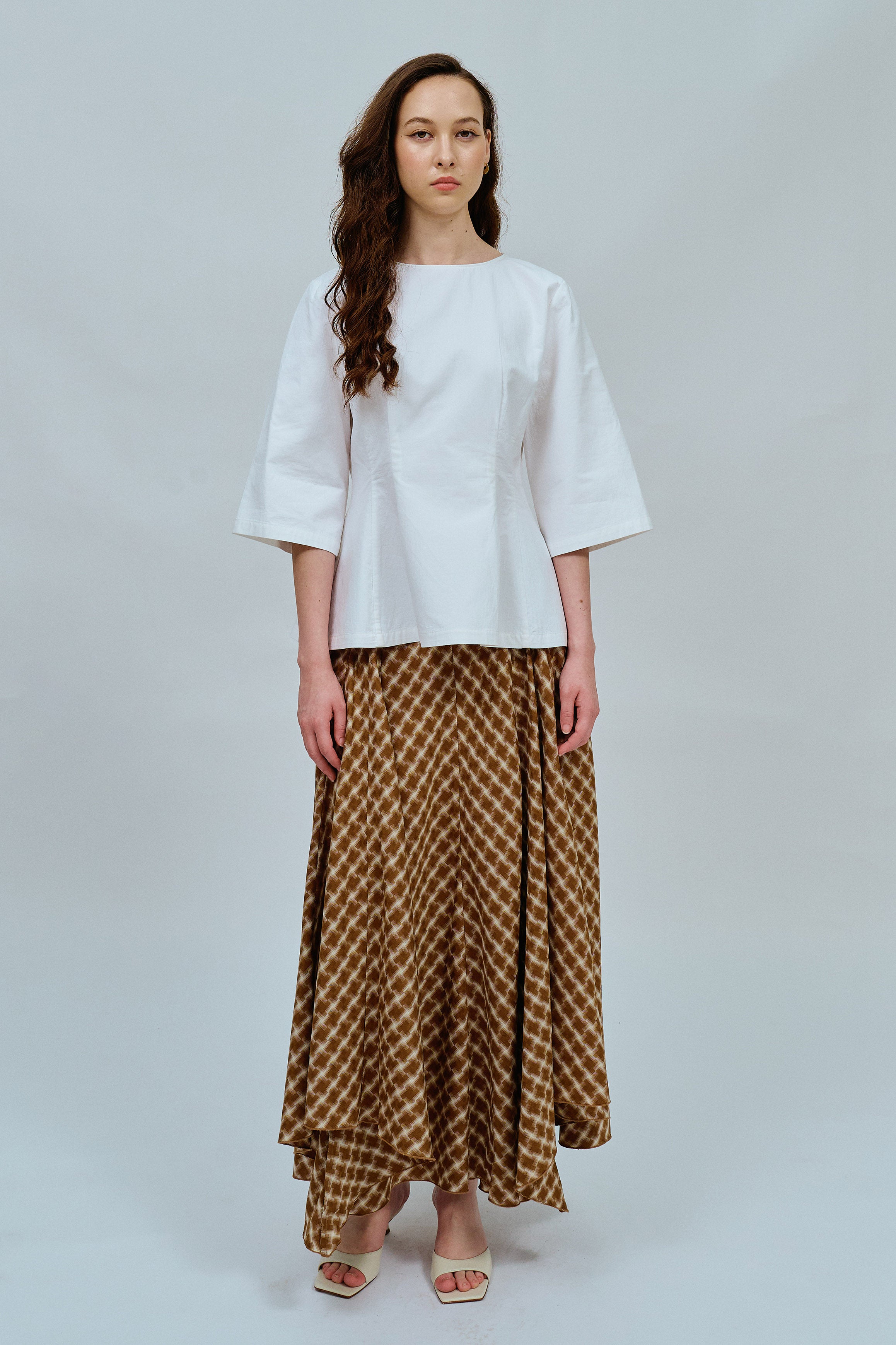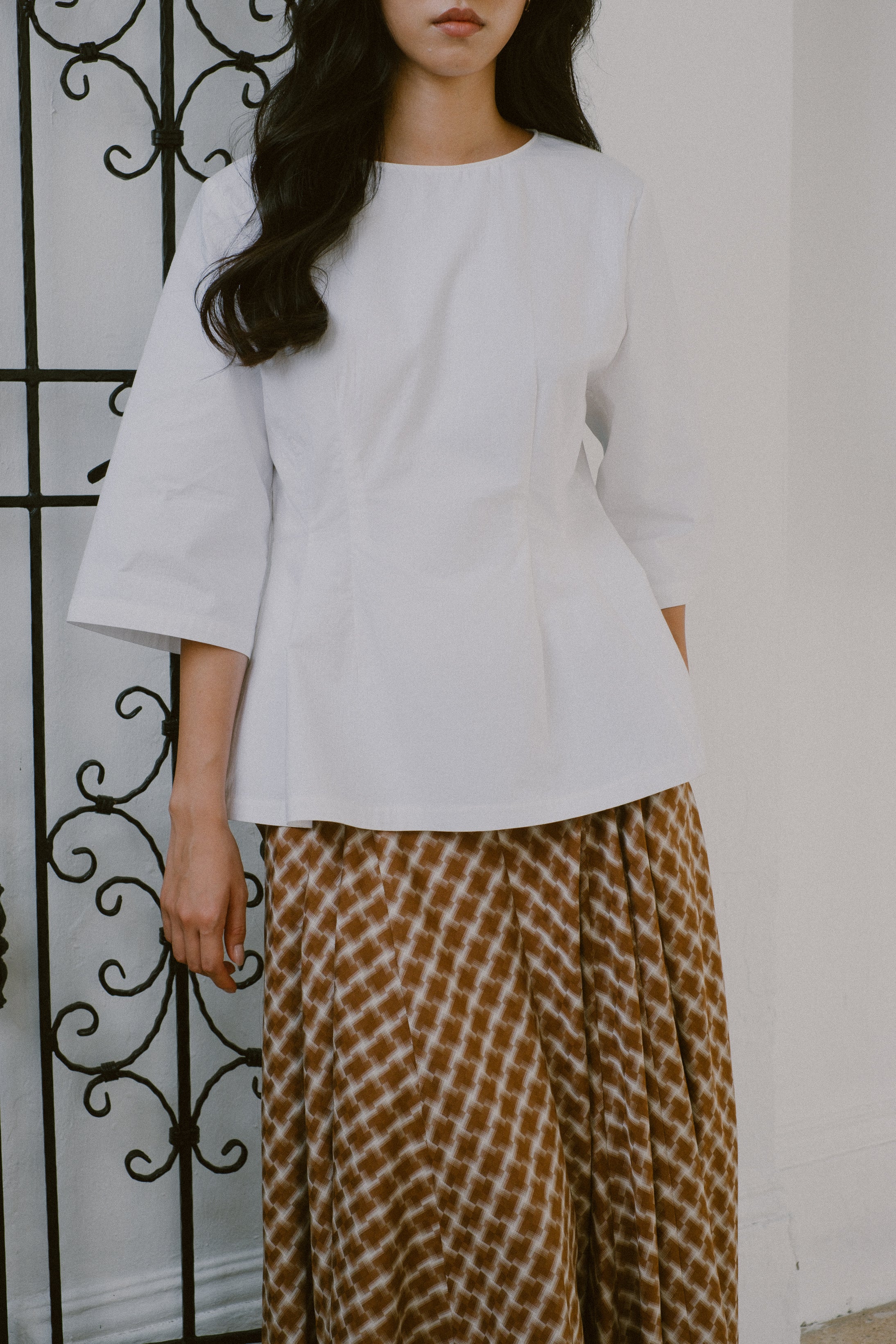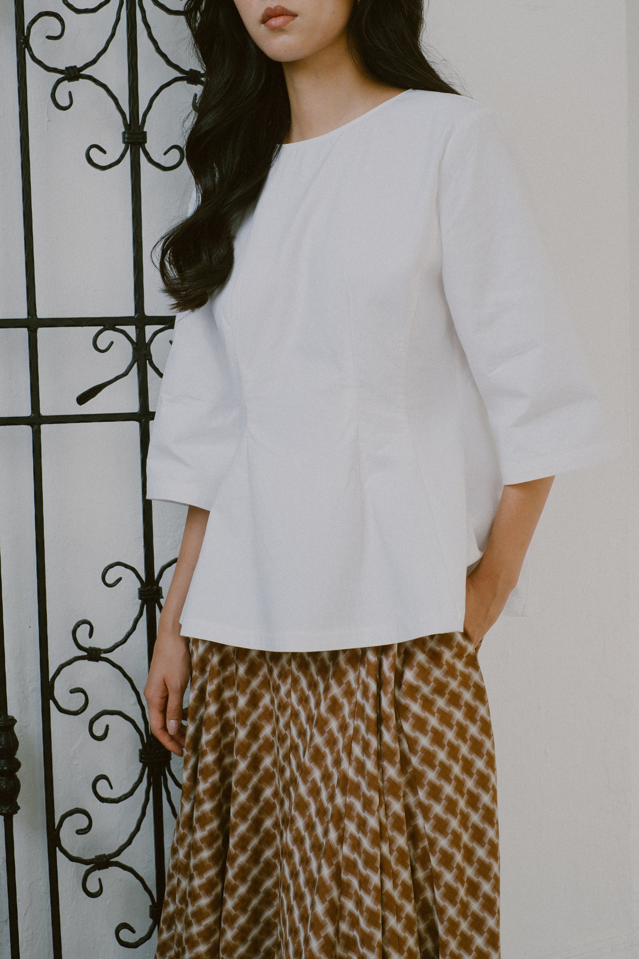 Semi-fitted silhouette with three-quarter sleeves and a subtle peplum hem. Rendered in cotton. Finished with a clean zip at the back.