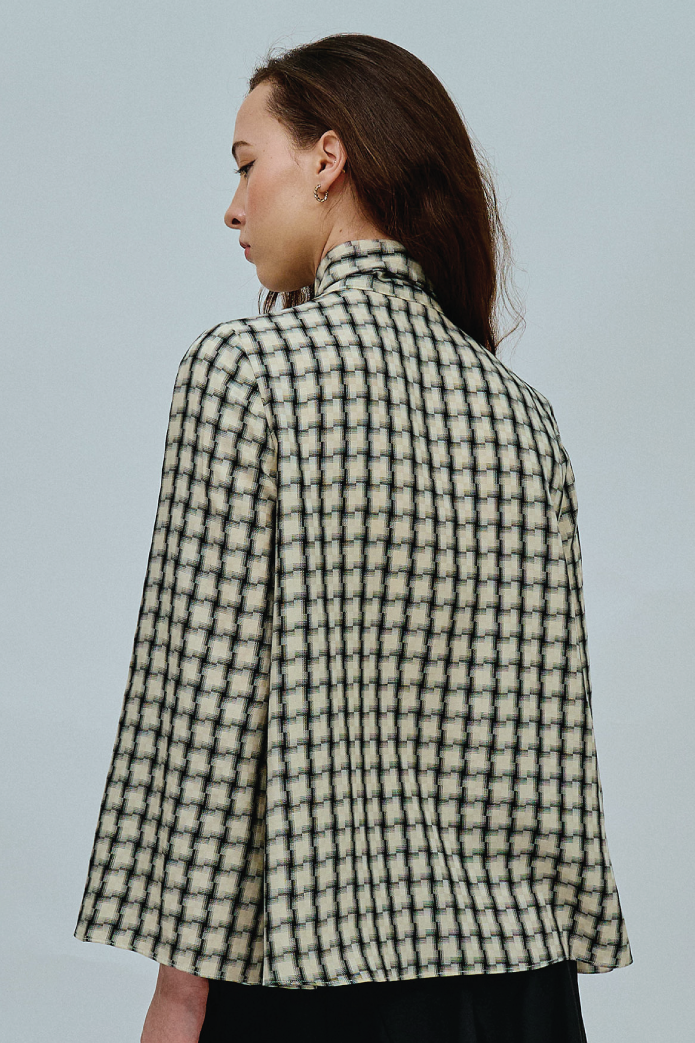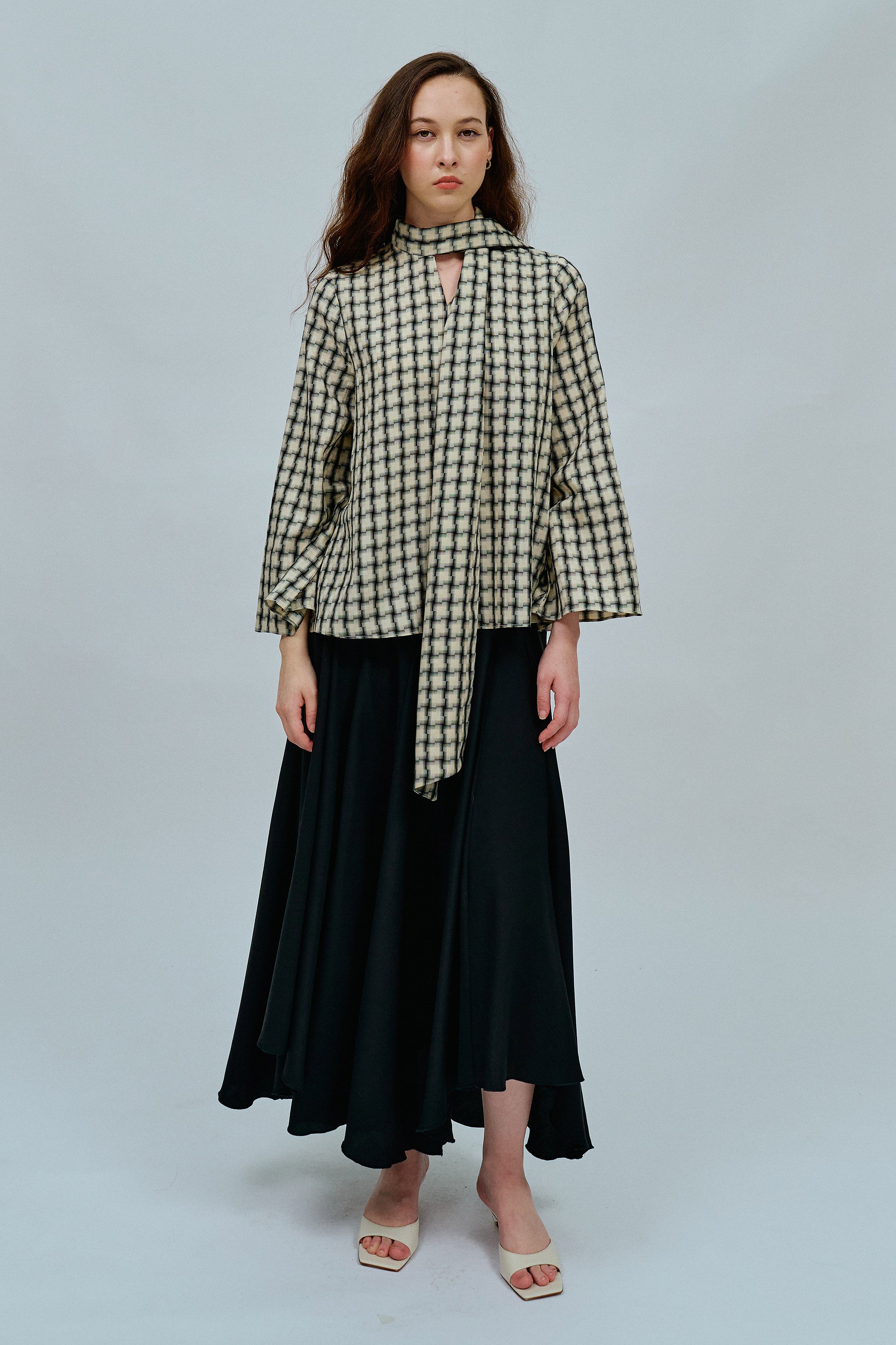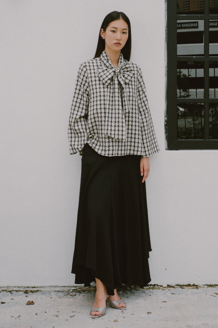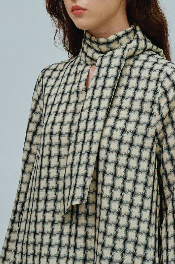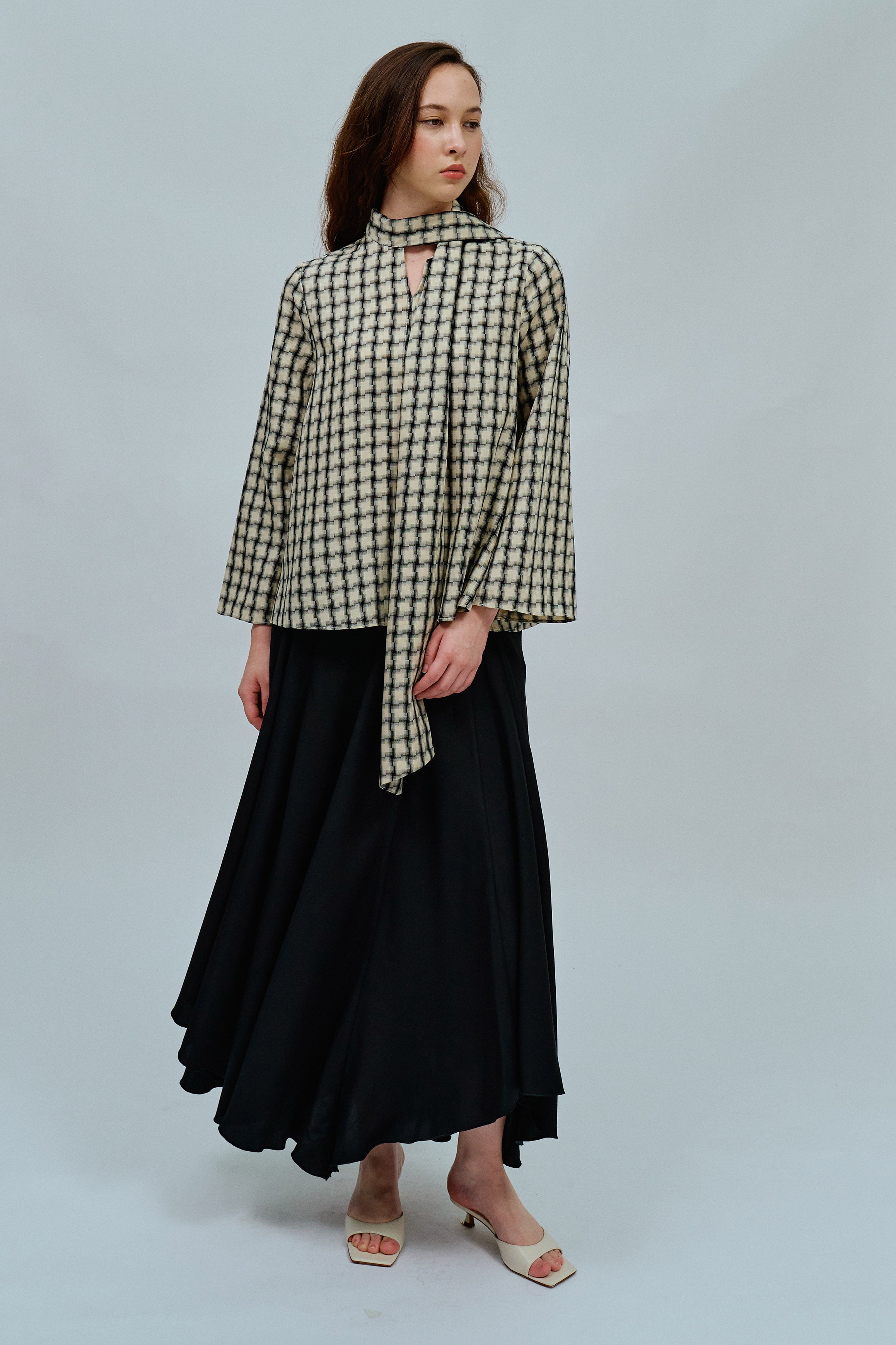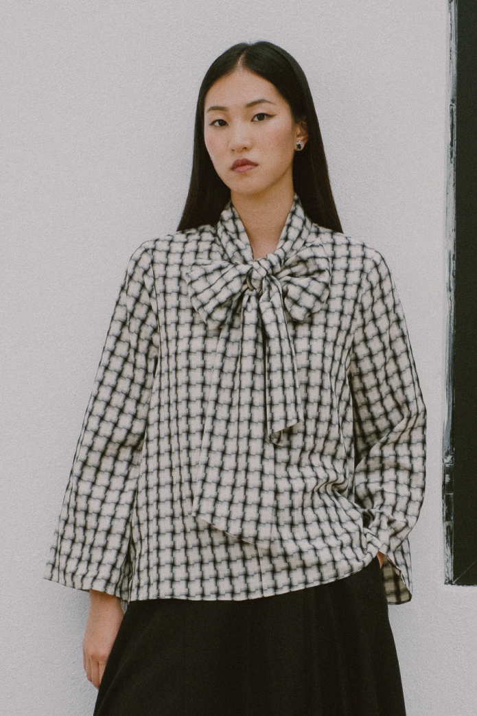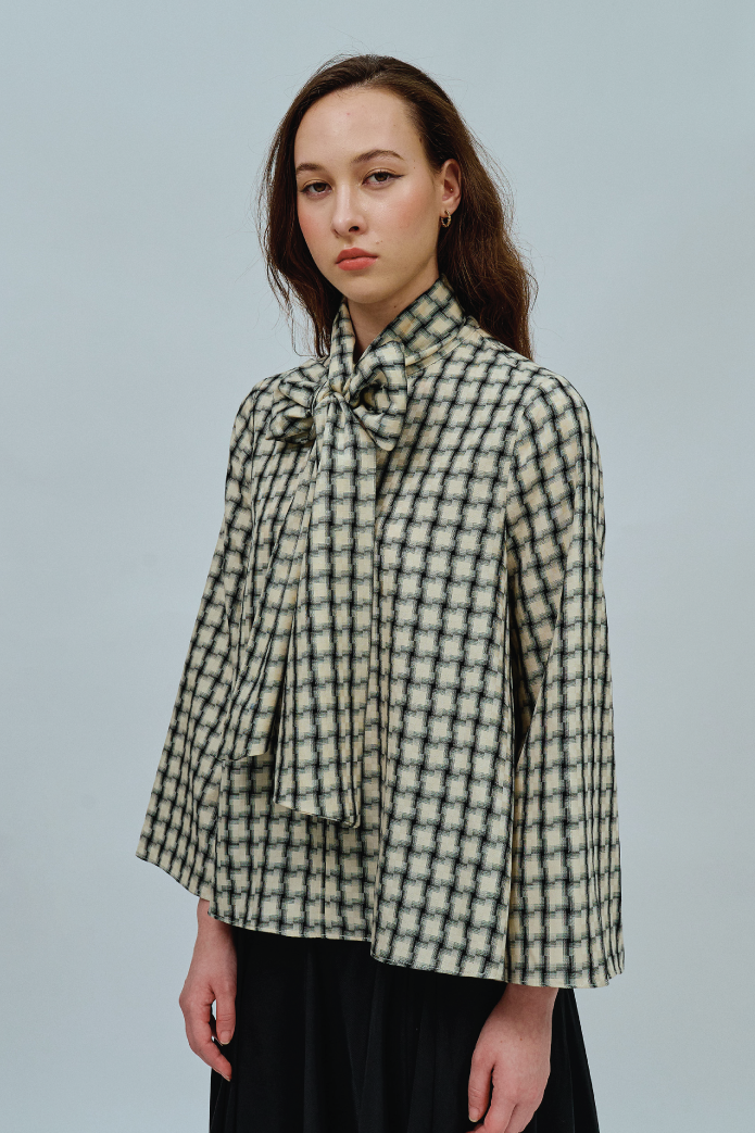 An A-line blouse with a bow collar and V-shaped front. Finished with bell sleeves.