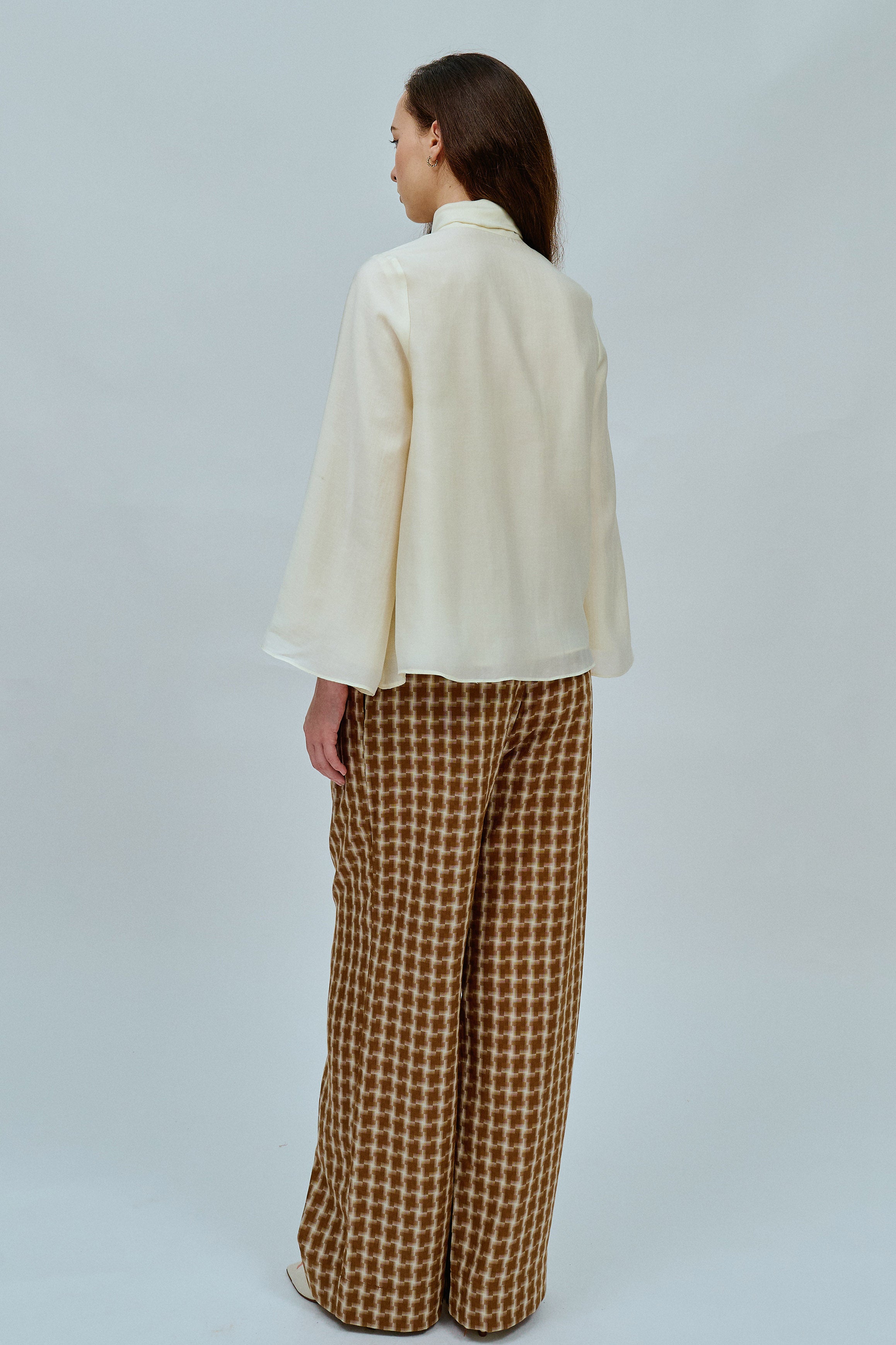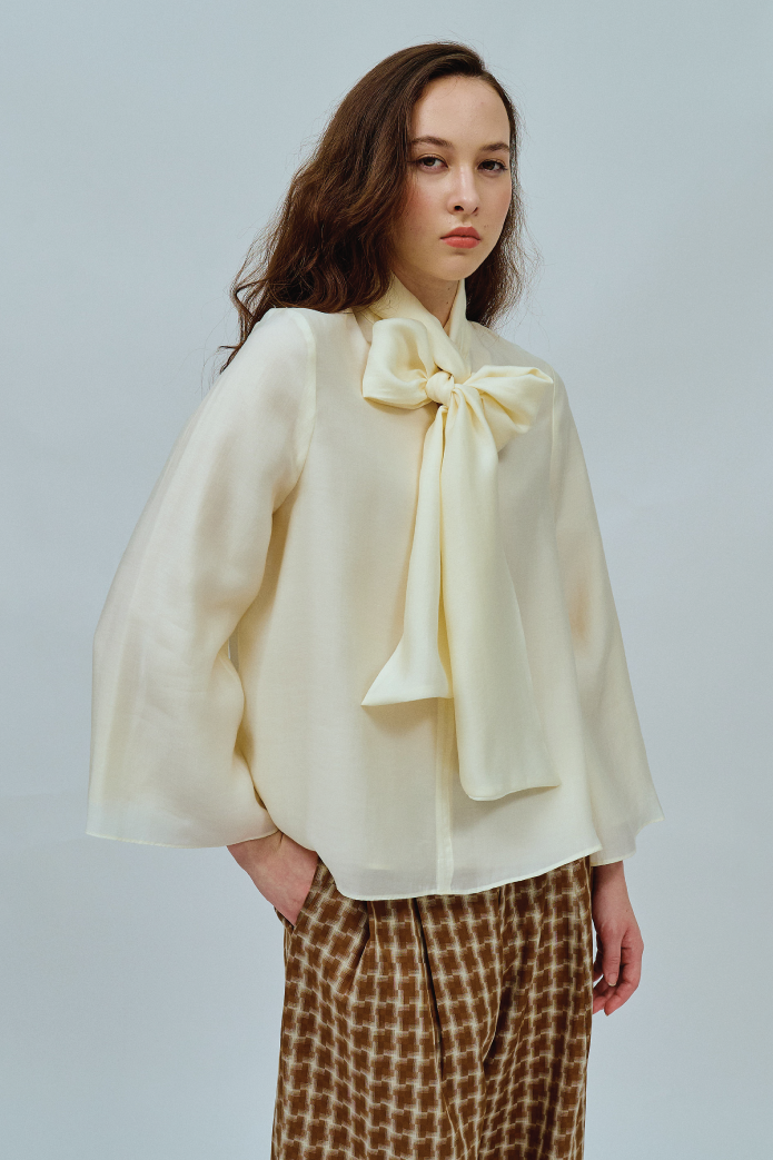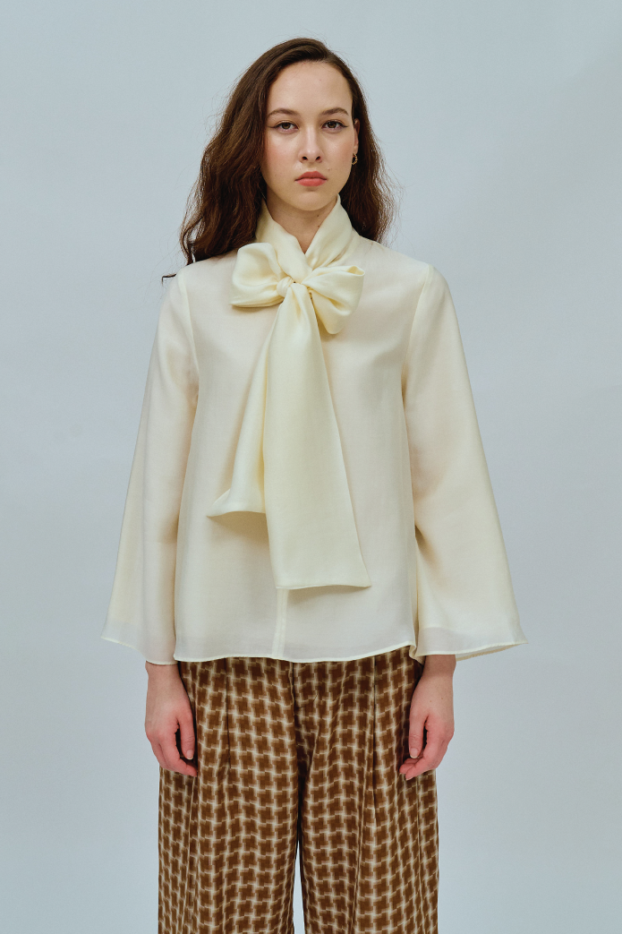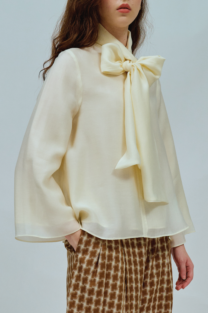 An A-line blouse with a bow collar and V-shaped front. Fully lined in cotton. Finished with bell sleeves.