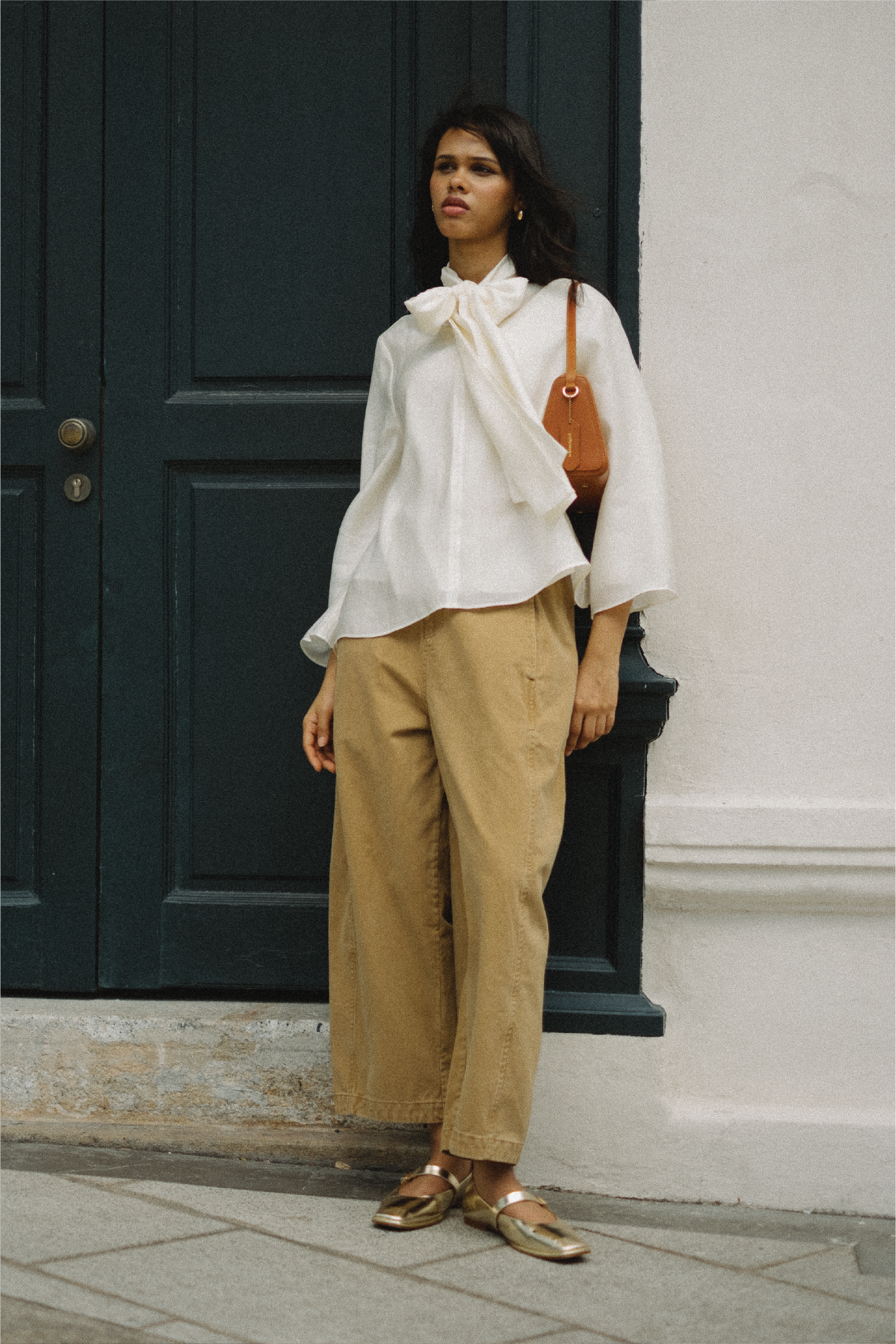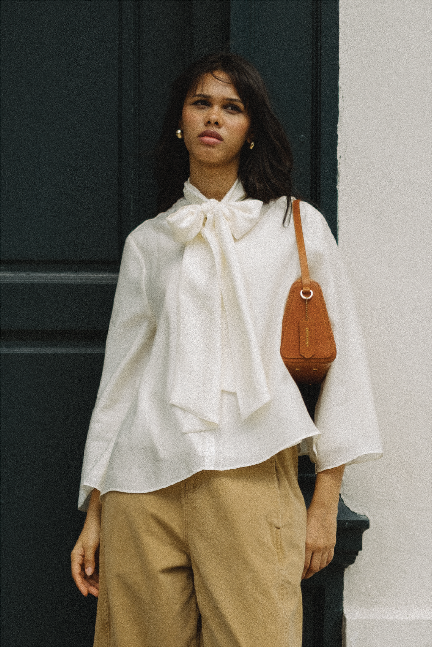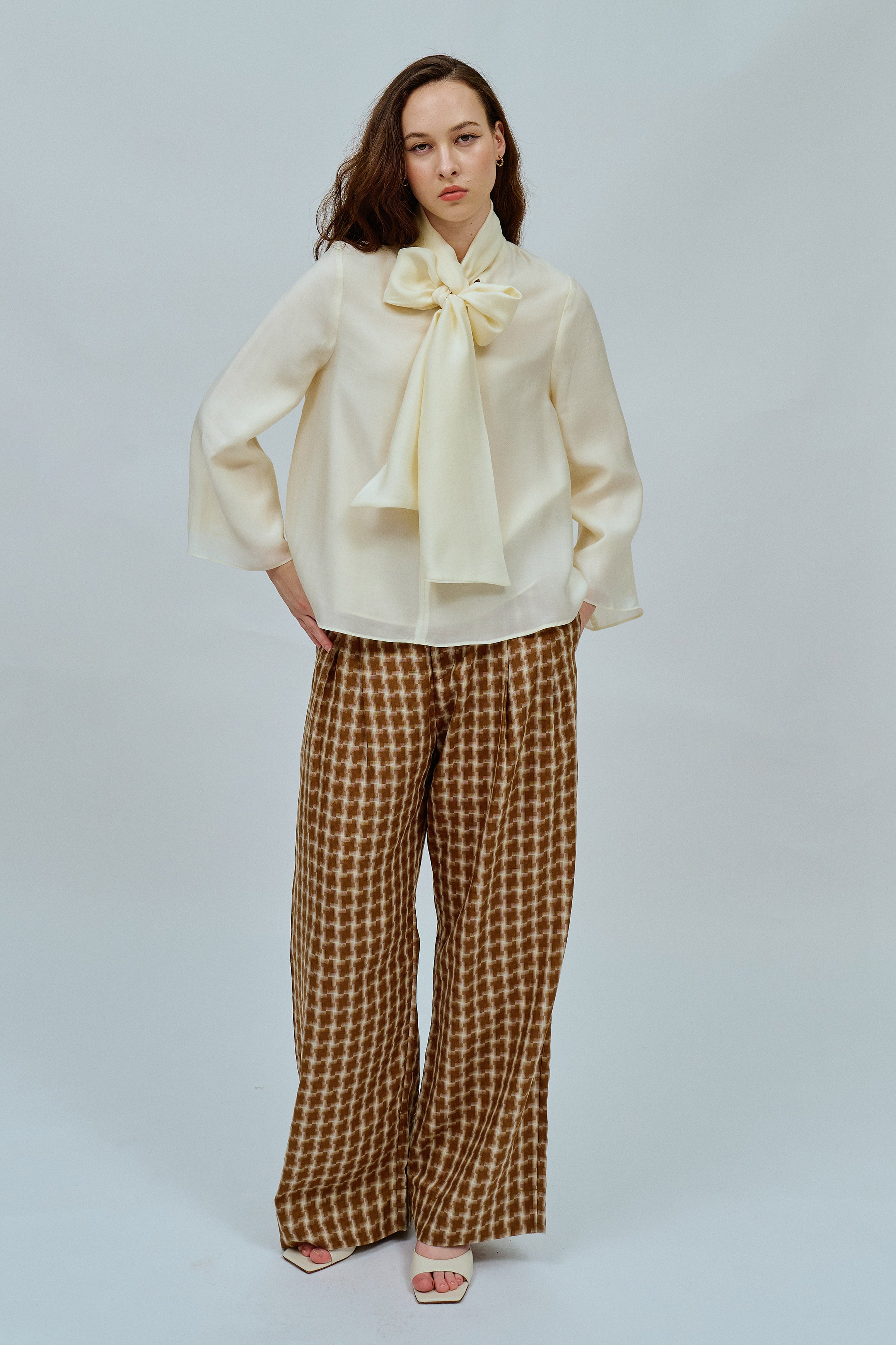 An A-line blouse with a bow collar and V-shaped front. Fully lined in cotton. Finished with bell sleeves.