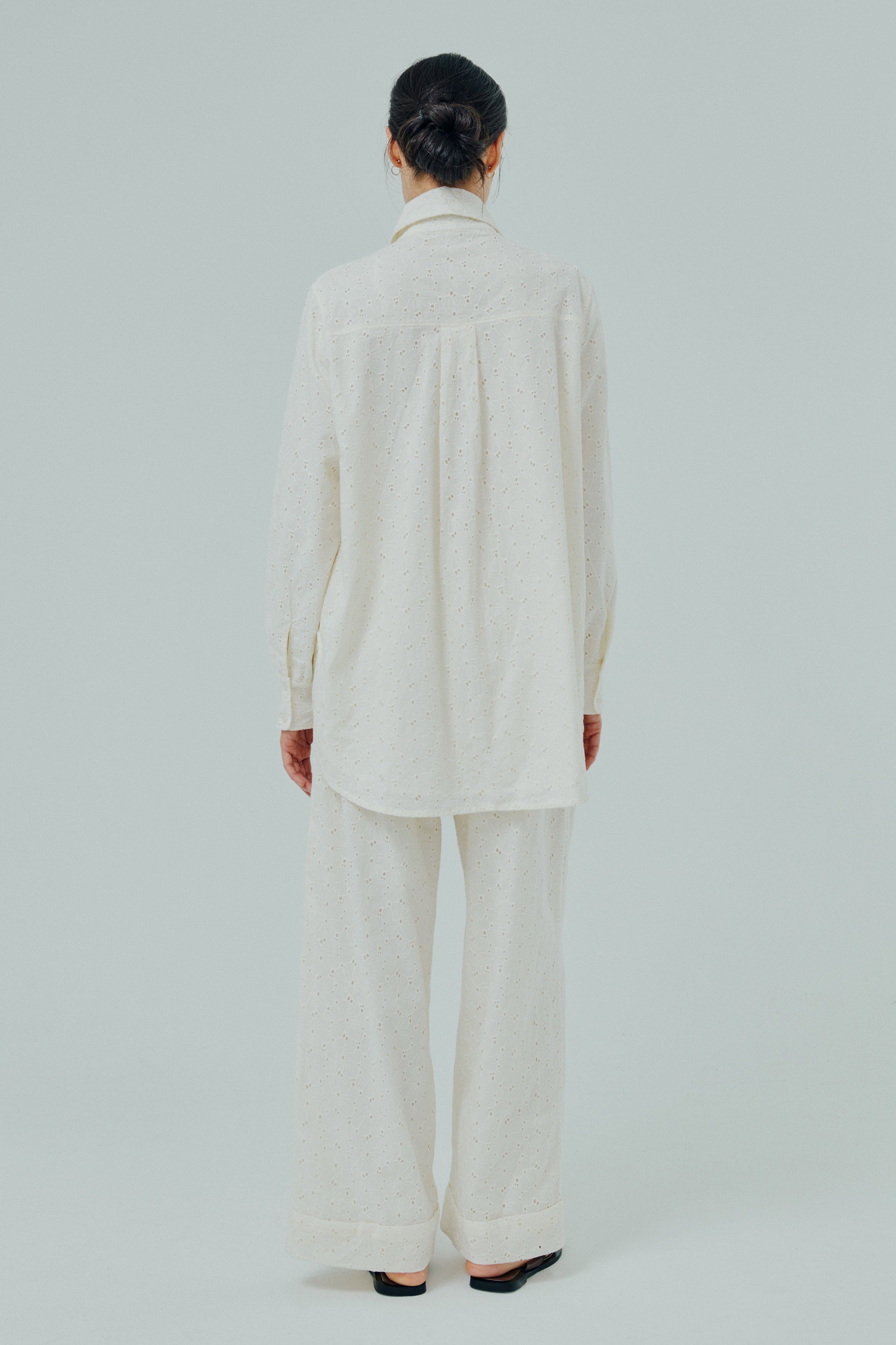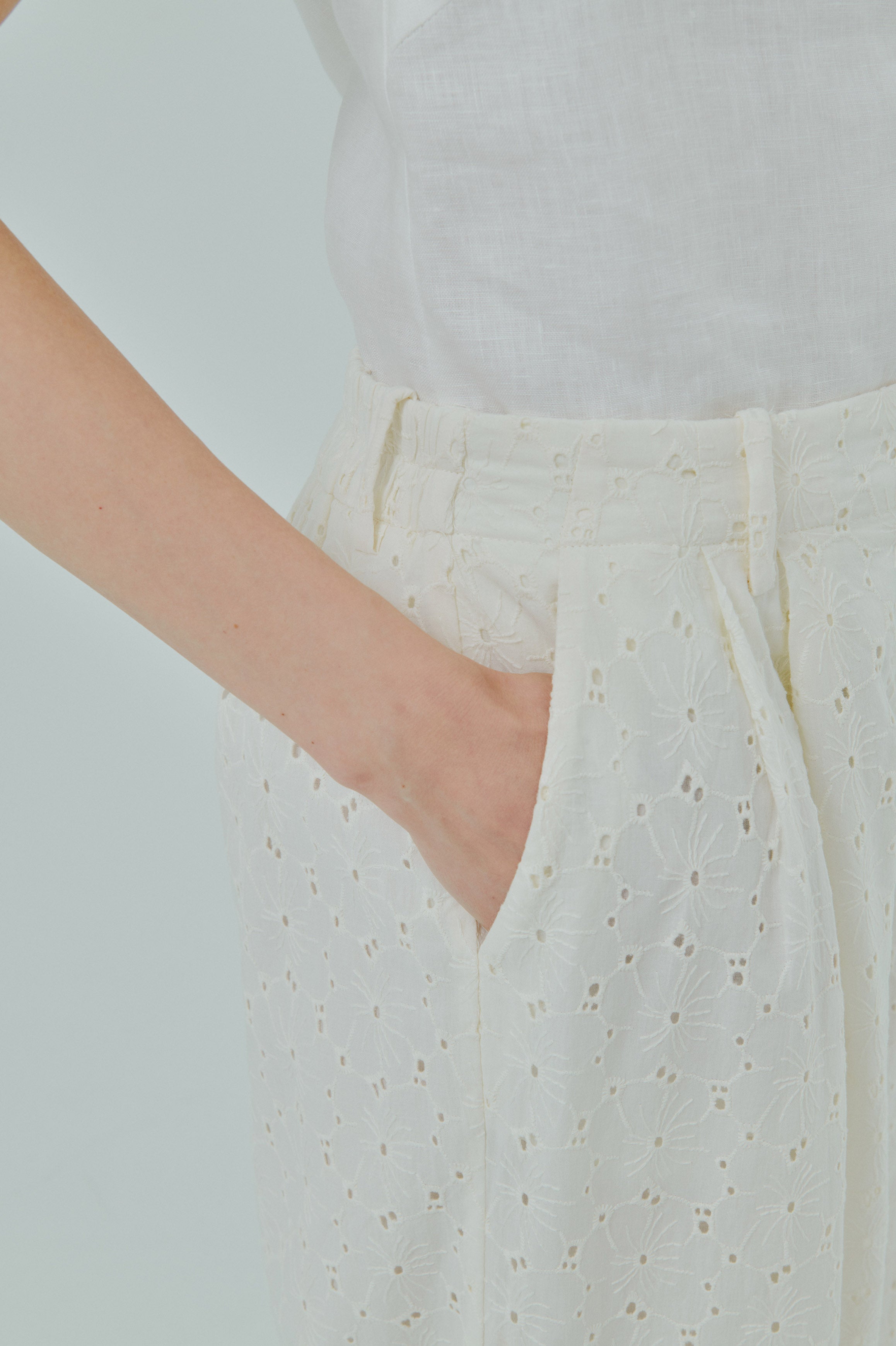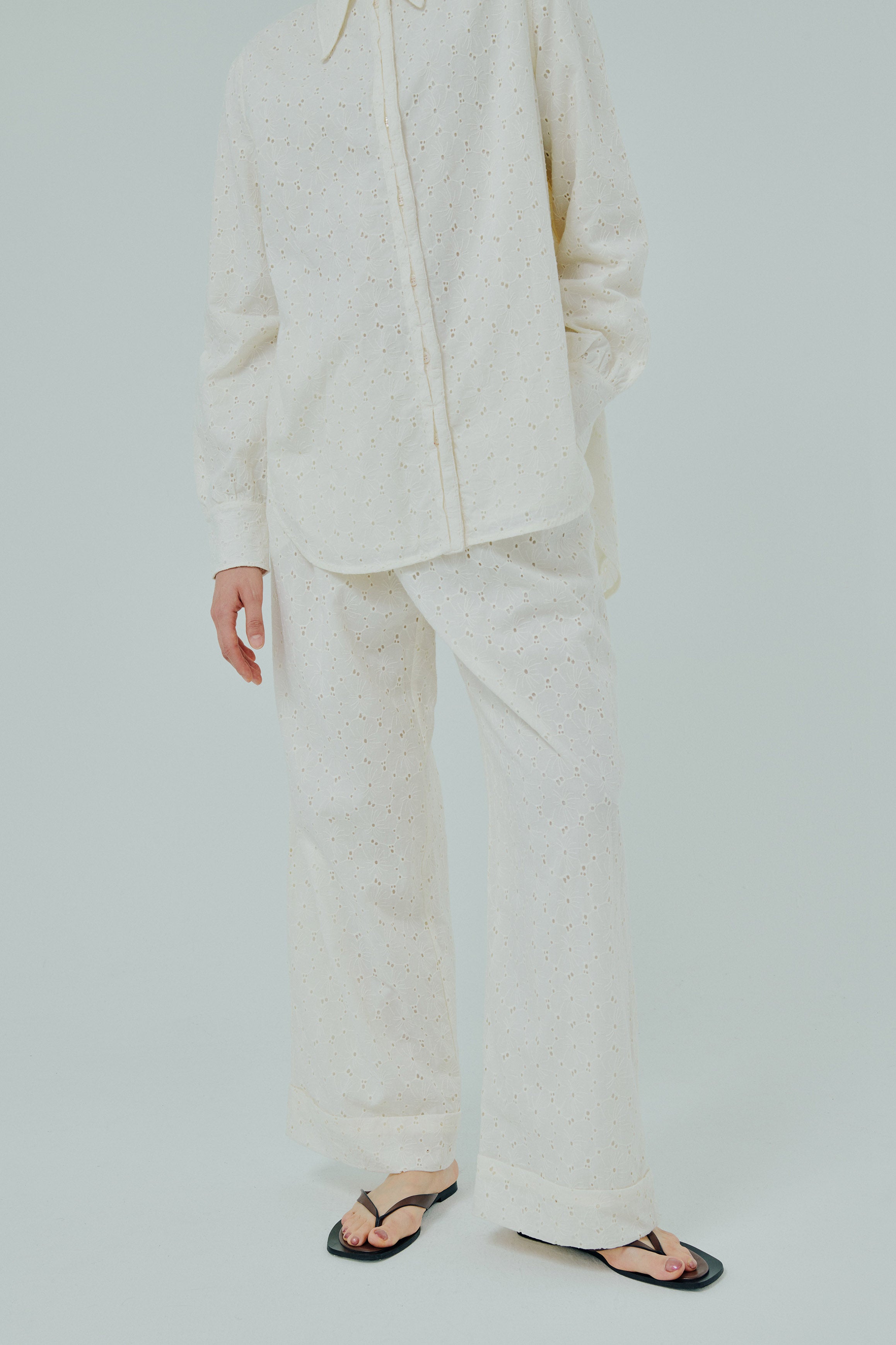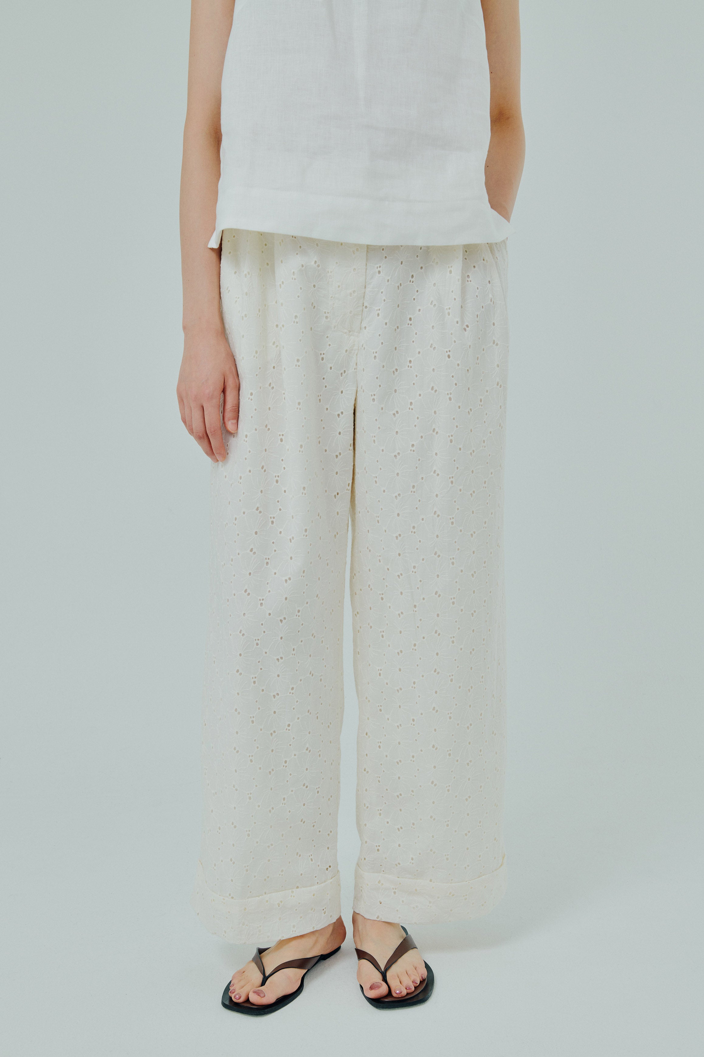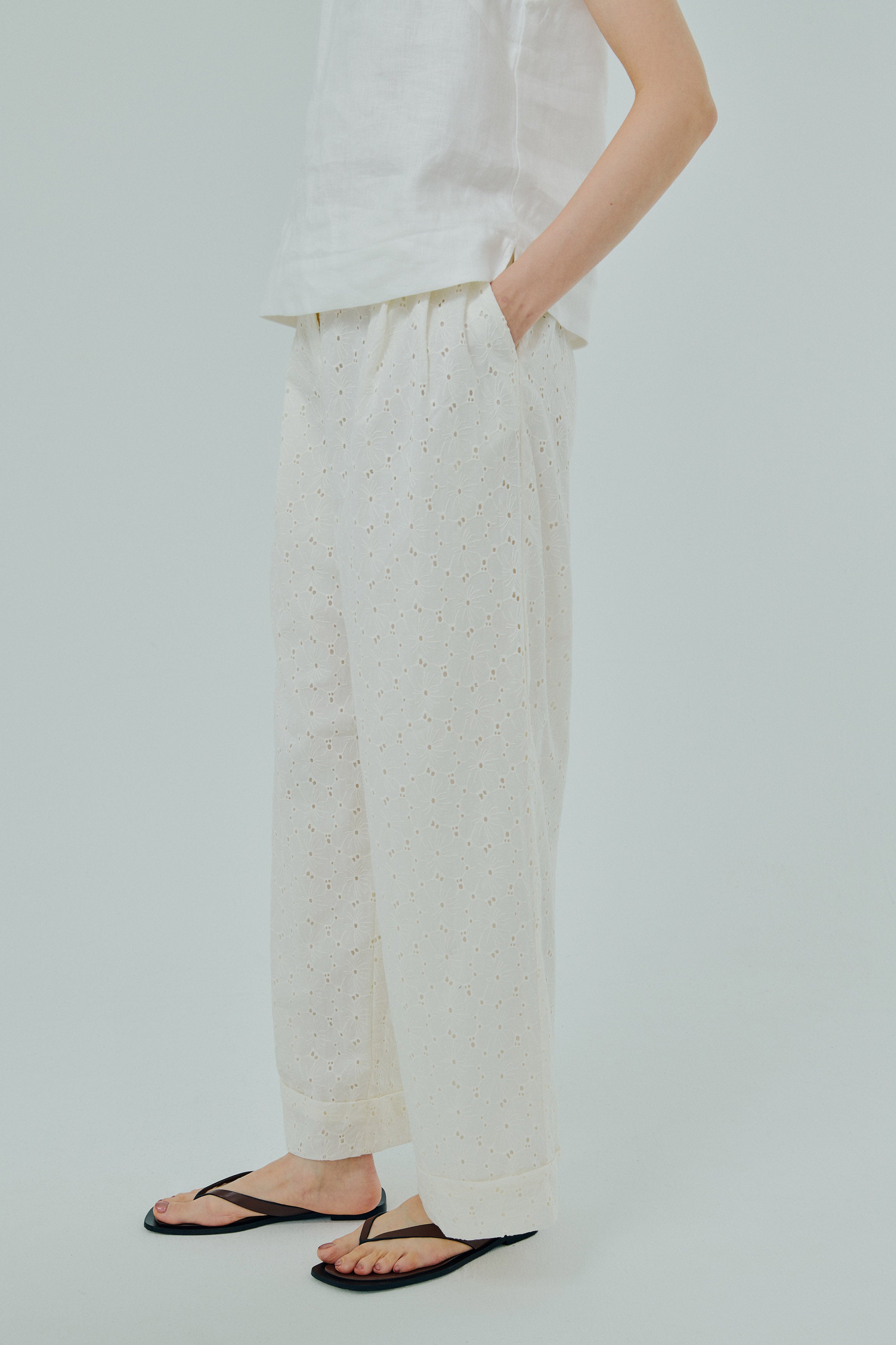 Tailored trousers, with a front zip, button fastening and half-elastic waistband. Finished with side and back pockets. Rendered and lined in cotton.