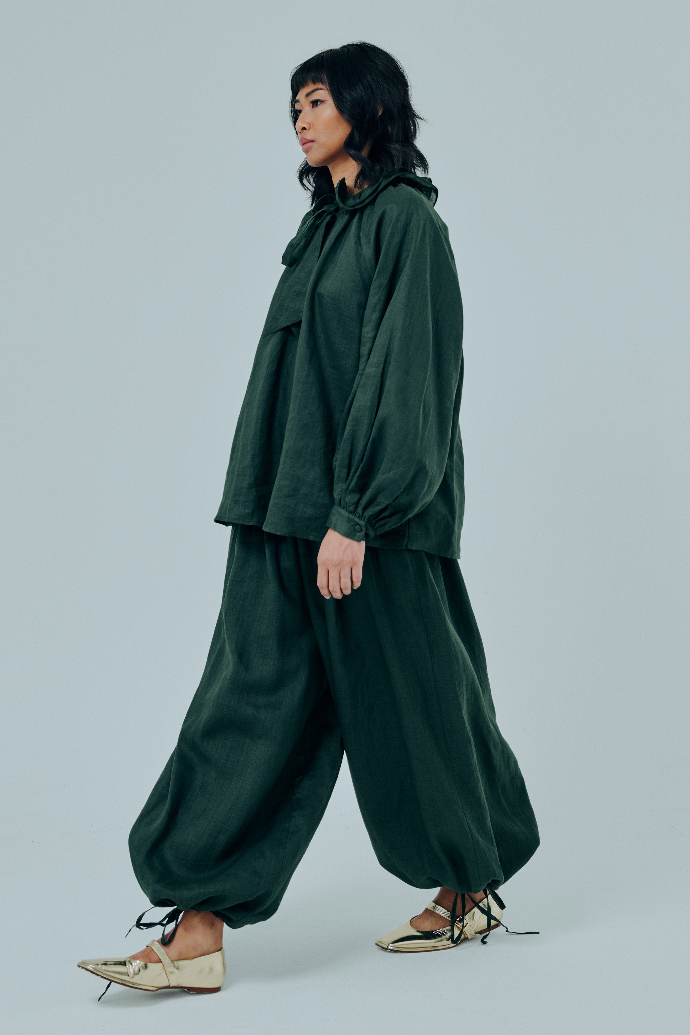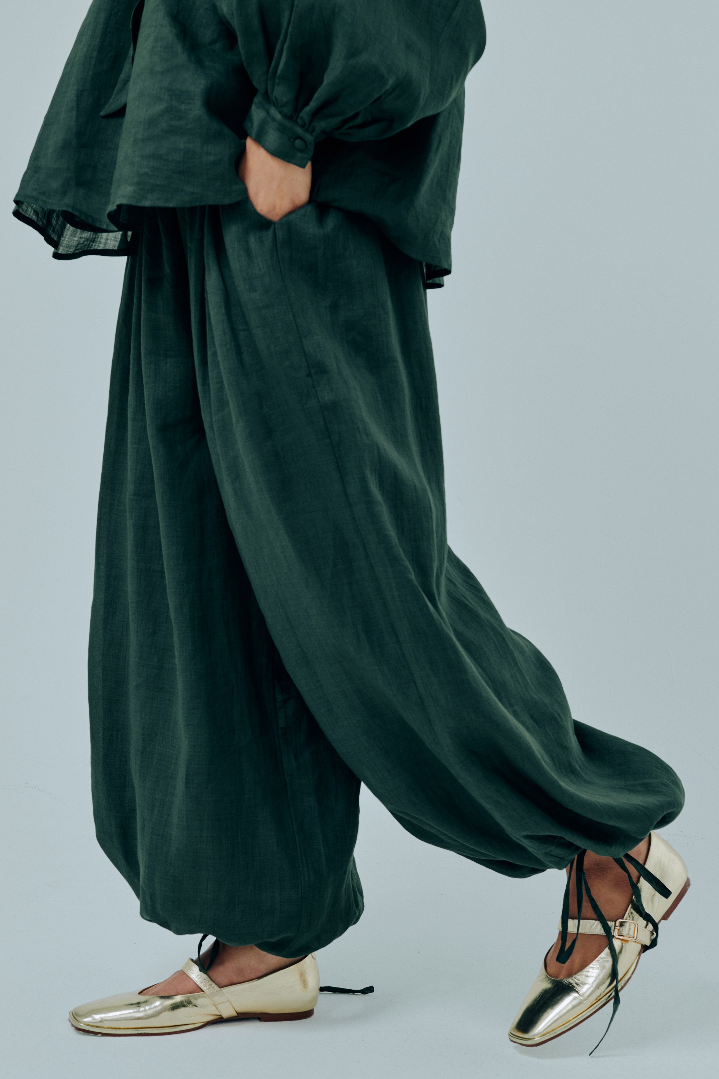 Oversized wide-leg fit, with rounded balloon legs. Rendered in ramie, and lined with cotton. Features a gathered drawstring waistband and adjustable drawstrings at the ankles. Finished with side pockets.