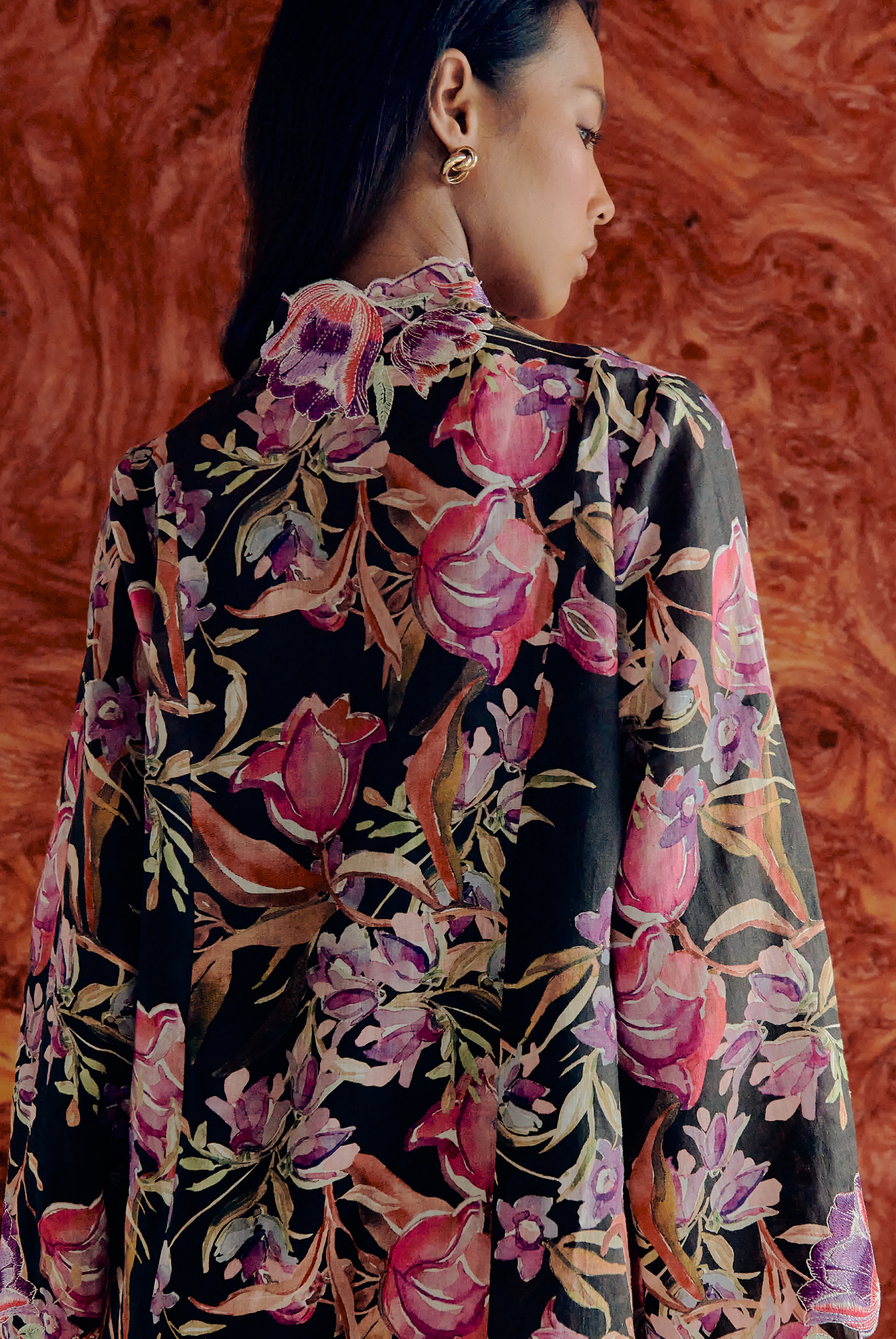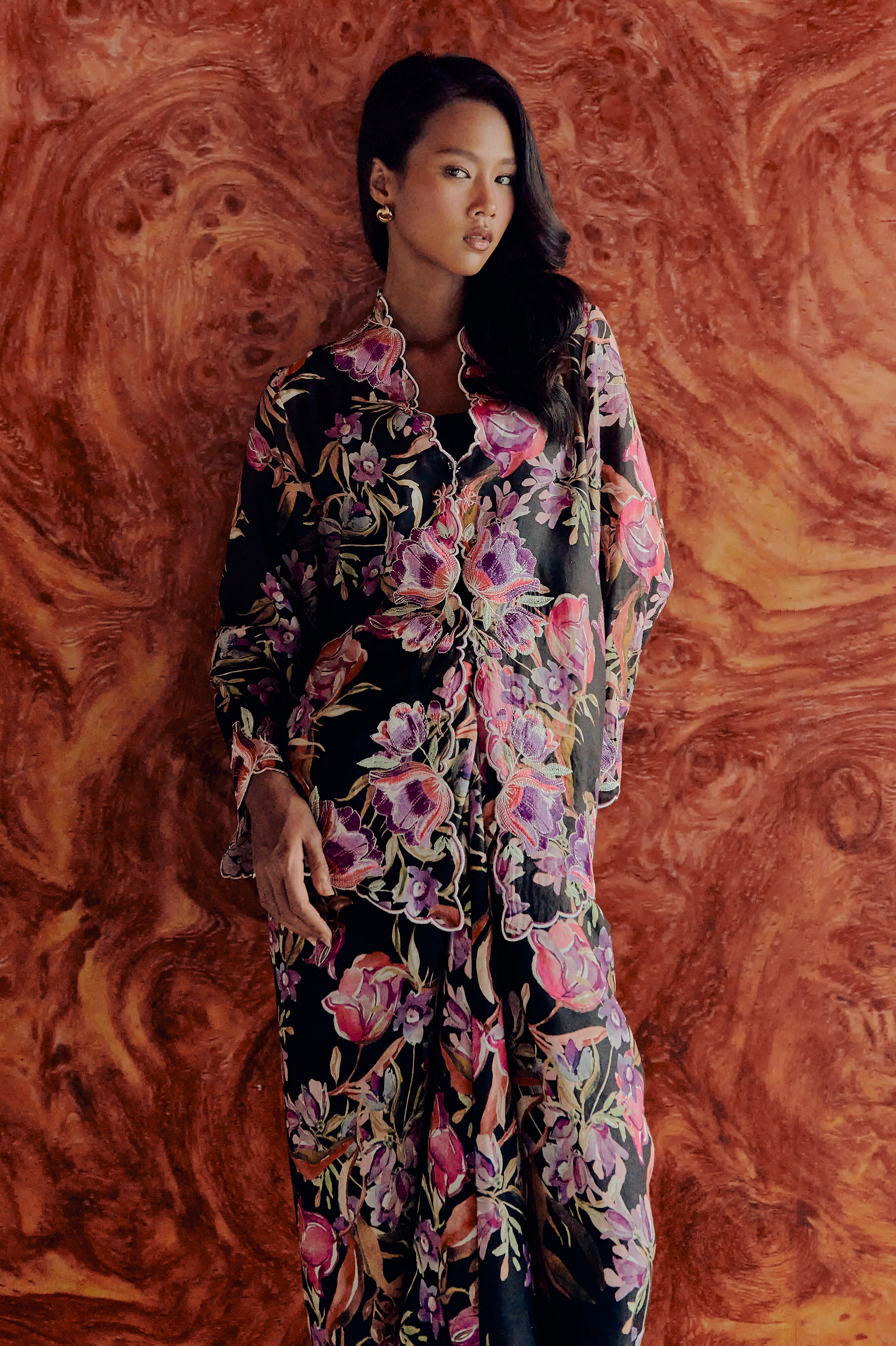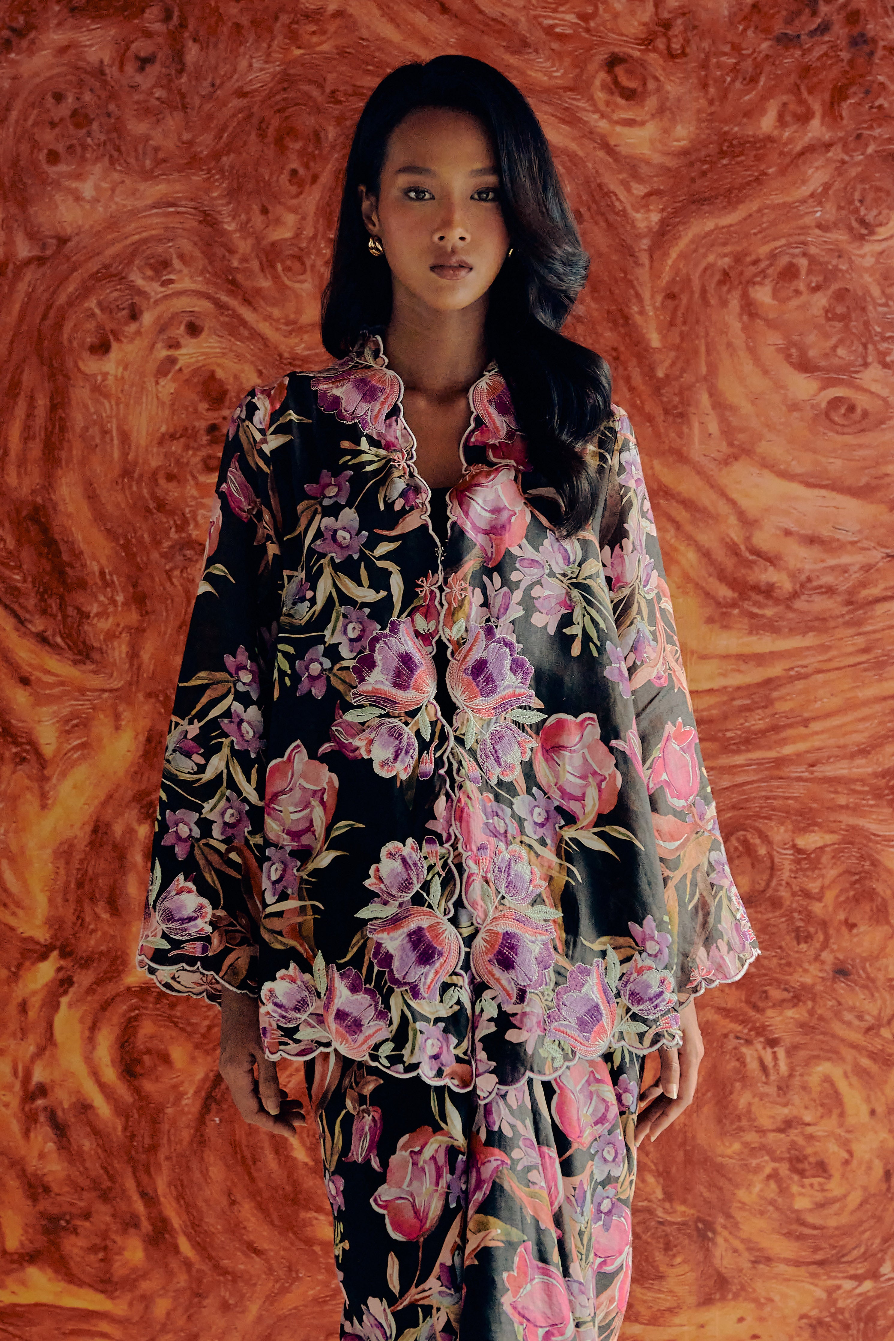 A reiteration of the kebaya silhouette, rendered in ramie. Features bold floral embroidery in multi-tone threads, finished with a single front hook-and-eye closure. Due to the sheerness of the material, we recommend layering it with an inner for added coverage.