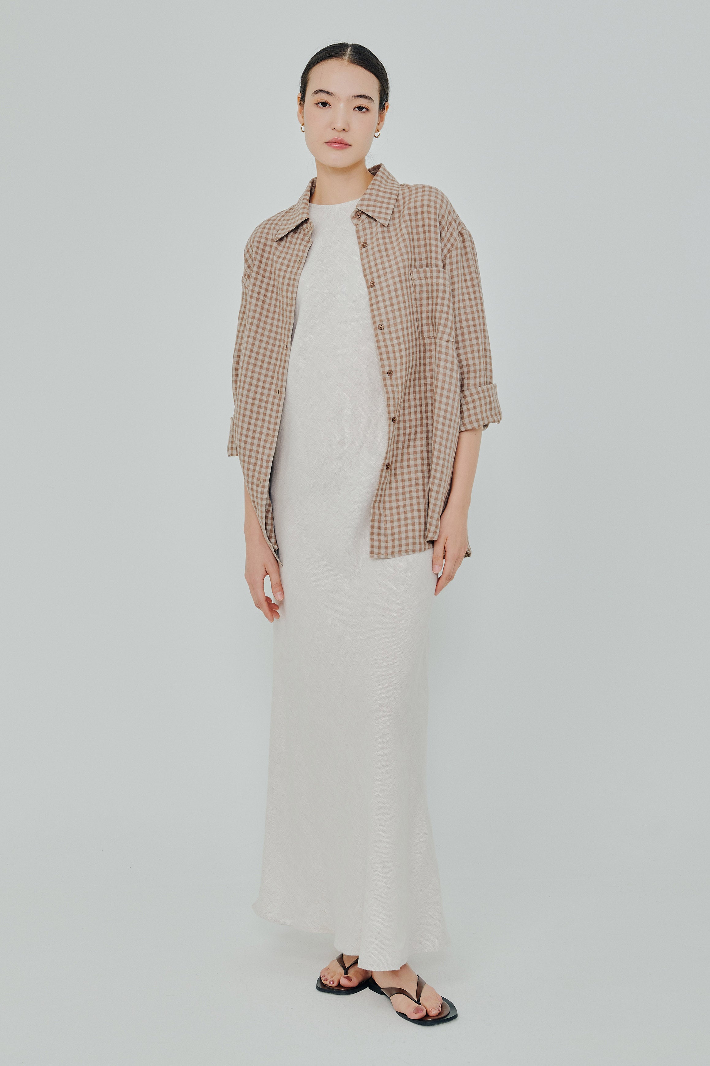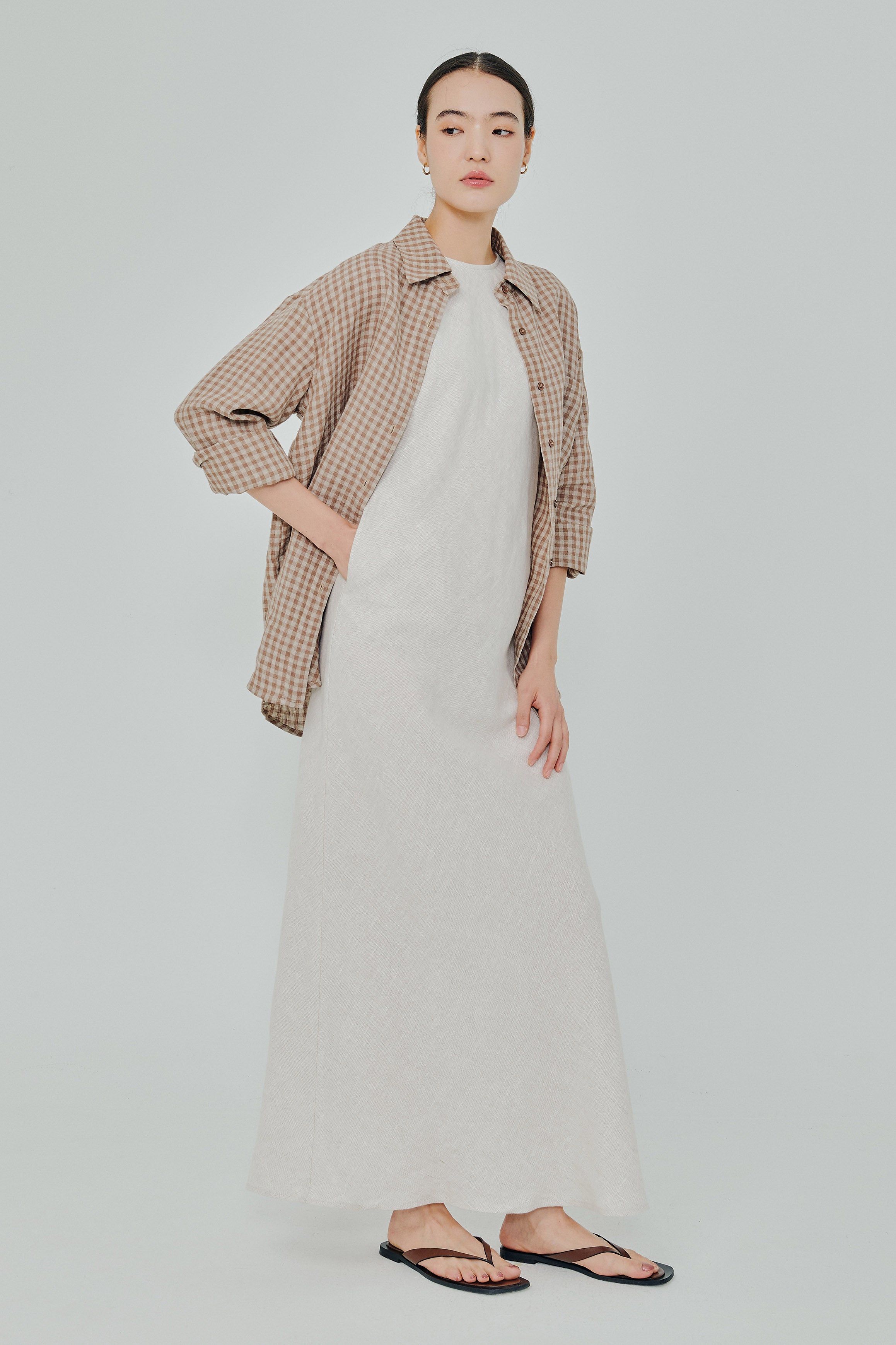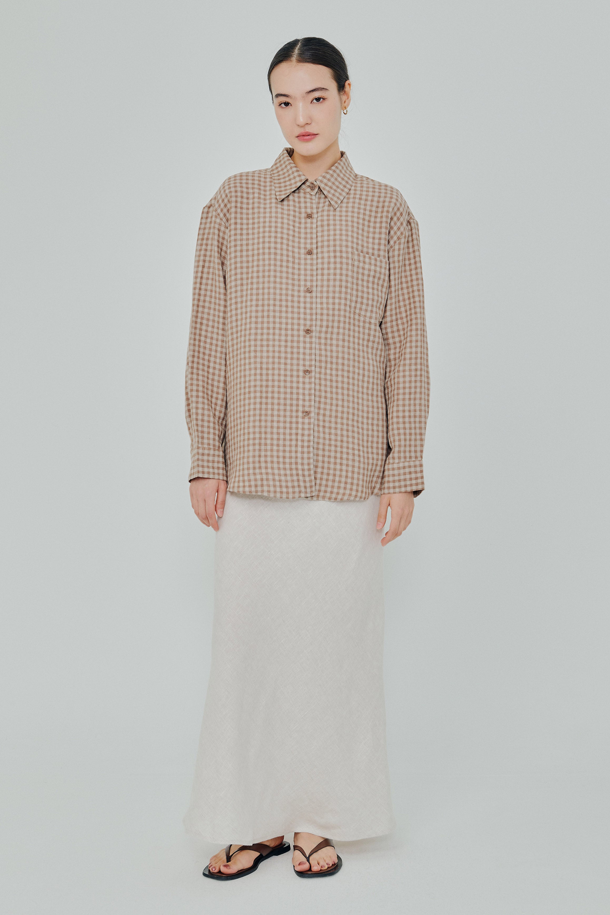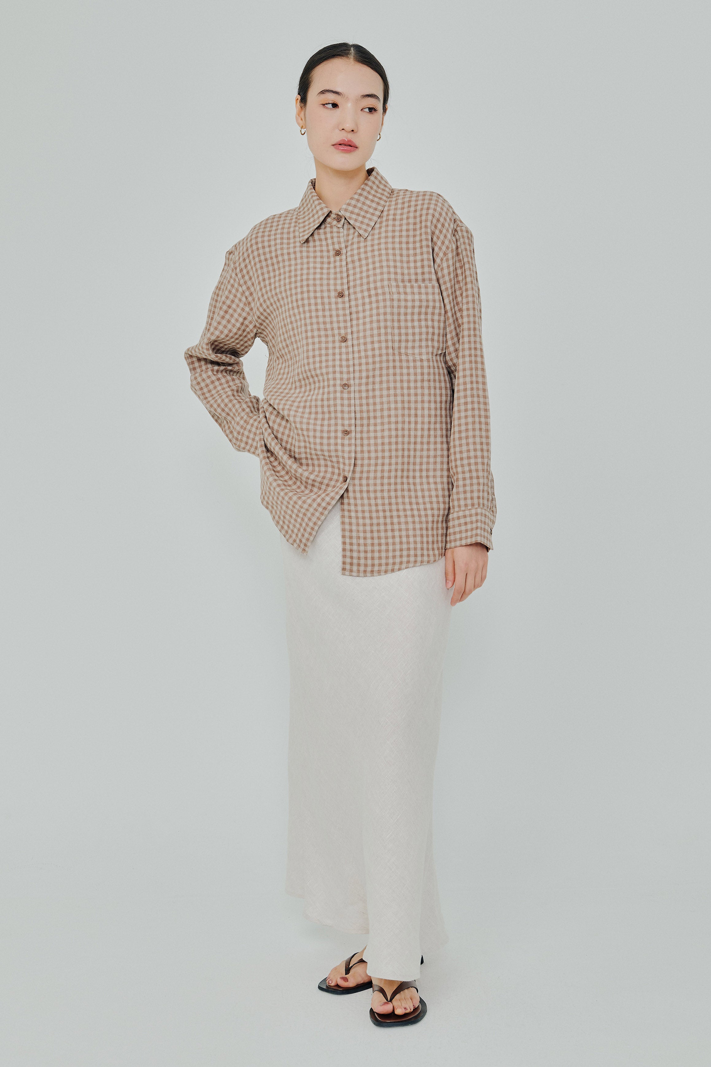 Statement Button-Back Linen Shirt in Brown Gingham