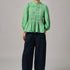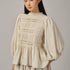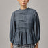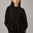 A feminine silhouette with a polka dotted weave pattern. Features a pintuck bodice and peplum hem. Finished with frilled details and fisheye trims.