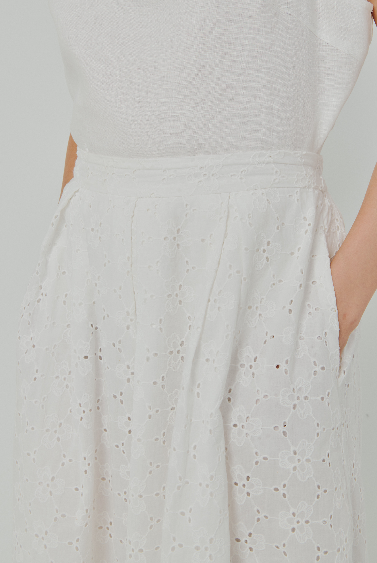 A-line midi skirt, with box pleat details. Features a half-elastic waistband and side pockets Rendered in cotton broderie, and lined in cotton.