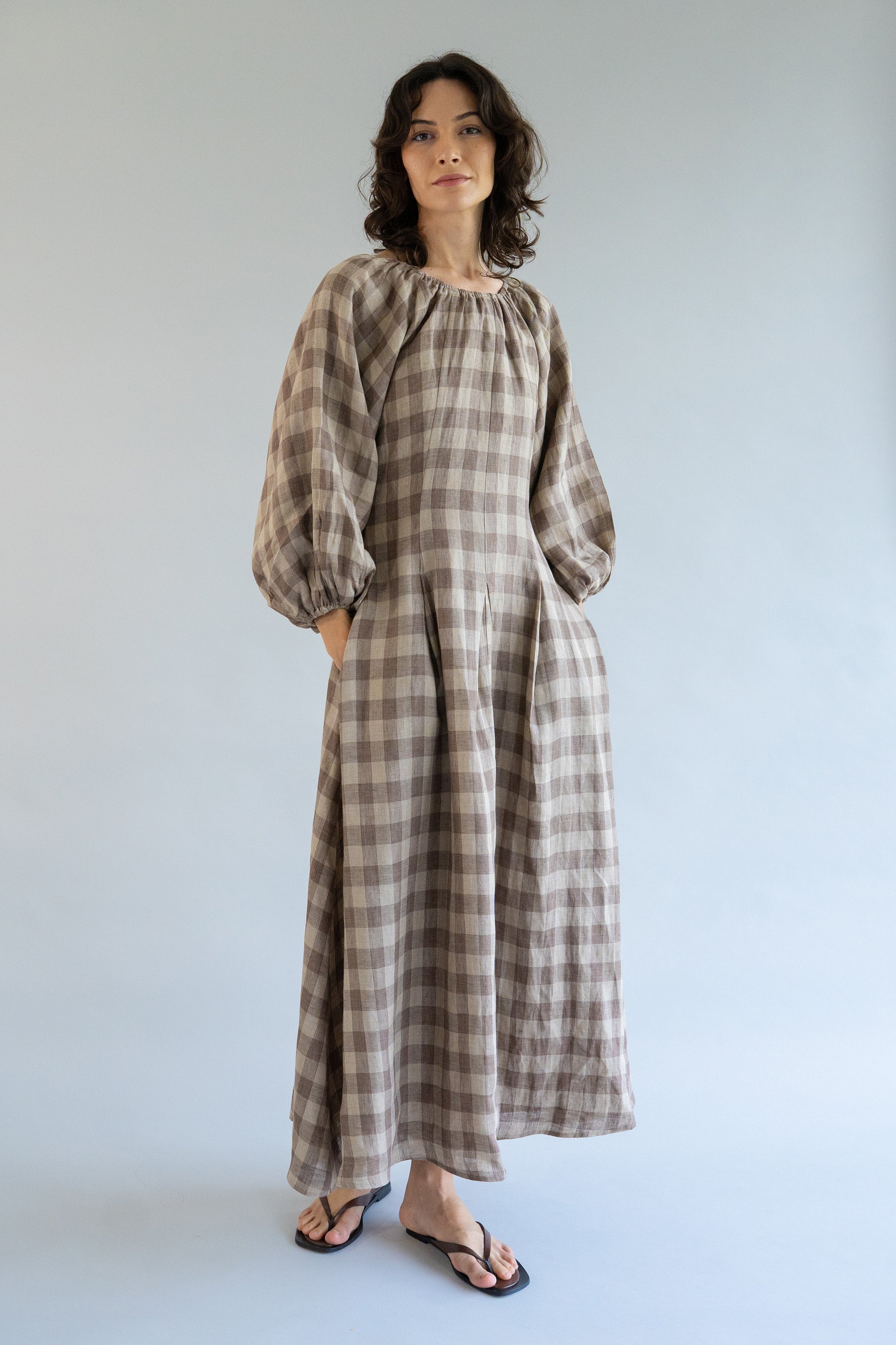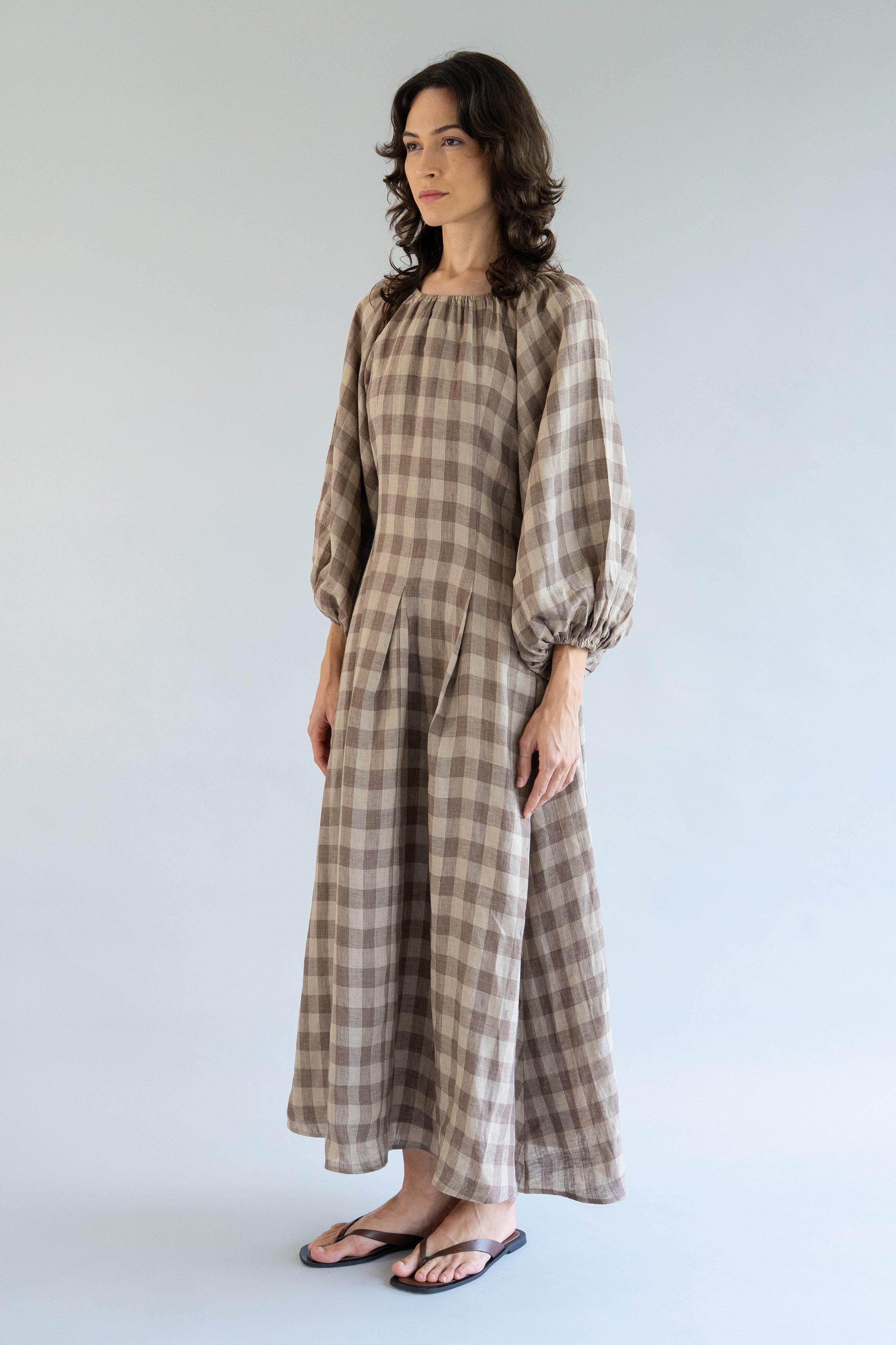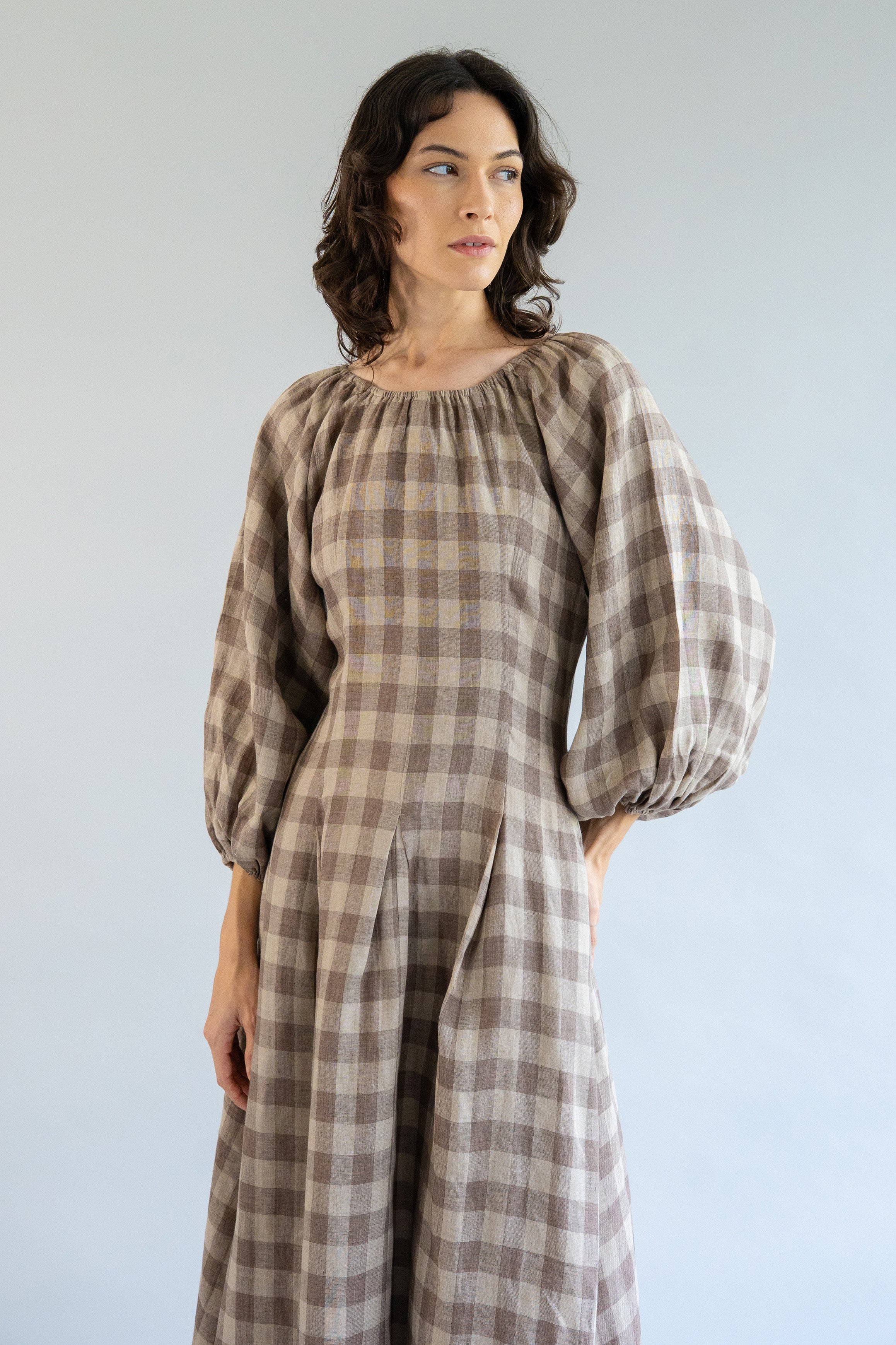 Fitted dress with structured box pleats, rendered in linen. Features a round neckline and bubble sleeves. Finished with side pockets. Fully lined in cotton.
