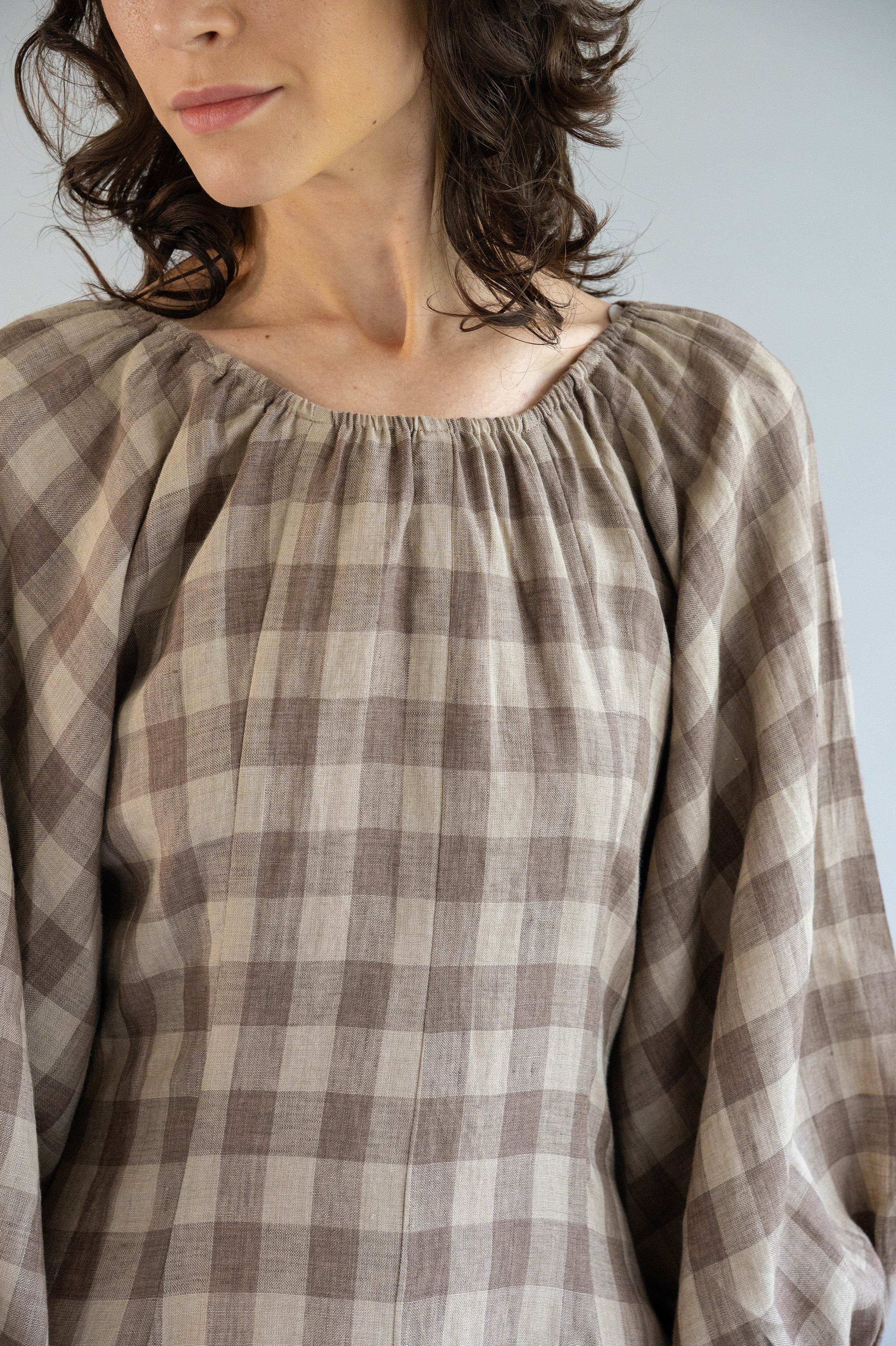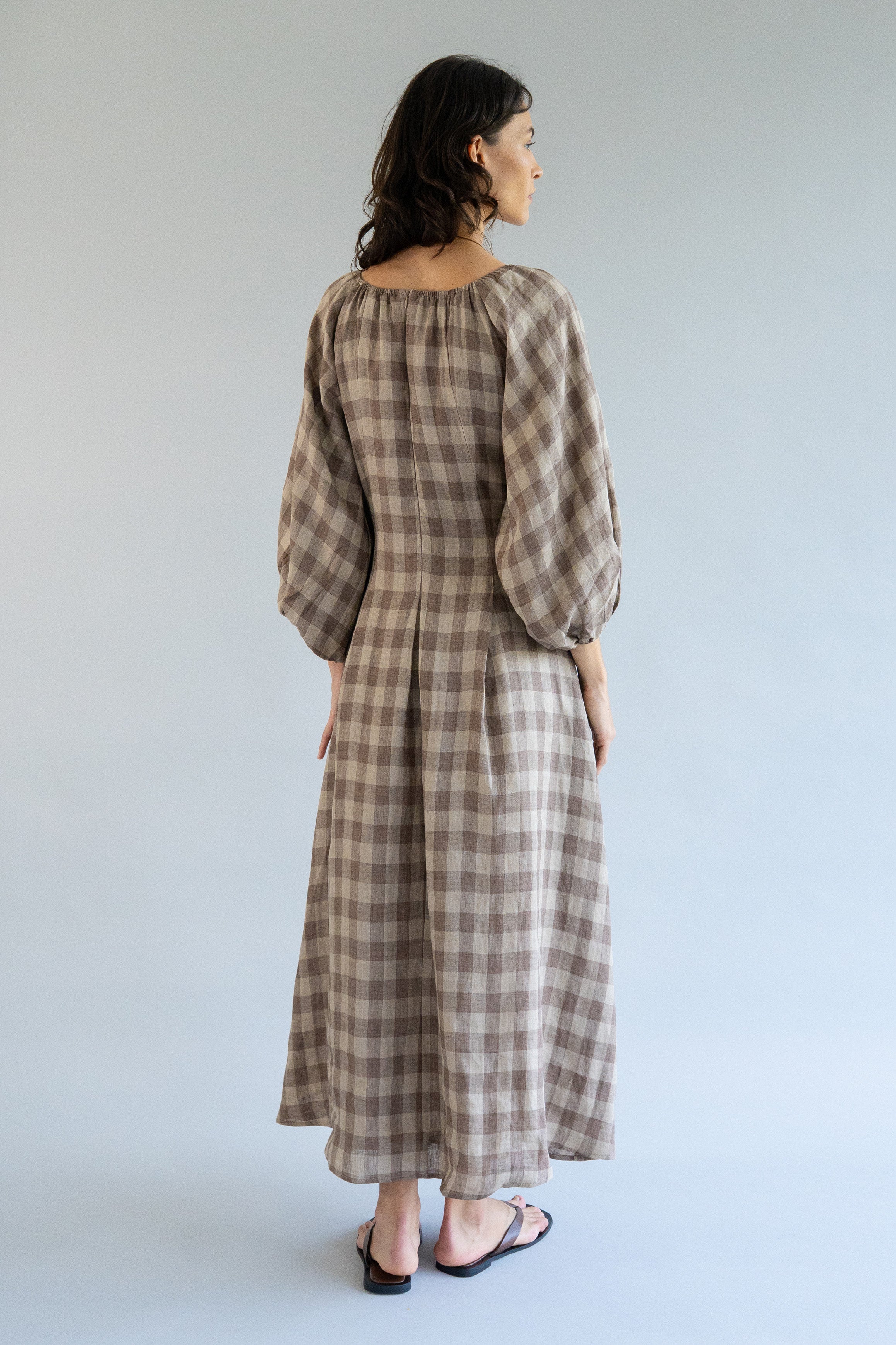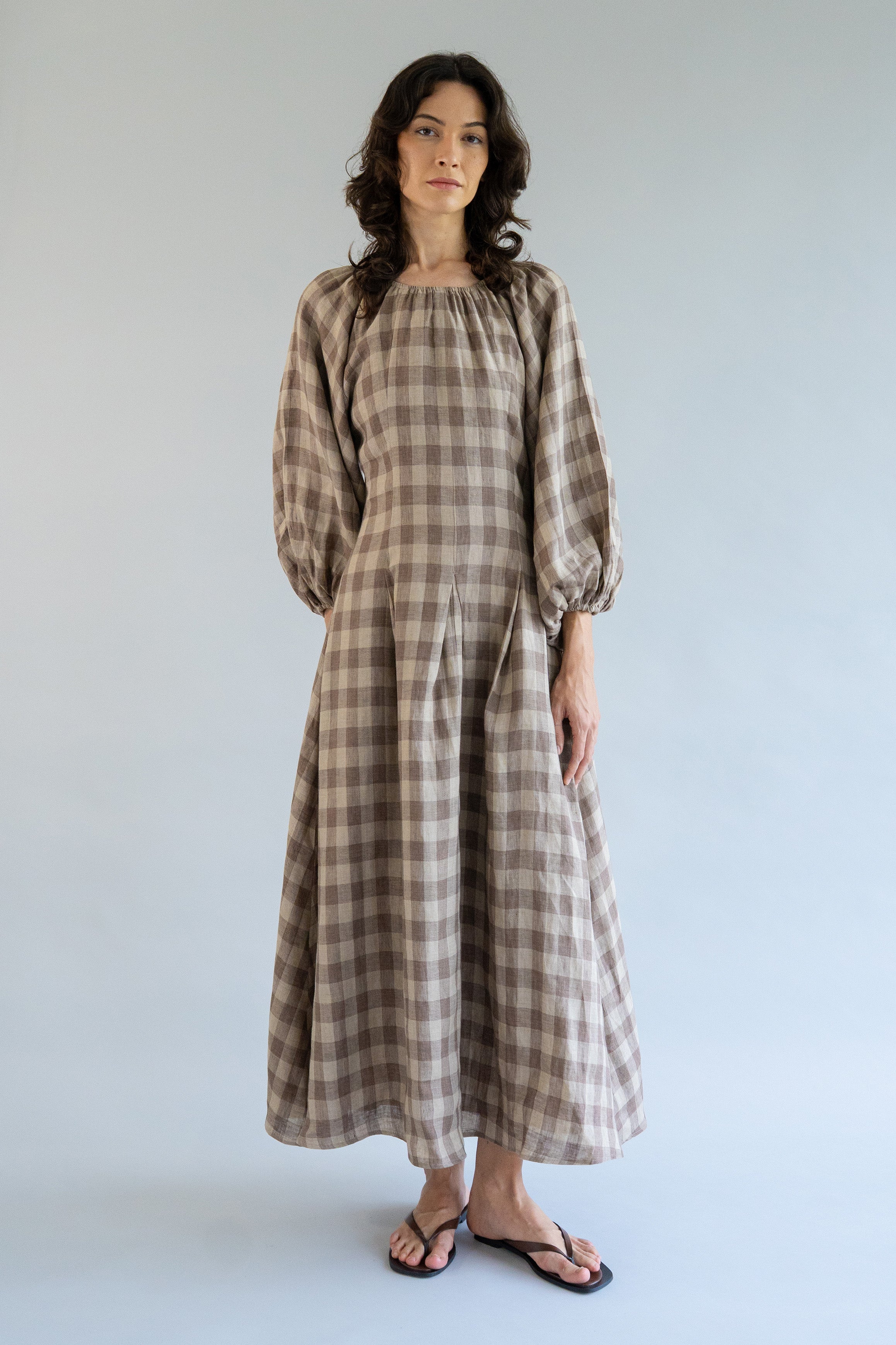 Fitted dress with structured box pleats, rendered in linen. Features a round neckline and bubble sleeves. Finished with side pockets. Fully lined in cotton.