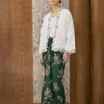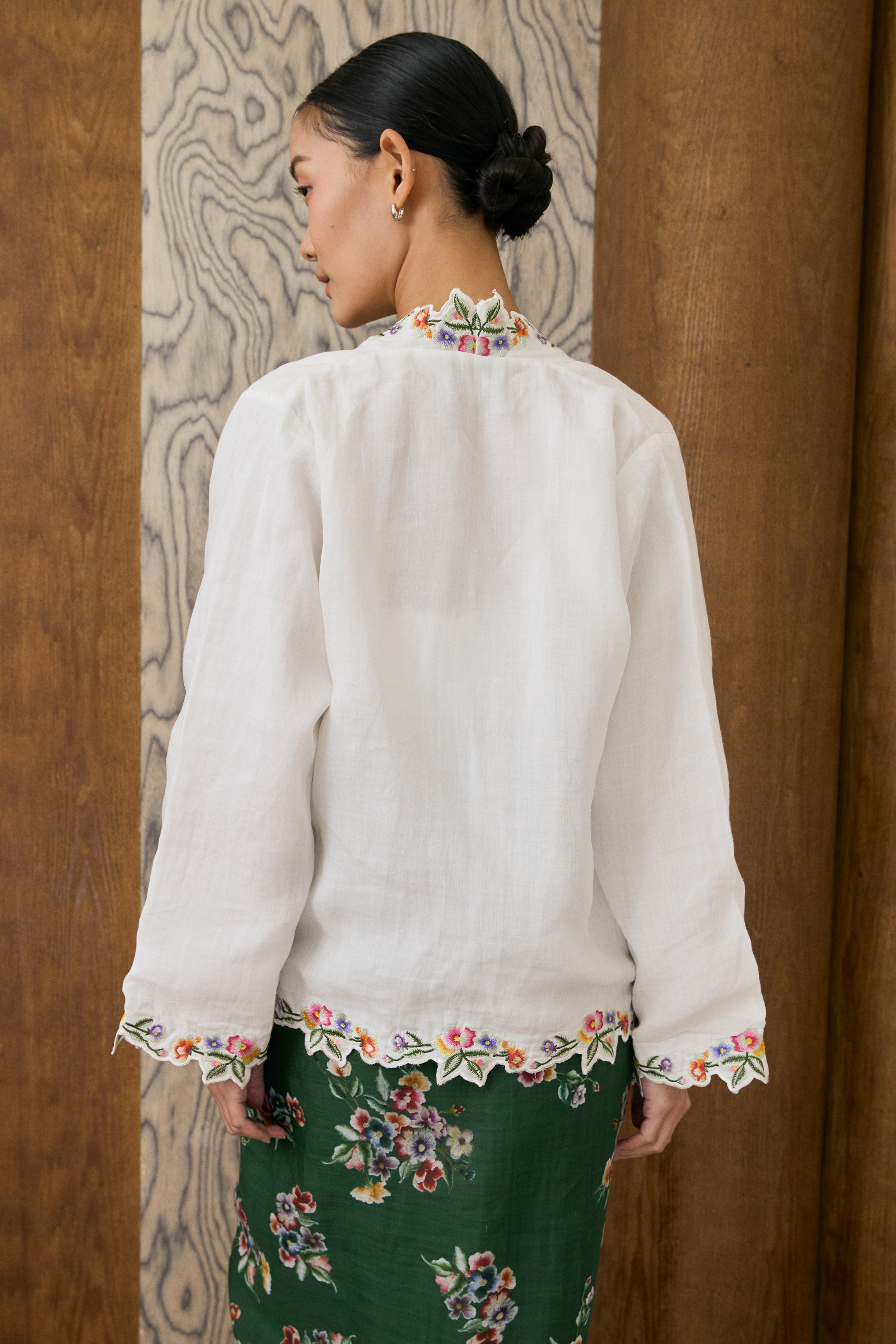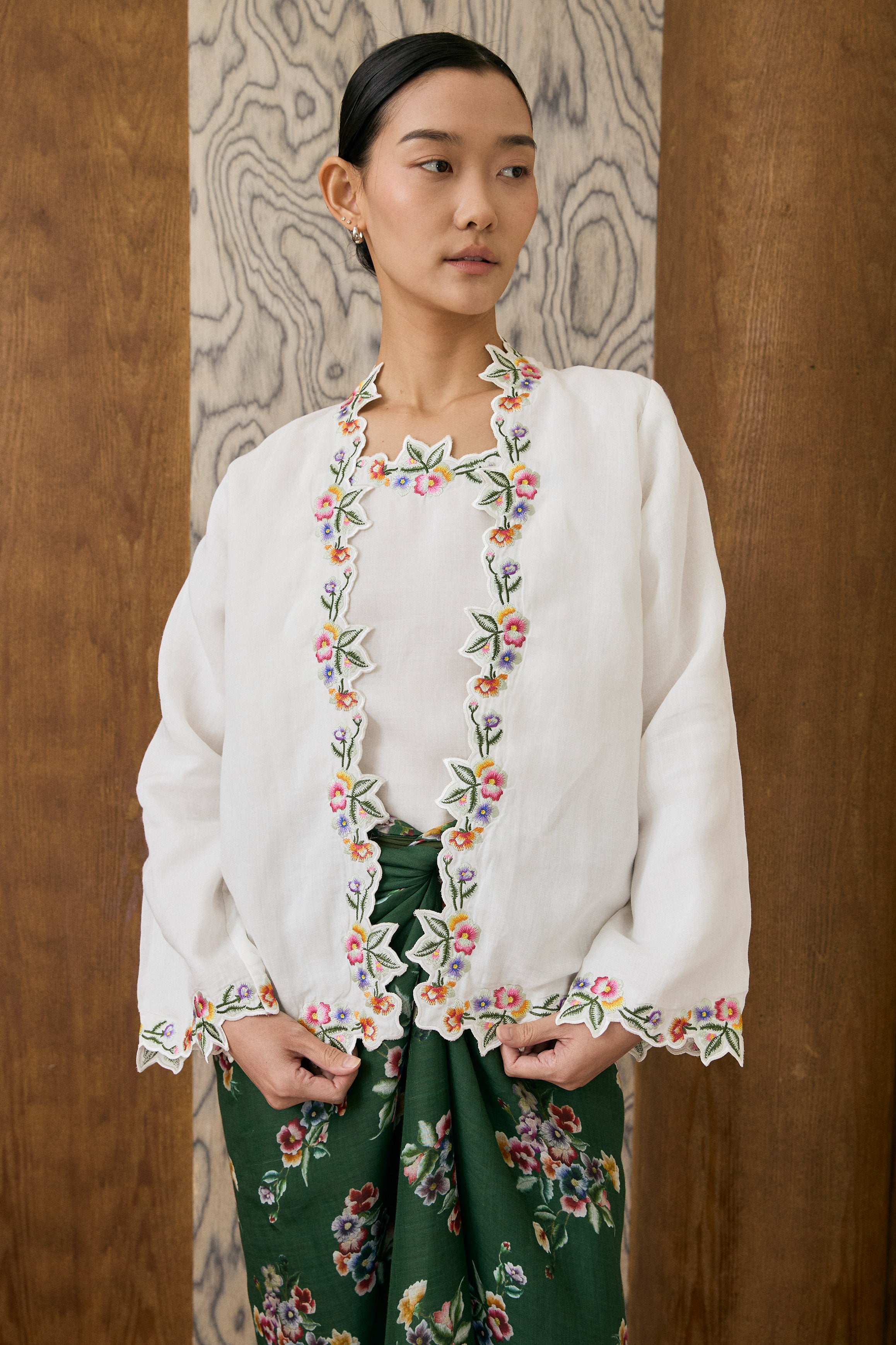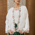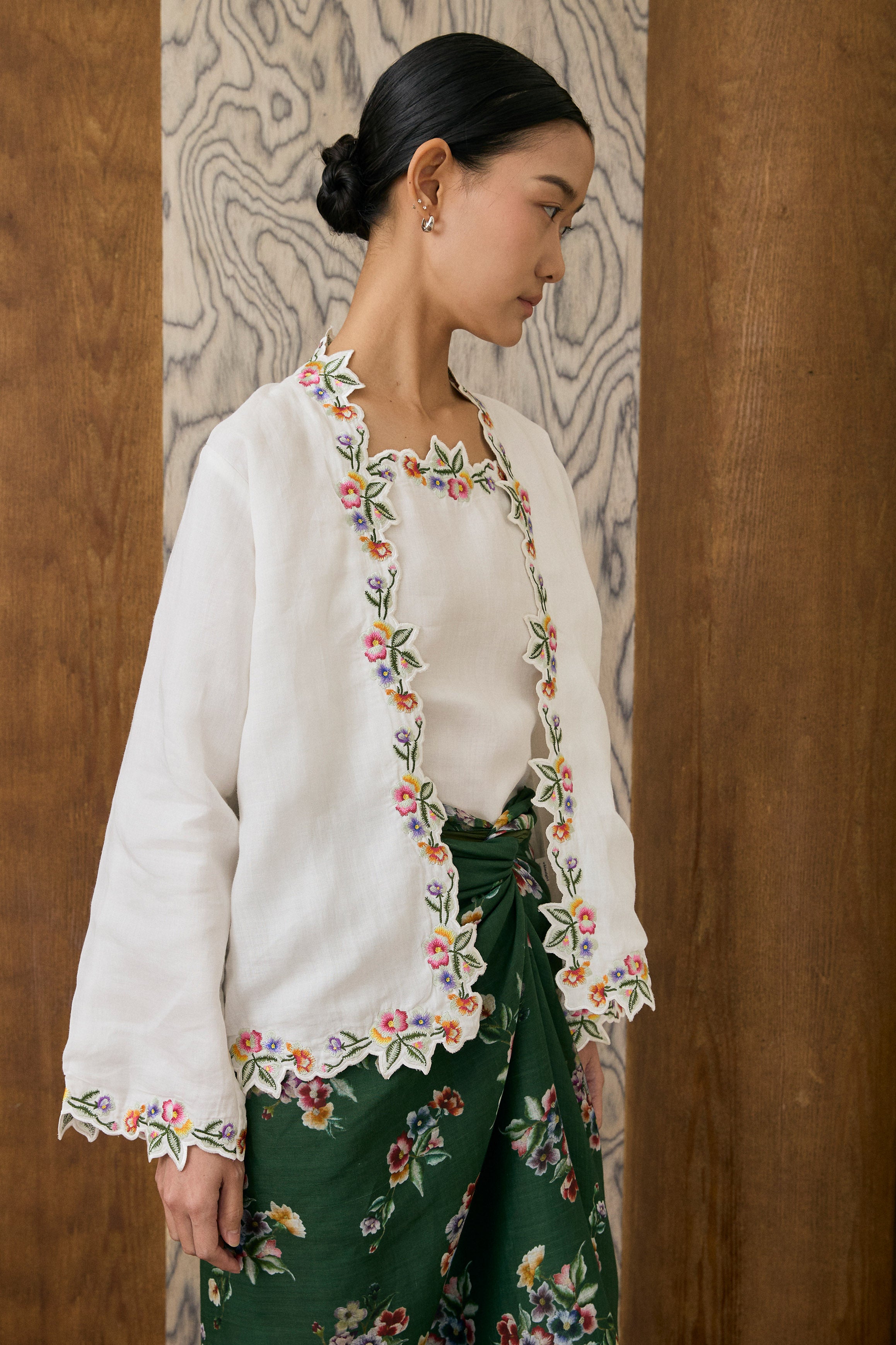 A two-piece Kebaya top, featuring intricate floral embroidery along the hem and sleeves. Designed with a separate camisole. Rendered in ramie, and fully lined with cotton.