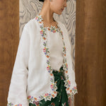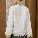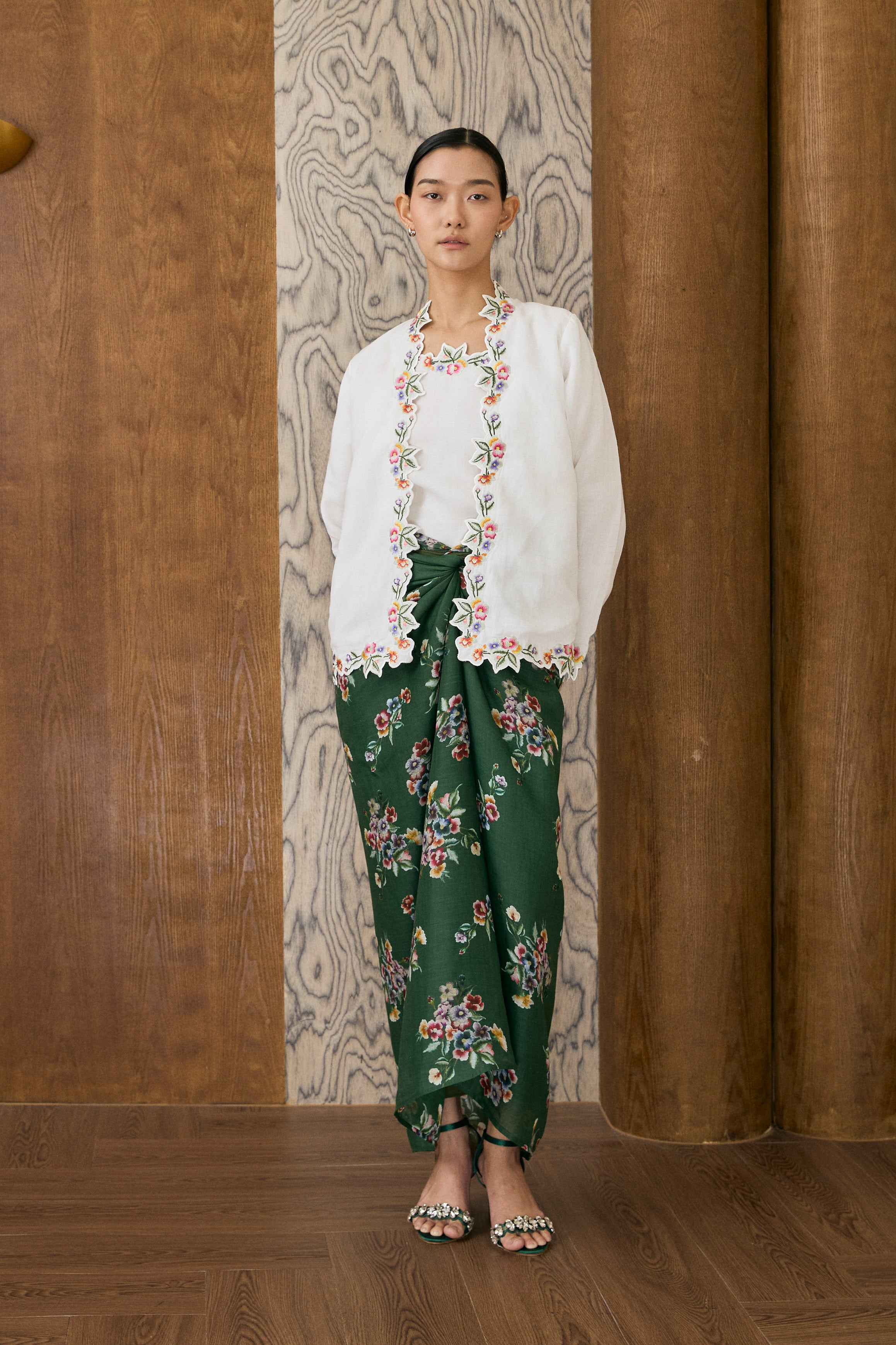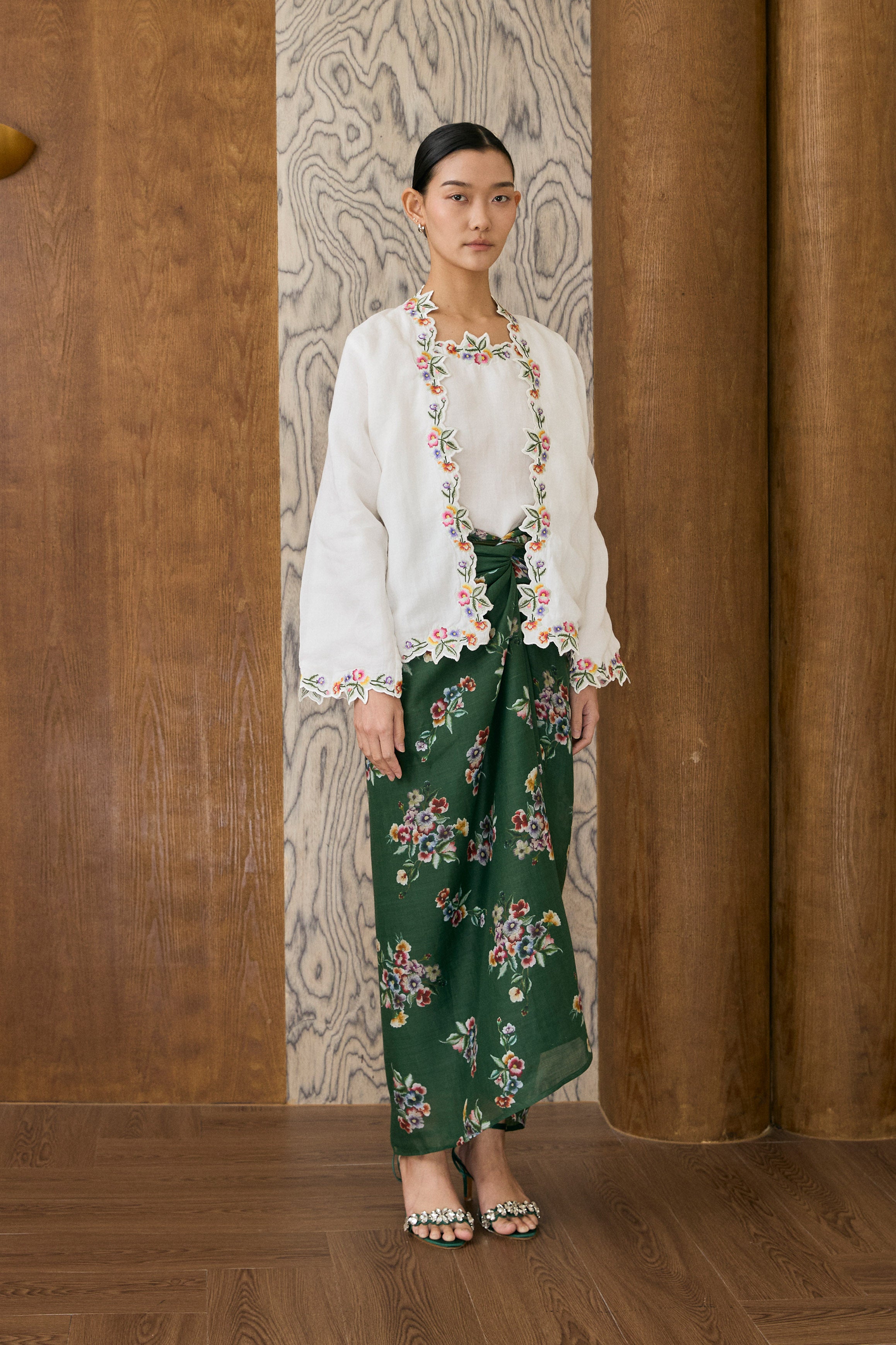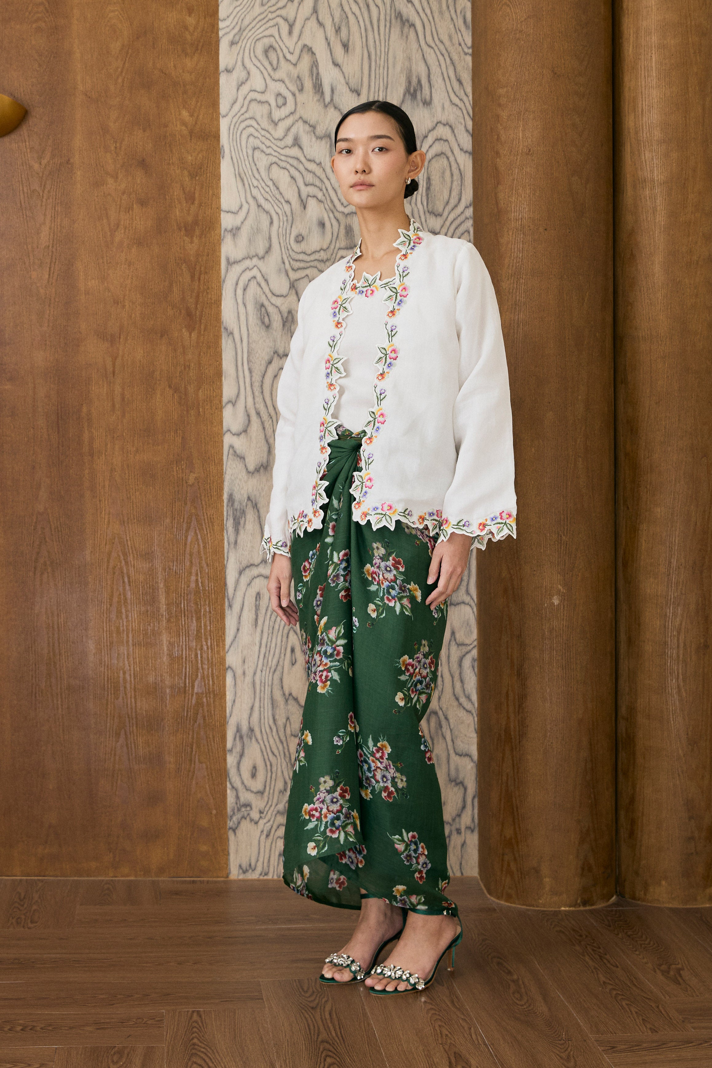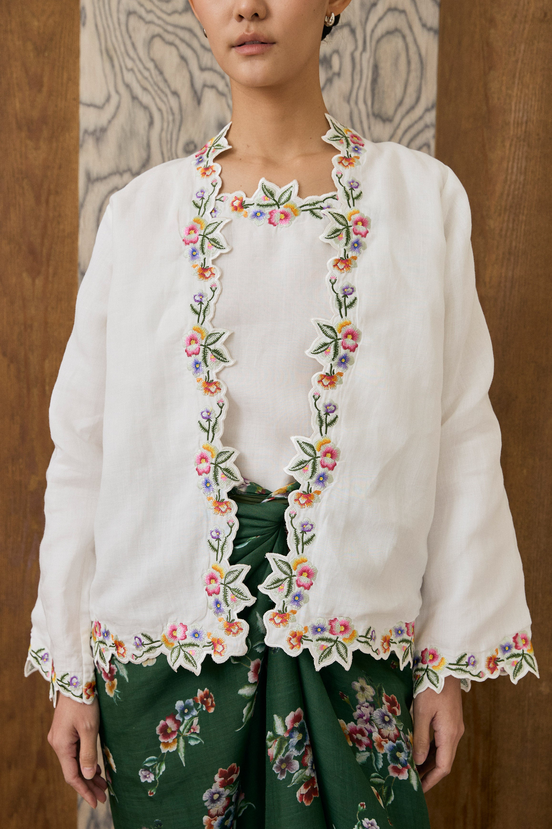 A two-piece Kebaya top, featuring intricate floral embroidery along the hem and sleeves. Designed with a separate camisole. Rendered in ramie, and fully lined with cotton.