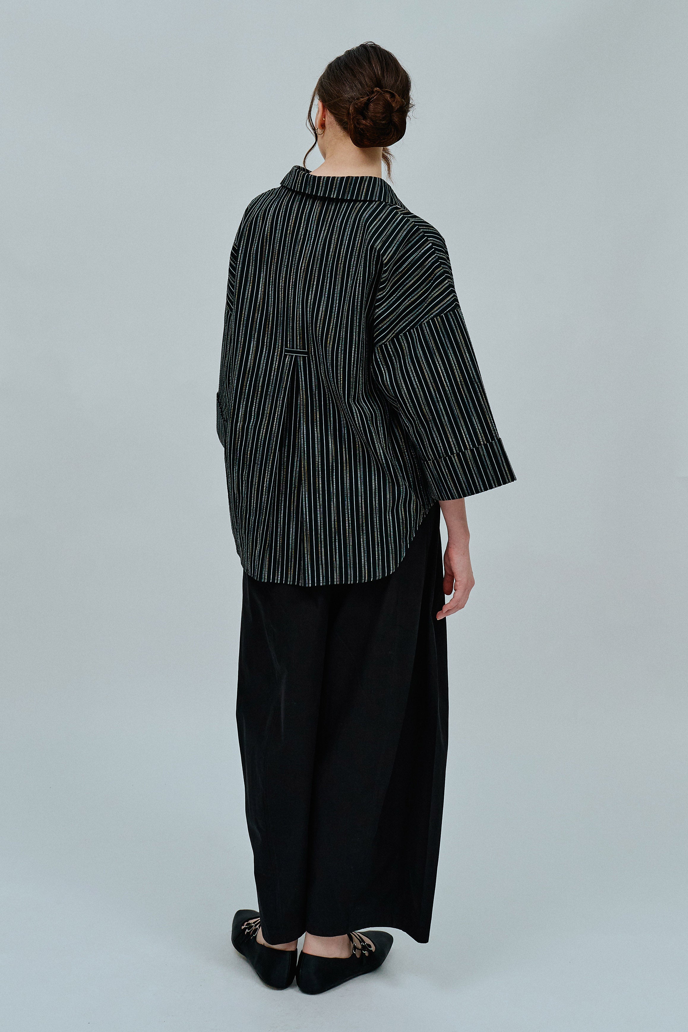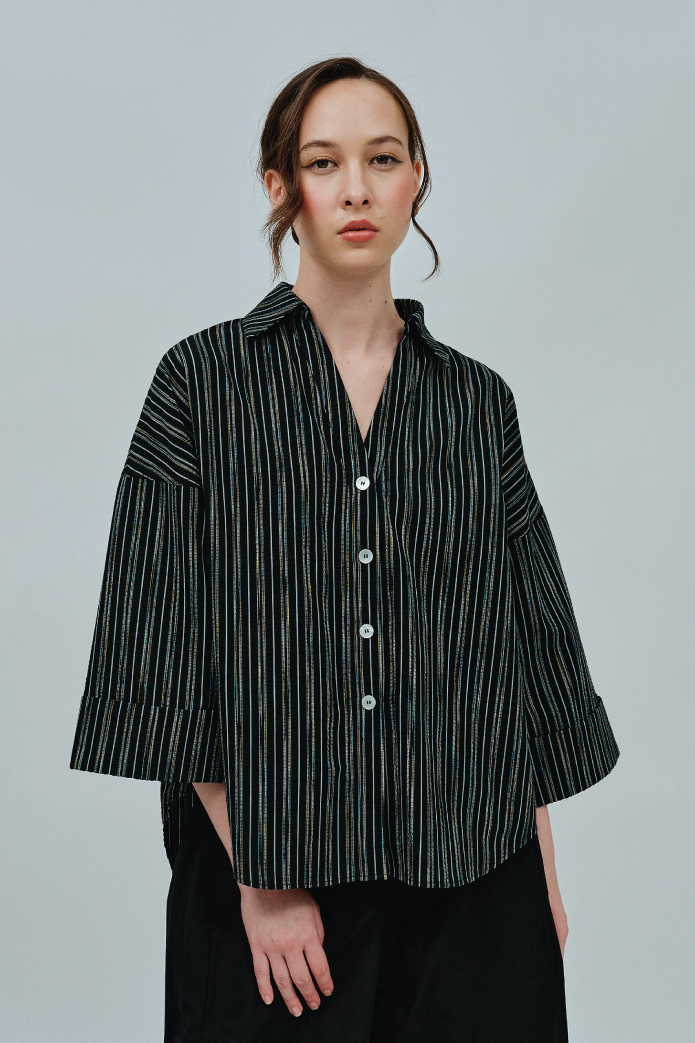 An oversized fit with an open V-neck and pointed collar, complemented by drop shoulders for an easygoing silhouette. Rendered in textured cotton poplin.
