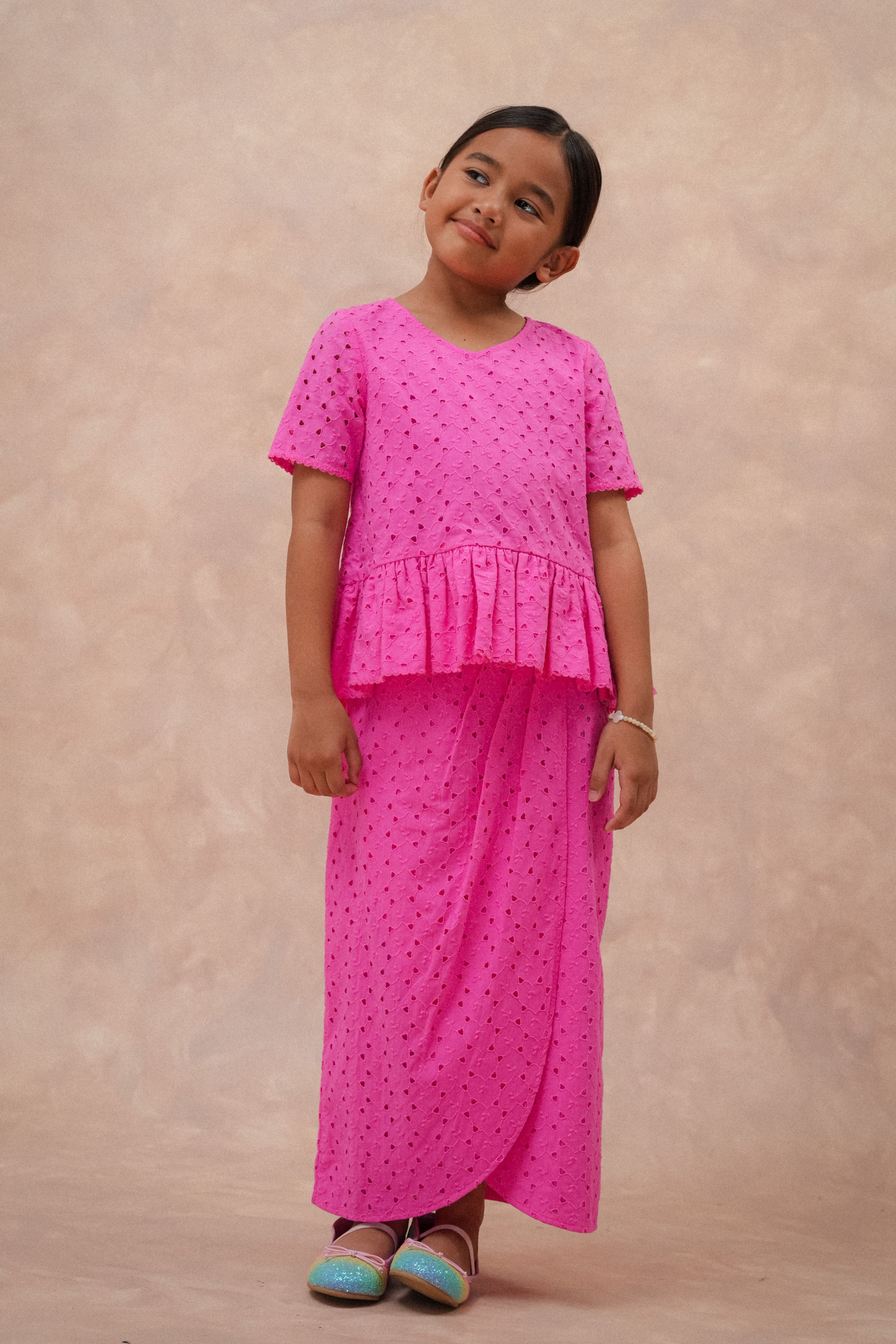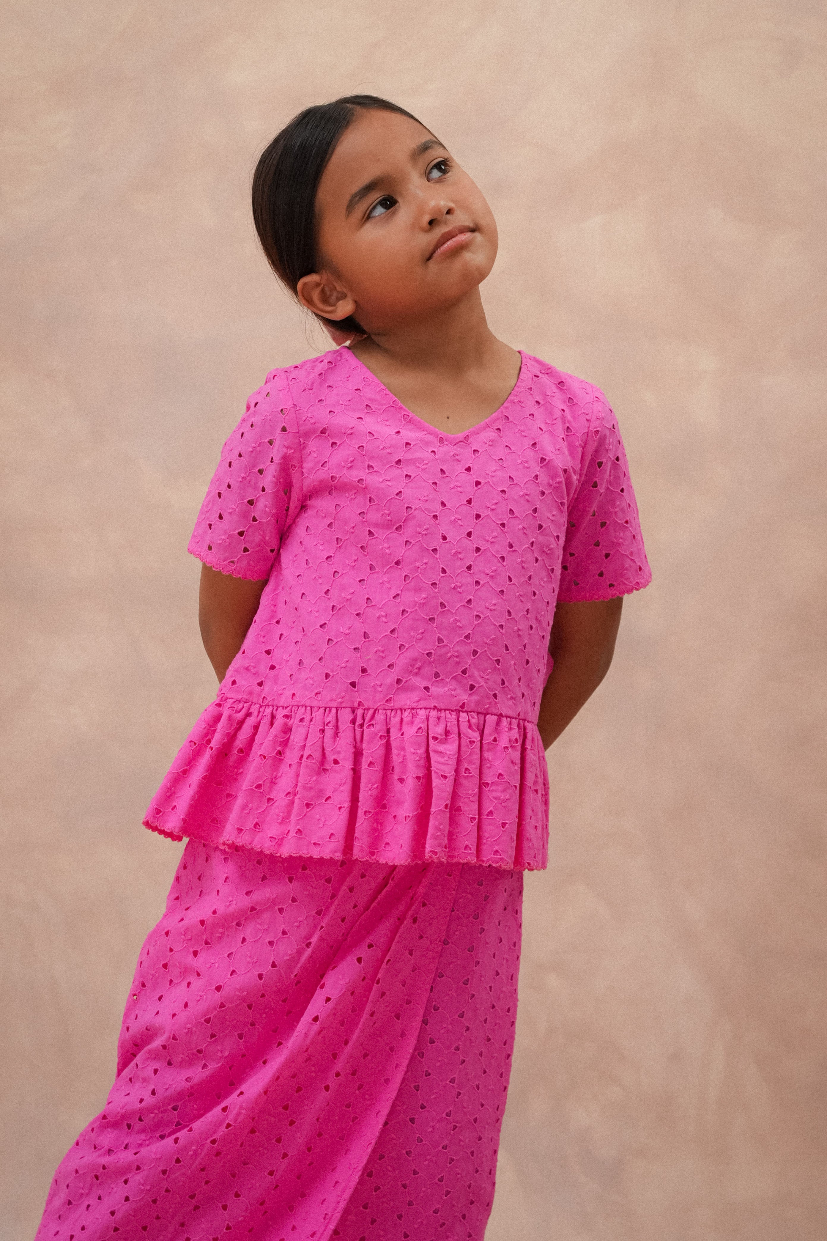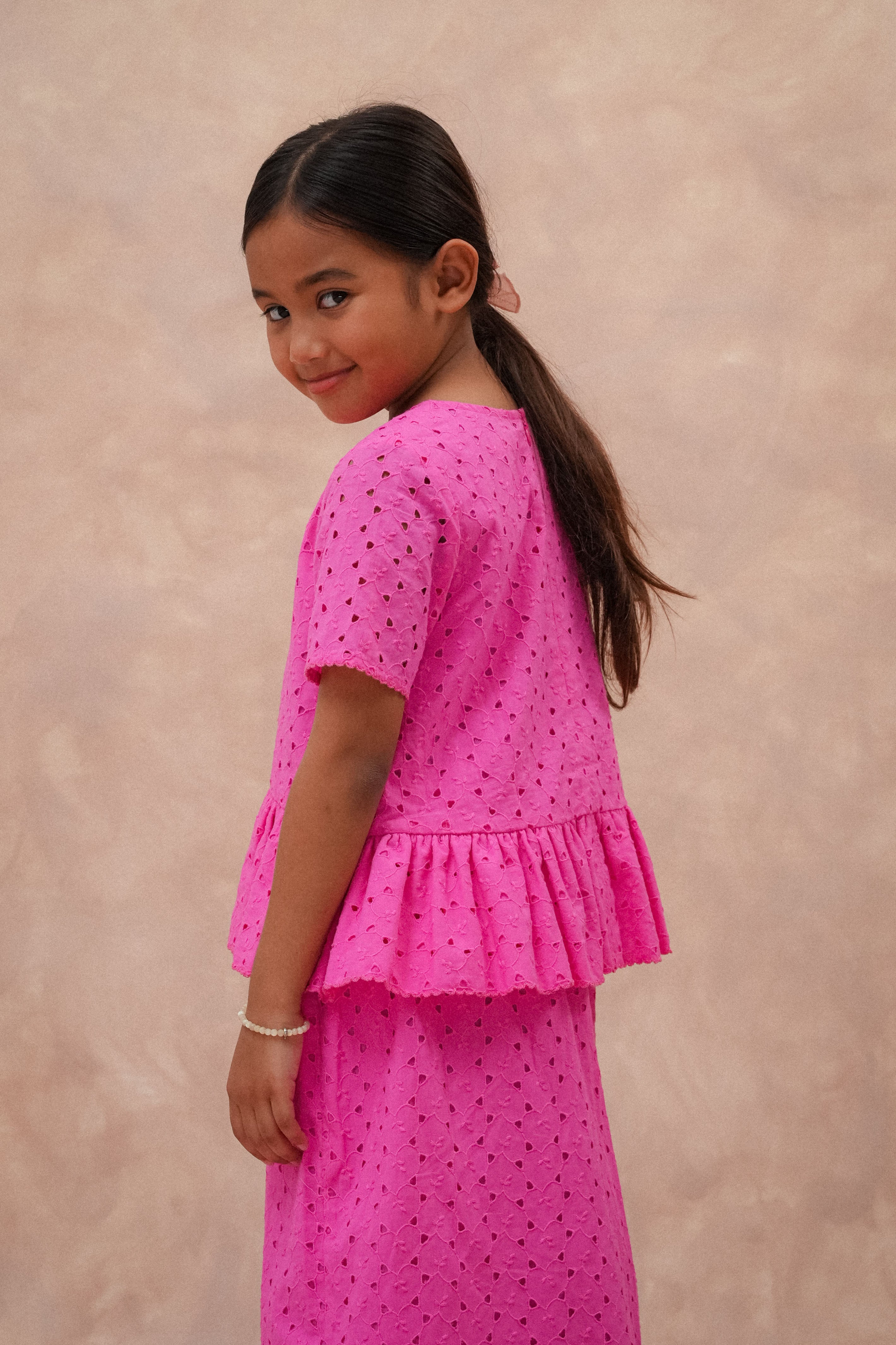 A minimalist moment for the Mini one, made from 100% cotton with textured patterns. The blouse features a flounce at the hem, and zip opening in the back. Includes a matching tulip skirt with half elastic waistband, for easy slip on.