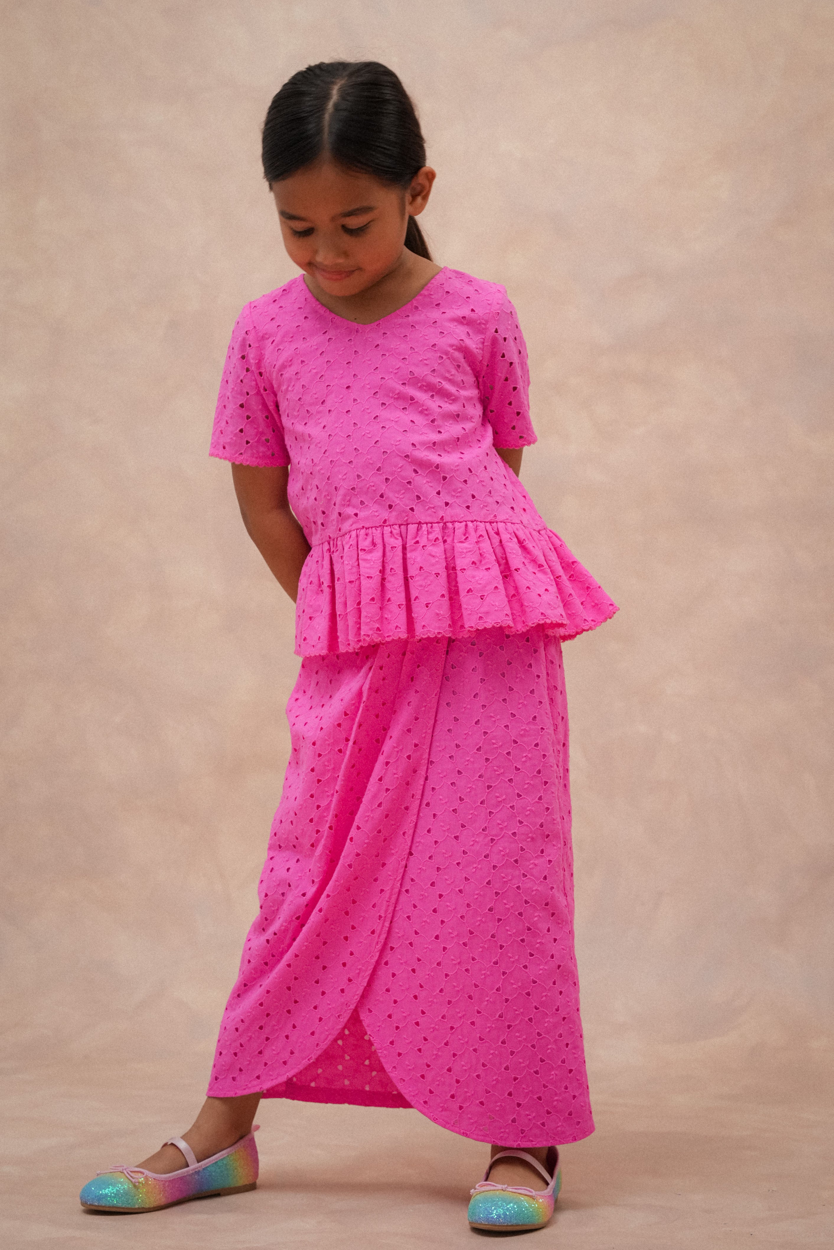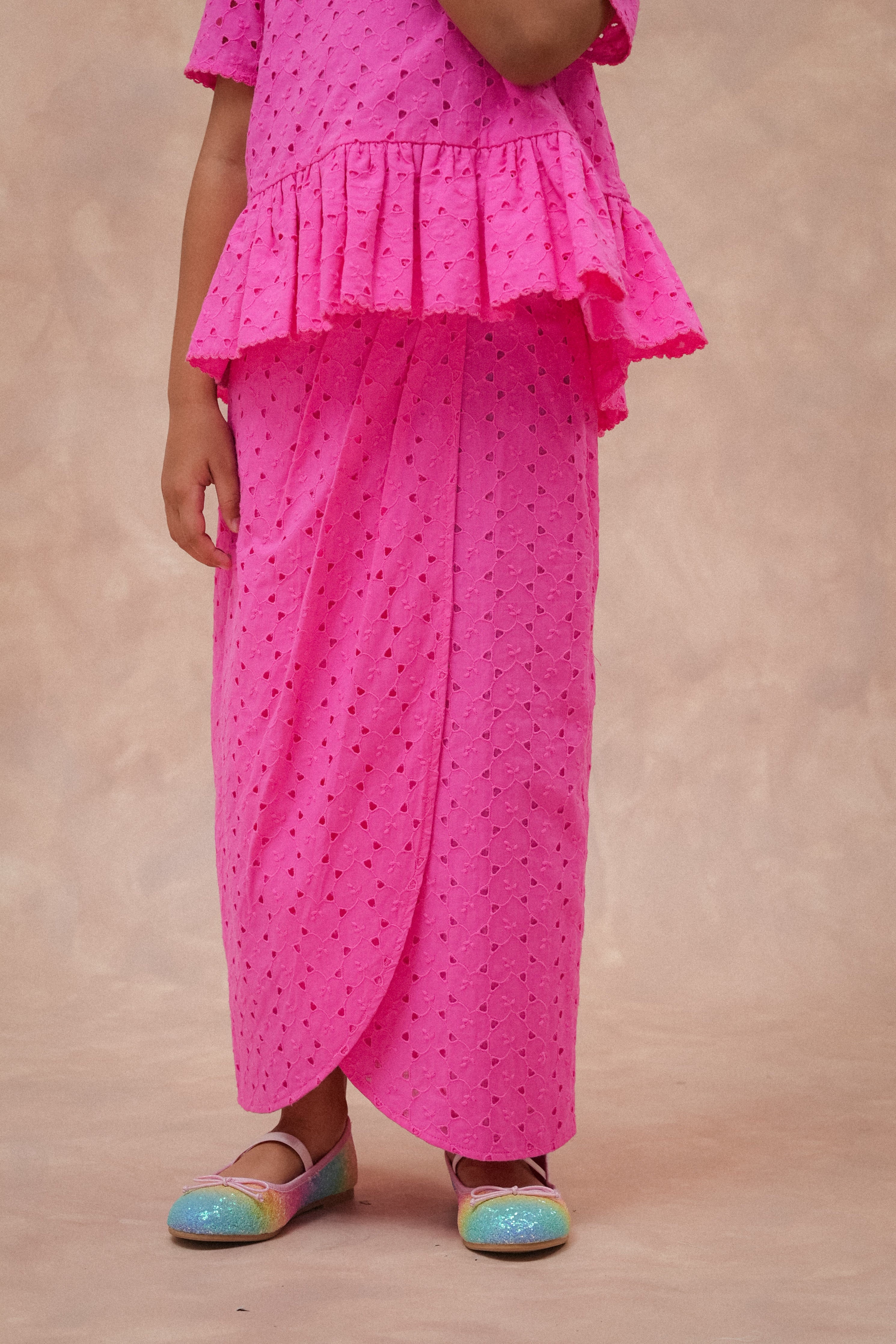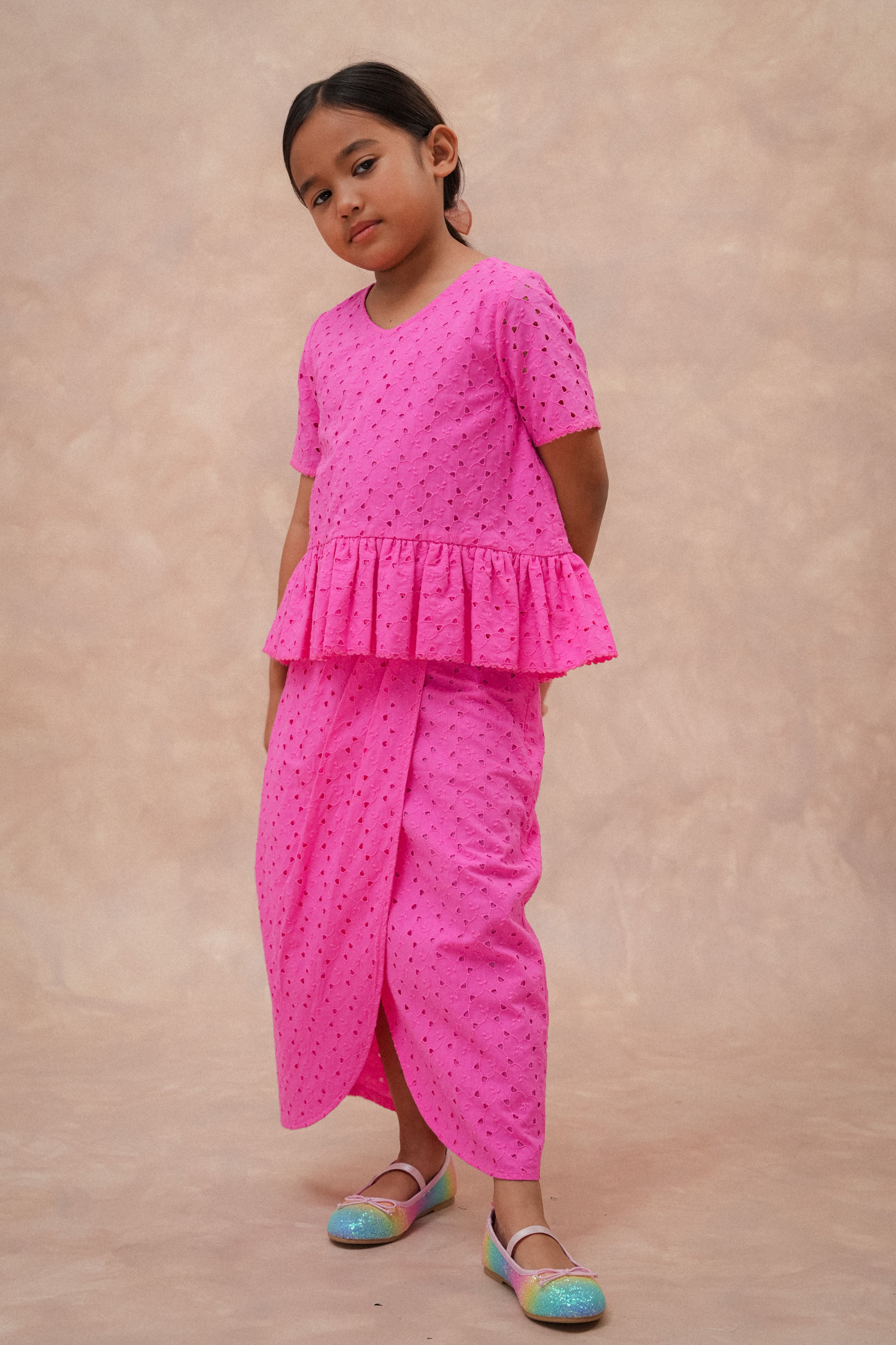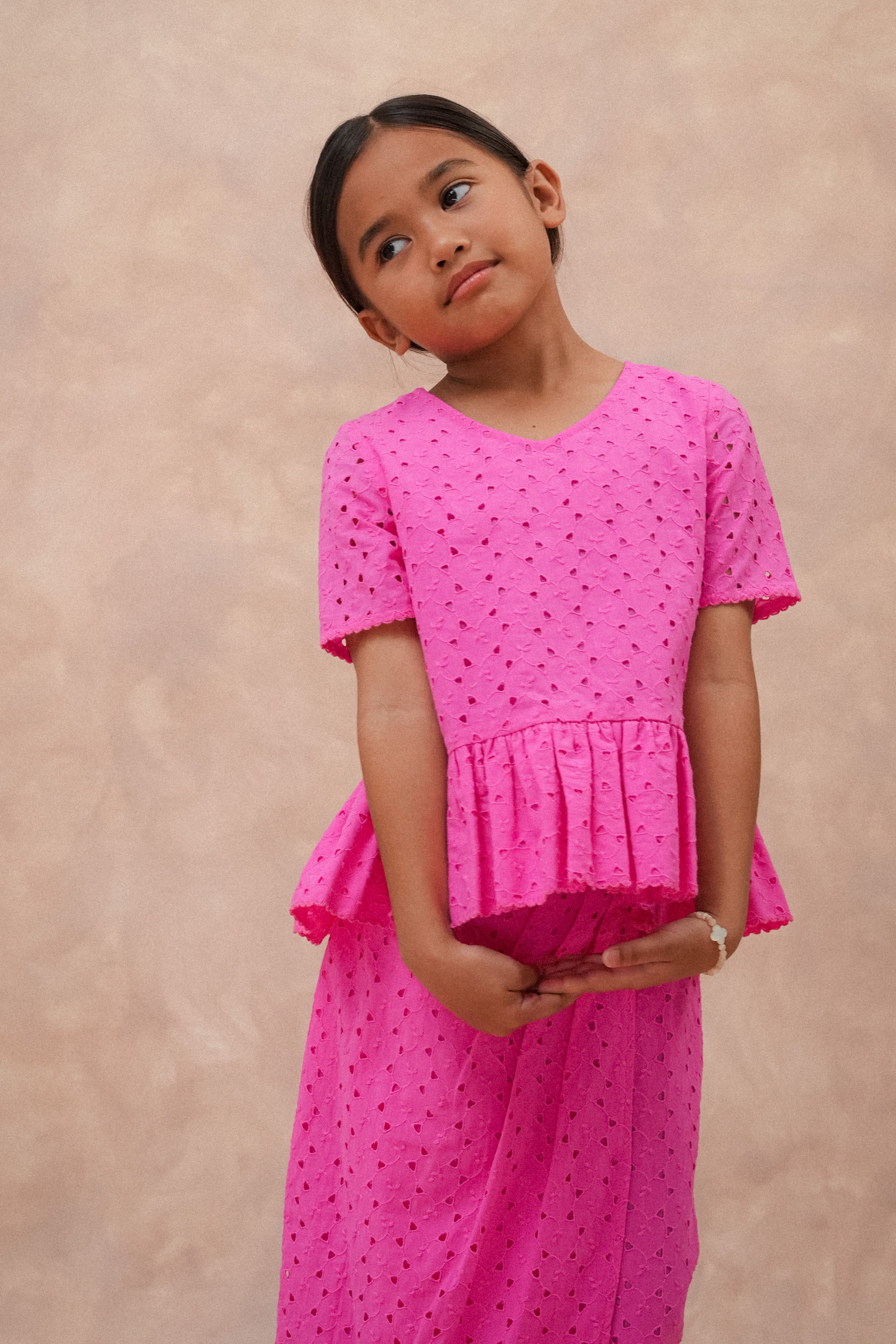A minimalist moment for the Mini one, made from 100% cotton with textured patterns. The blouse features a flounce at the hem, and zip opening in the back. Includes a matching tulip skirt with half elastic waistband, for easy slip on.