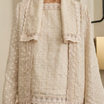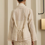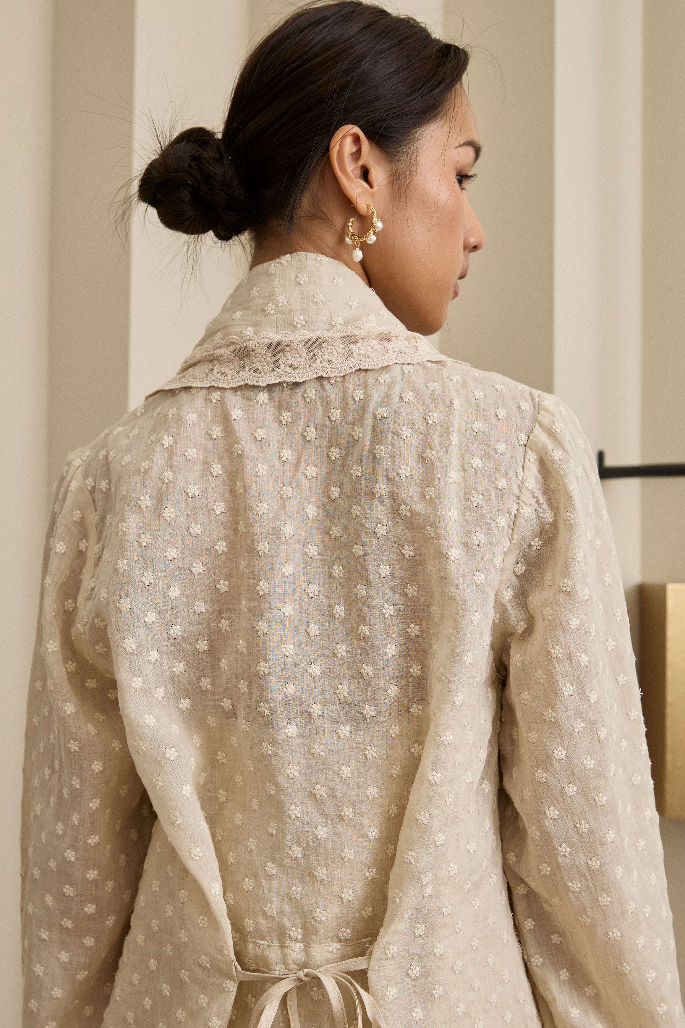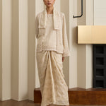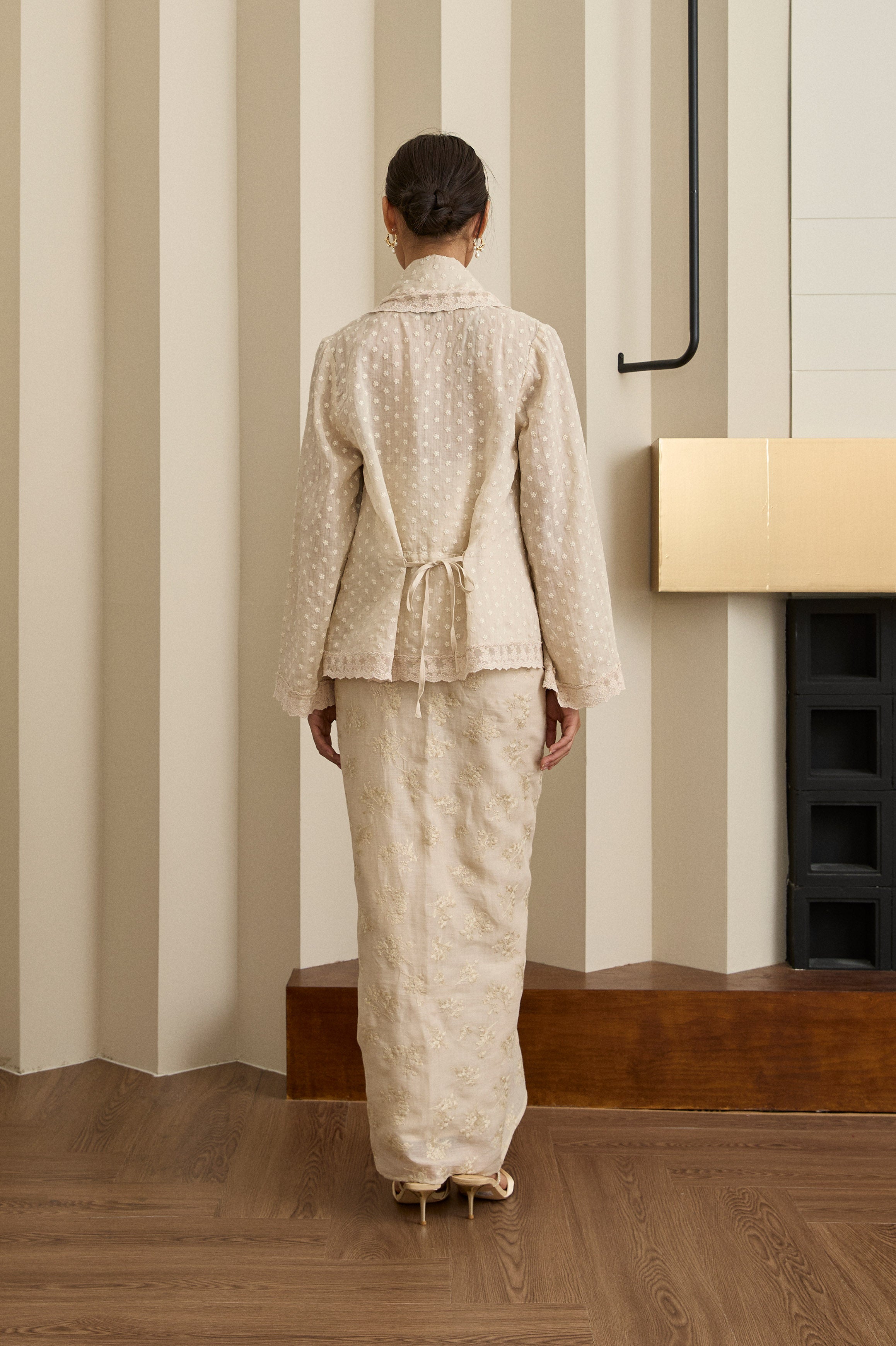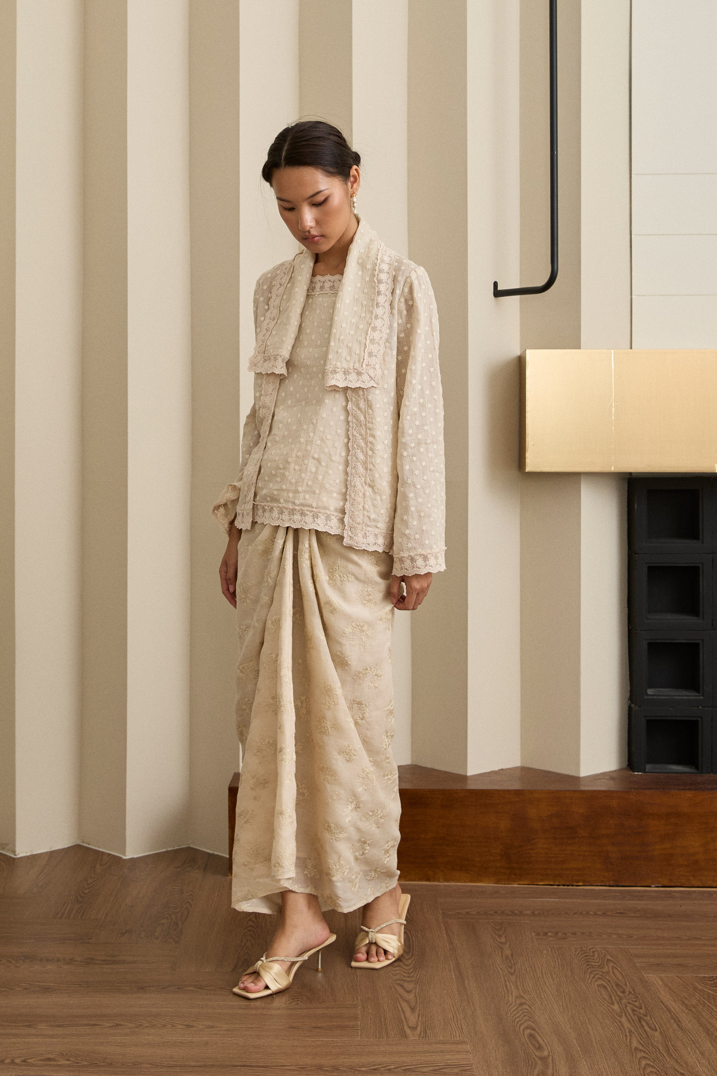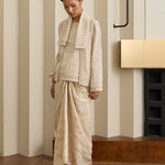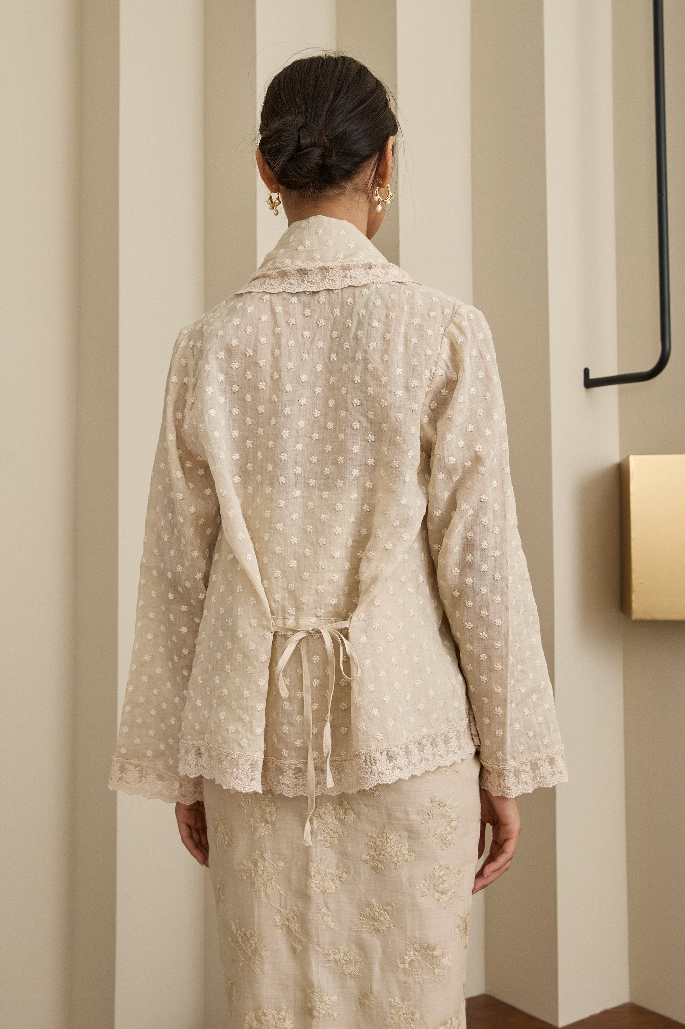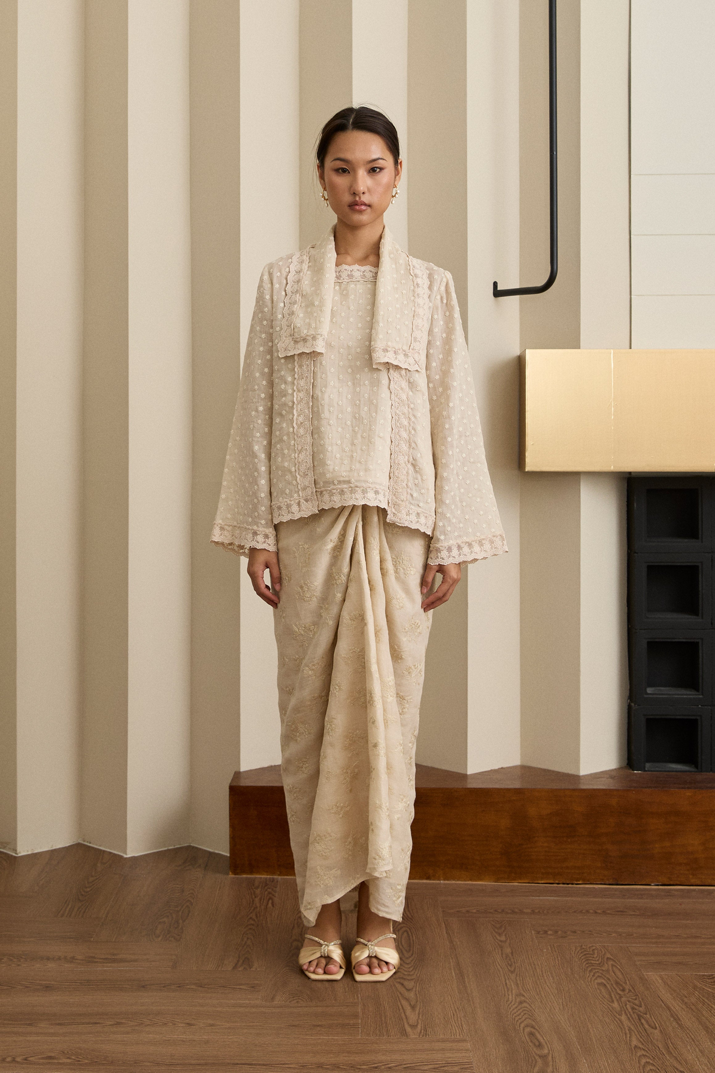 An iteration of the two-piece Kebaya. Rendered in embroidered ramie, featuring a structured flap lapel and full sleeves. Designed with a separate camisole, fully lined with cotton.