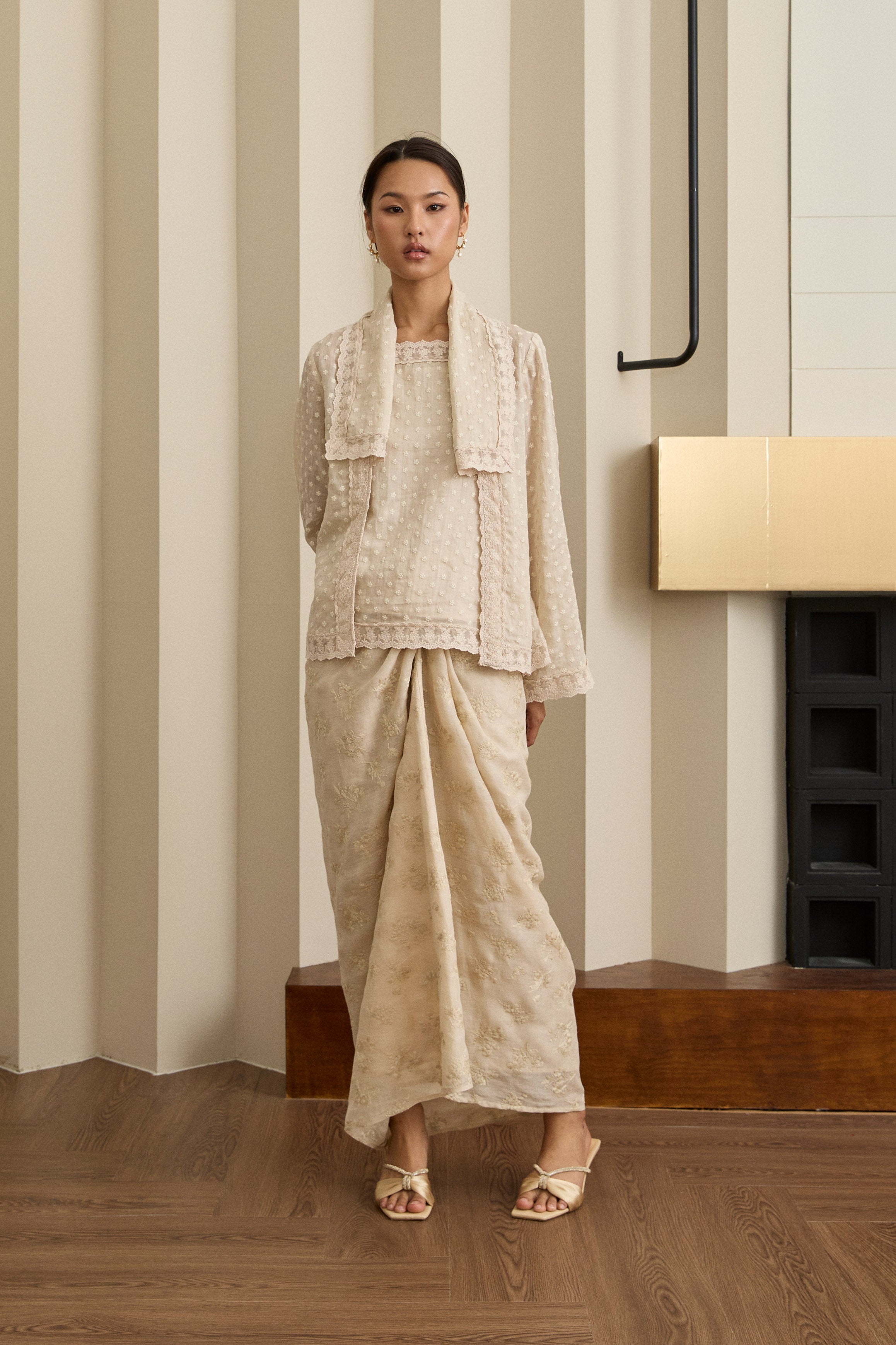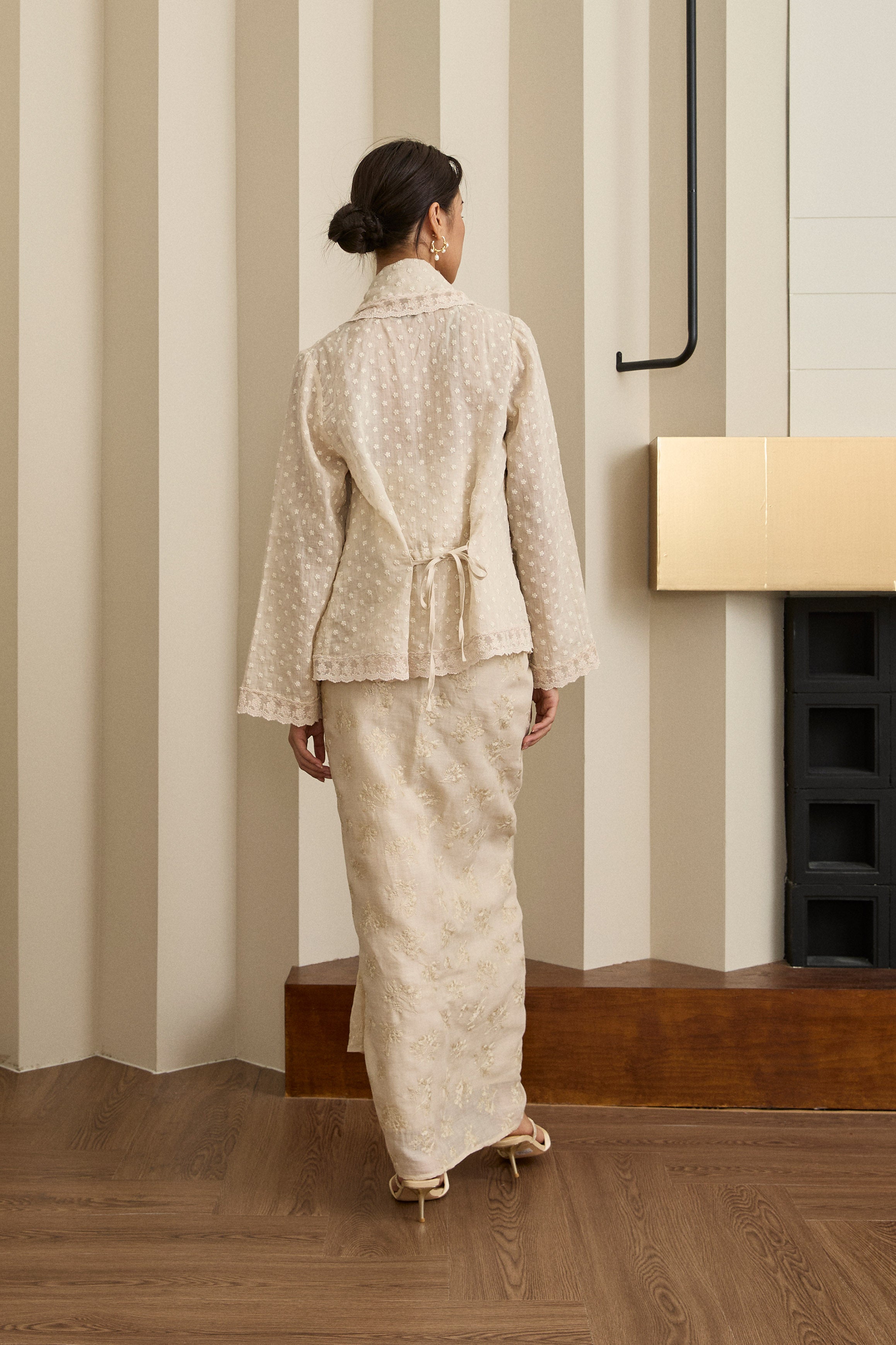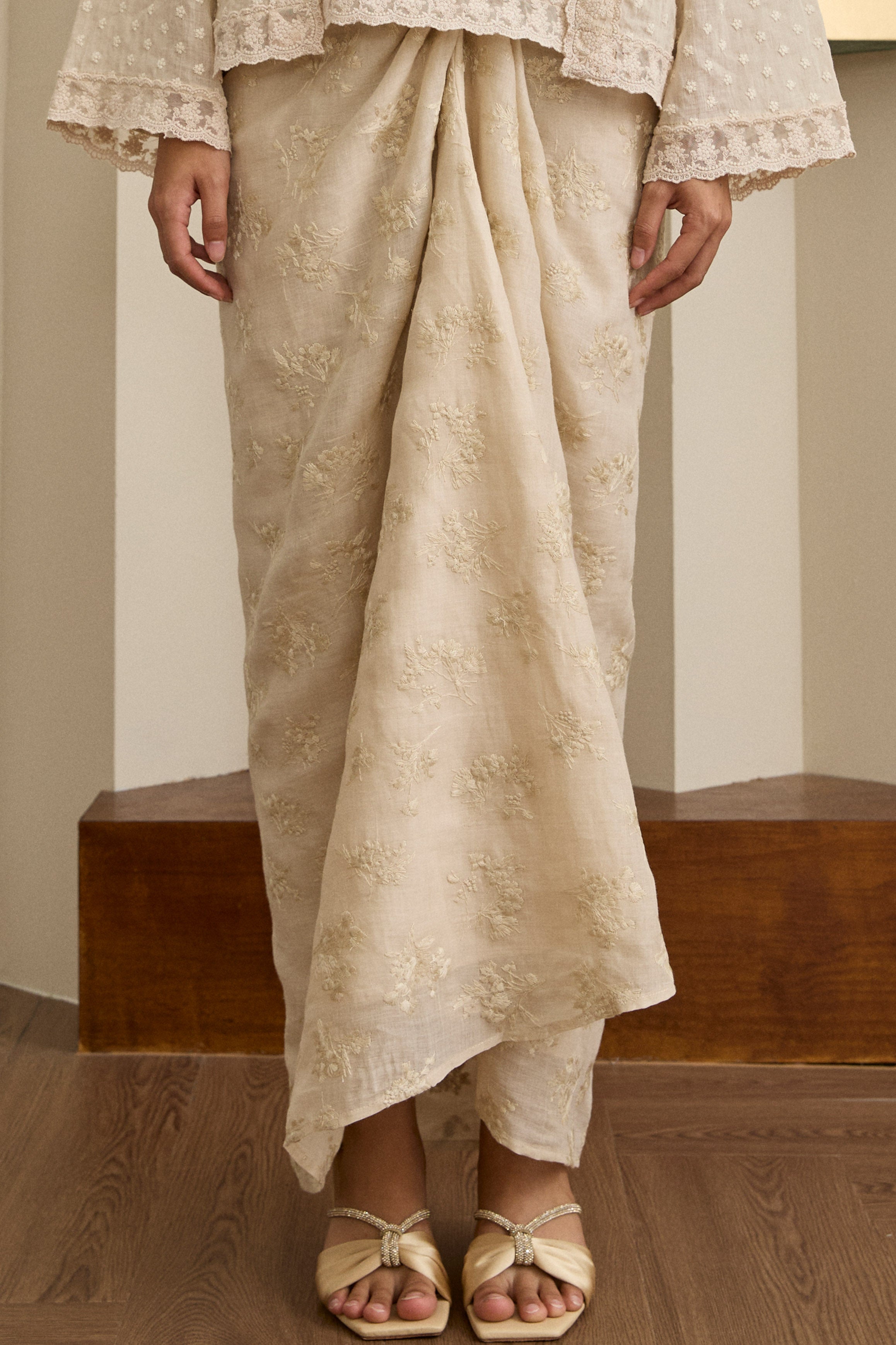 A true staple, this is a slip-on knot skirt that can be secured with a double knot. Finished with delicate trim detailing. Rendered in ramie, fully lined with cotton.
