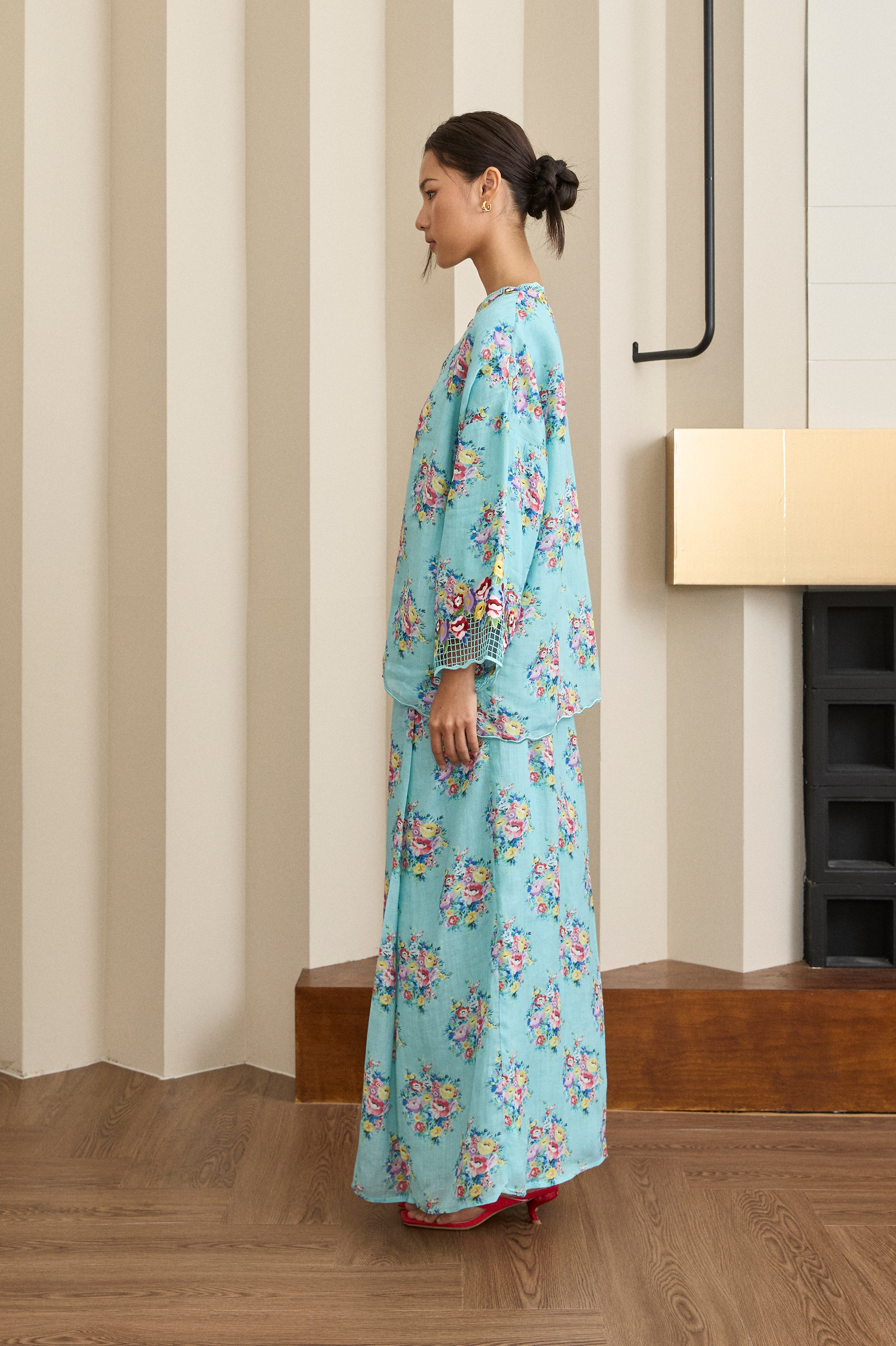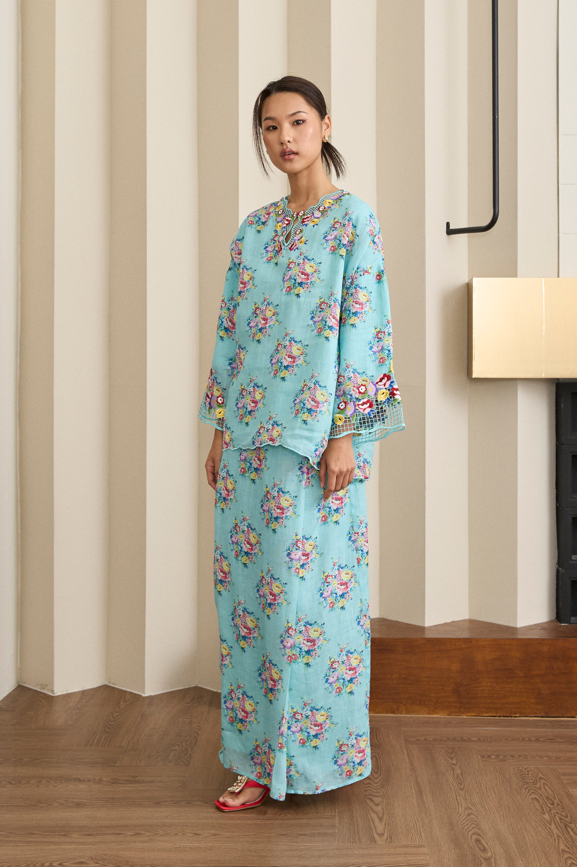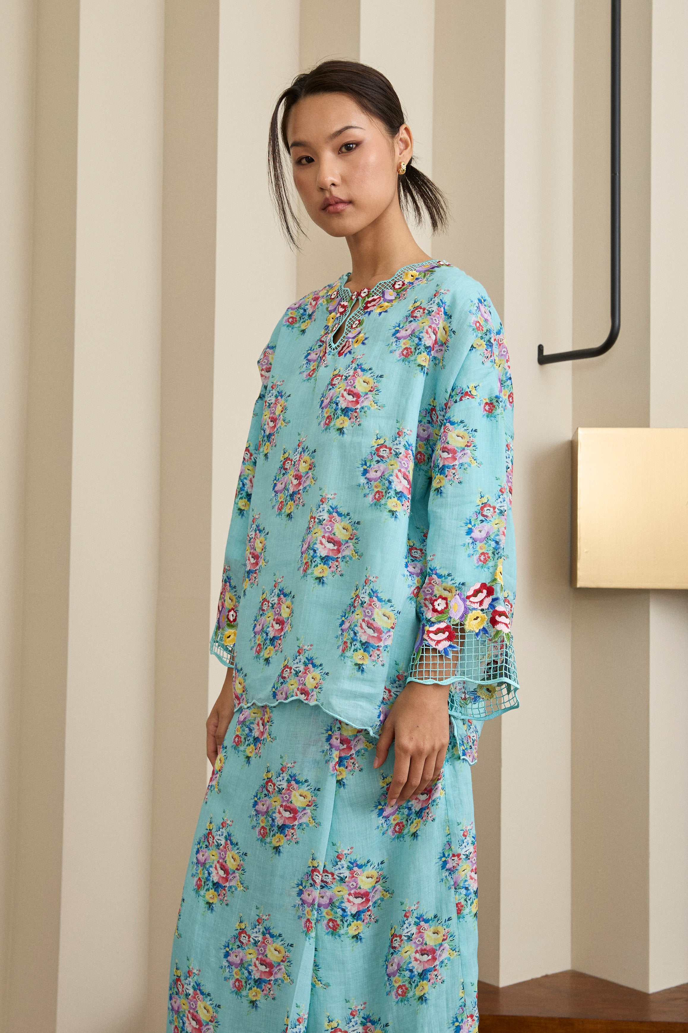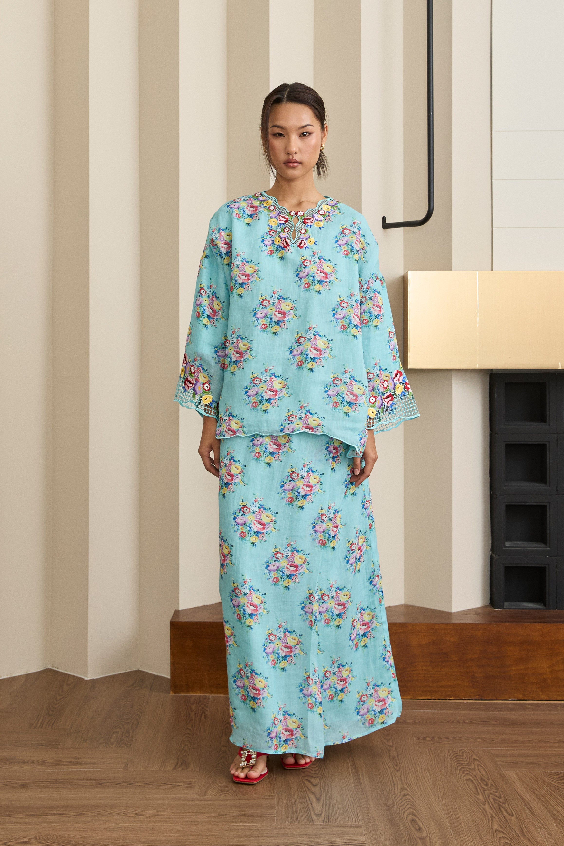 A Kedah top with an oversized, loose silhouette and drop shoulders, finished with full sleeves and ‘sulam goyang’ embroidery along the neckline and sleeves. Paired with a straight-cut skirt featuring fold detailing at the waistline. Rendered in ramie, lined in cotton.