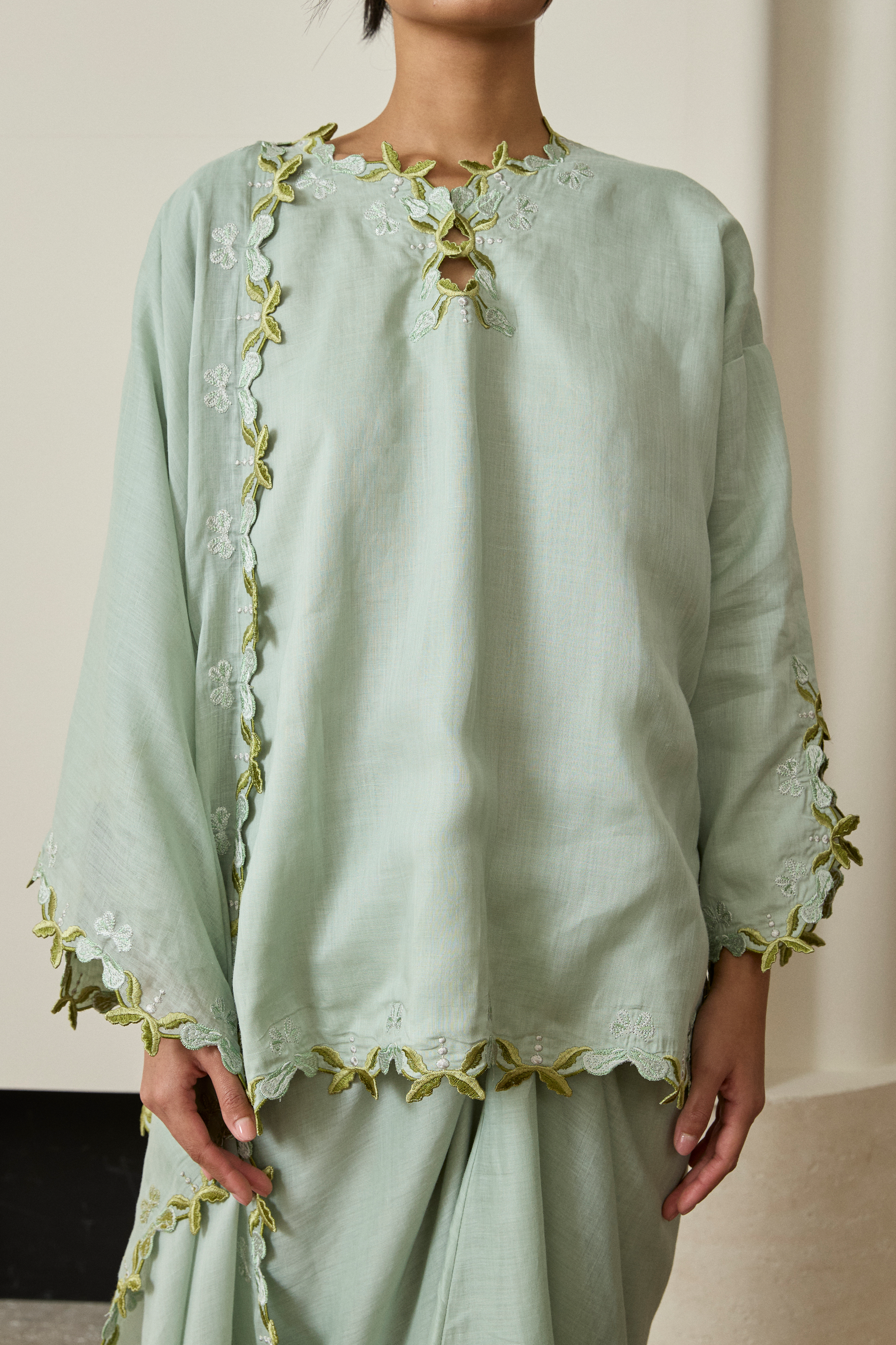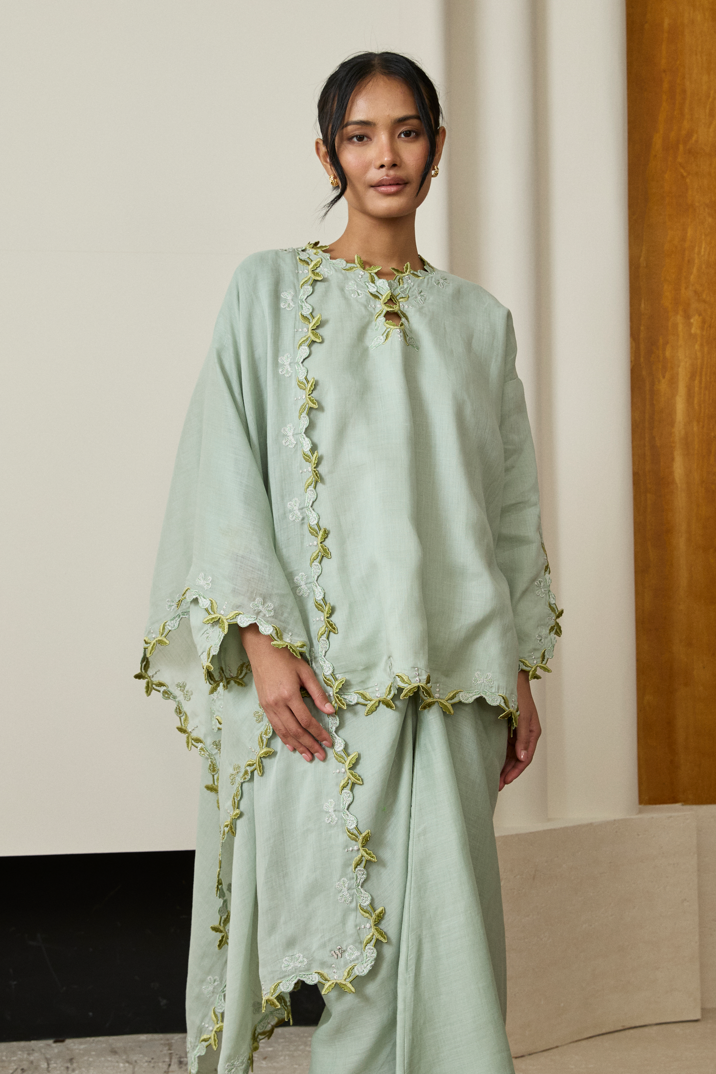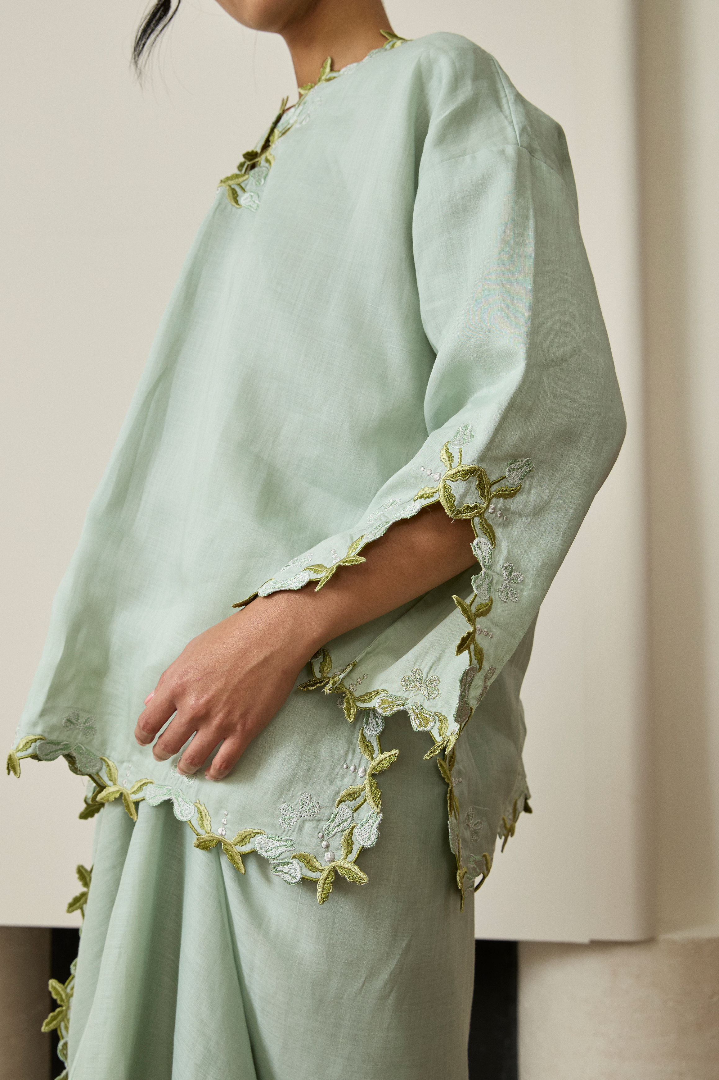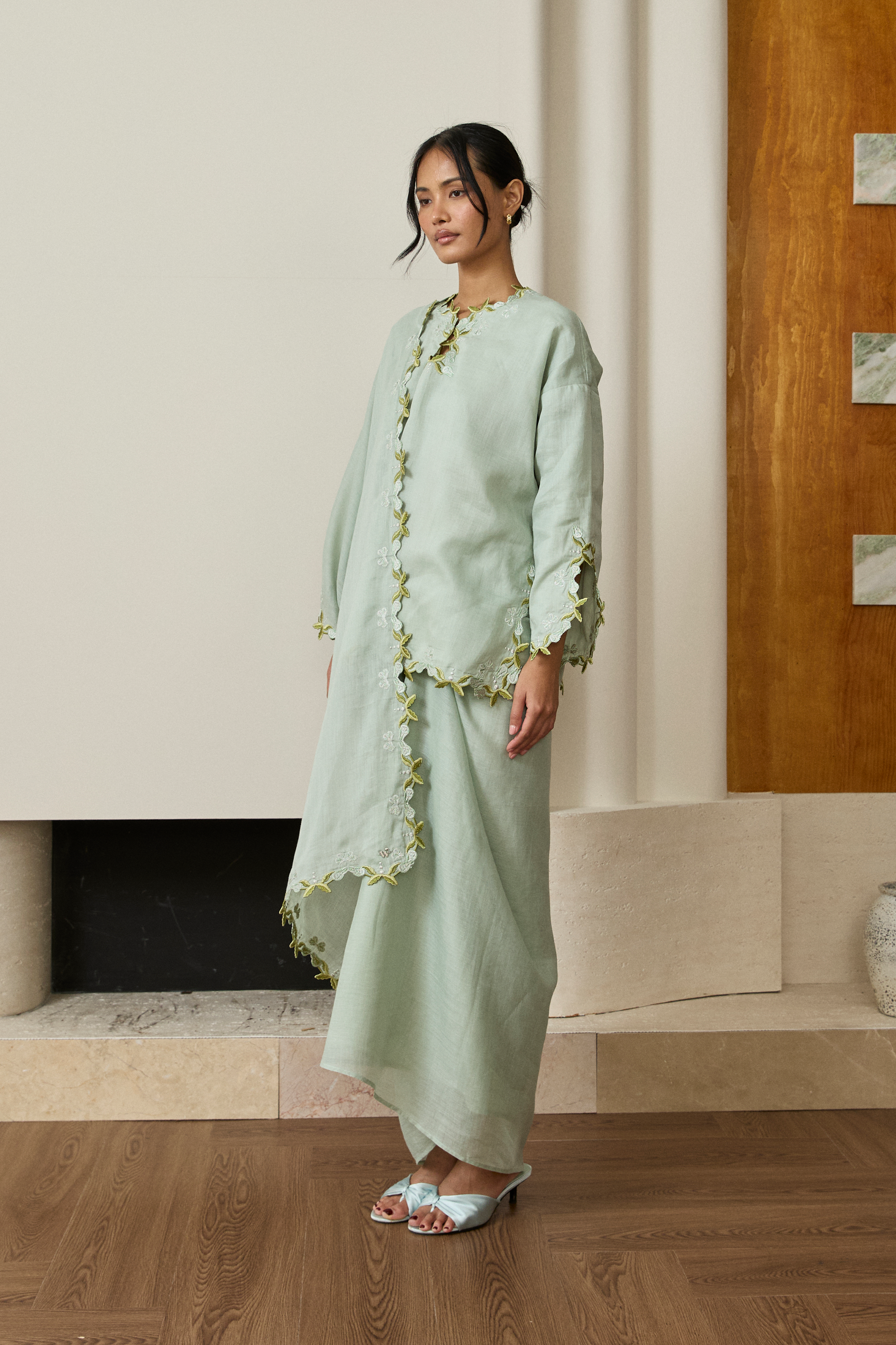 An iteration of the classic Kedah fit, rendered in ramie and lined with cotton. The set includes a top with intricate multi-tone floral embroidery. Finished with tulip-cut sleeves, side slits and a front button closure. Finished with a matching, slip-on knot skirt.