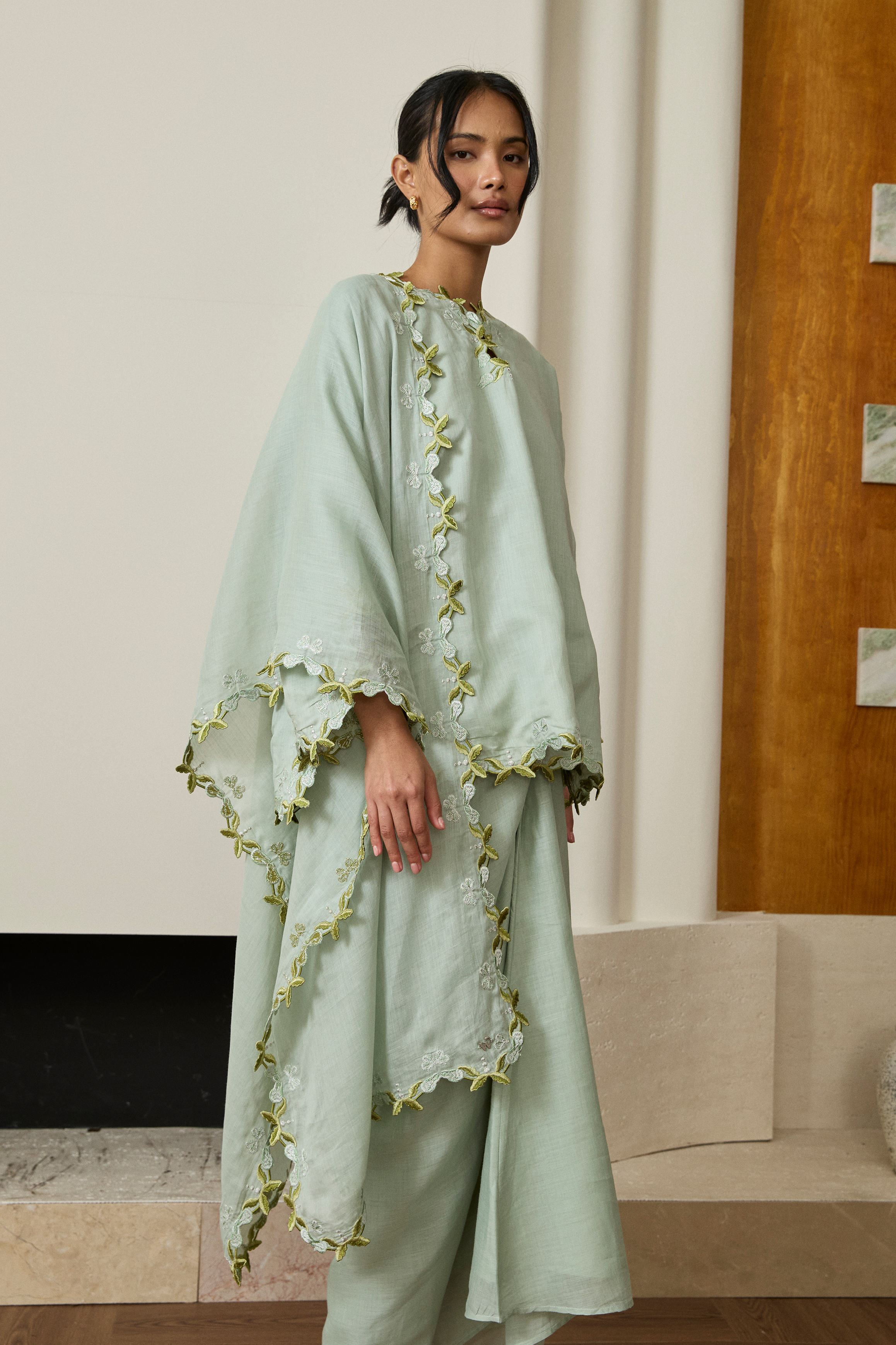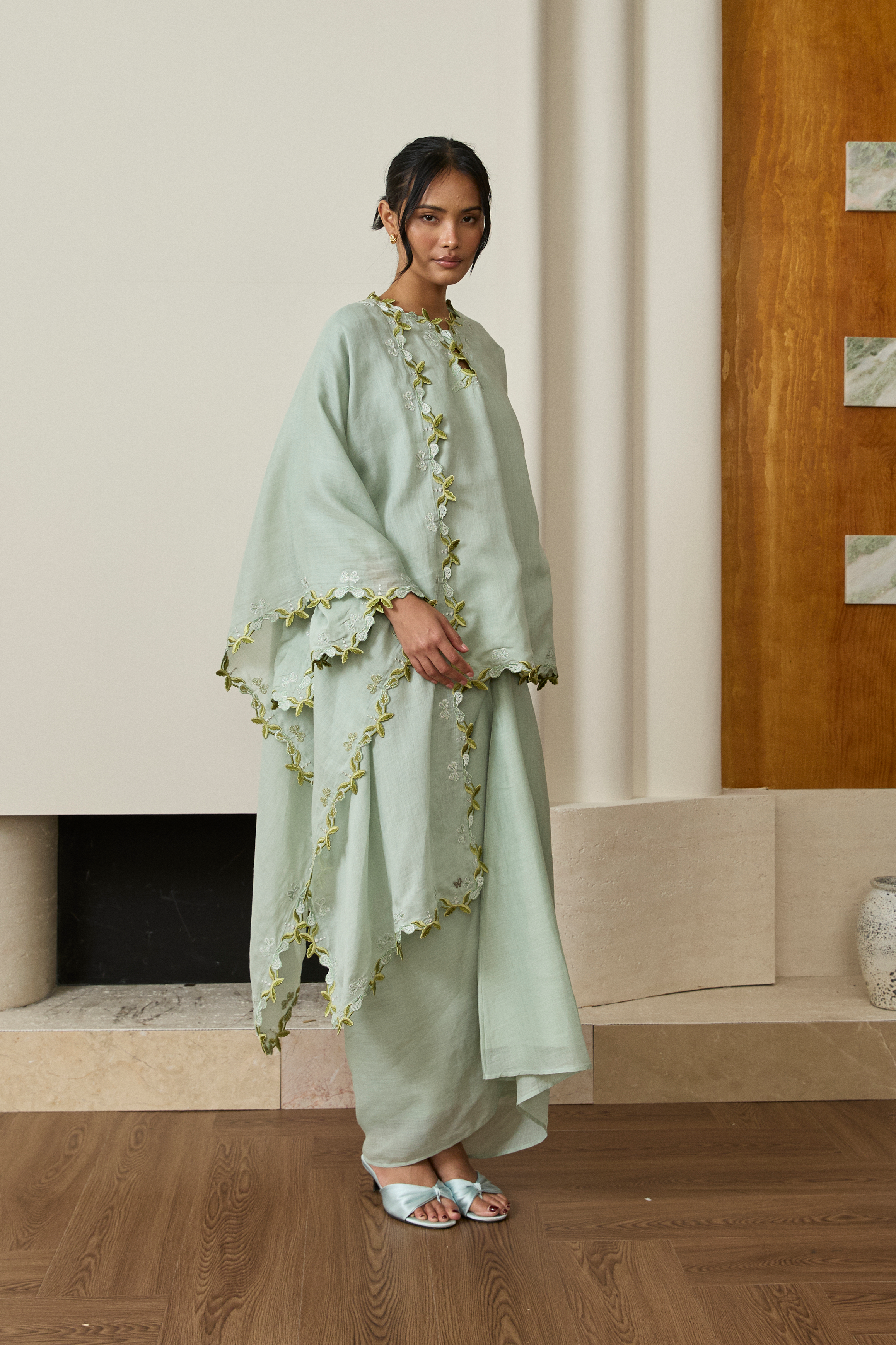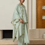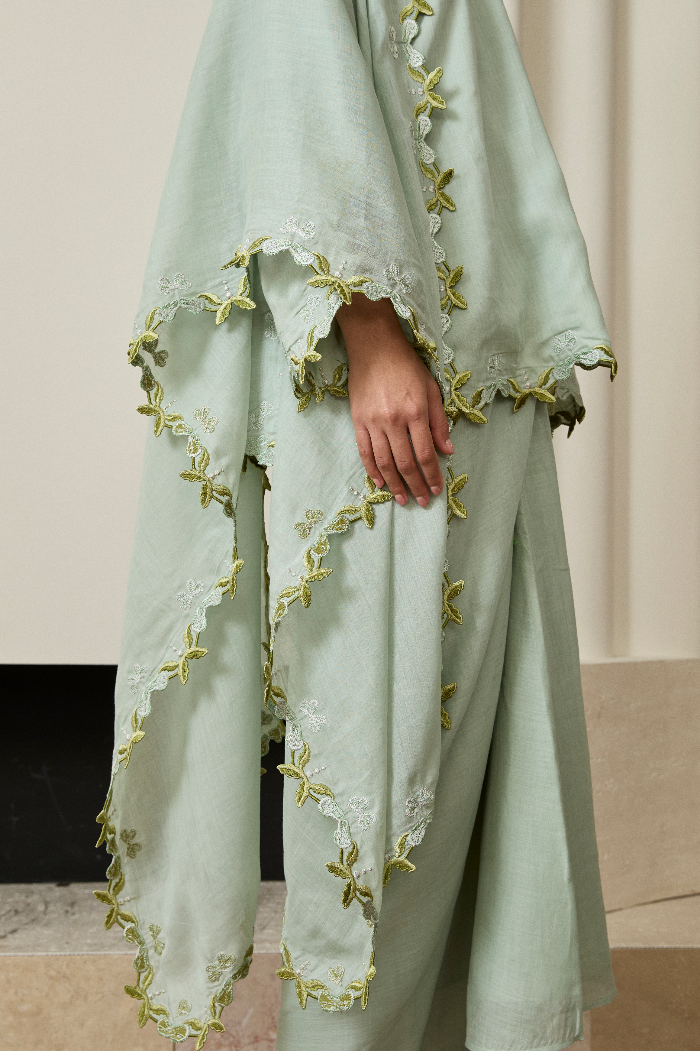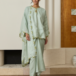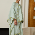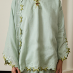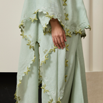 An iteration of the classic Kedah fit, rendered in ramie and lined with cotton. The set includes a top with intricate multi-tone floral embroidery. Finished with tulip-cut sleeves, side slits and a front button closure. Finished with a matching, slip-on knot skirt.