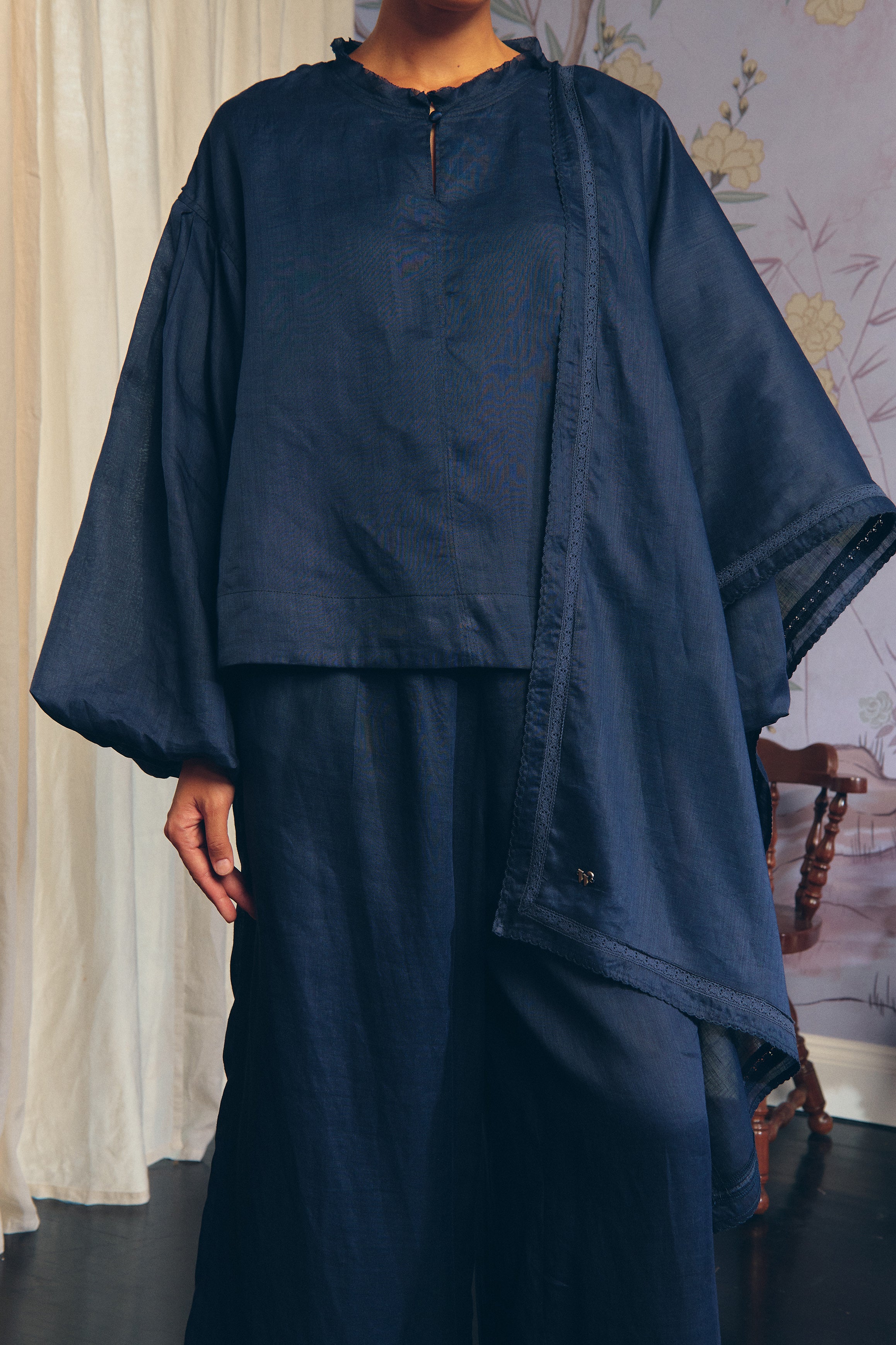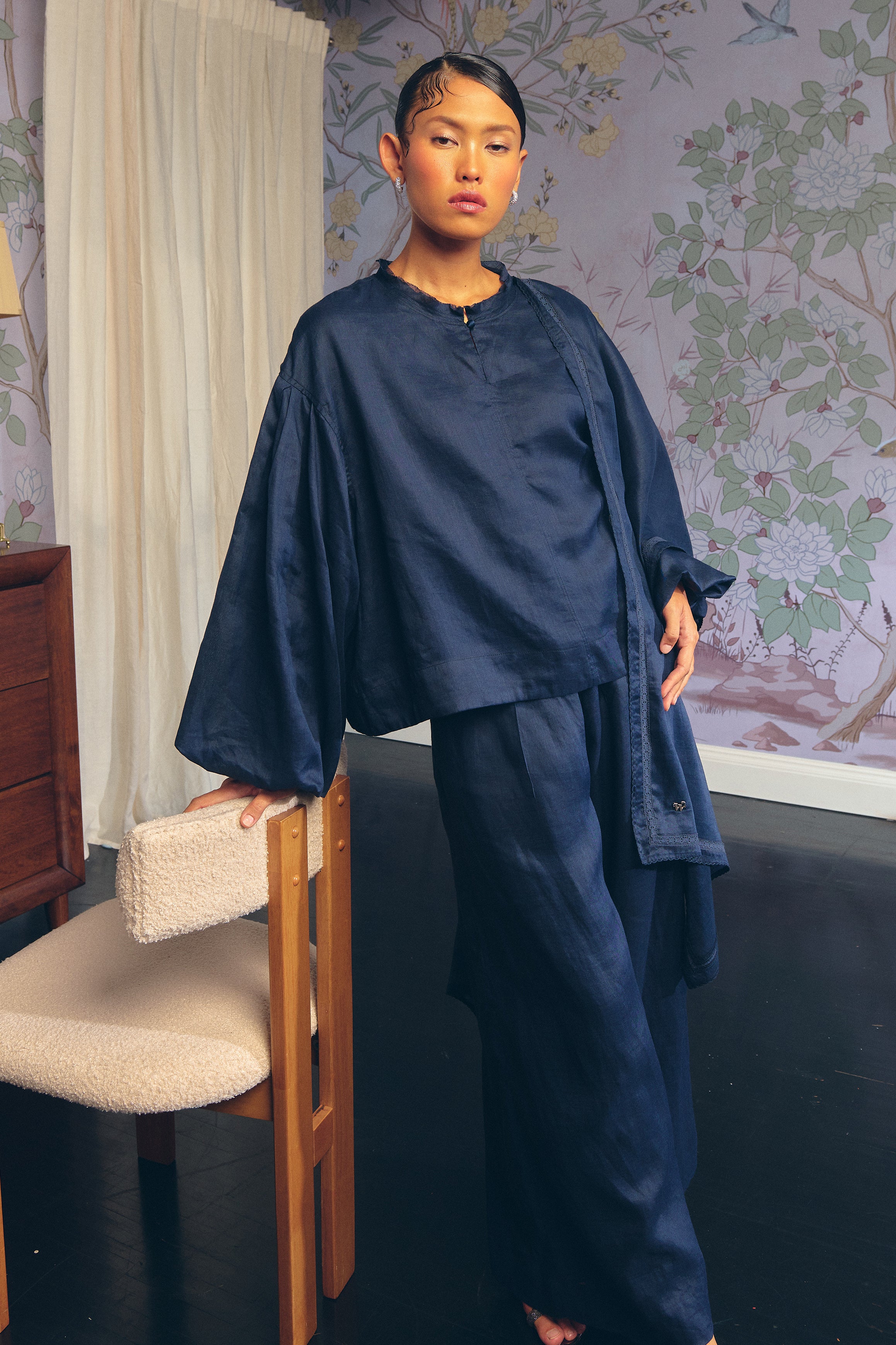 A relaxed blouse with puffy sleeves and a drop-shoulder silhouette. Rendered in Ramie, and lined in Cotton. Finished with a frayed neckline and front button closure.