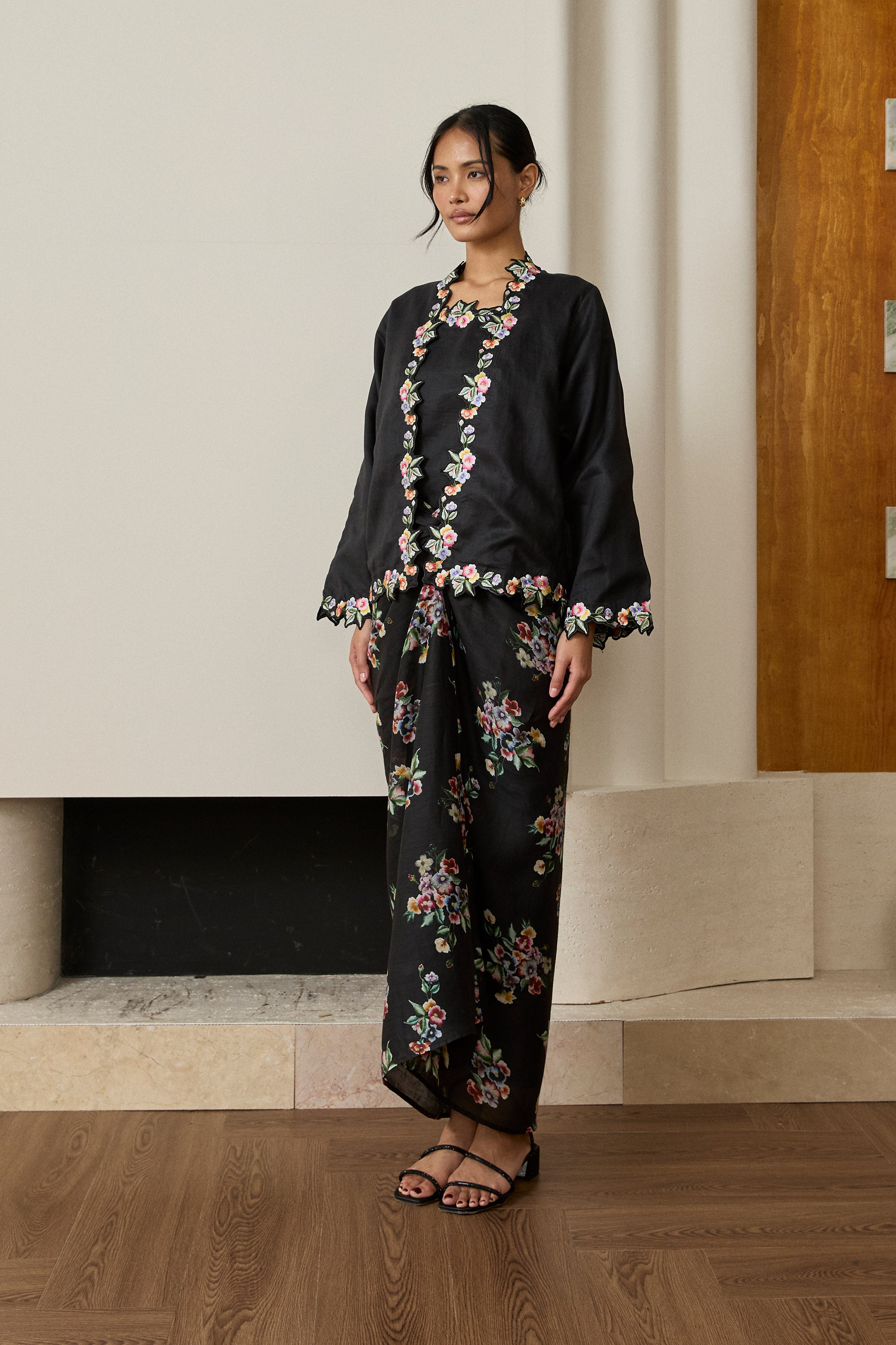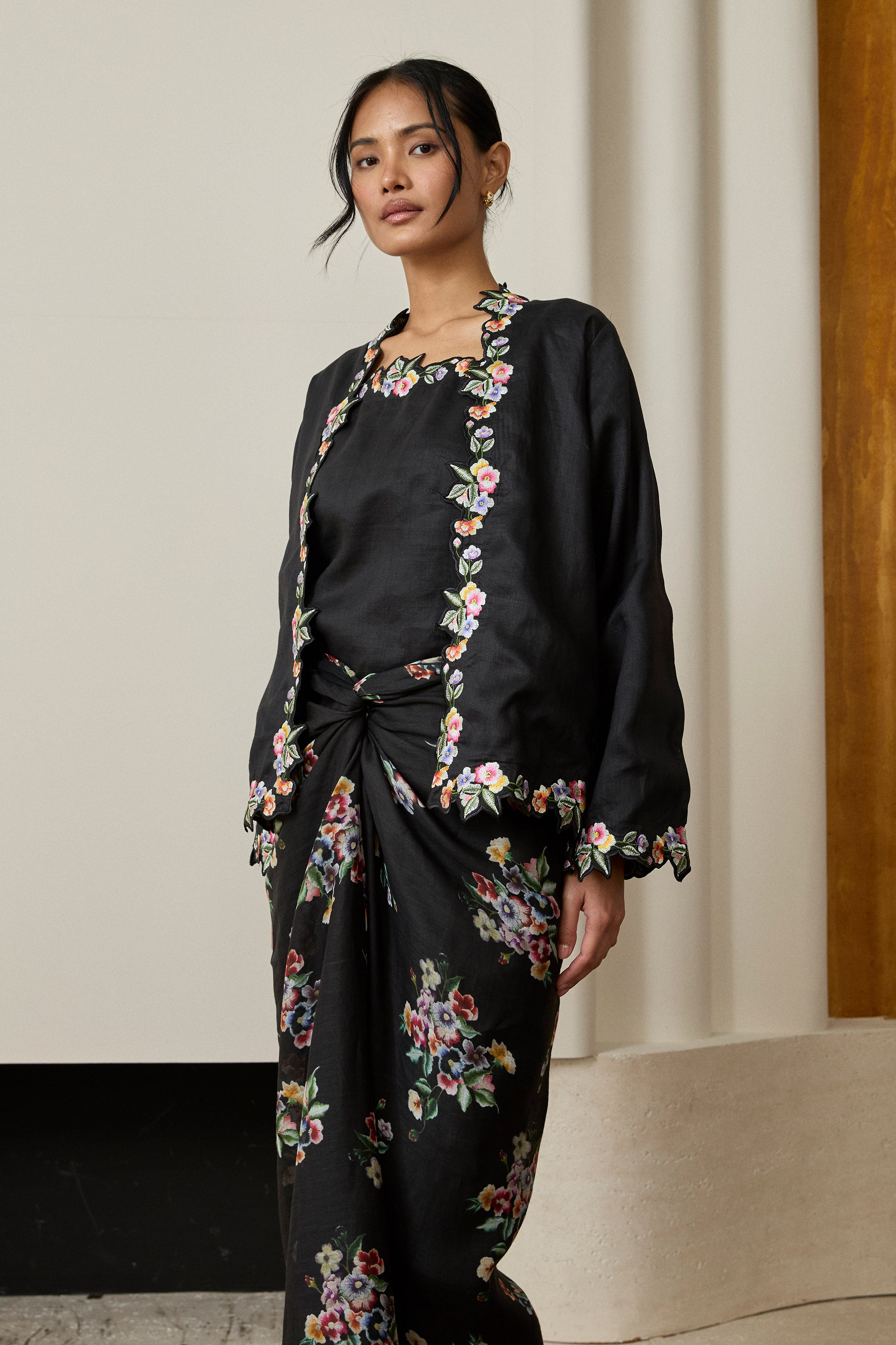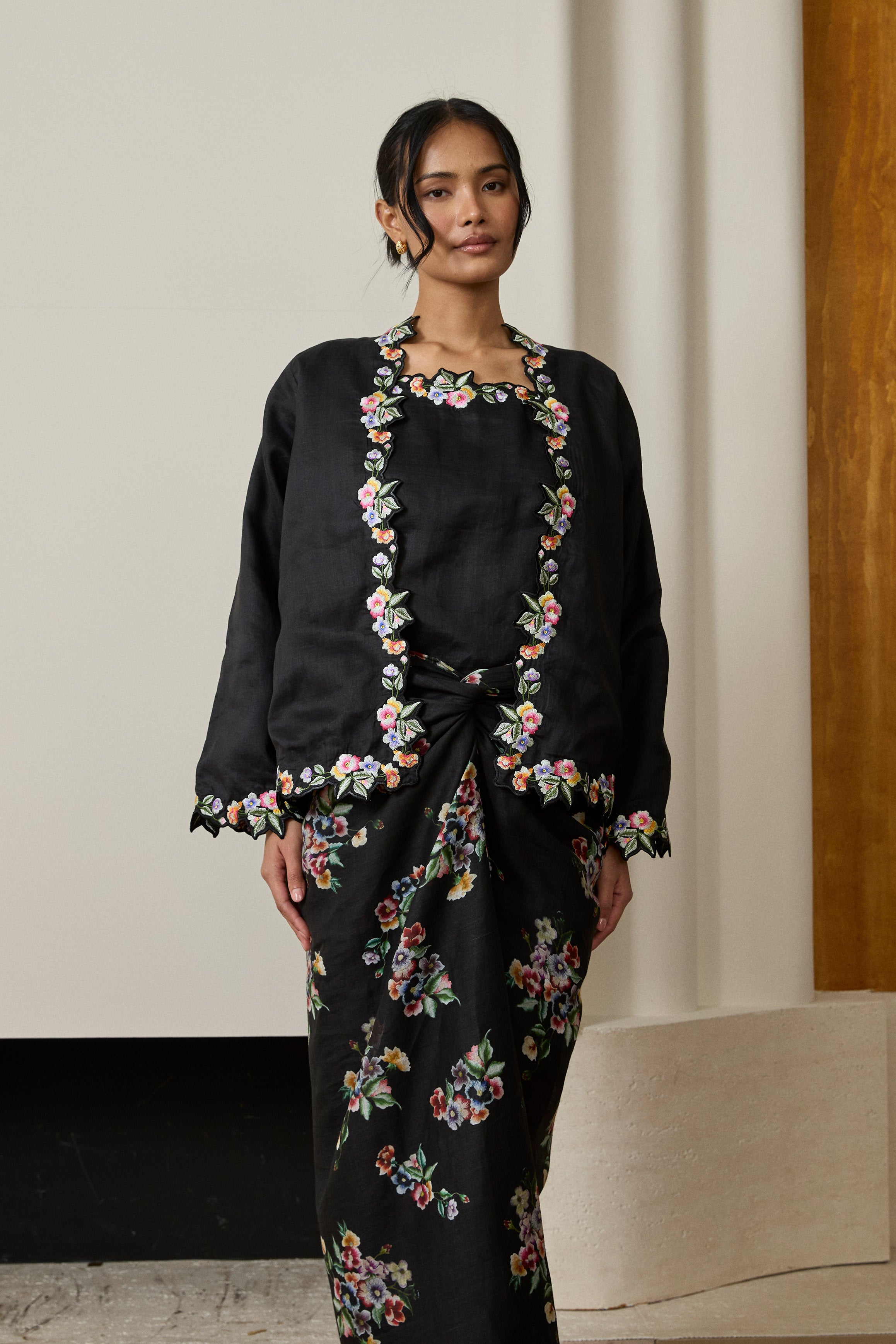 A two-piece Kebaya top, rendered in ramie. A floral print, featuring intricate floral embroidery along the hem and sleeves. Designed with a separate camisole, lined with cotton.