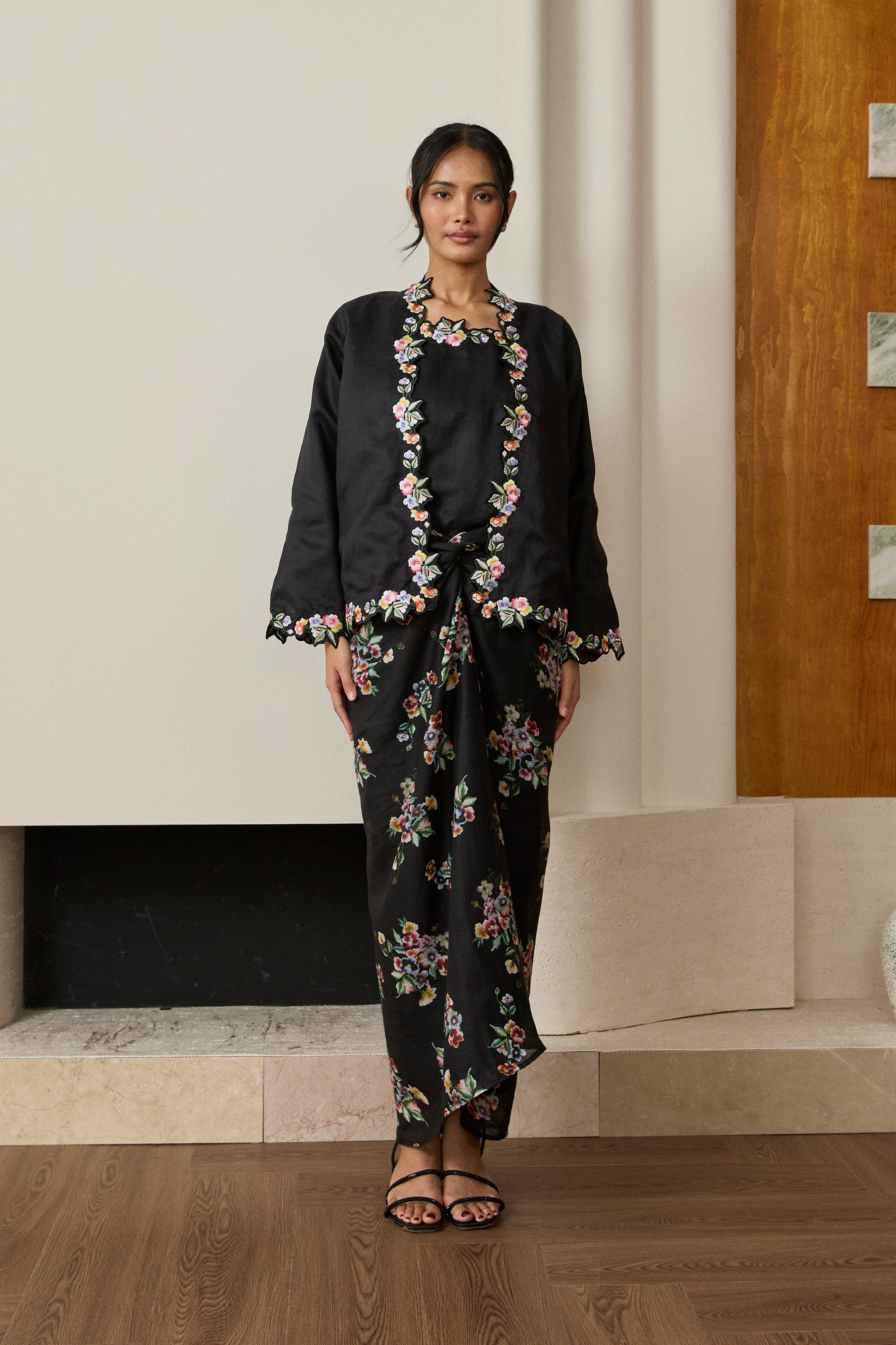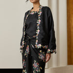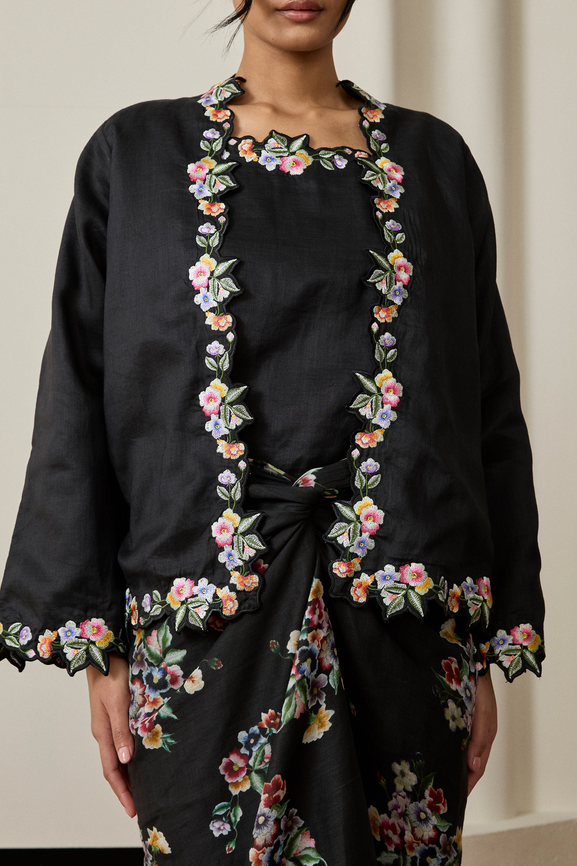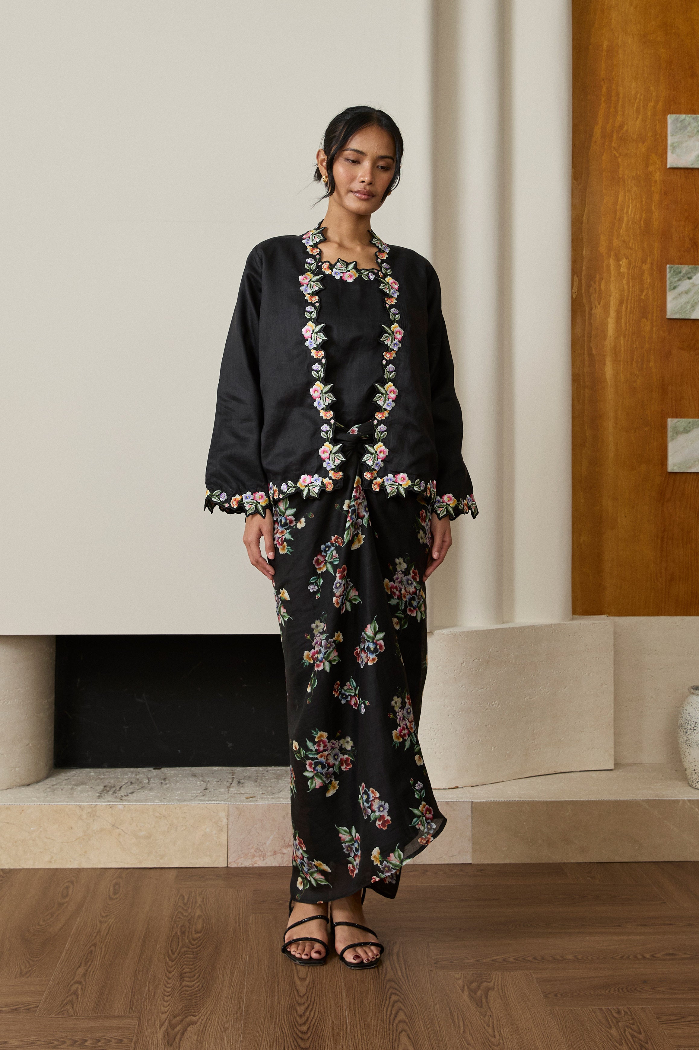 A two-piece Kebaya top, rendered in ramie. A floral print, featuring intricate floral embroidery along the hem and sleeves. Designed with a separate camisole, lined with cotton.