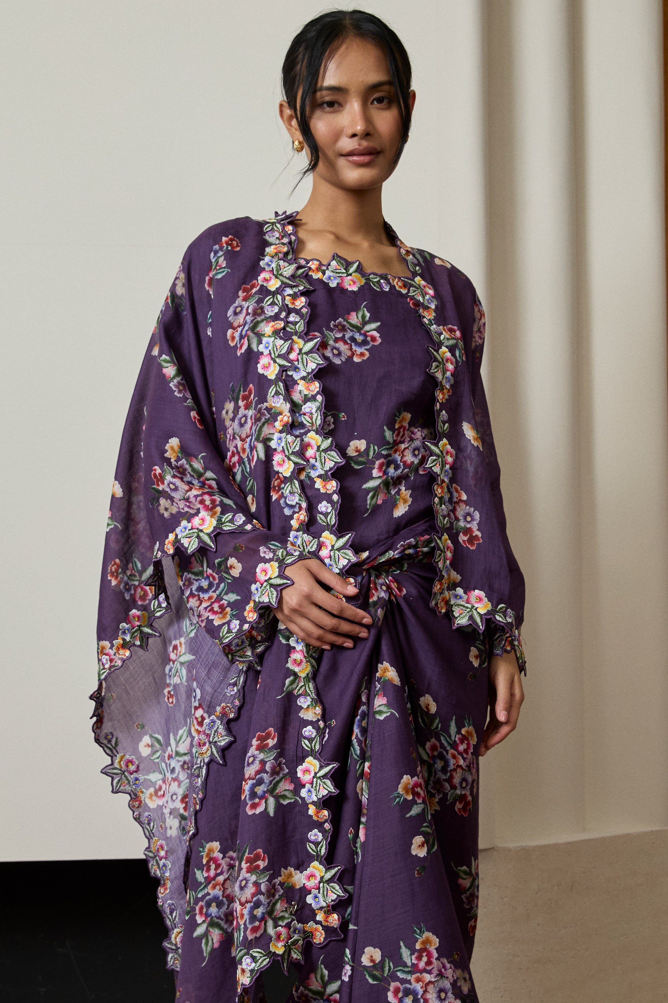 Accented with intricate multicolour floral embroidery