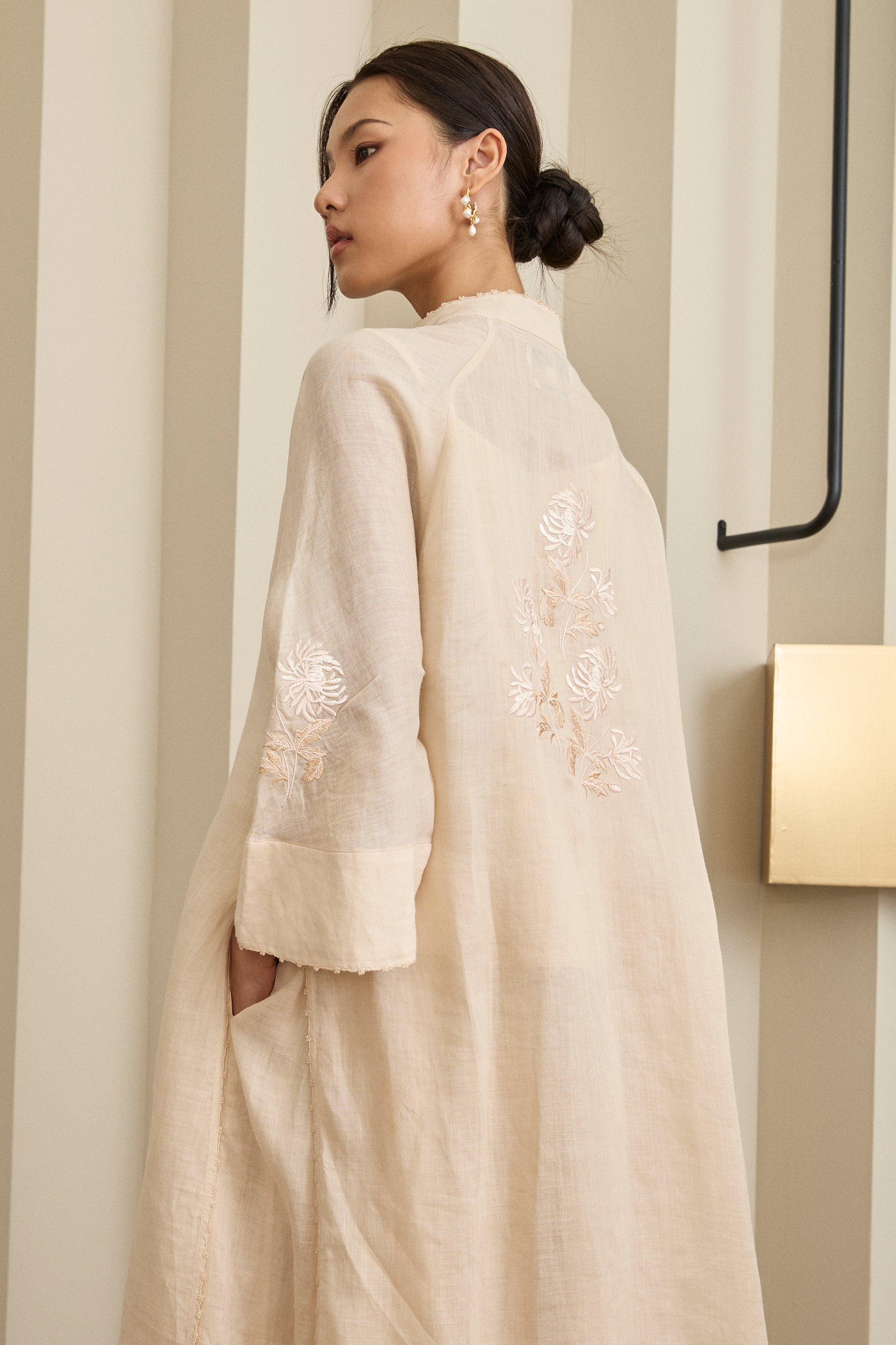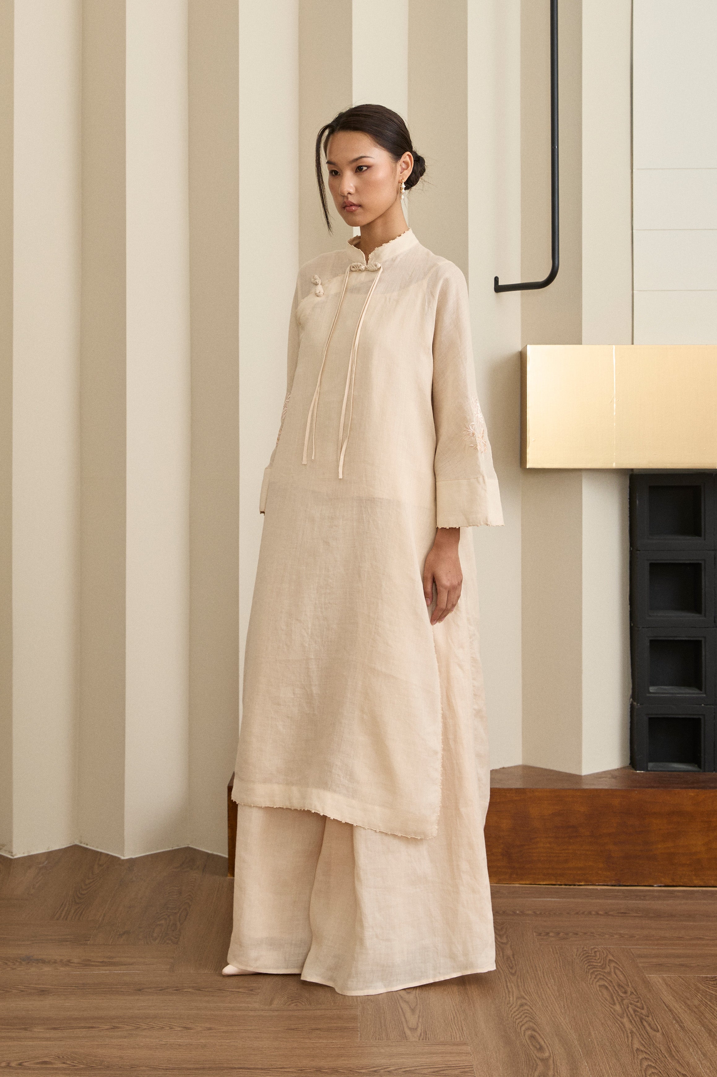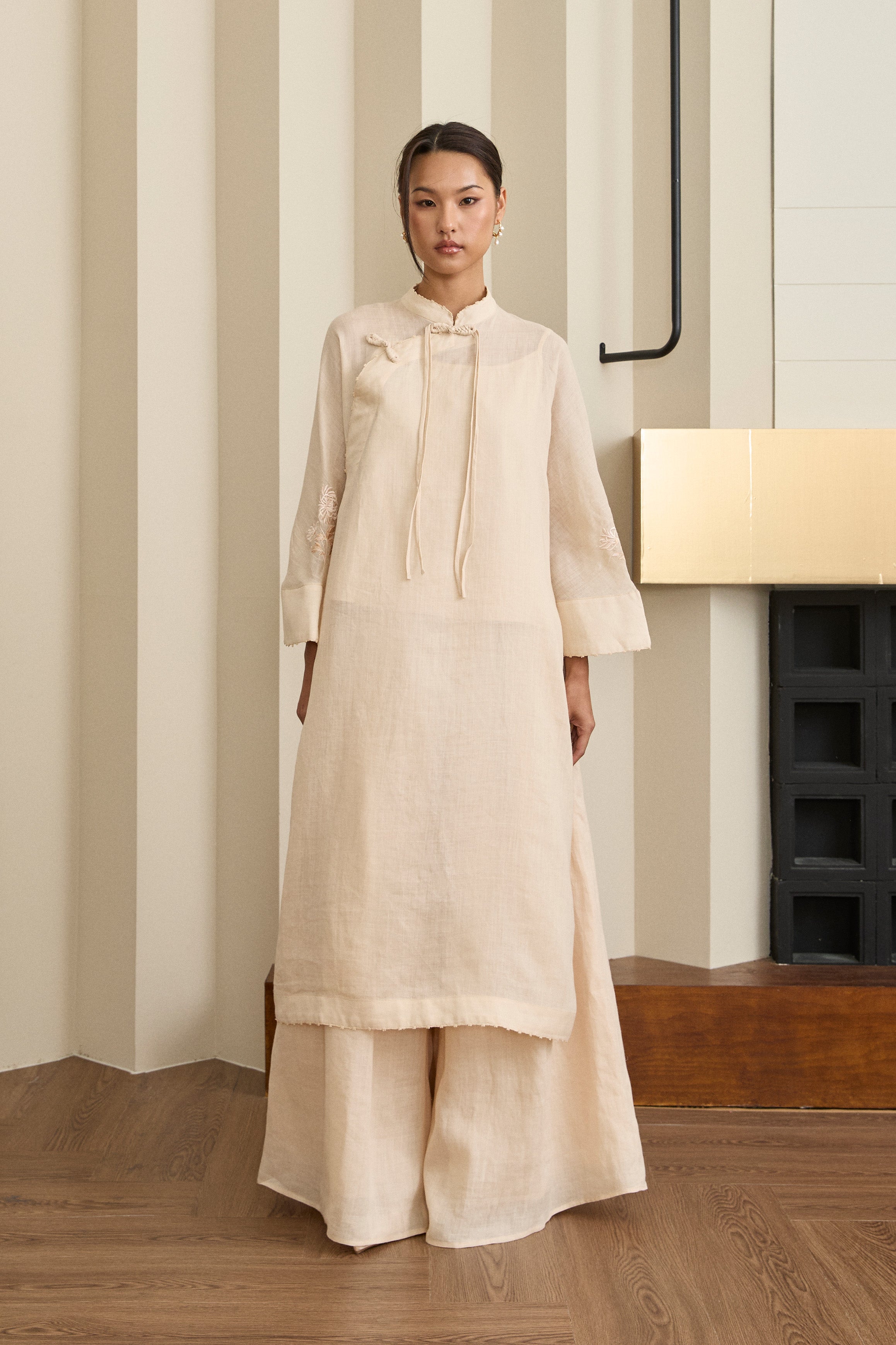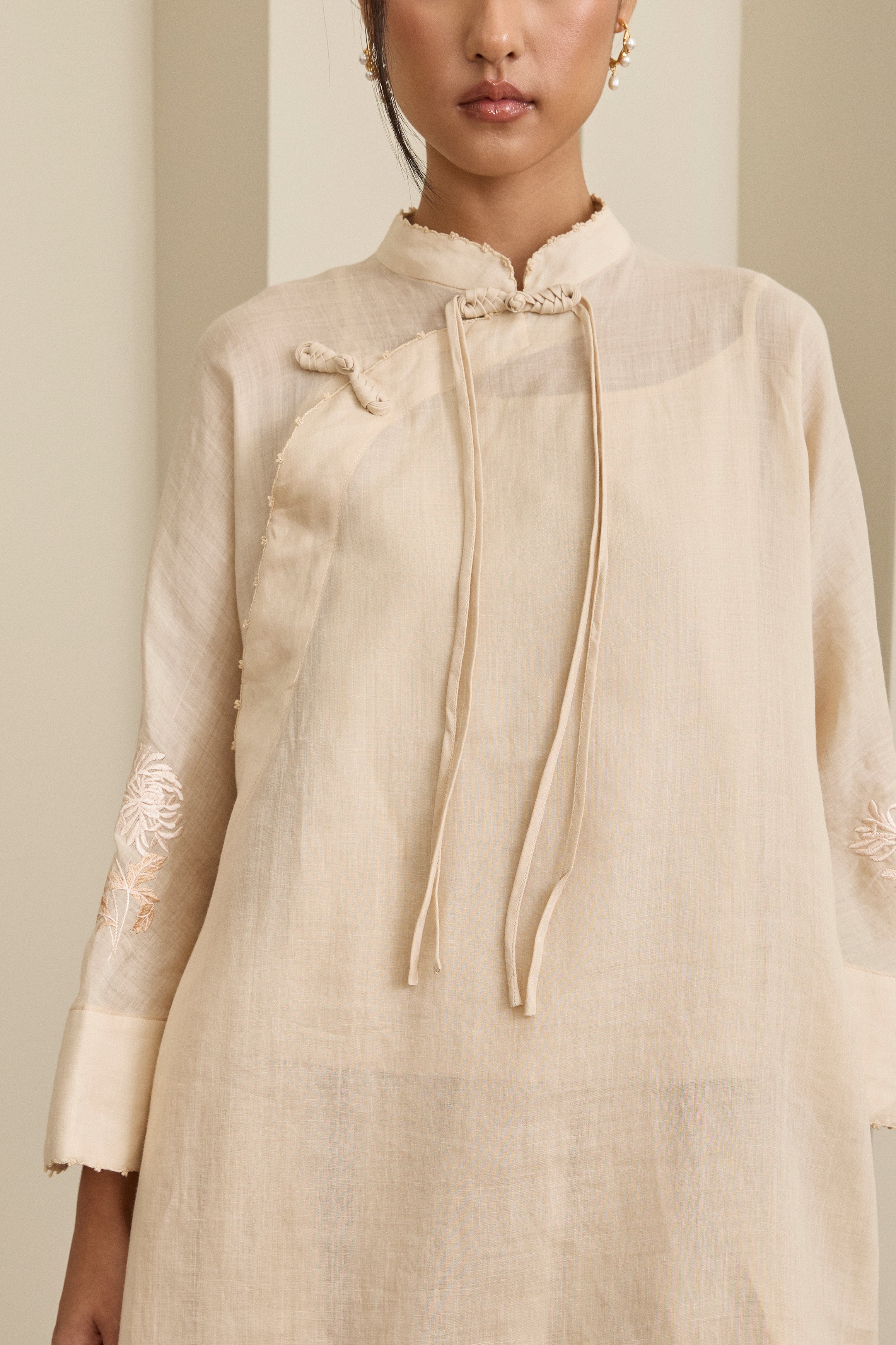 A long tunic, with a batwing silhouette and raglan sleeves. Rendered in ramie. Features a mandarin collar with asymmetrical button detailing and intricate floral embroidery on the sleeves and back bodice, with delicate trimming along all hems. Designed with a separate cotton camisole.