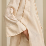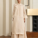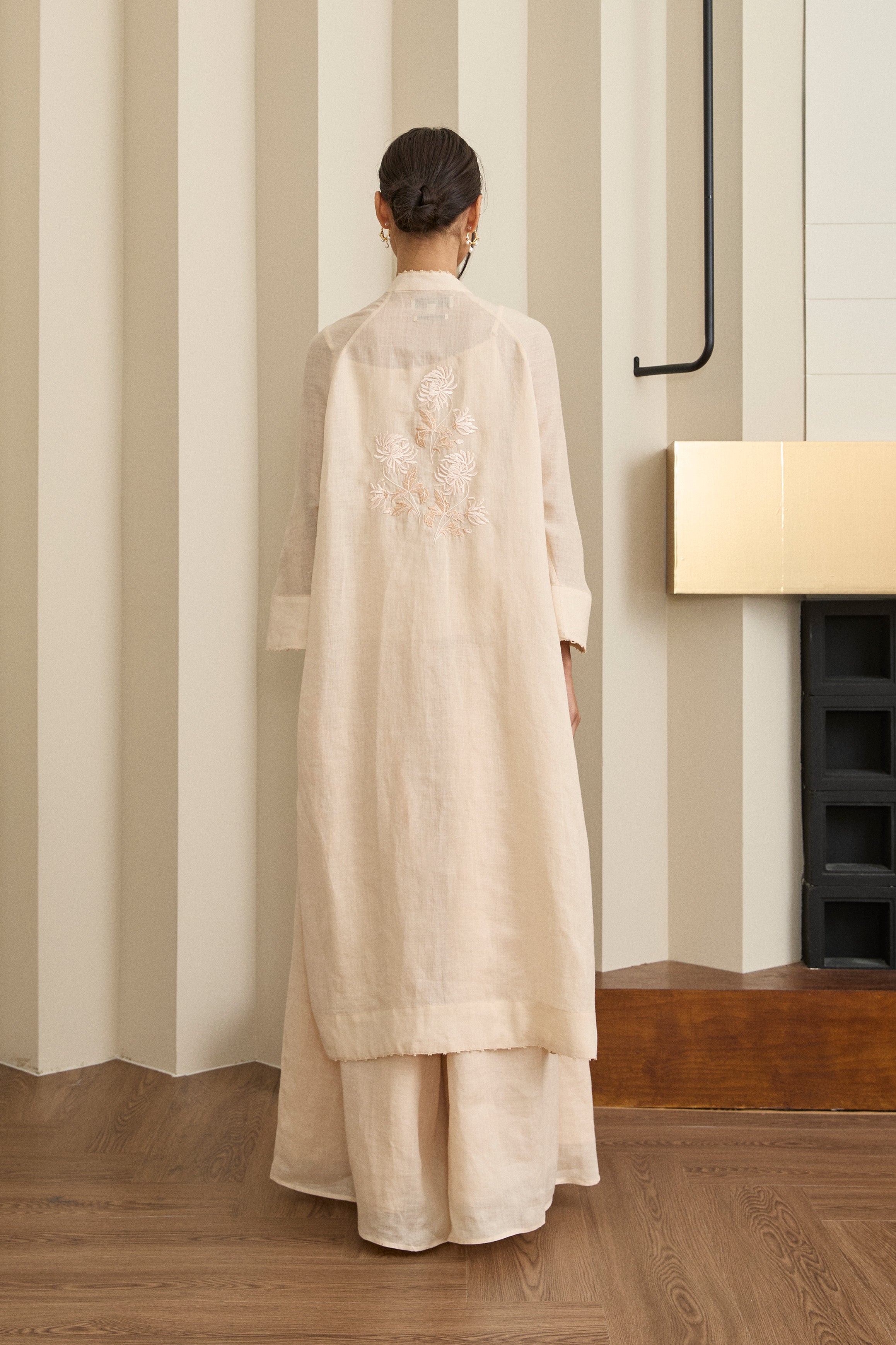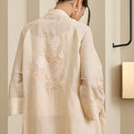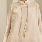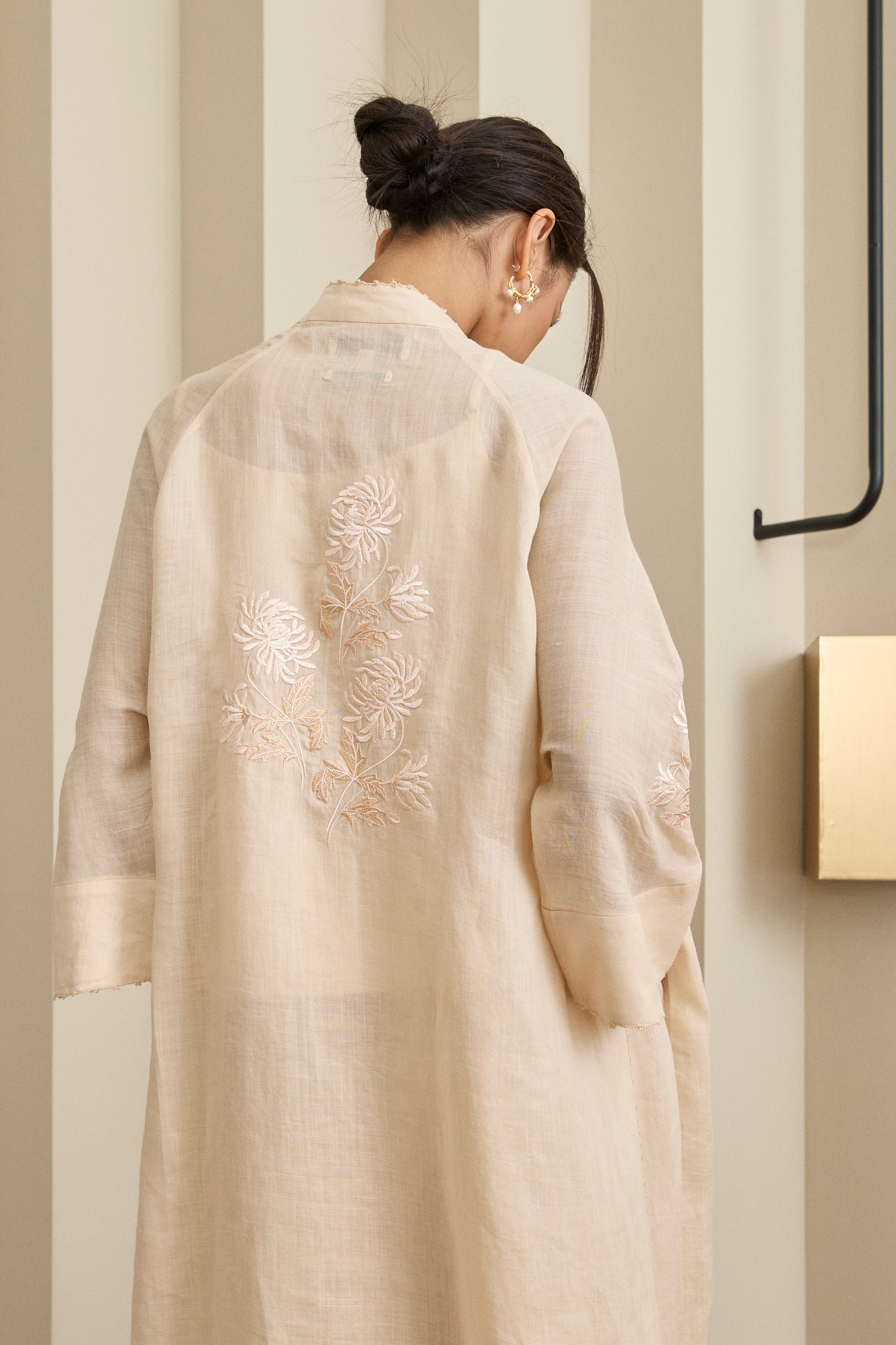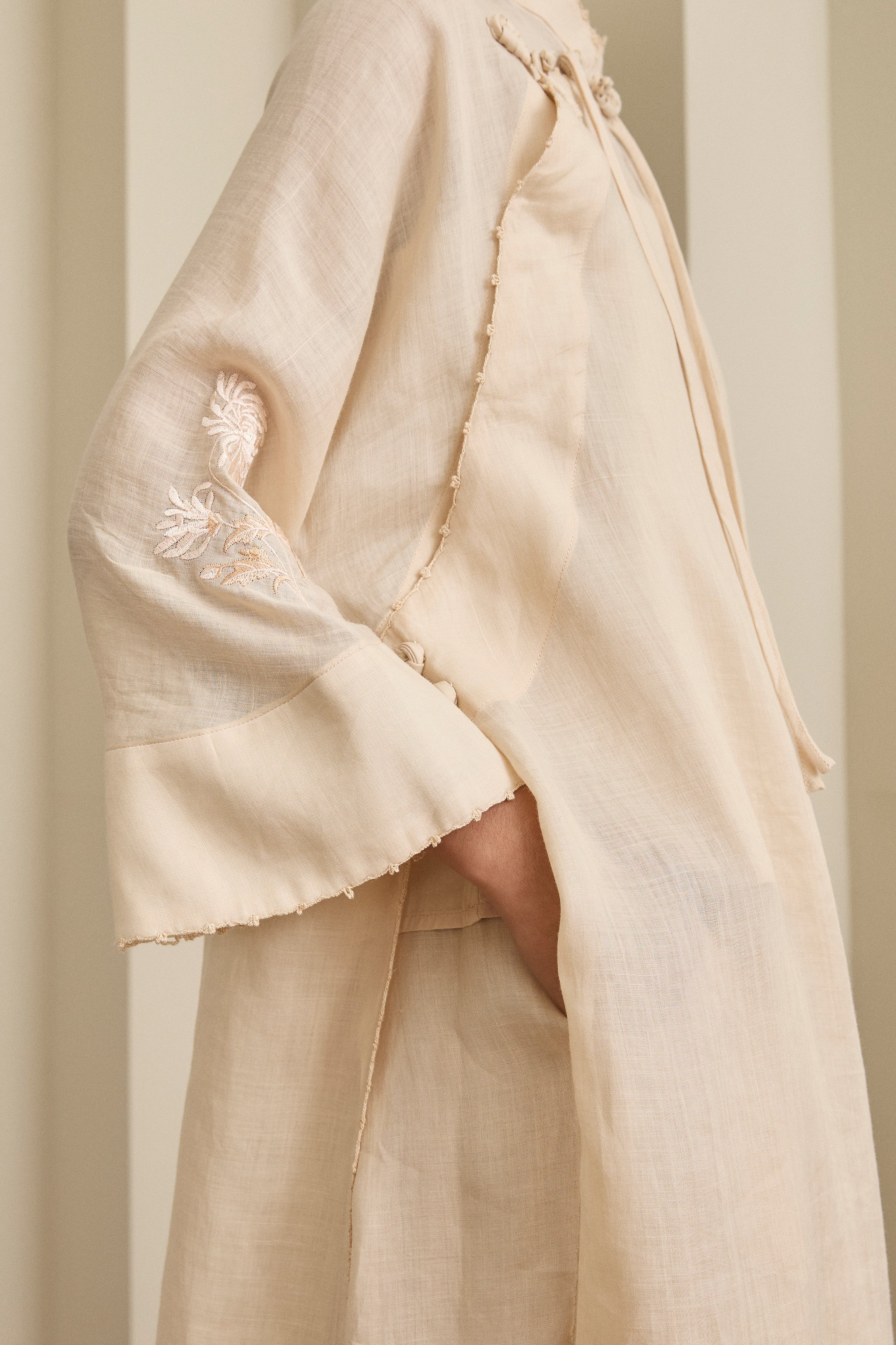 A long tunic, with a batwing silhouette and raglan sleeves. Rendered in ramie. Features a mandarin collar with asymmetrical button detailing and intricate floral embroidery on the sleeves and back bodice, with delicate trimming along all hems. Designed with a separate cotton camisole.