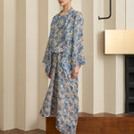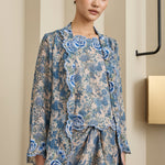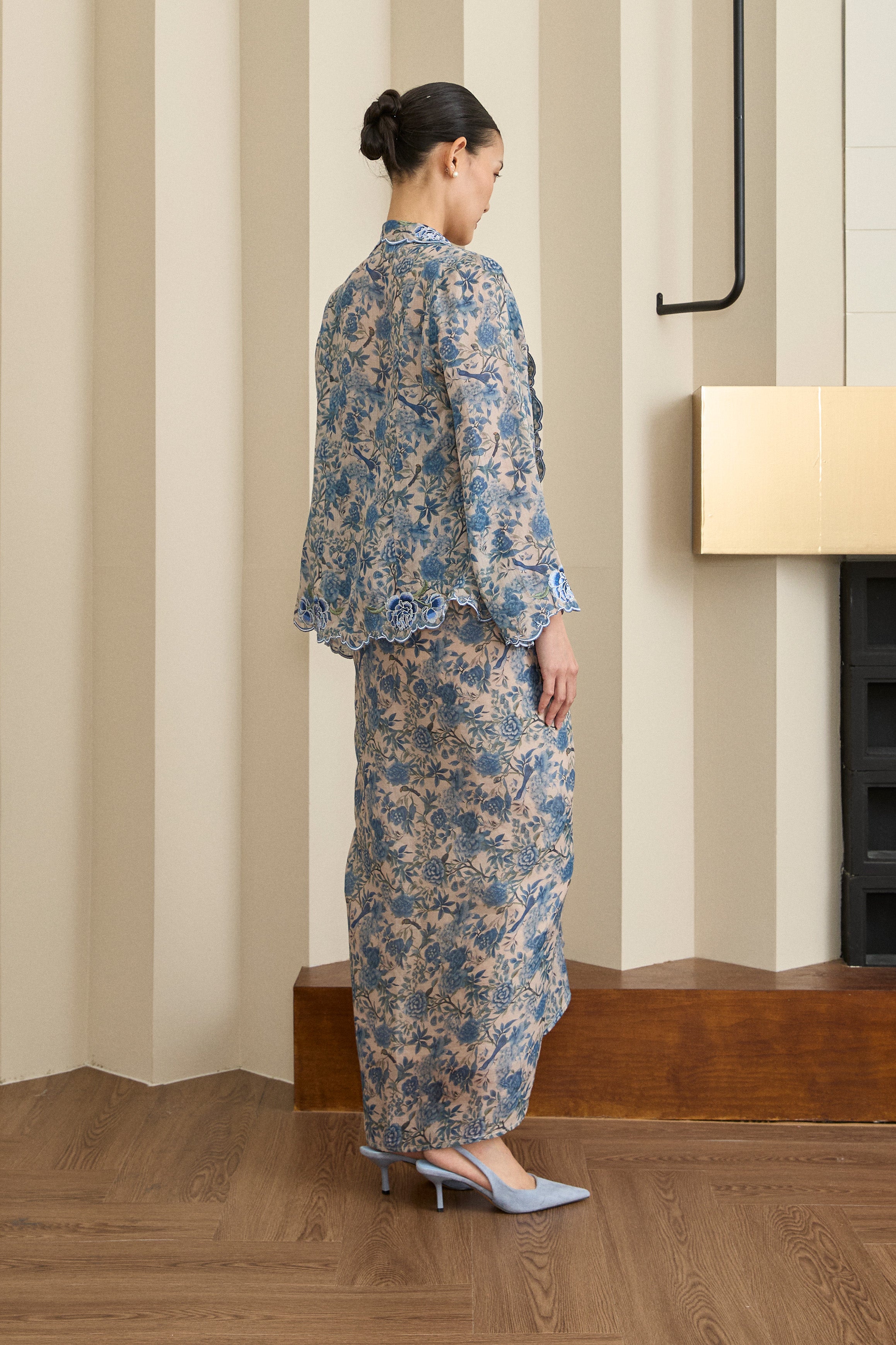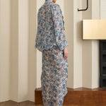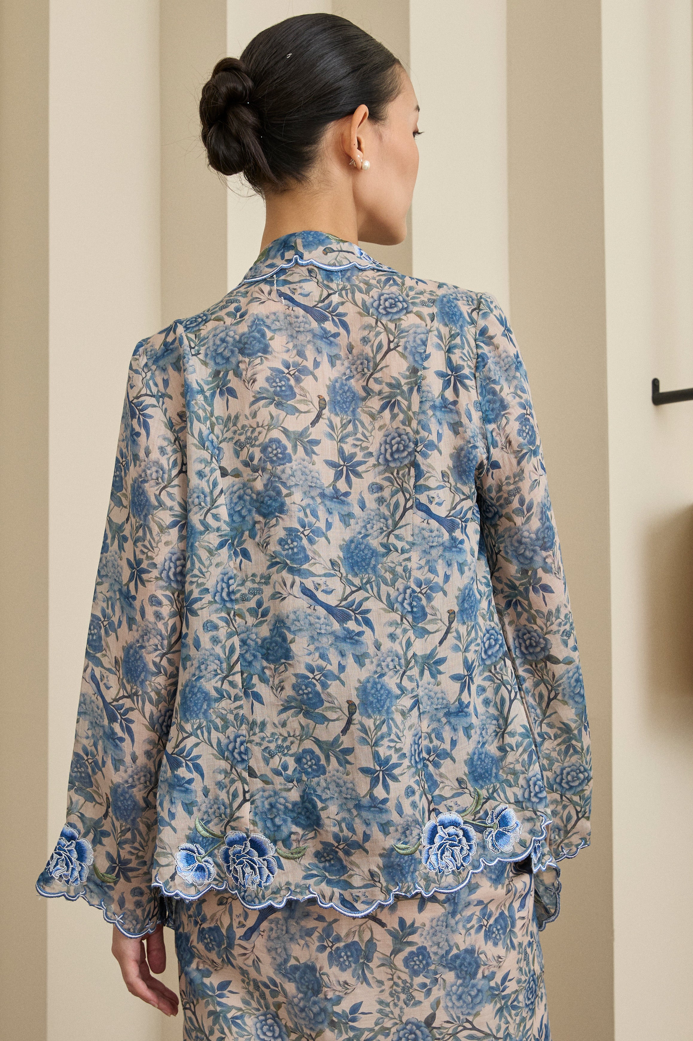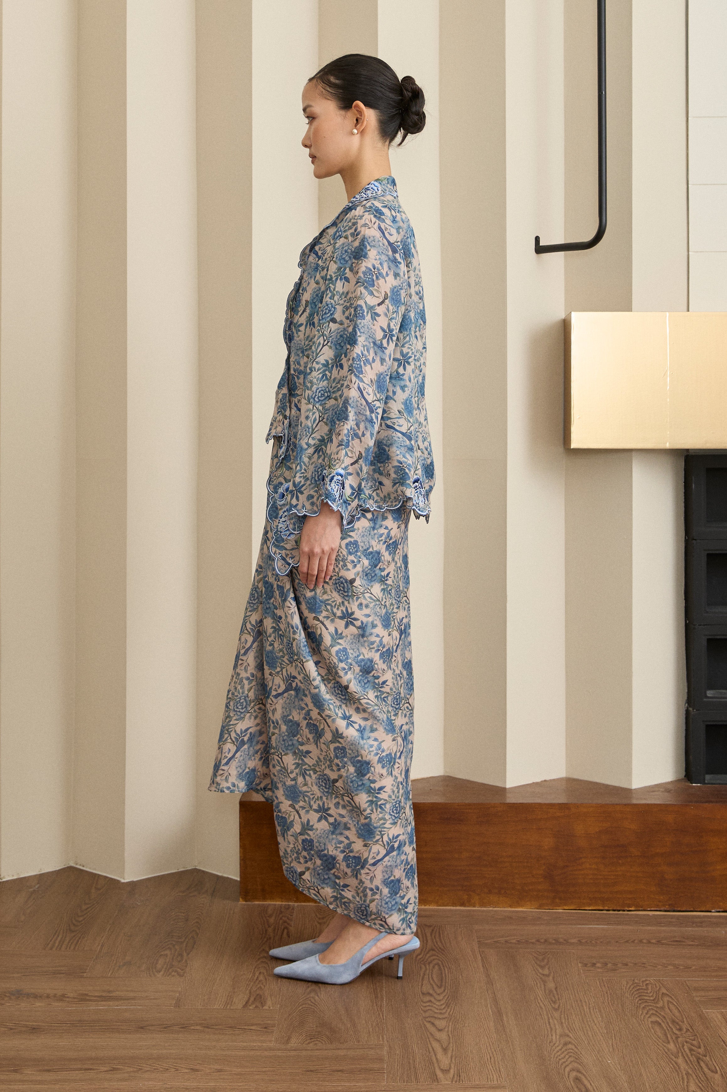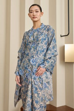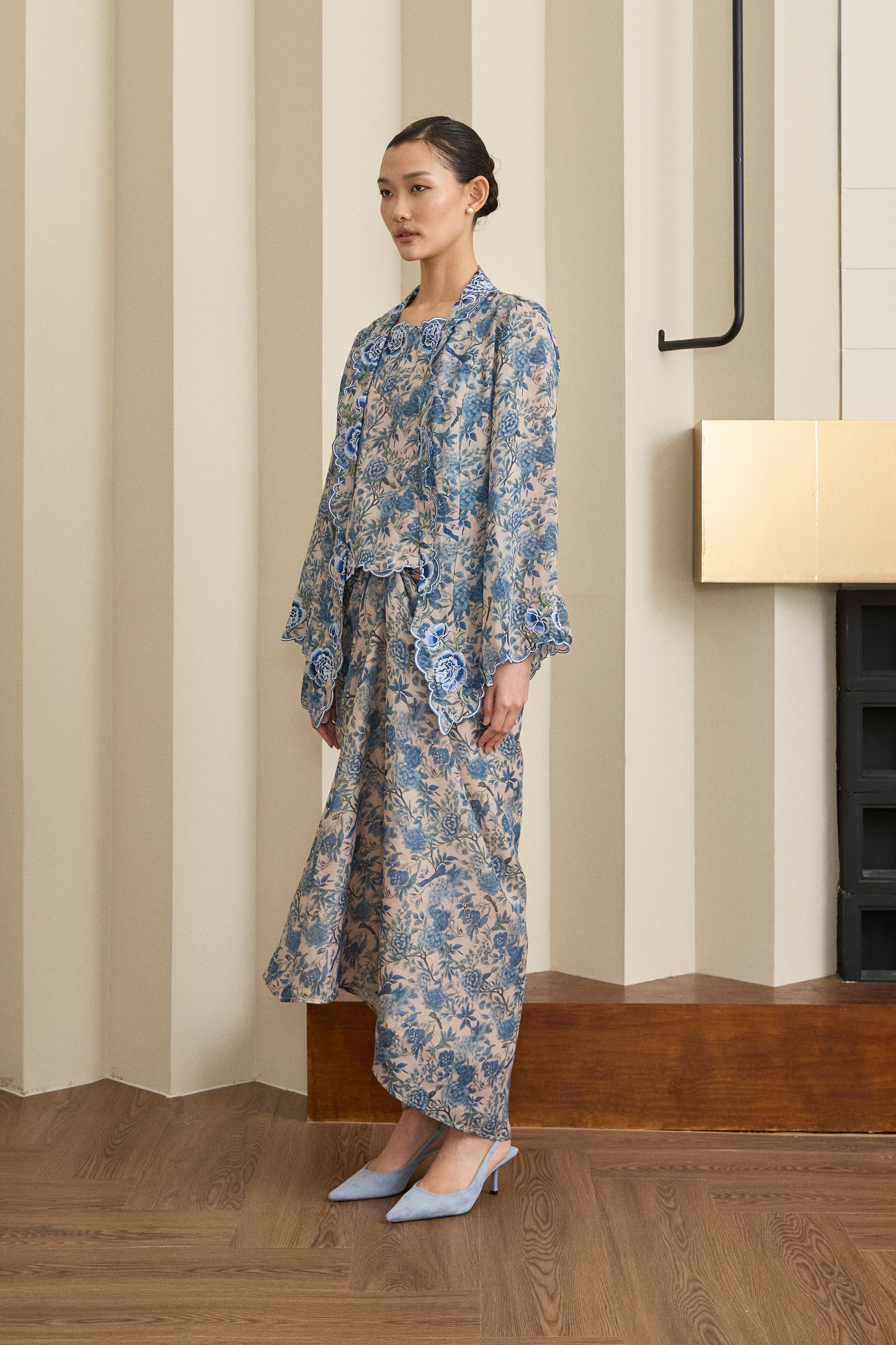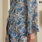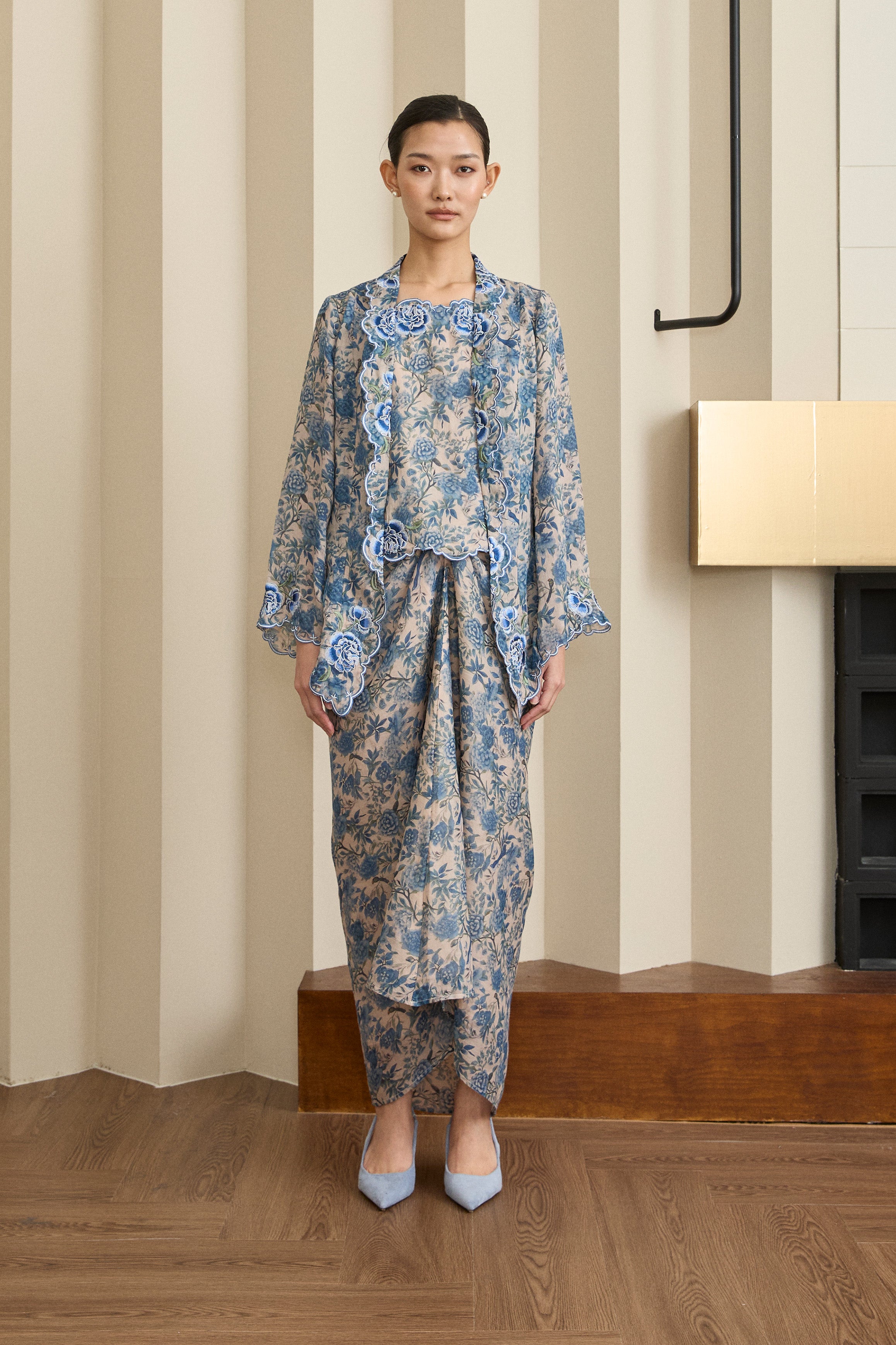A semi fitted 2-piece floral print Kebaya top with matching camisole, rendered in ramie. Designed with intricate flower and scallop embroidery along the embroidered lapel and sleeve hemline, and finished with a front hook-and-eye closure. The outer layer is unlined, while the camisole features a full cotton lining. Paired with a slip on knot skirt, fully lined in cotton.