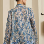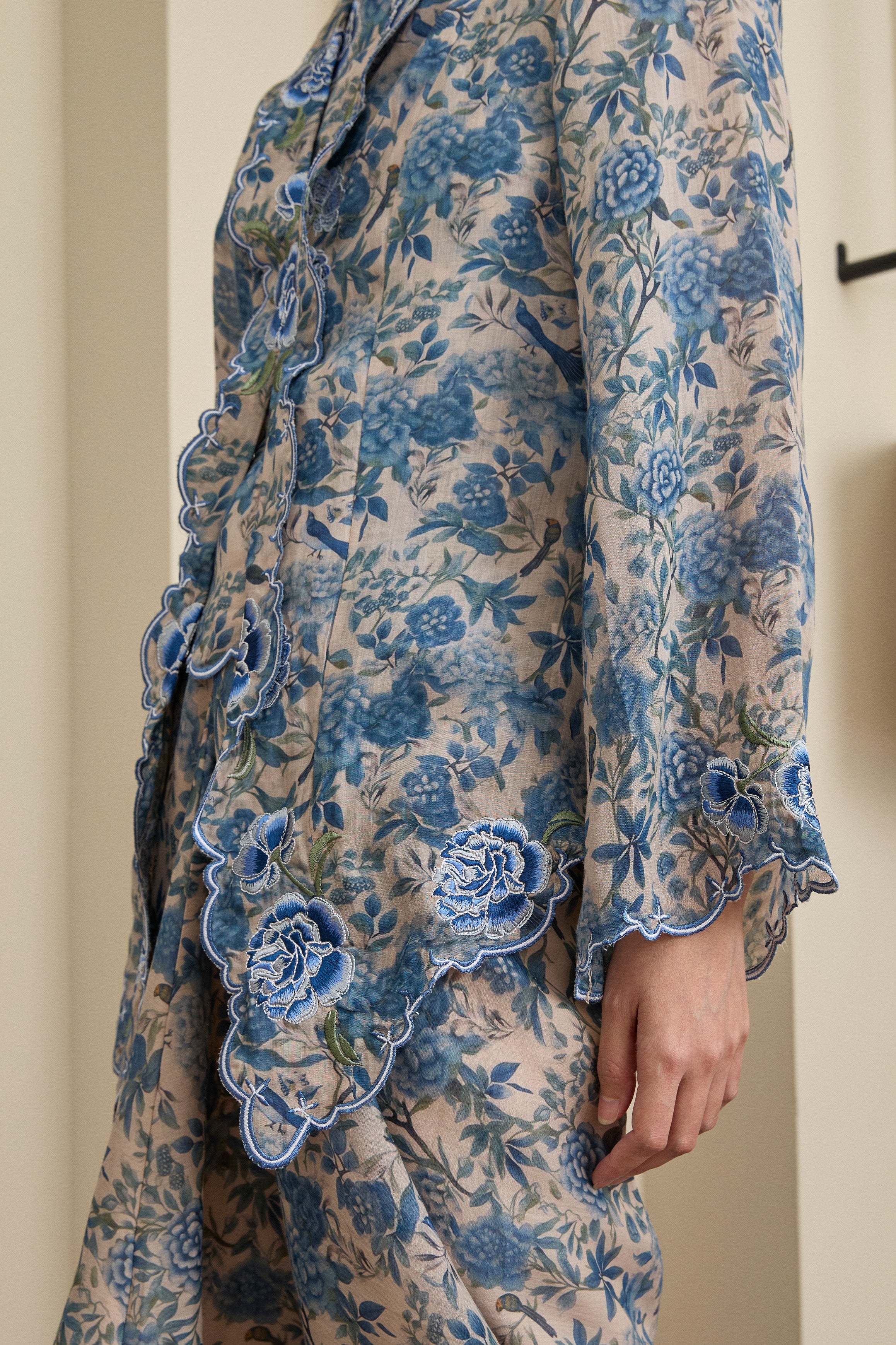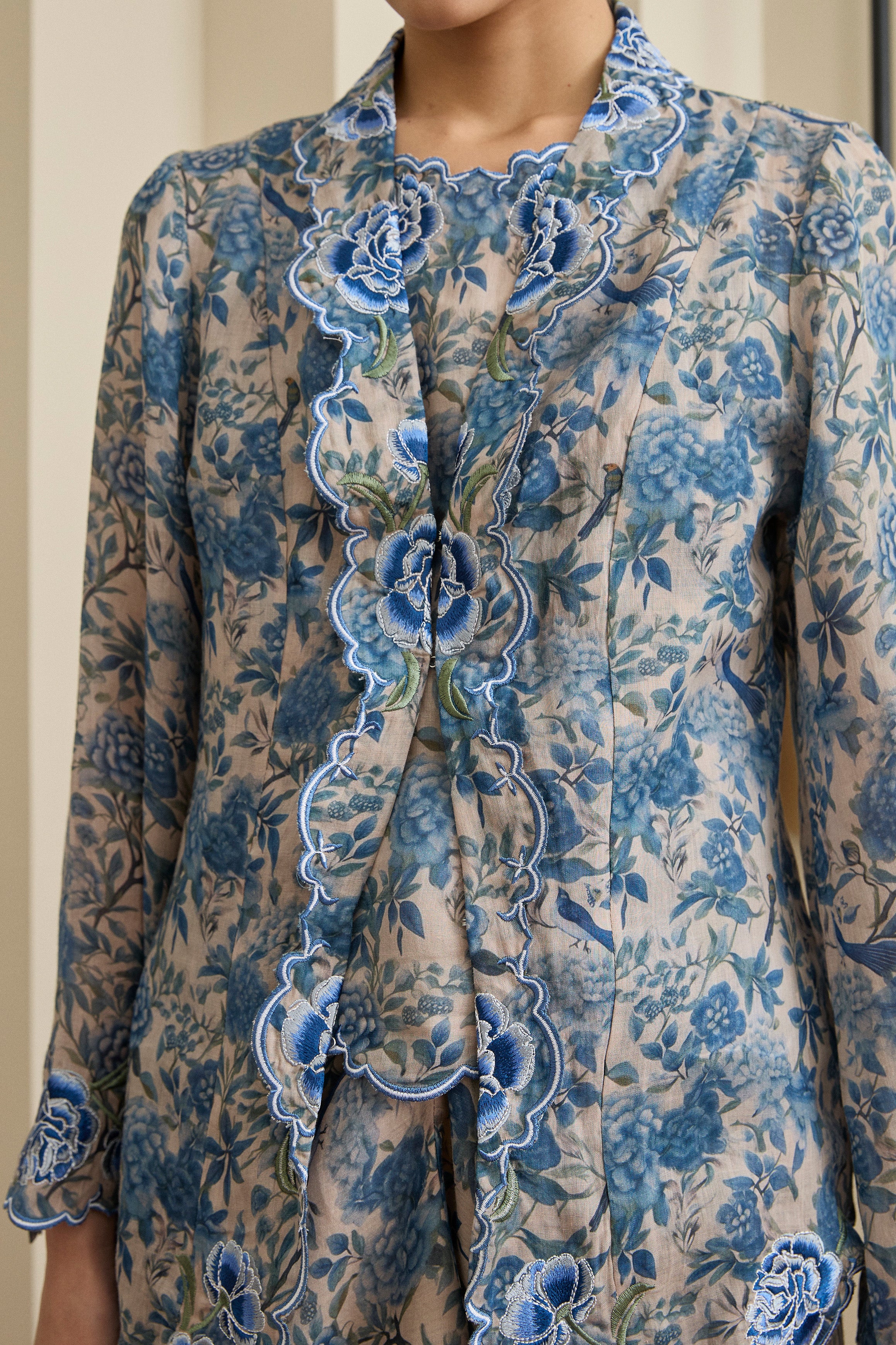 Intricate flower and scallop embroidery along the embroidered lapel and sleeve hemline