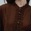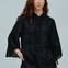 A shirt featuring a stand-up collar with wavy trims that trace the button band. Designed with form-flattering pleats at the front and back, and A-line sleeves with an uneven hem. Finished with an eyelash-stitch trim to add the right accent.
