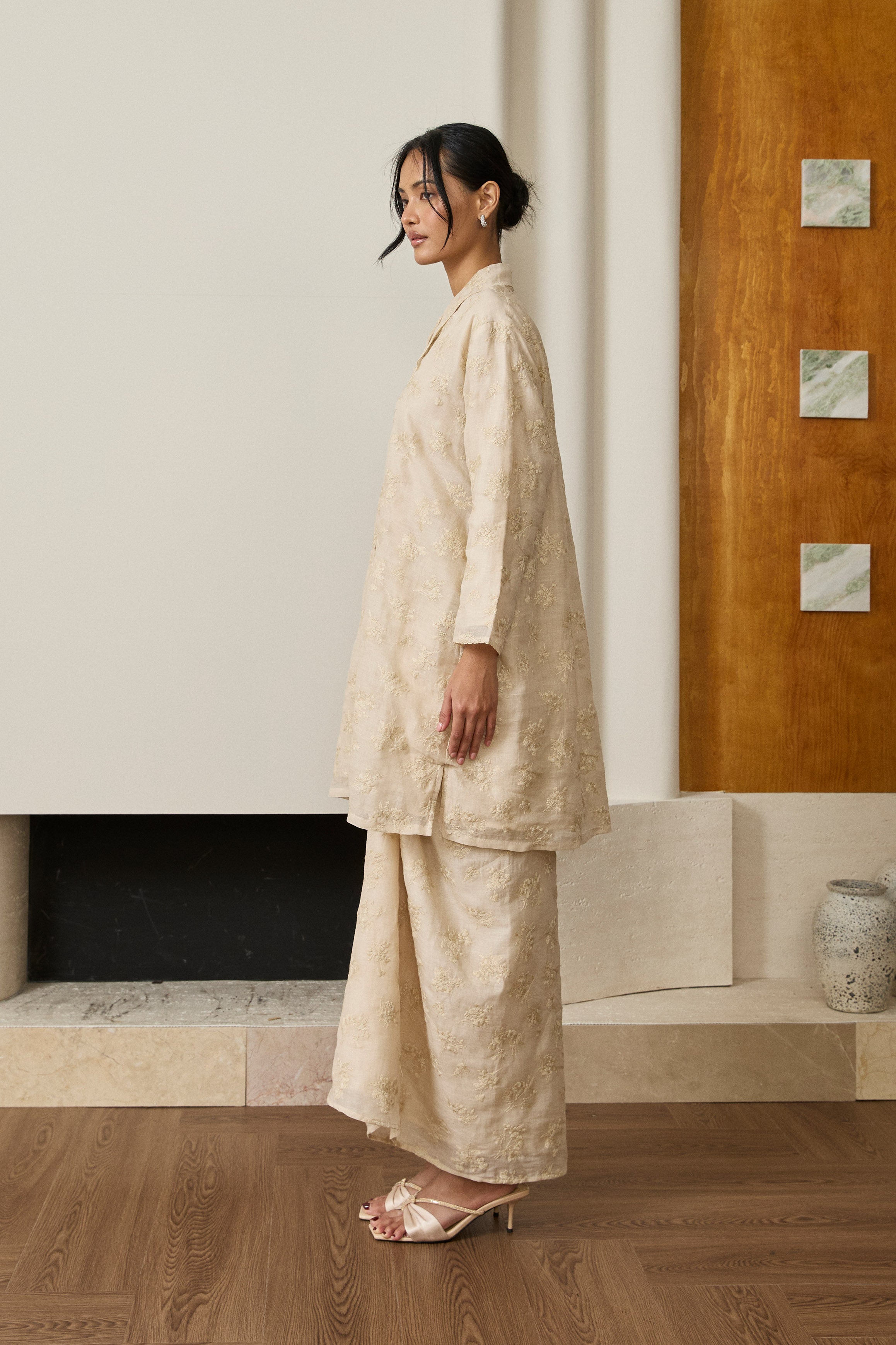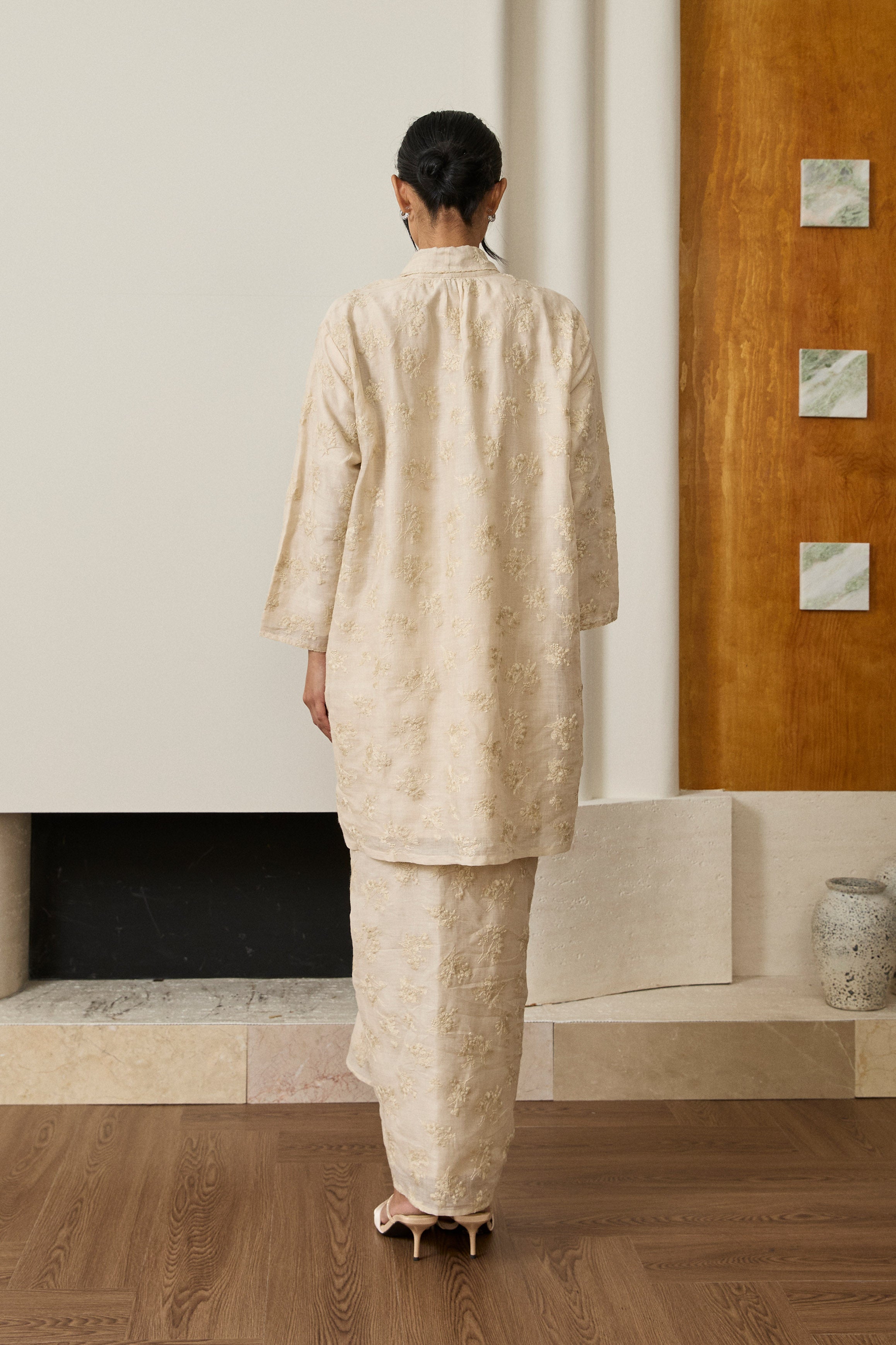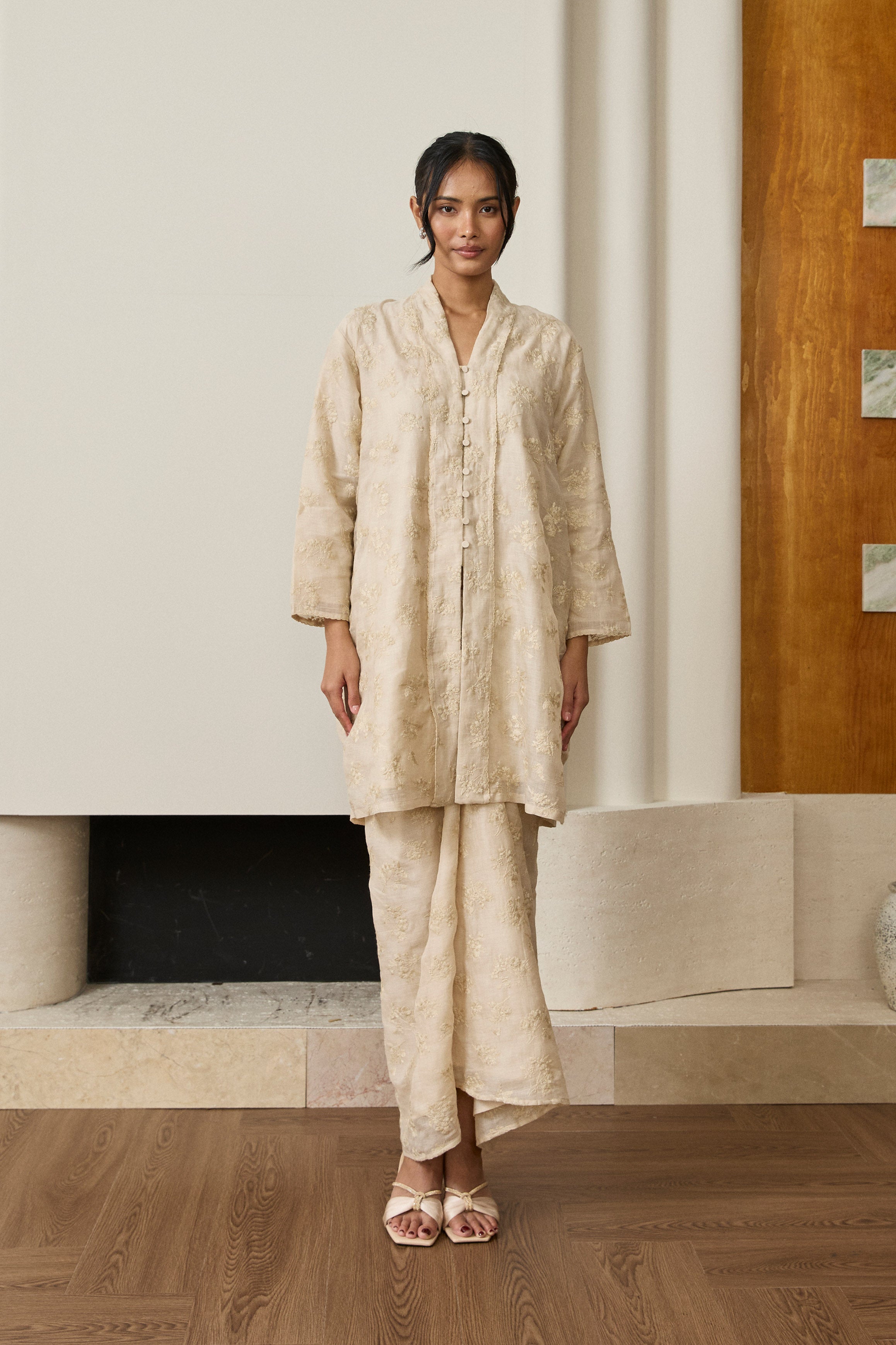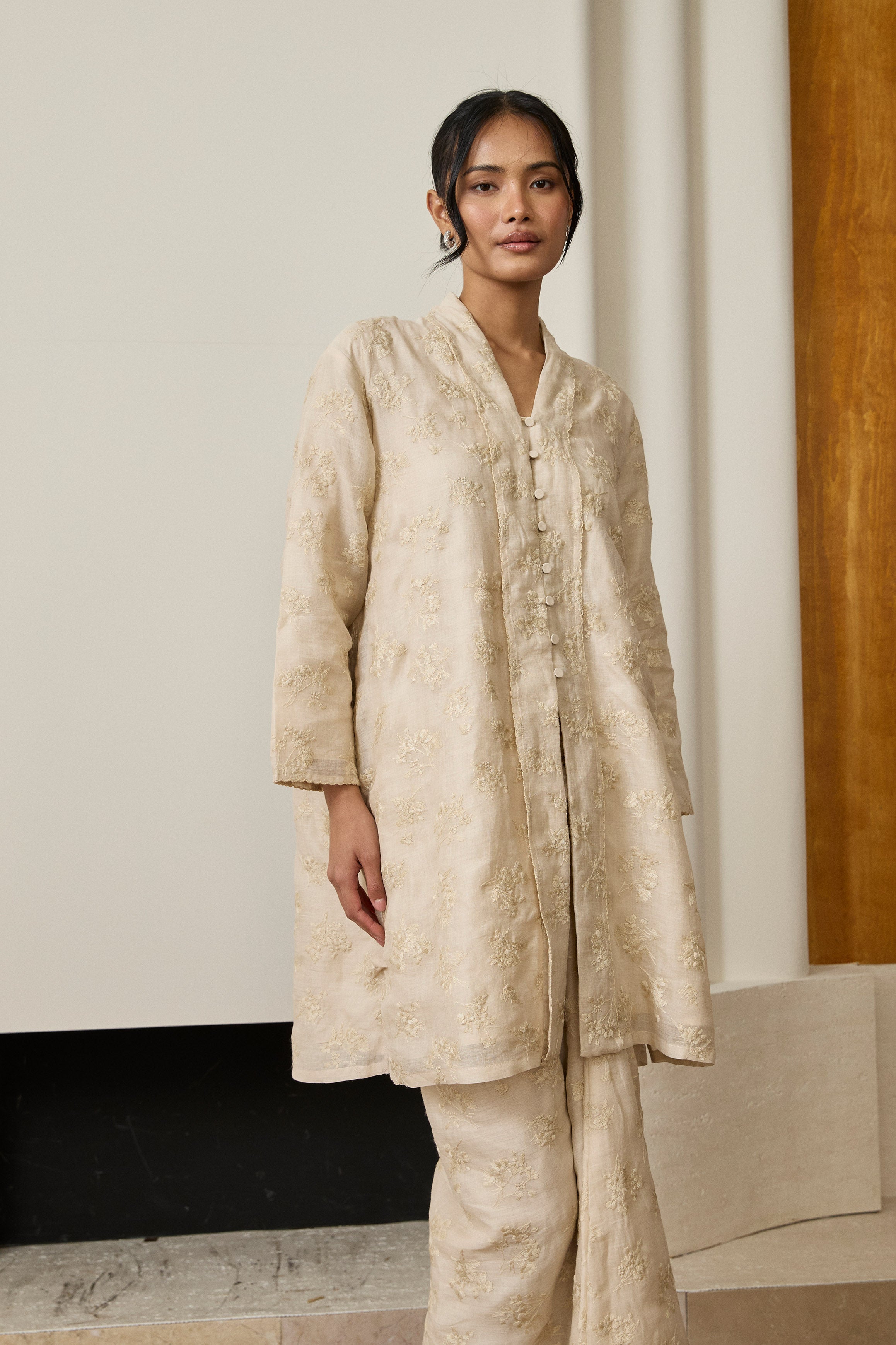 A long kebaya, rendered in embroidered ramie. Bversized, loose fit and full sleeves. Features self-covered button closures and pockets on both sides. Lined in cotton.
