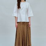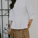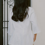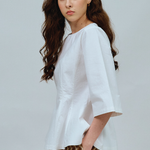 Semi-fitted silhouette with three-quarter sleeves and a subtle peplum hem. Rendered in cotton. Finished with a clean zip at the back.