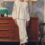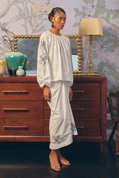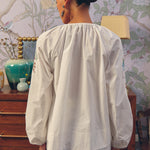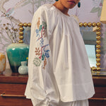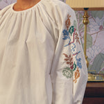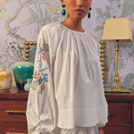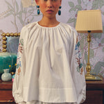 A raglan blouse with a gathered neckline and statement sleeves featuring multicoloured cross stitch detailing. Rendered in Cotton Poplin.