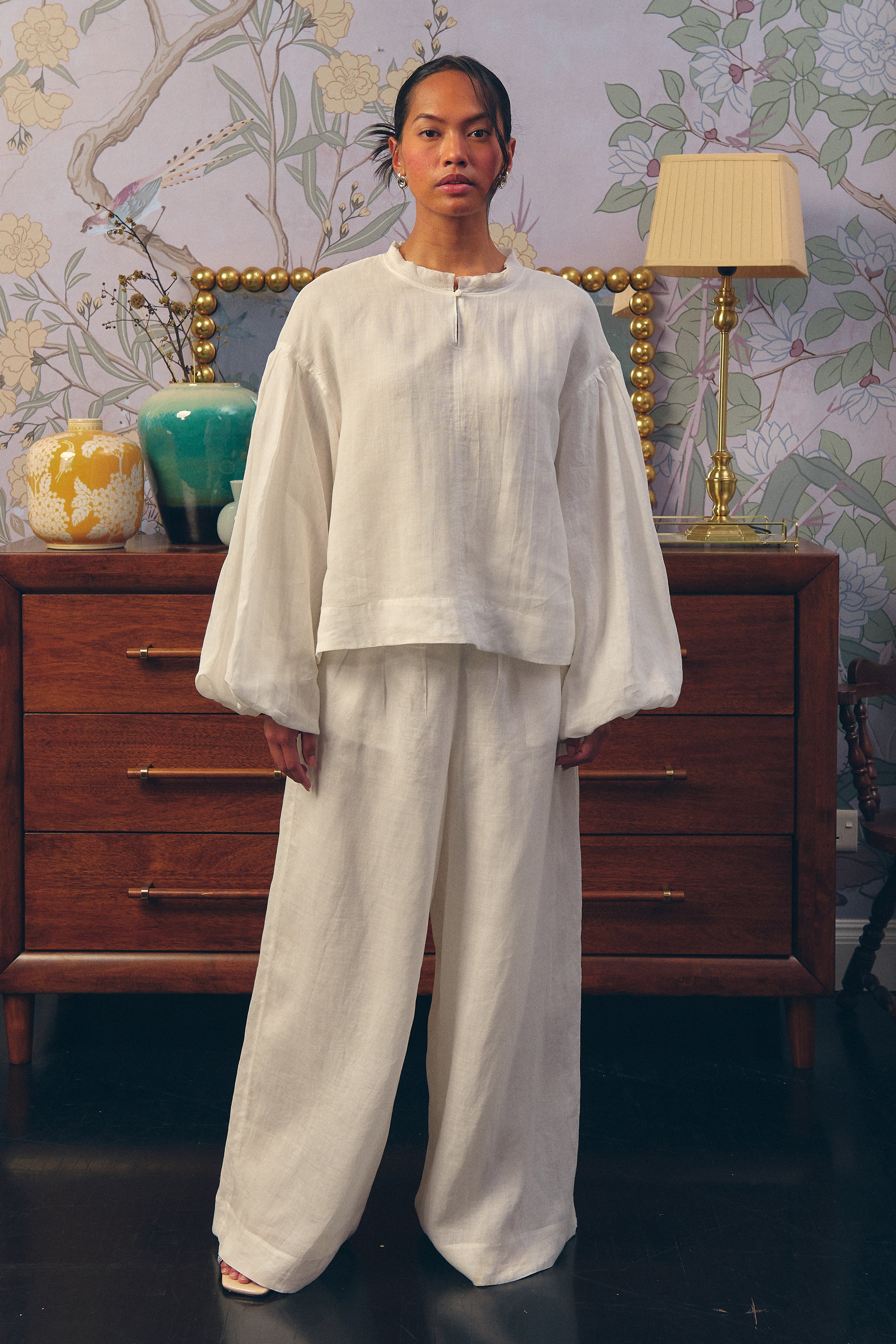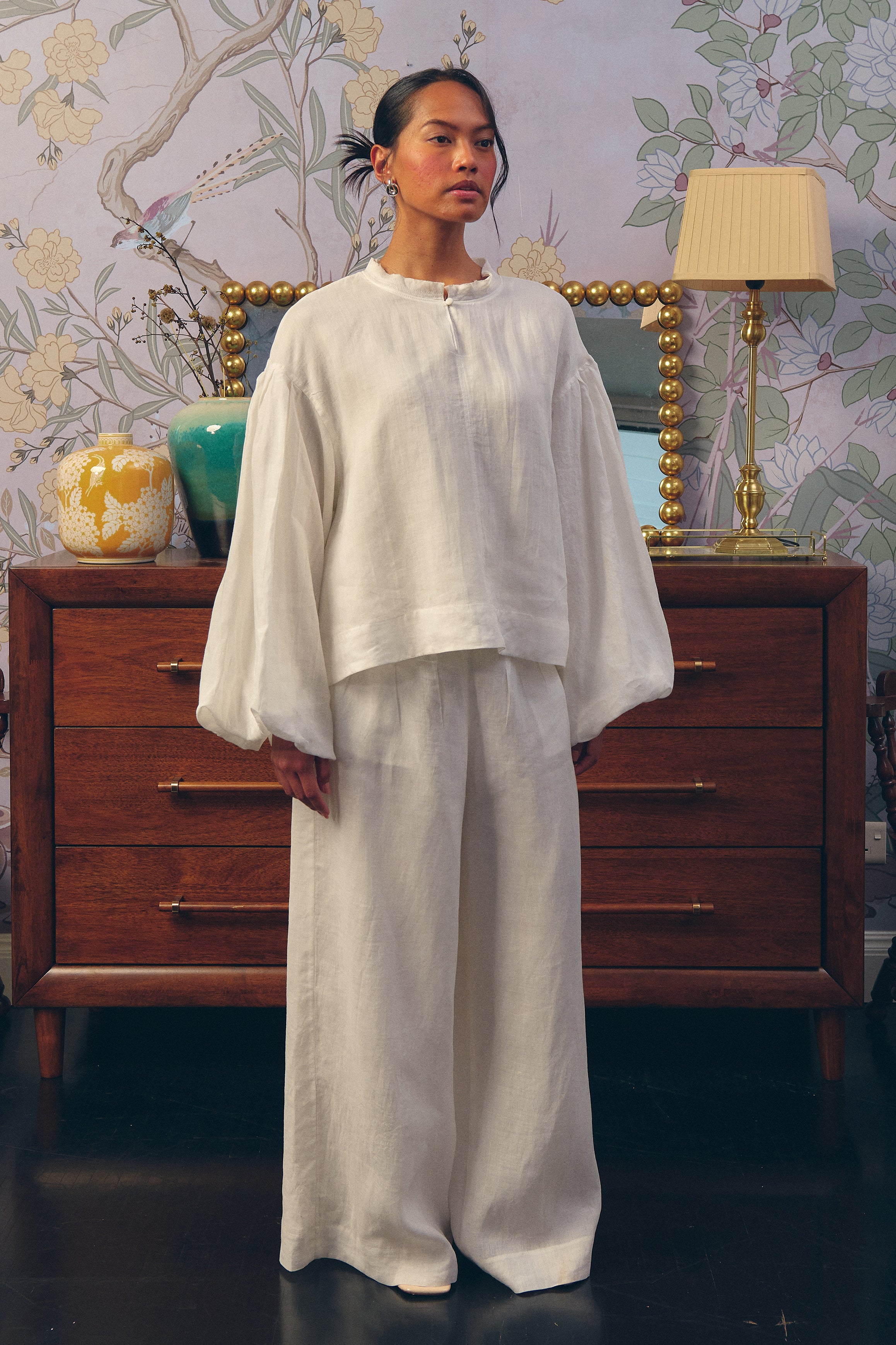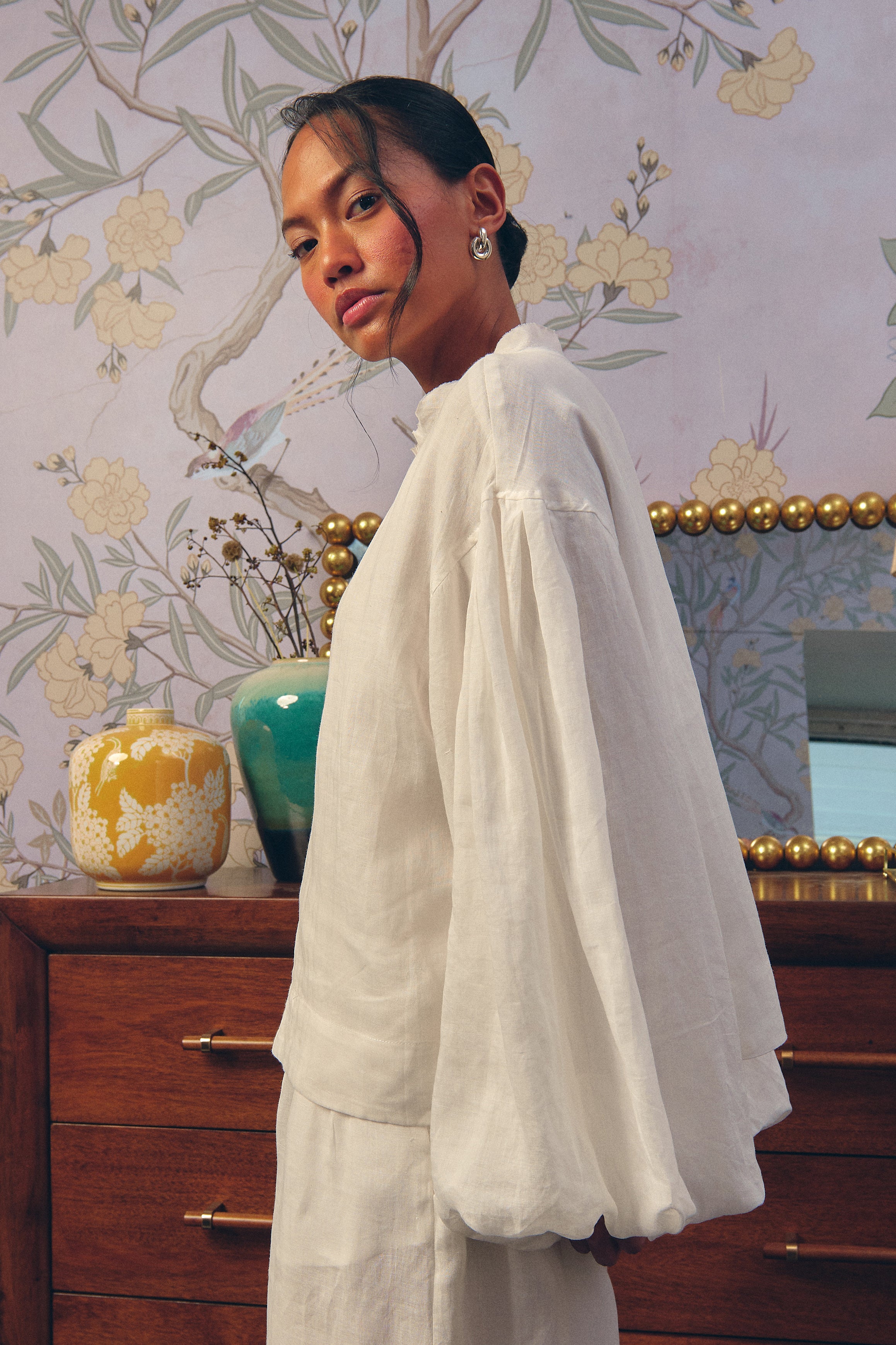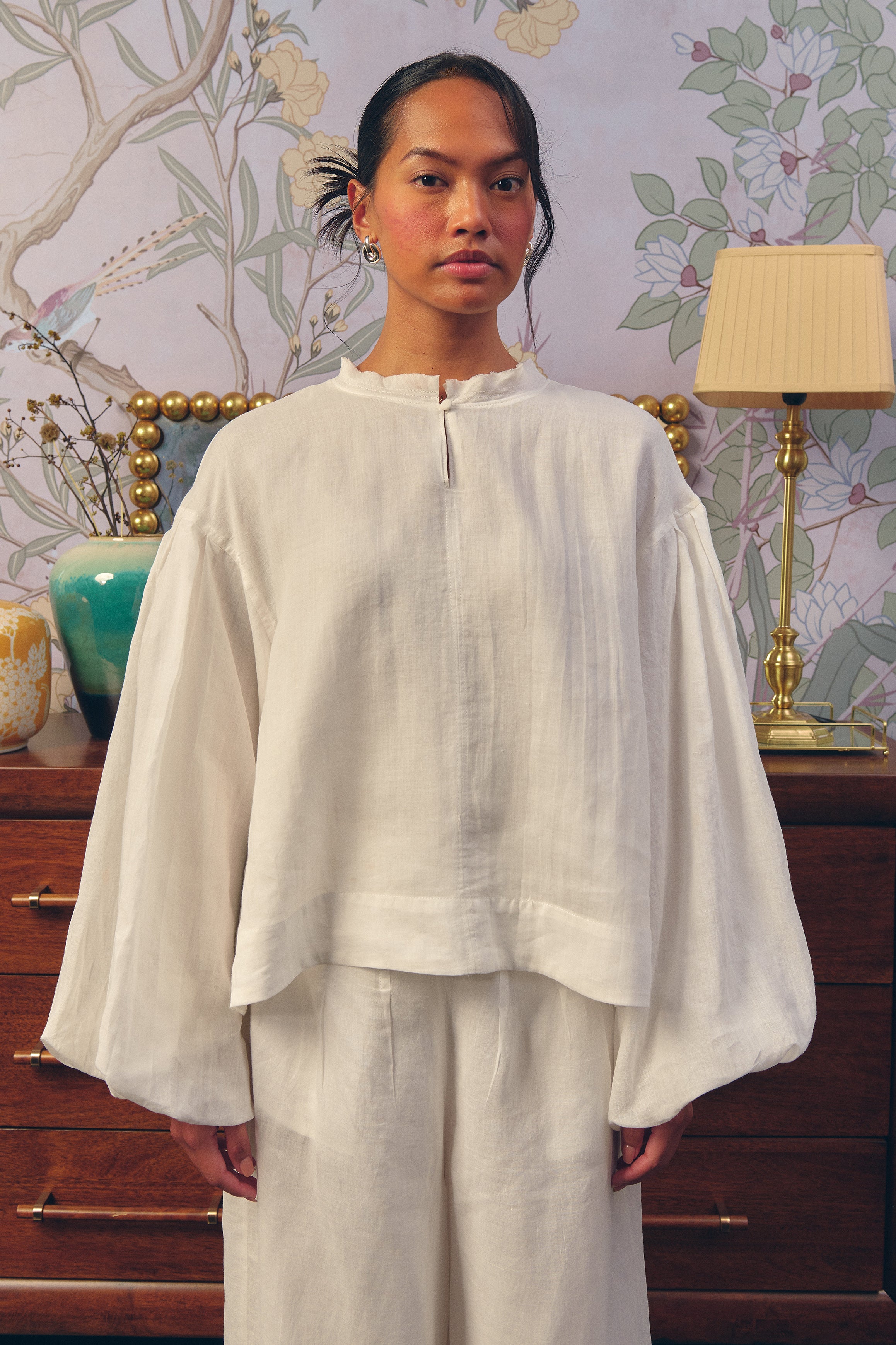A relaxed blouse with puffy sleeves and a drop-shoulder silhouette. Rendered in Ramie, and lined in Cotton. Finished with a frayed neckline and front button closure.