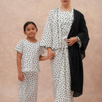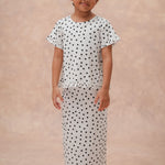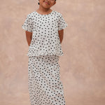 A casual-friendly set, this Mini version features double edge ruffles on the top and sleeve hemline. Includes a matching back-pleated skirt, for easy movement.