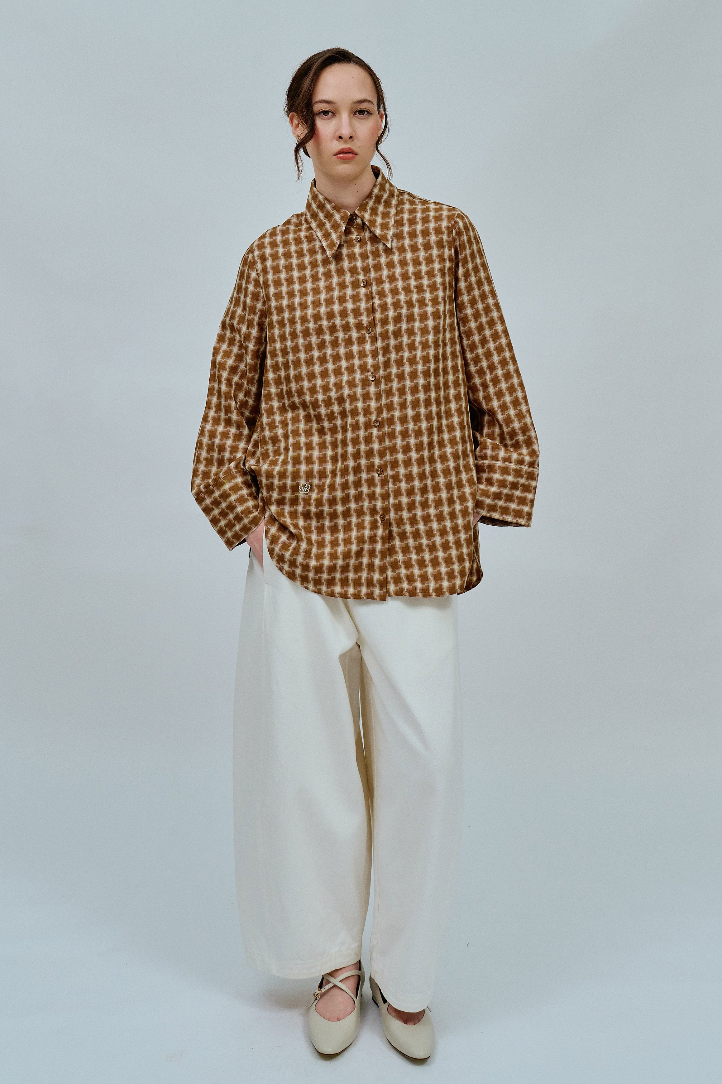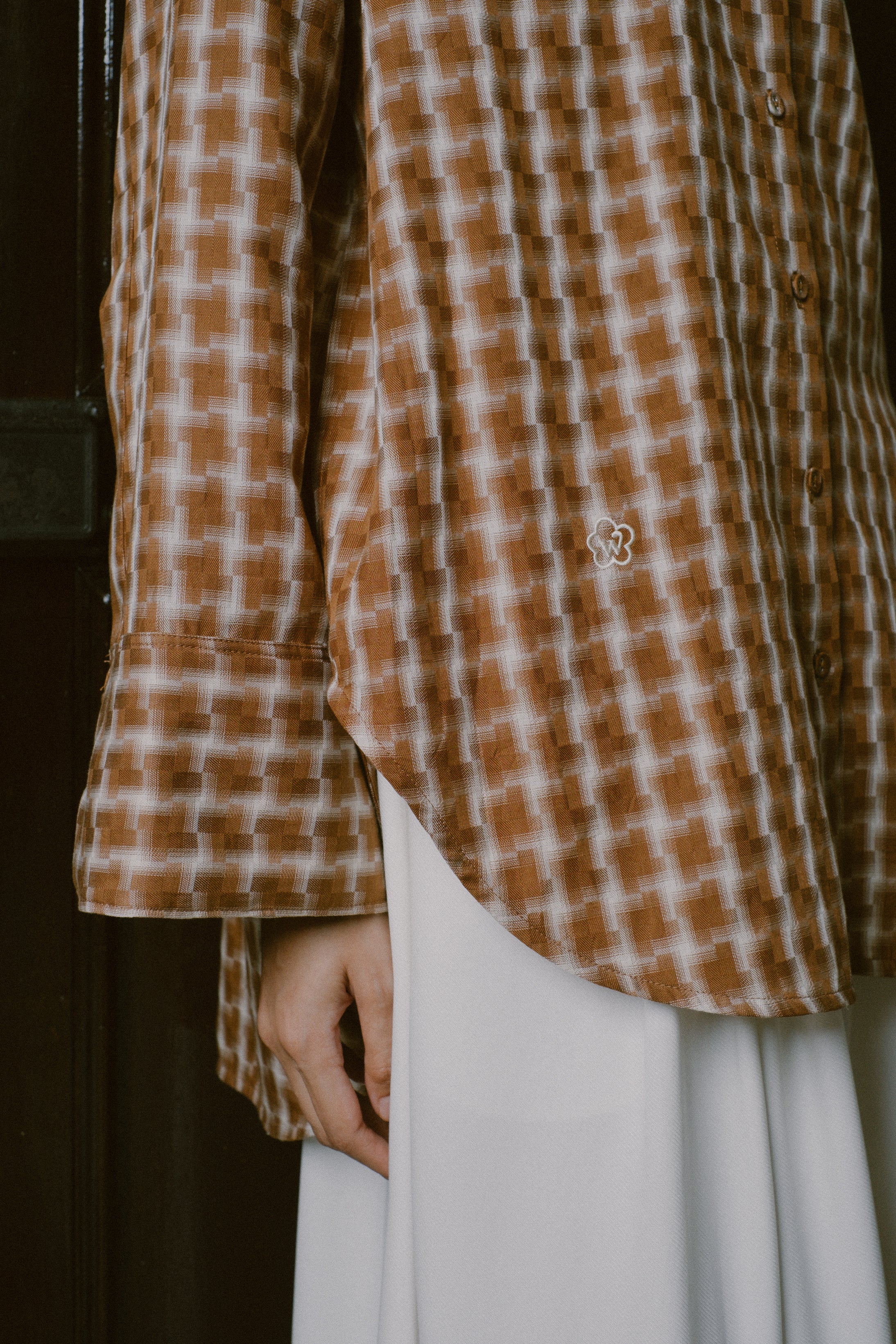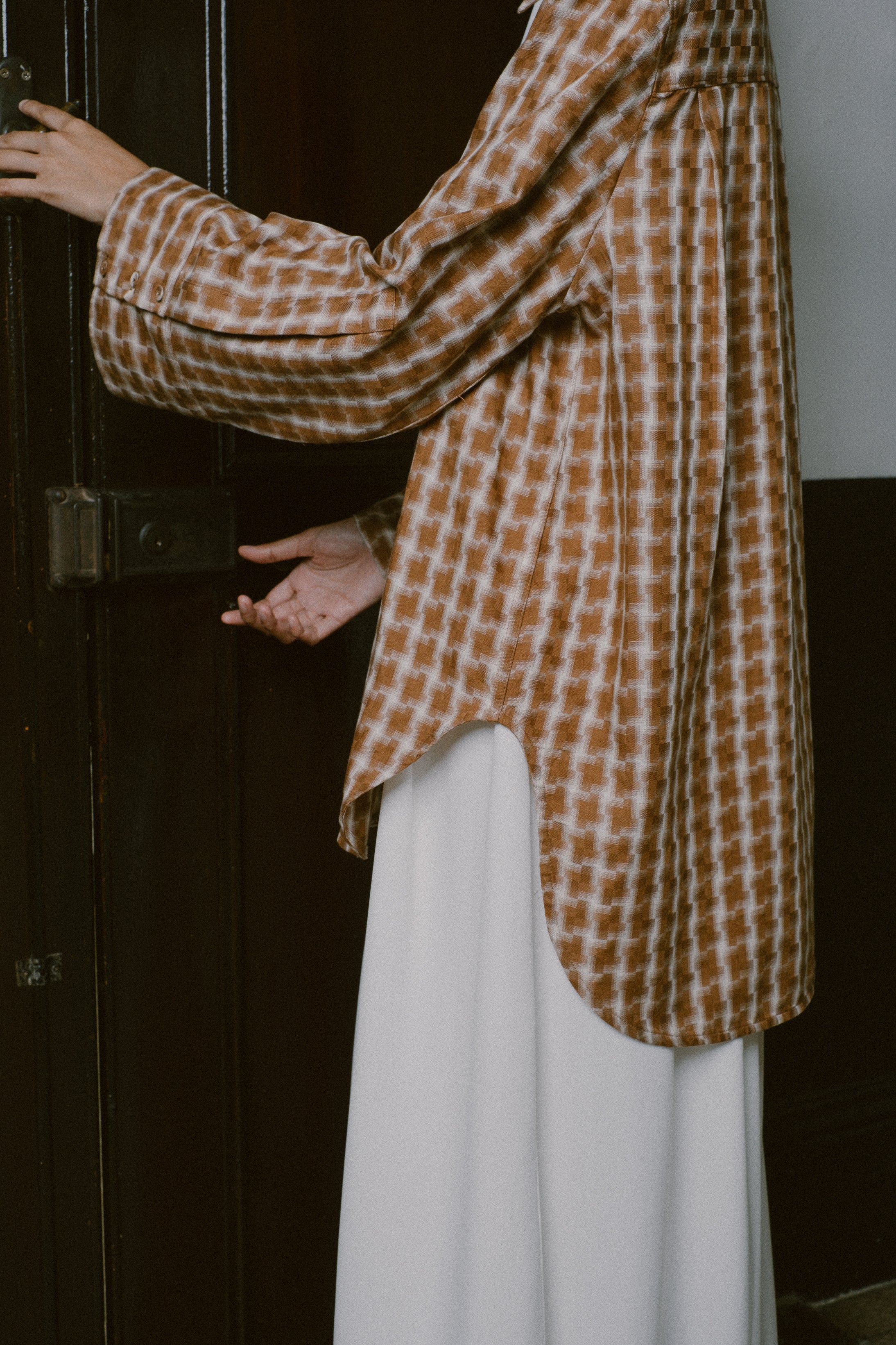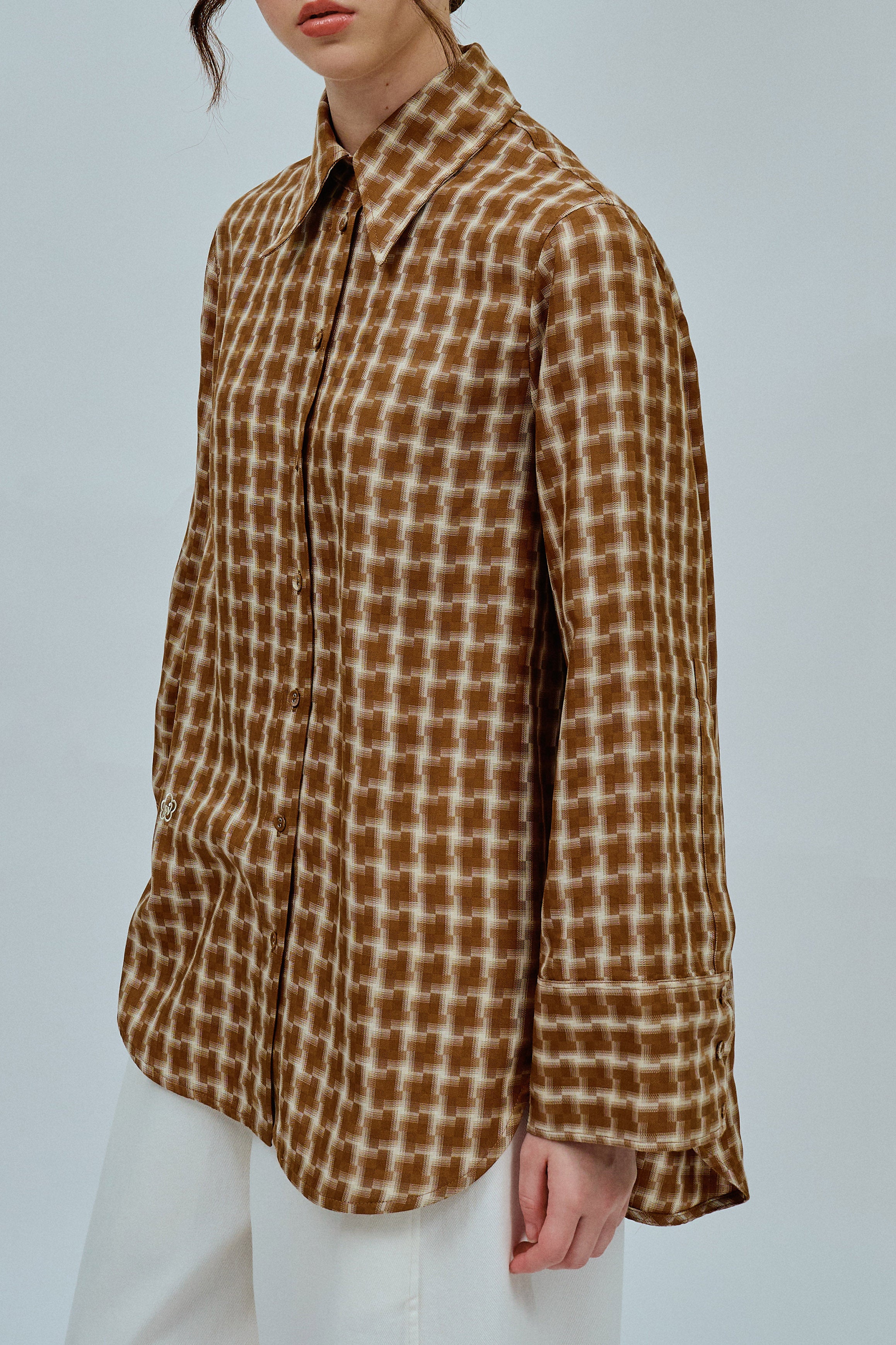 A signature silhouette, in a patterned iteration. A relaxed fit with curved hem and long sleeves with wide cuffs. Finished with a high-low silhouette.