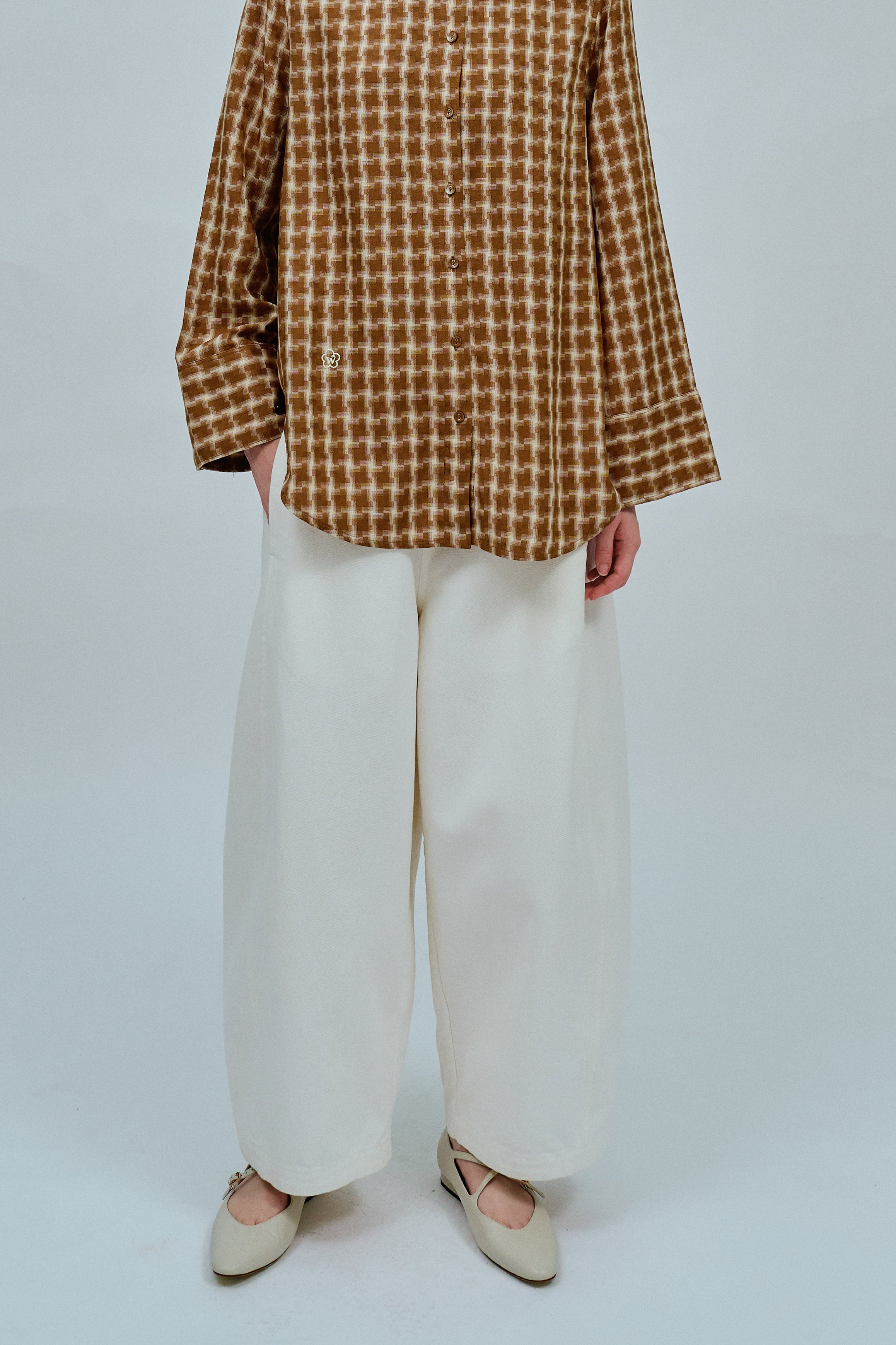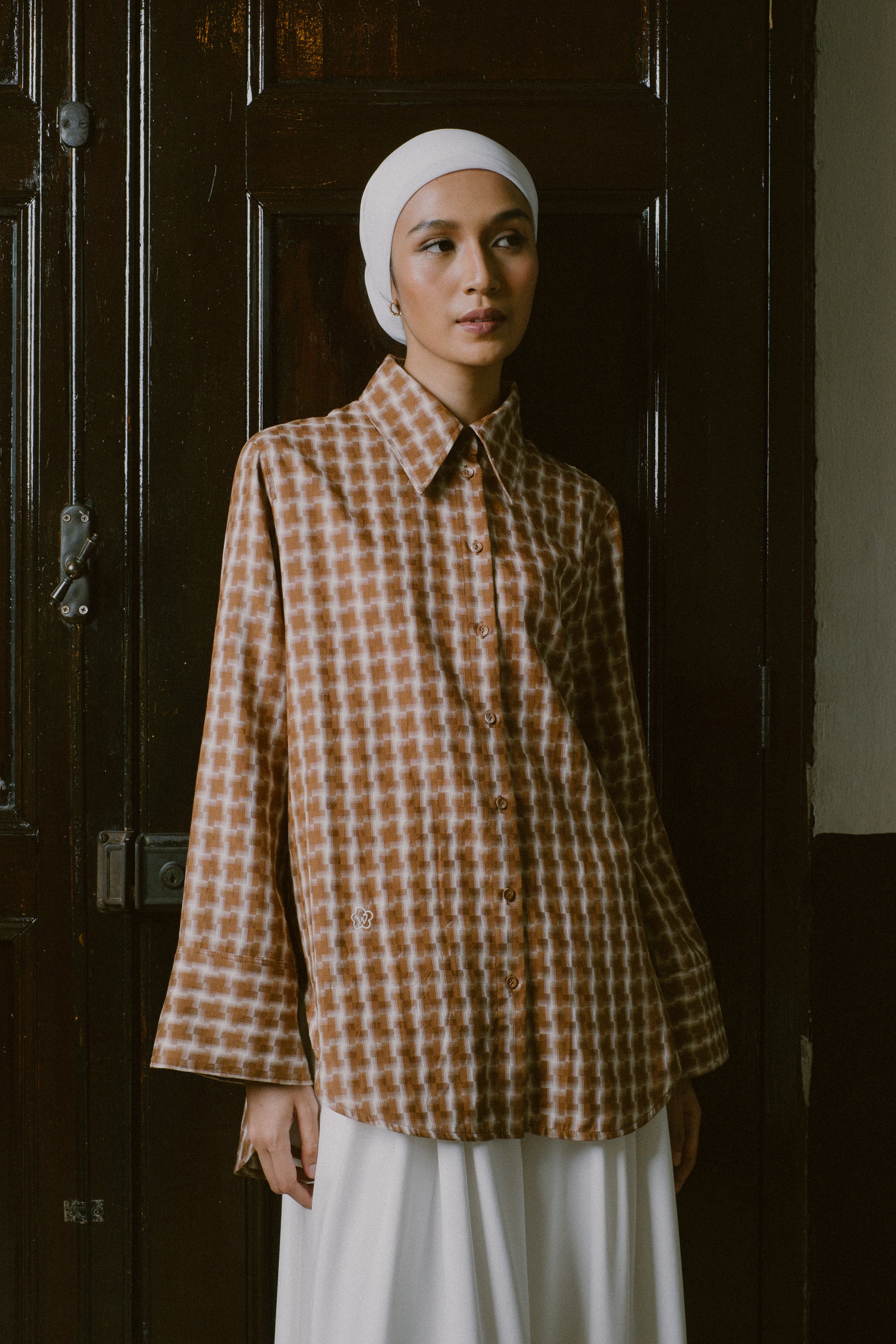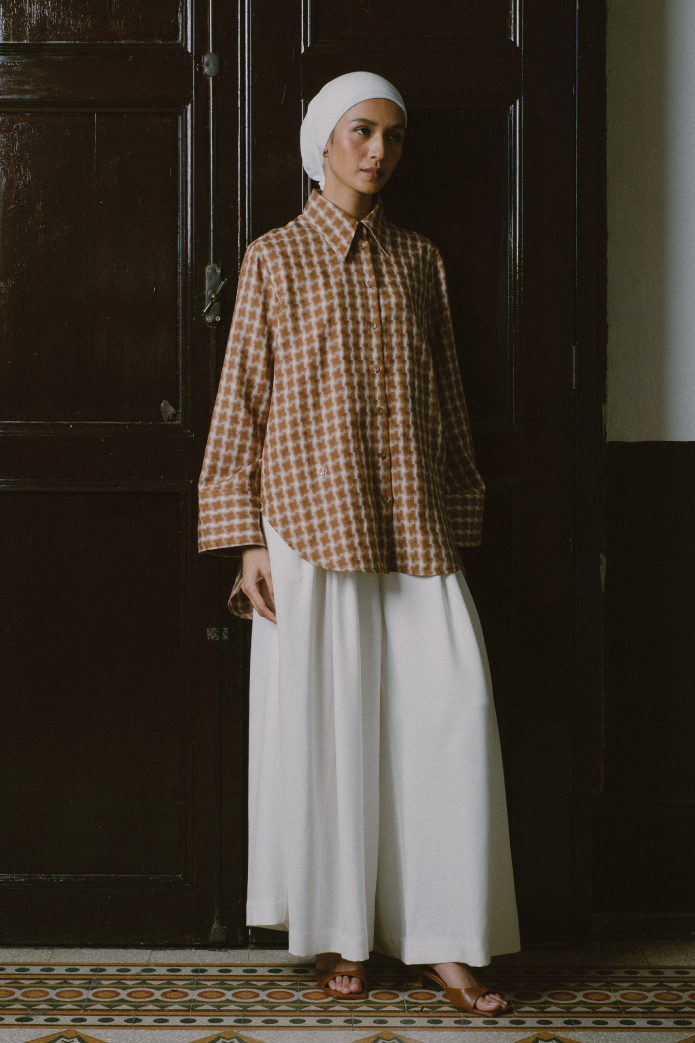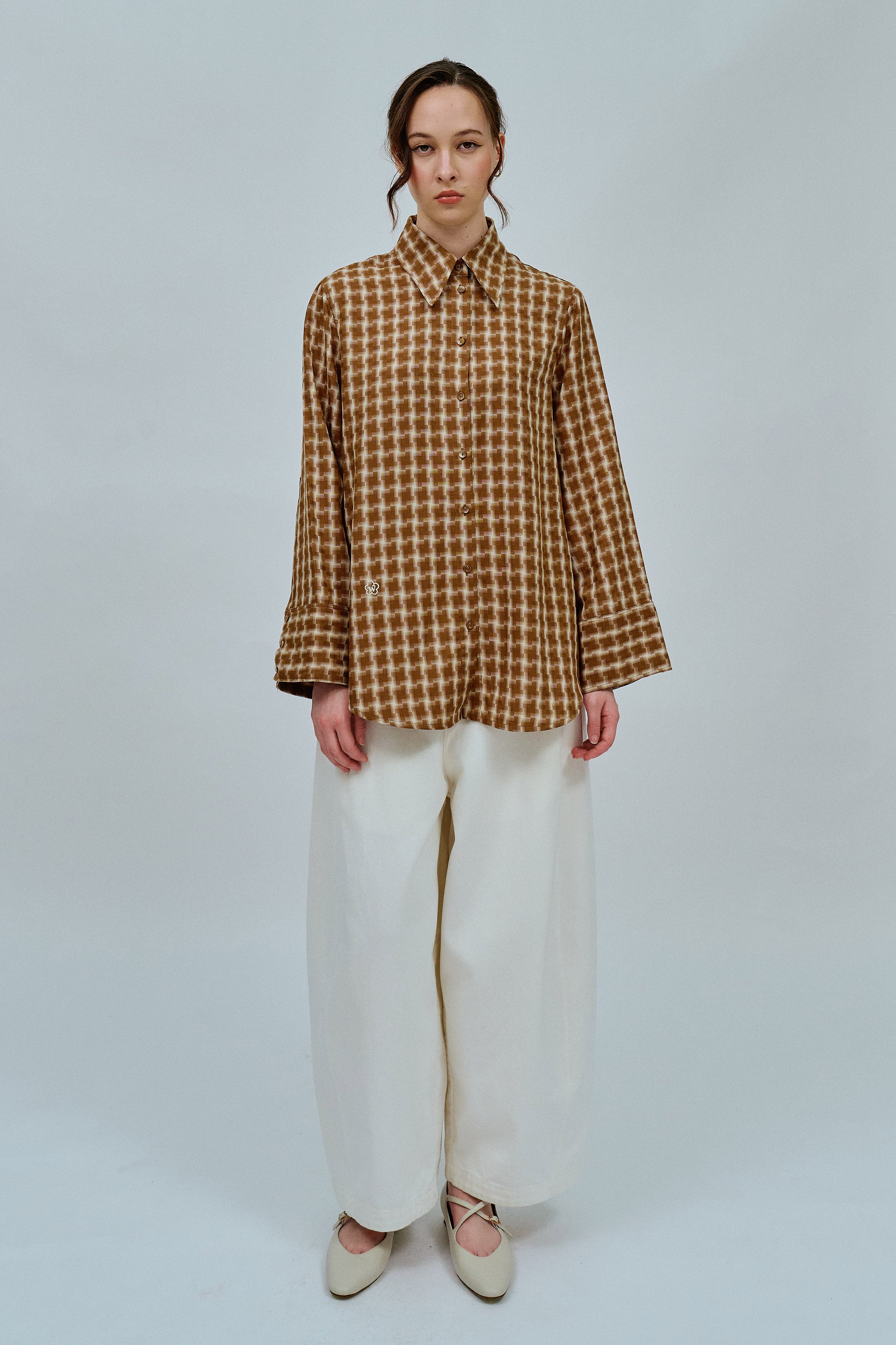 A signature silhouette, in a patterned iteration. A relaxed fit with curved hem and long sleeves with wide cuffs. Finished with a high-low silhouette.