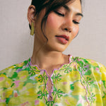 A long kurung top with drop shoulders, a front hook-and-eye closure, and intricate multicolour embroidery along the neckline, sleeves, and hem. Paired with a pencil skirt featuring embroidery at the hem, an elastic waistband, and an inverted back pleat. Fully lined in Tencel, with side pockets on the top and a back zip closure on the skirt.