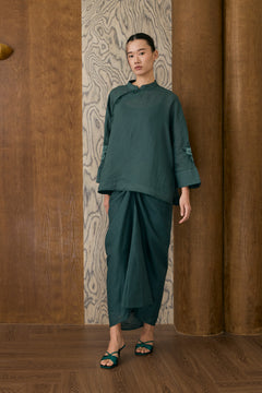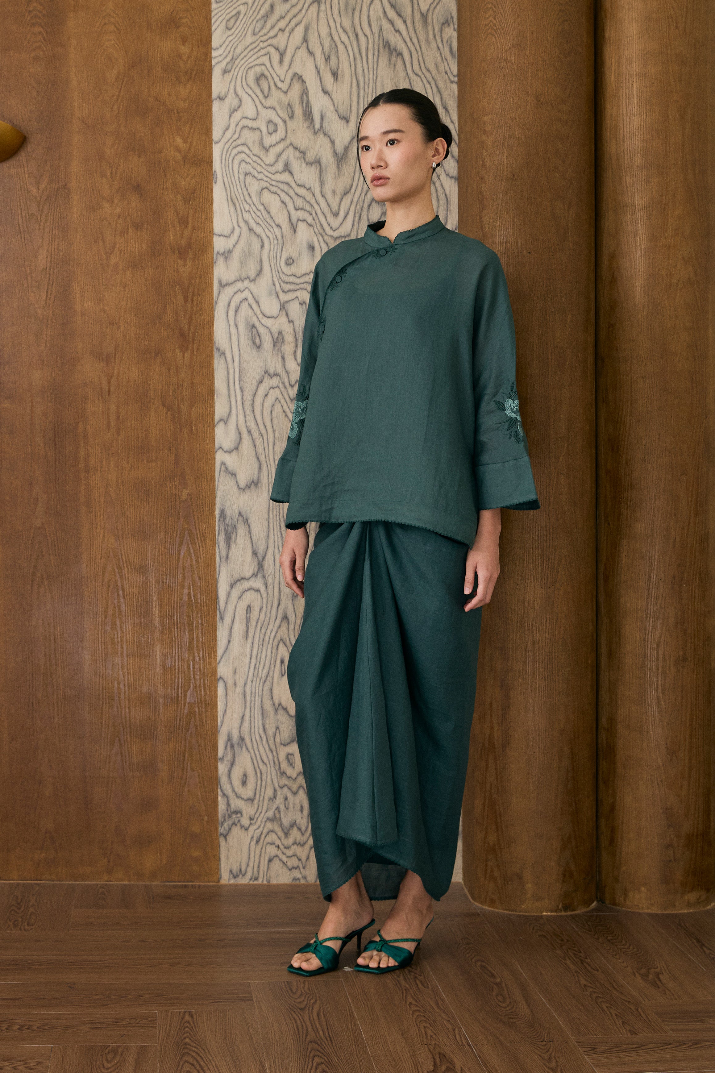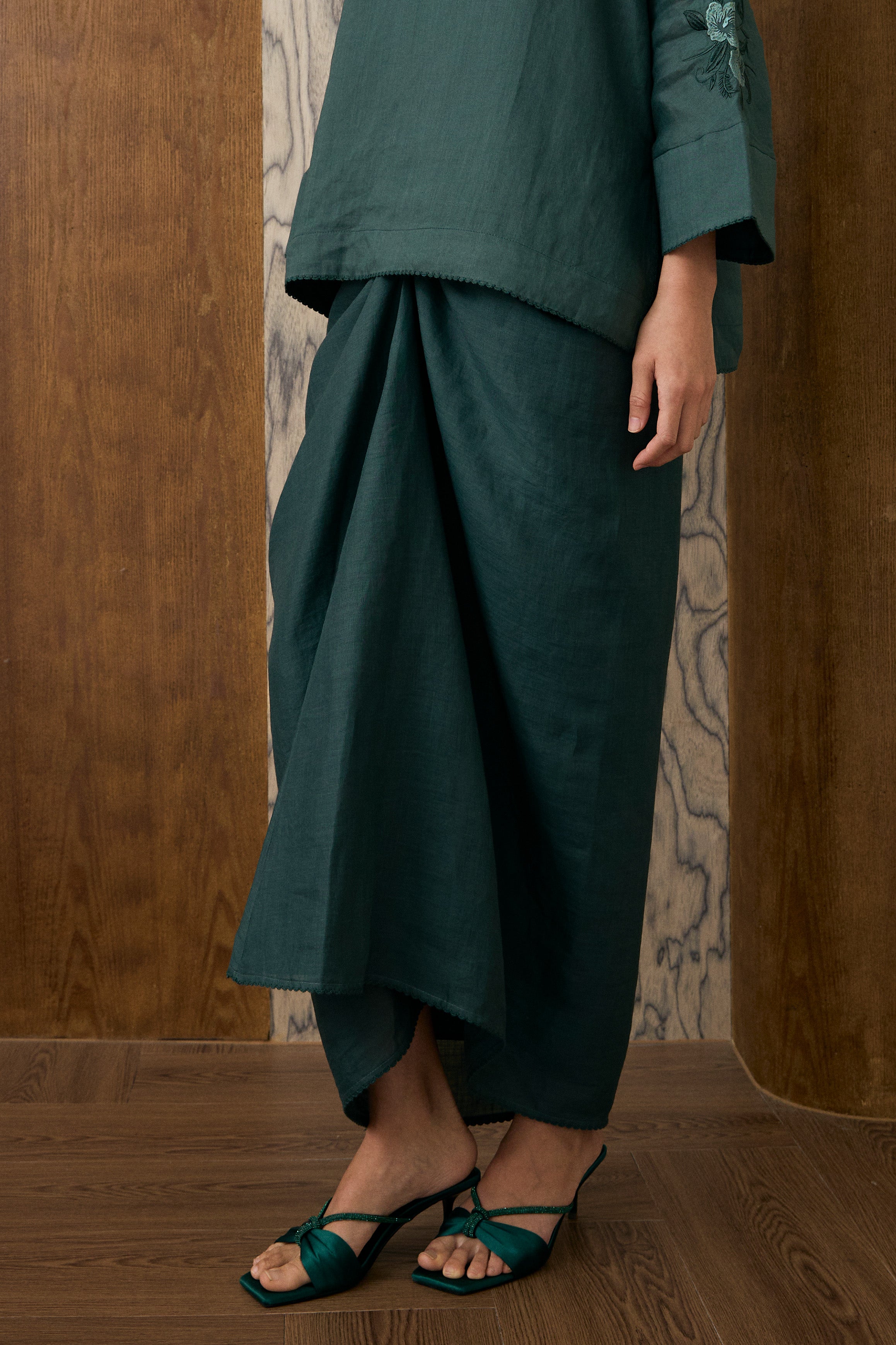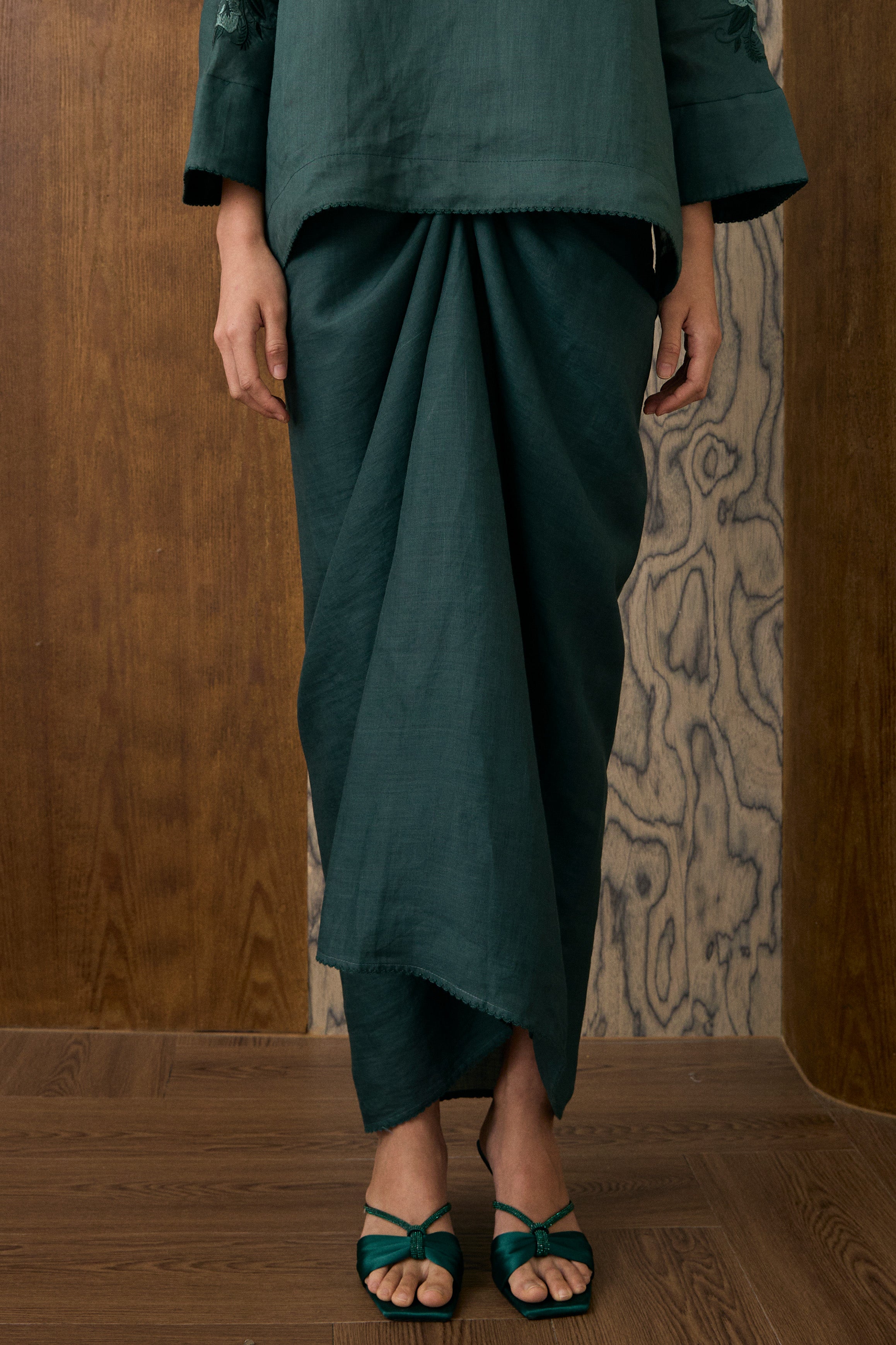 A true staple, this is a slip-on knot skirt that can be secured with a double knot. Finished with delicate trim detailing. Rendered in ramie, fully lined with cotton.