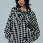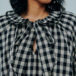 A relaxed fit, with round frilled neckline and tie closure. Featuring full-length sleeves, and an A-line flare. Rendered in gingham cotton gauze.