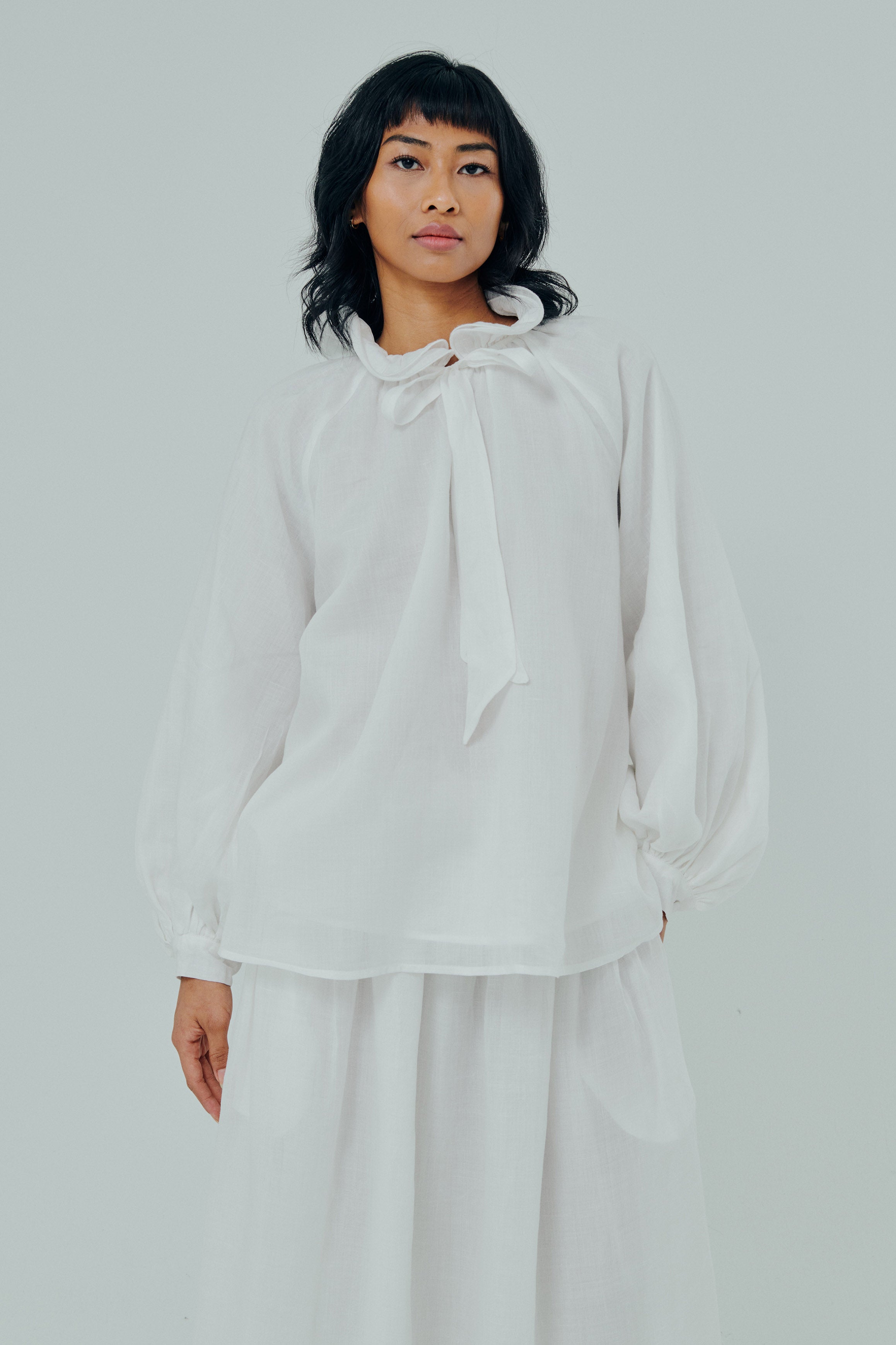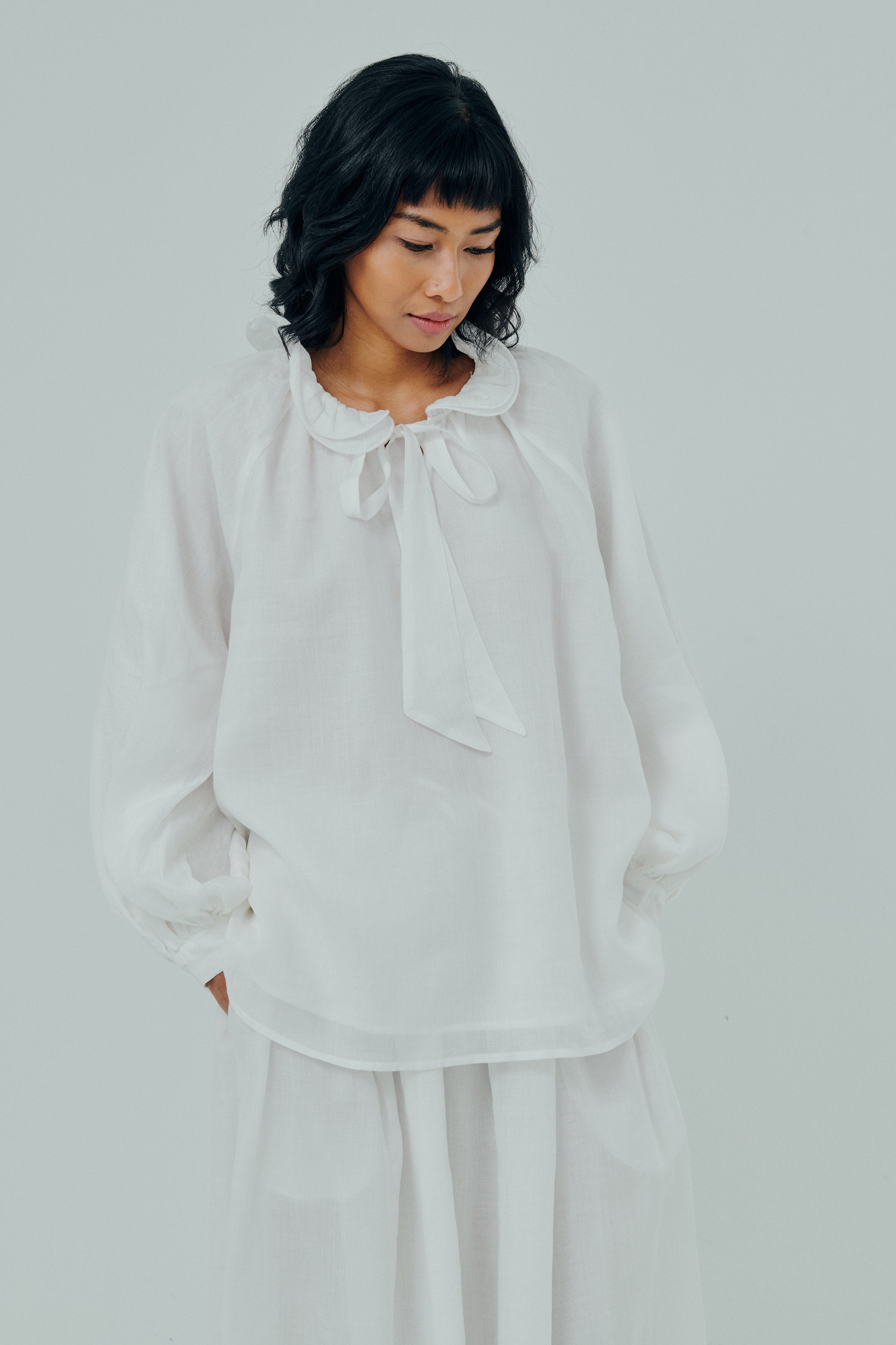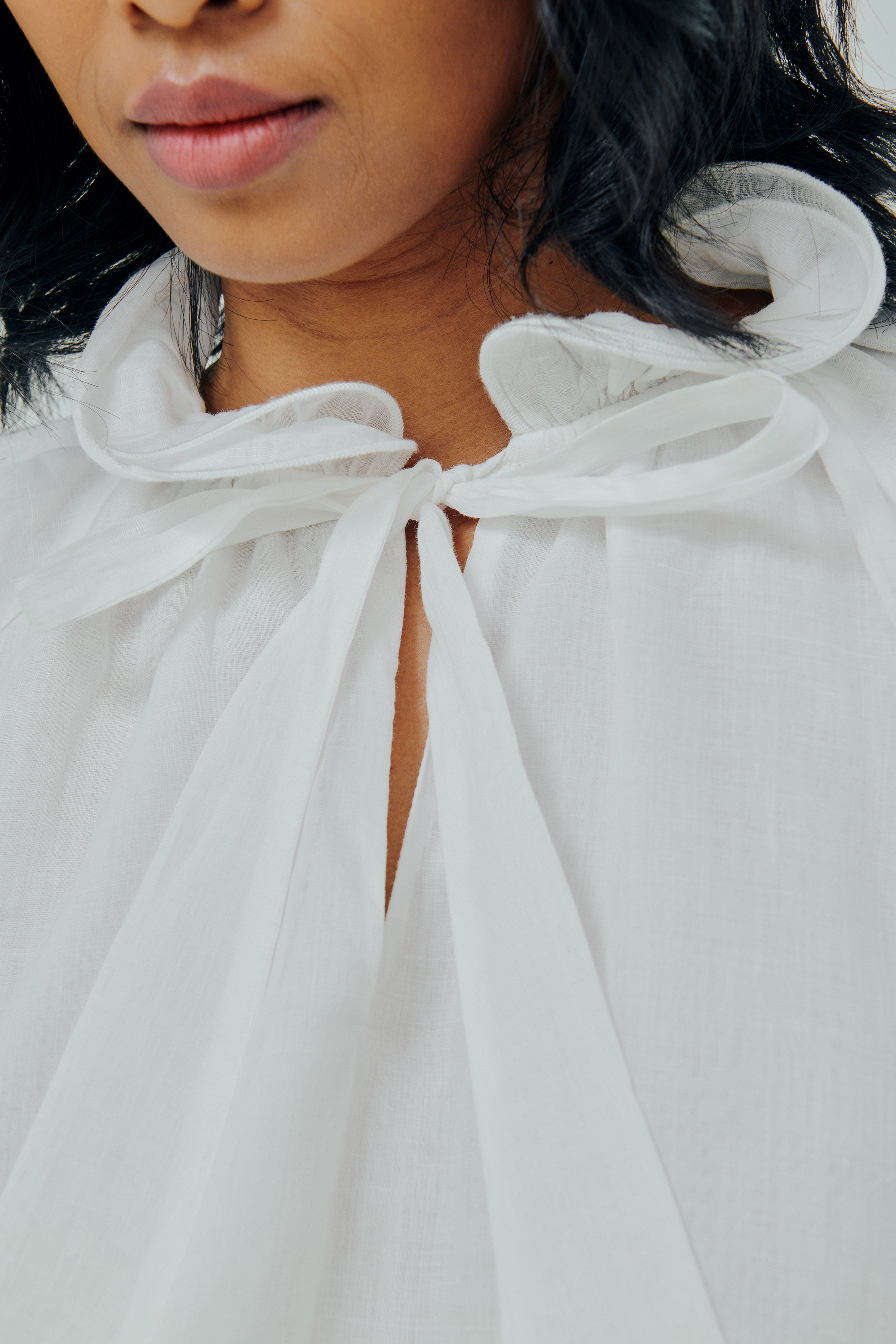 A relaxed fit, with round frilled neckline and tie closure. Featuring full-length sleeves, and an A-line flare. Rendered in ramie and lined in cotton.