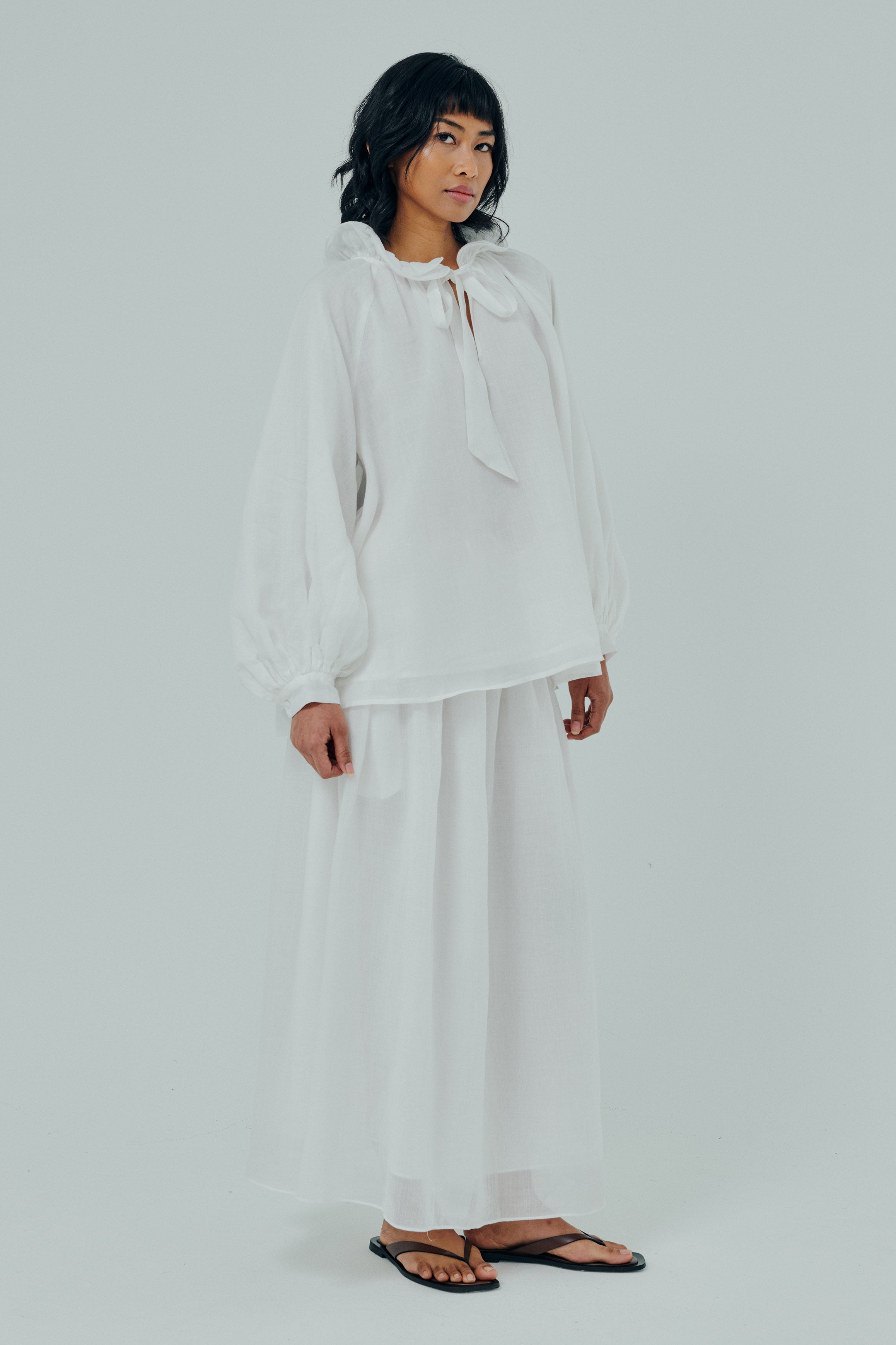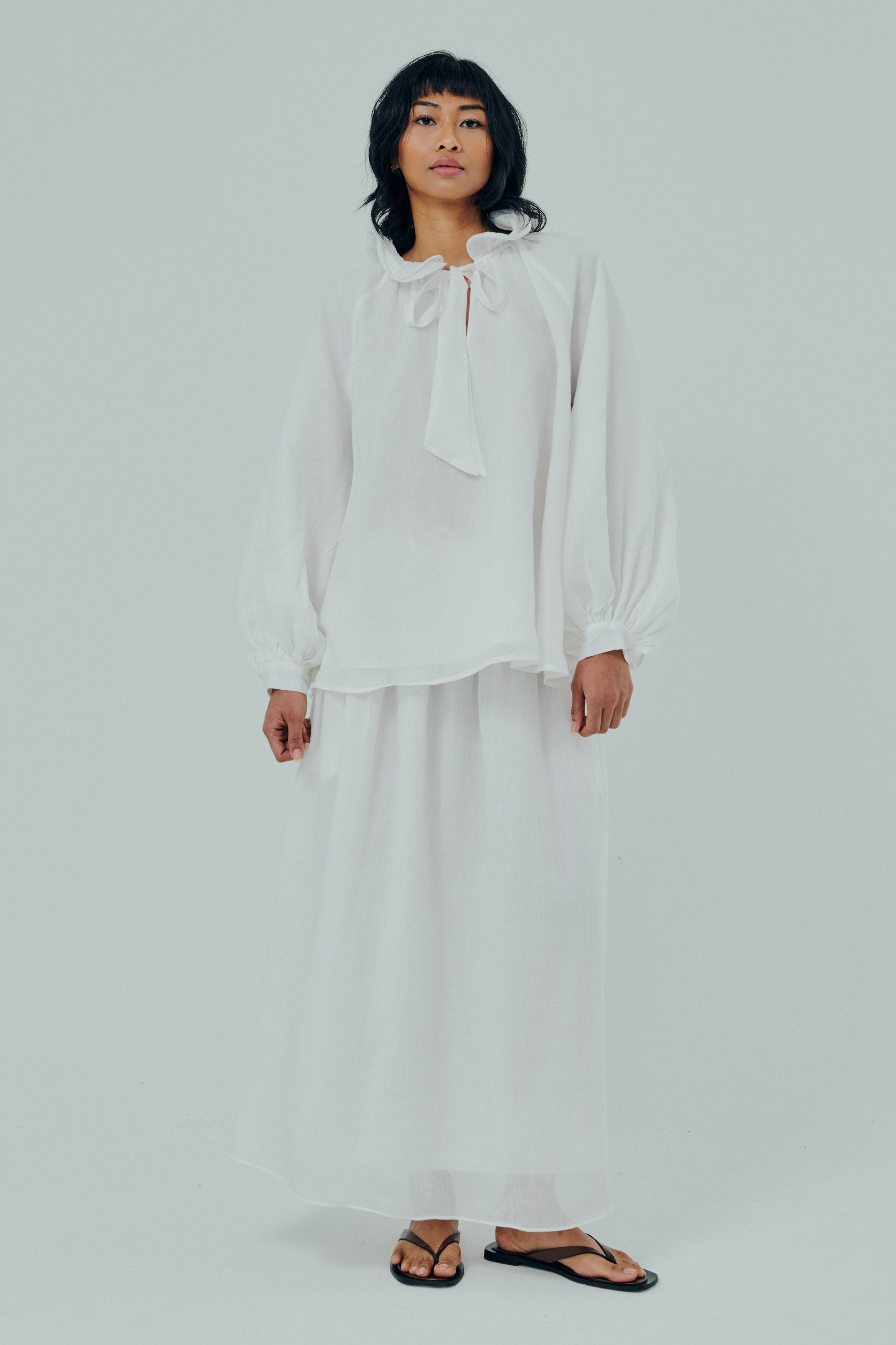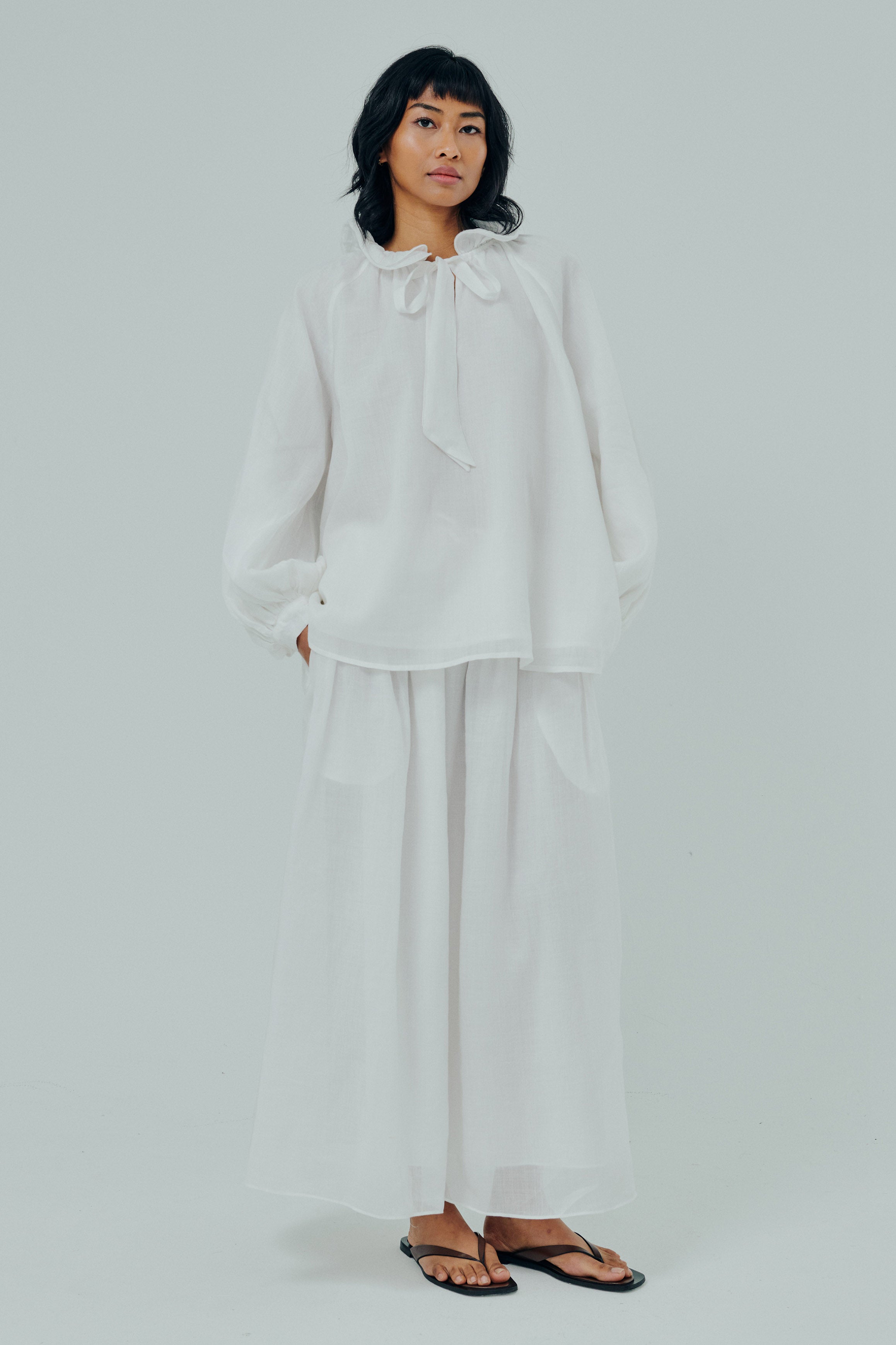 A relaxed fit, with round frilled neckline and tie closure. Featuring full-length sleeves, and an A-line flare. Rendered in ramie and lined in cotton.