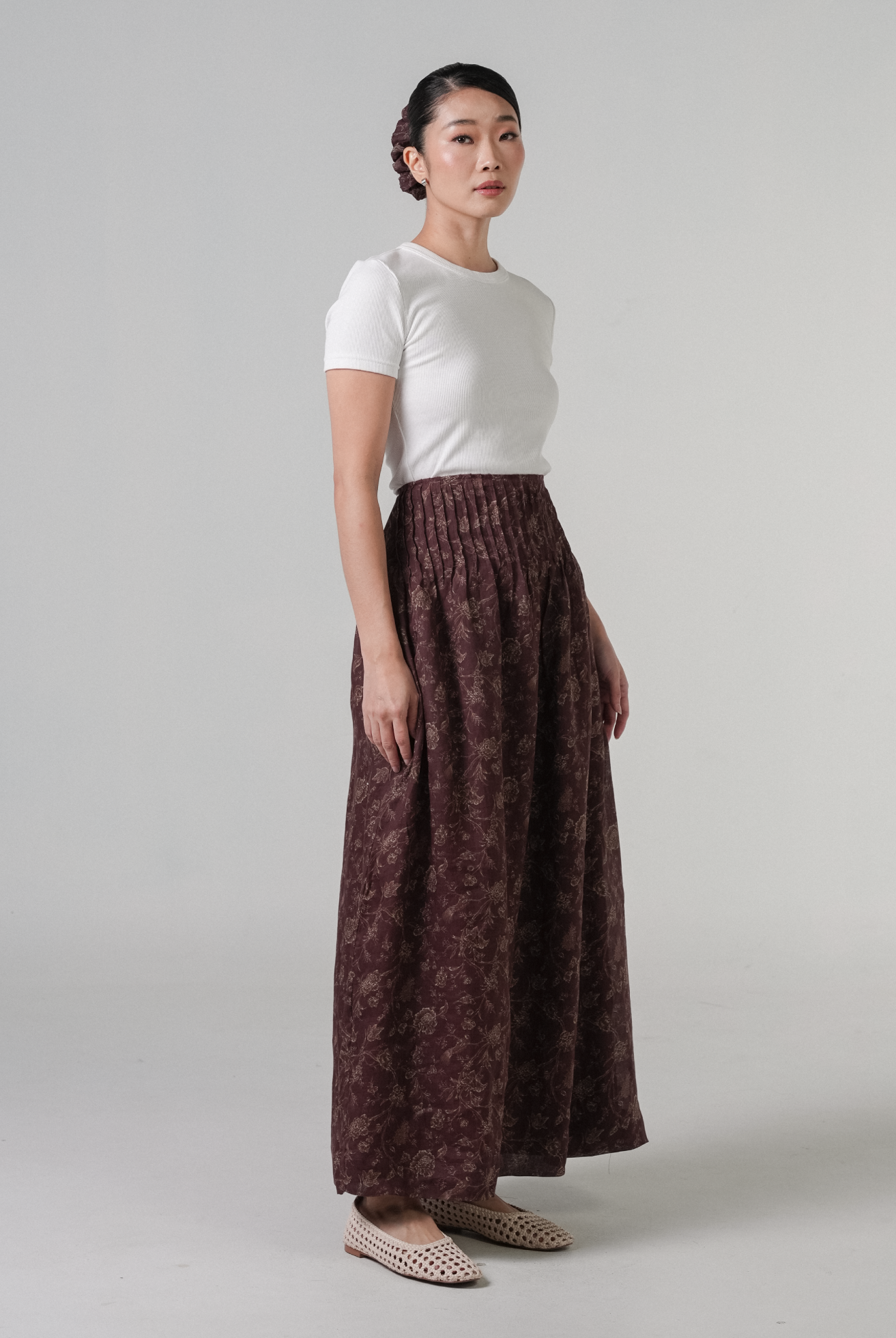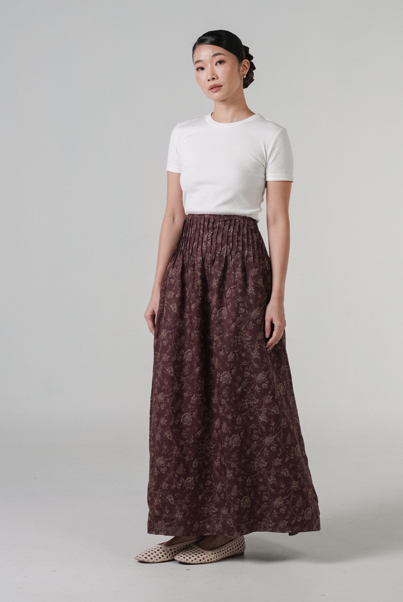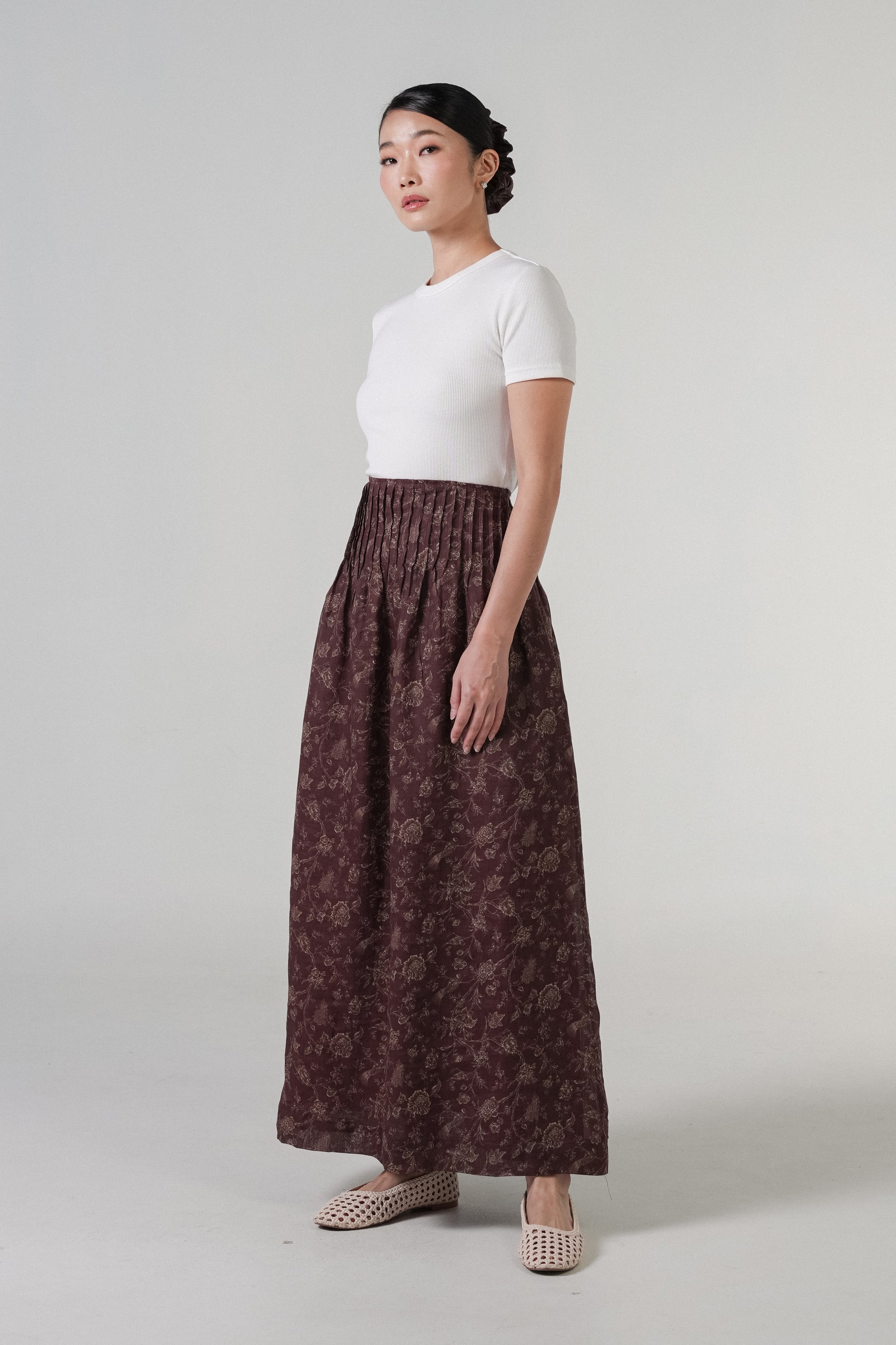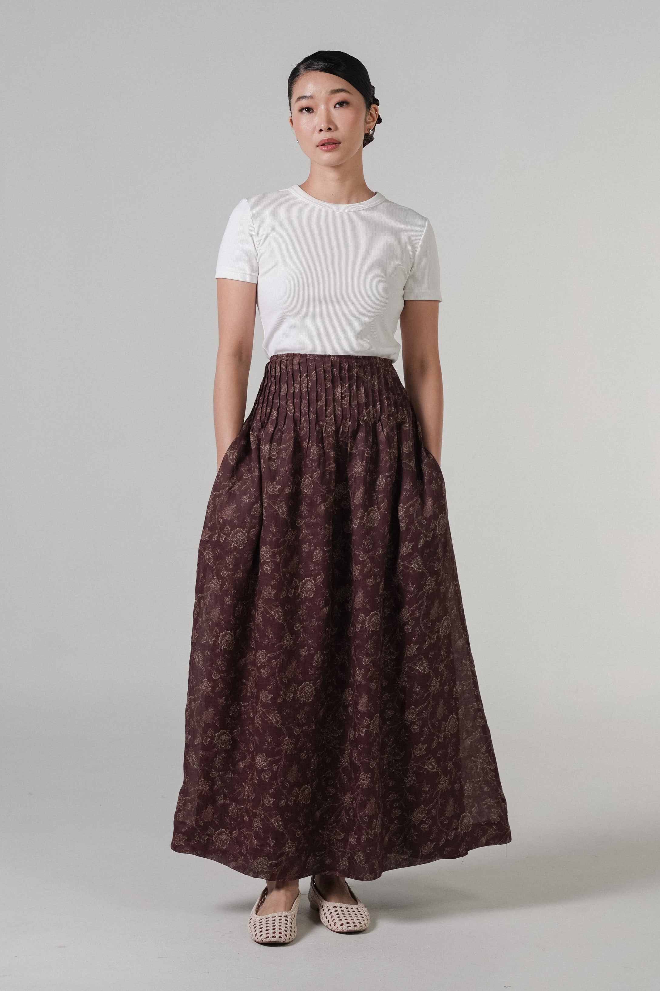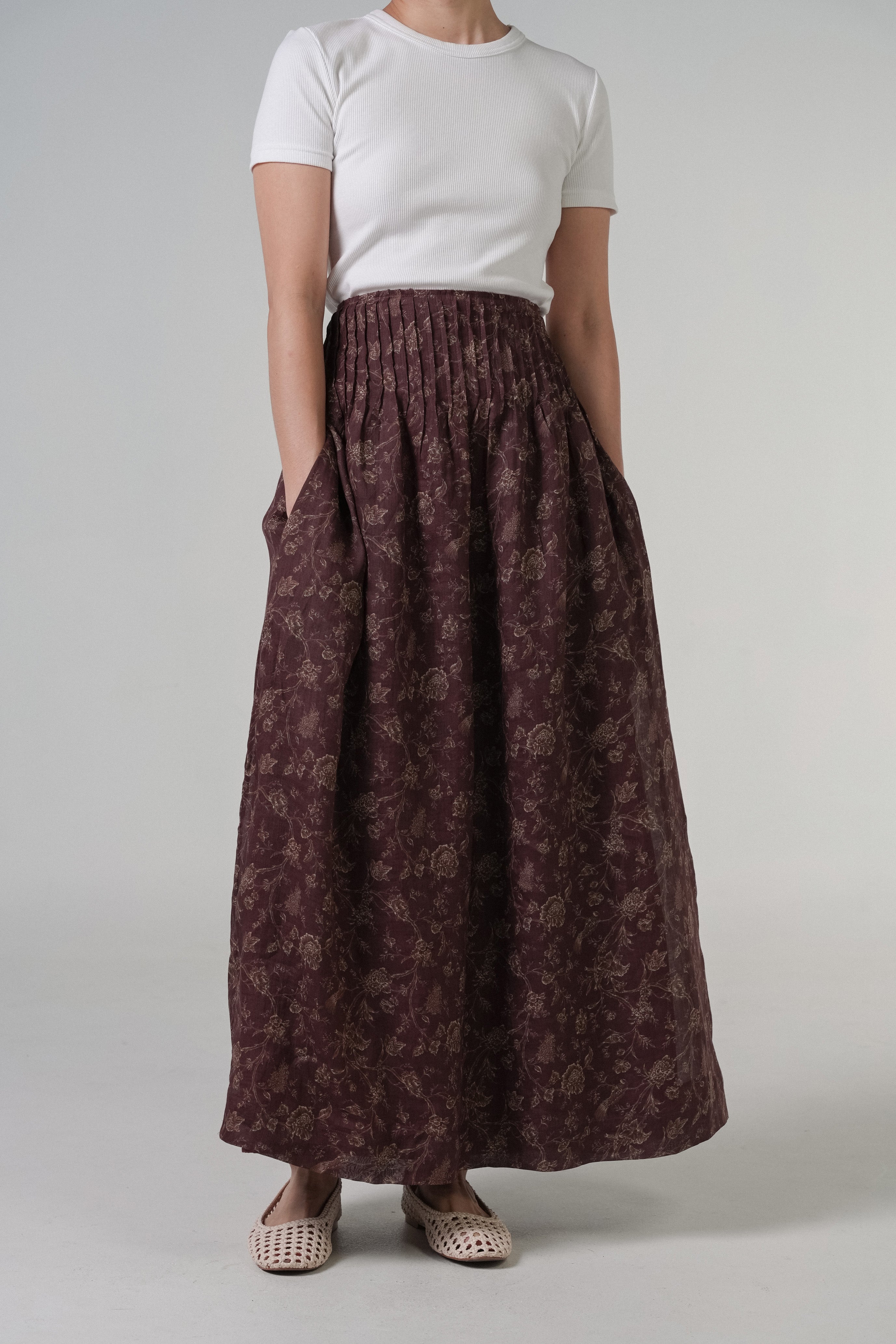 A maxi skirt, designed with pintuck detailing. Rendered in ramie fabric, with a full cotton lining. Finished with side pockets.